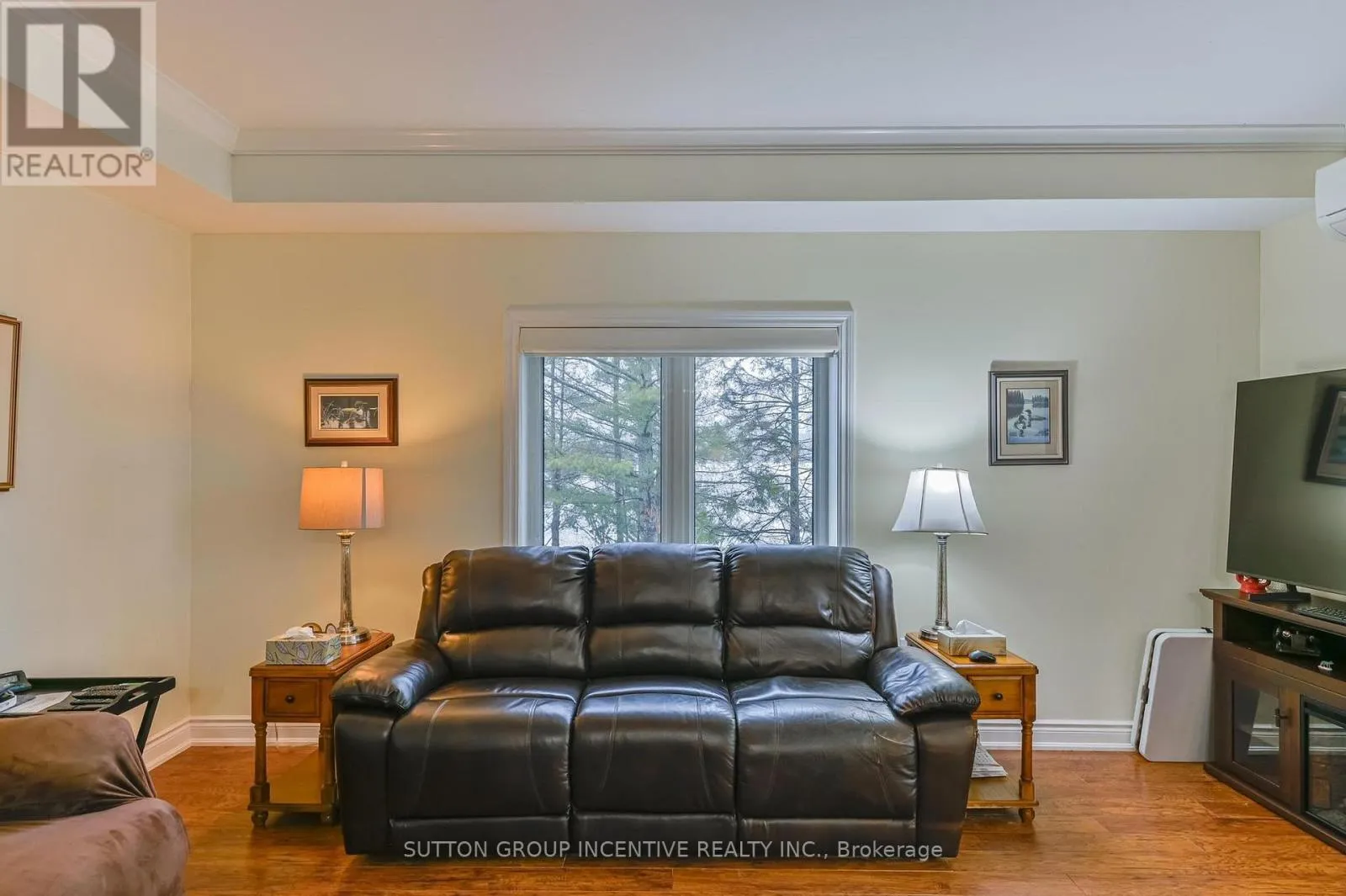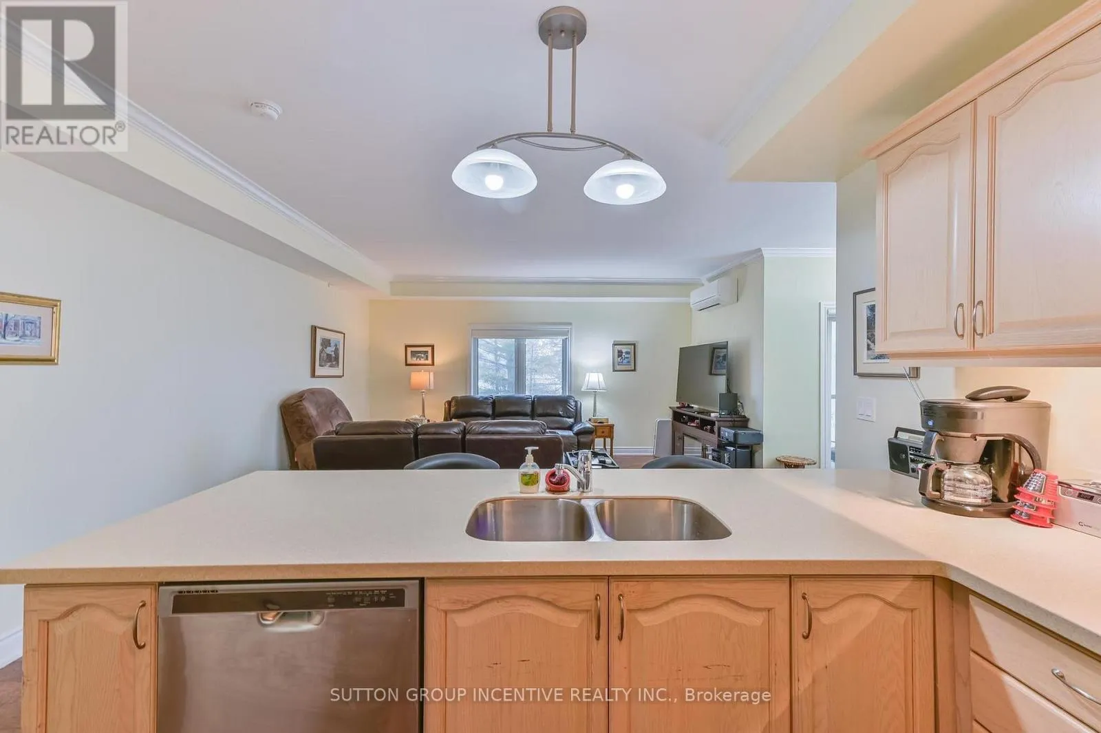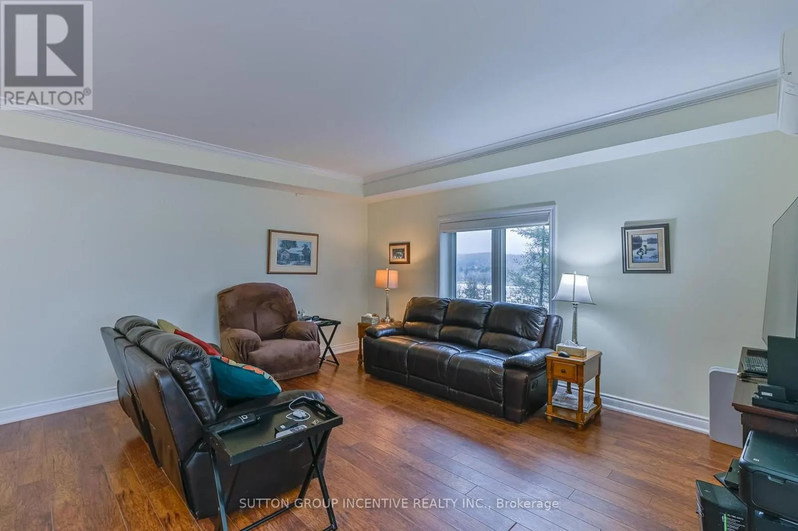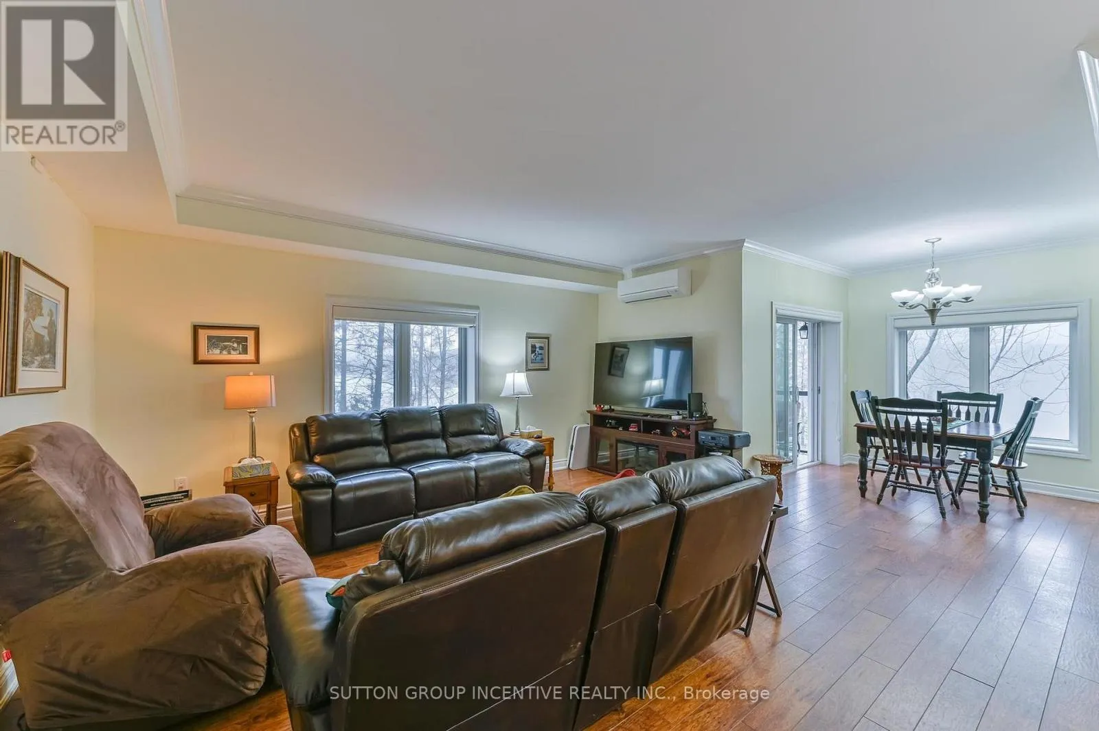 Cross Streets: Mountain & Lake. ** Directions: Maple or Cedar to Mountain to corner Mountain and Lake. Say HELLO to the Granite View!!! A spacious two-bedroom condo offering approximately 1,100 sq ft of comfortable living space with beautiful views over Head Lake from the main windows and private balcony. Bright, open-concept layout with combined living, dining and kitchen areas, ideal for both everyday living and entertaining. Primary bedroom features a walk-in closet and private ensuite, while the second bedroom provides flexibility for guests, office or additional living space. Two full bathrooms including a wheelchair-accessible walk-in shower. Unit also offers automatic door entry with fob access, making it ideal for accessible living. In-suite laundry adds convenience. Includes one indoor parking space, storage locker and the benefit of maintenance-free living. This building is located in the core of Haliburton village, within walking distance to shops, dining, healthcare and amenities!! (id:27476)
