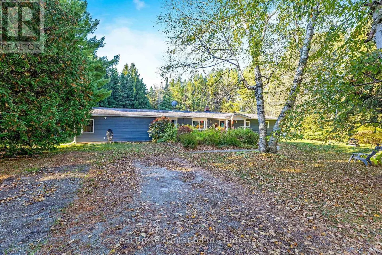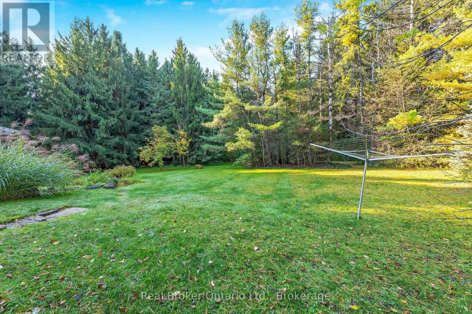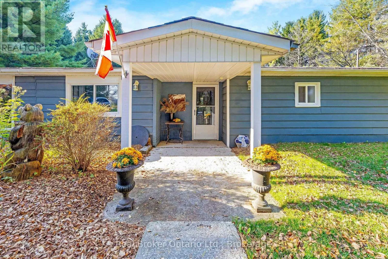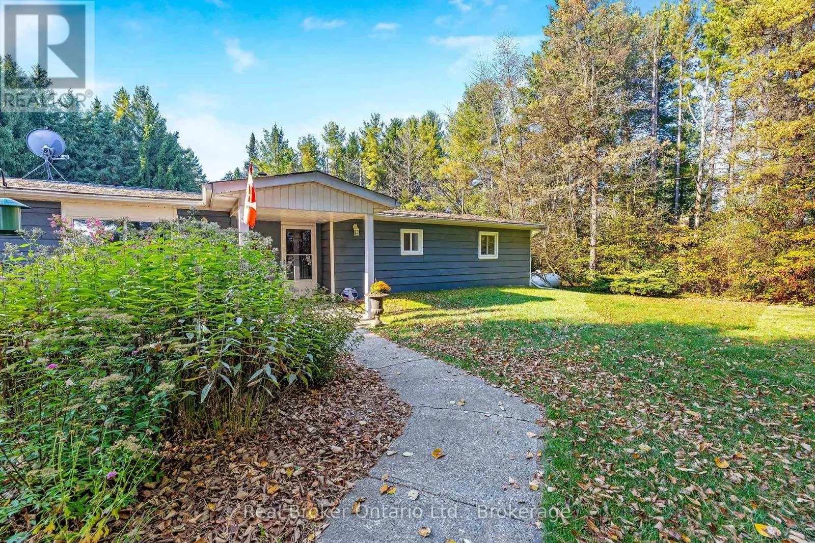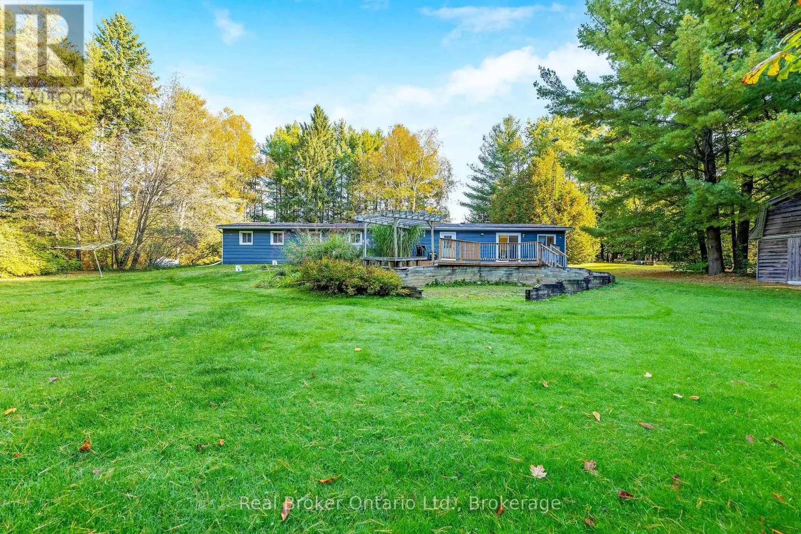 Townline to 11th Line Nestled behind a screen of mature trees, this charming ranch-style bungalow offers a beautifully landscaped front yard with cozy sitting areas. The inviting covered front porch leads into a spacious kitchen, complete with stainless steel appliances and a breakfast bar that opens to the living room. A separate dining room provides the perfect setting for family meals. The expansive family room, featuring a cathedral ceiling, has a walkout to a large wooden deck, surrounded by vibrant perennial gardens and a pergola. The main floor hosts three bedrooms and a full bathroom. Outside, a detached outbuilding with a loft and workshop, fully equipped with electricity, offers plenty of space for hobbies and storage. The serene backyard includes vegetable gardens and a personal orchard with cherry, pear, and apple trees. (id:27476)