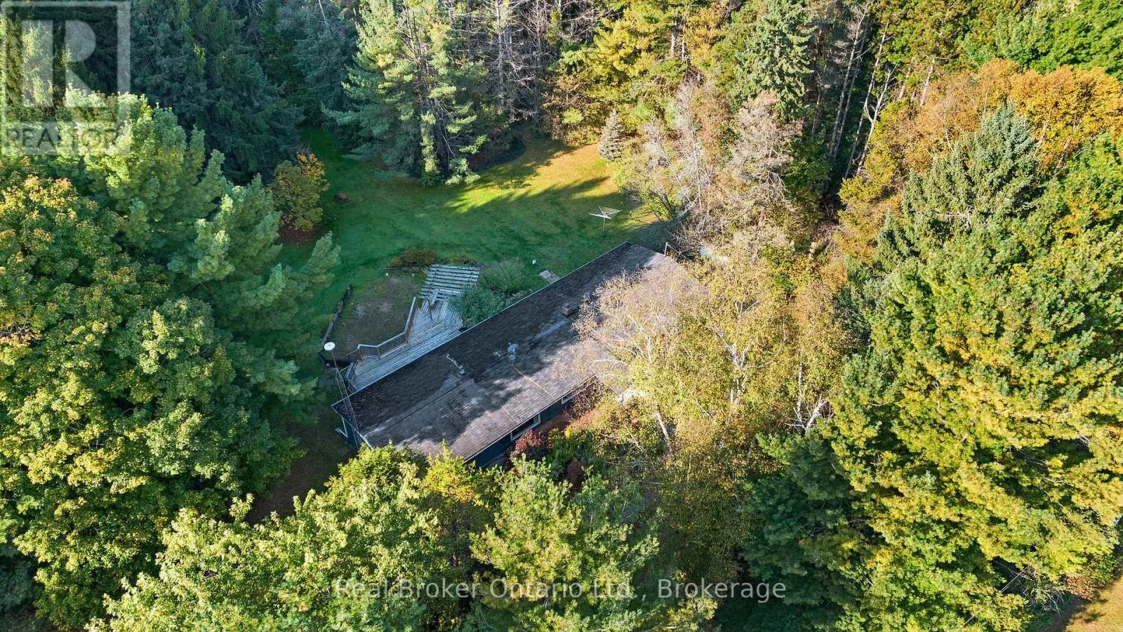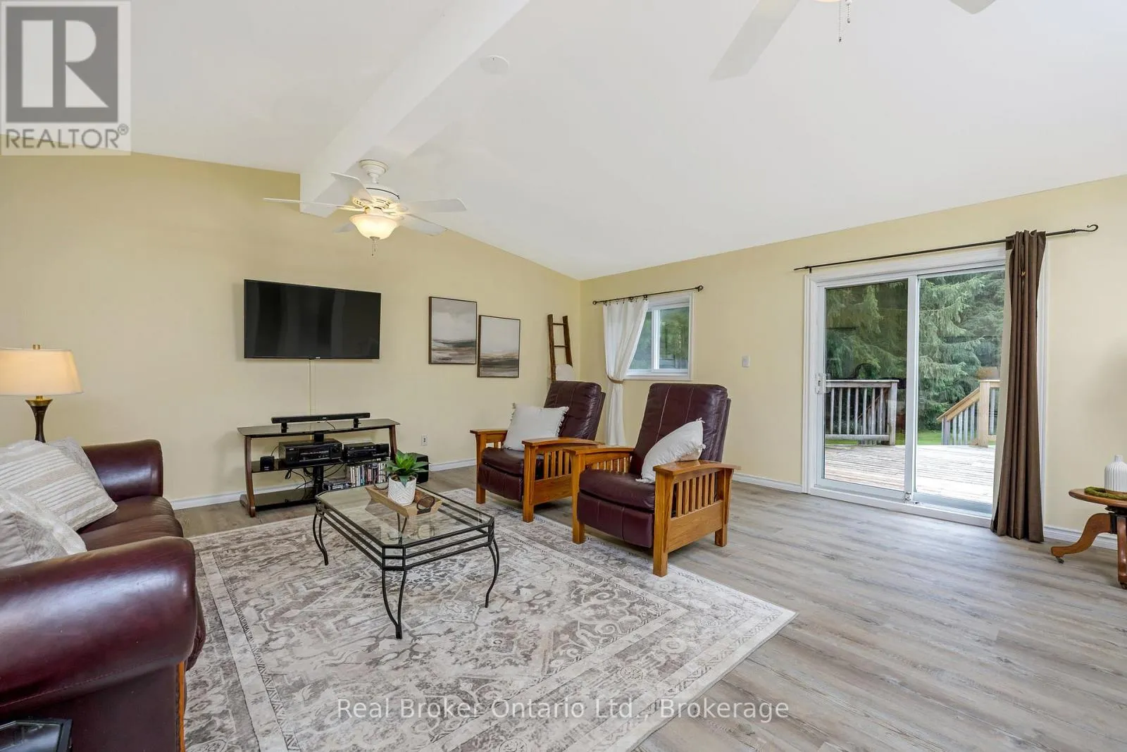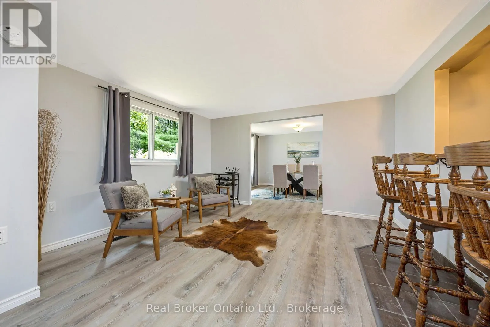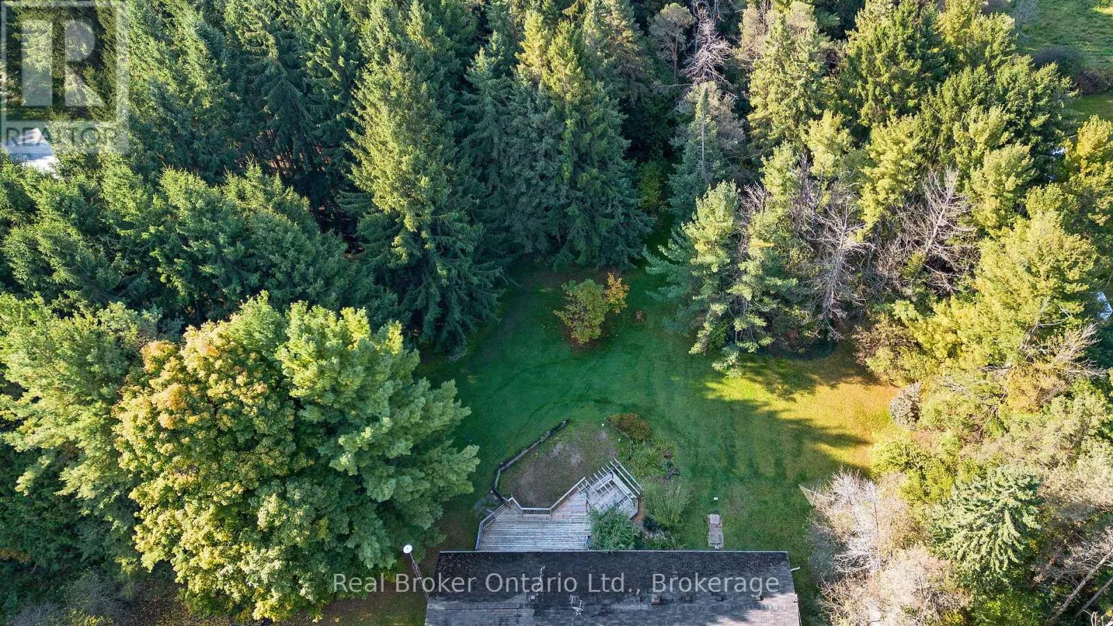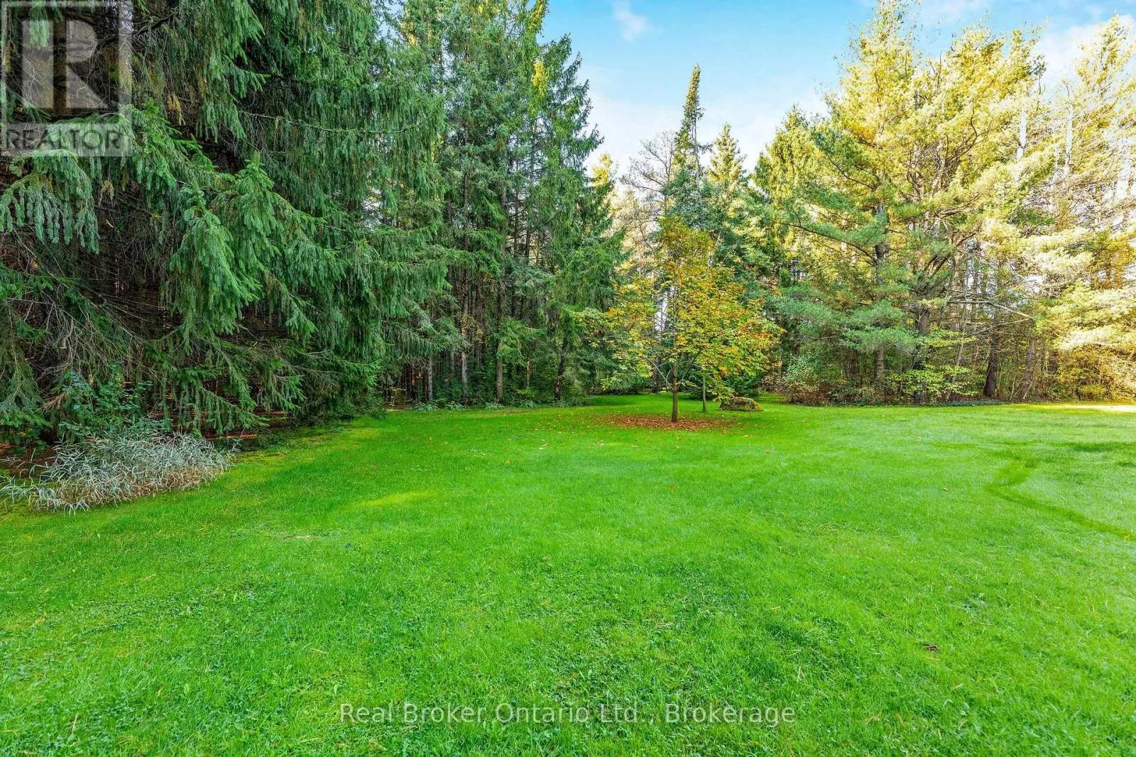 Townline to 11th Line Nestled behind a screen of mature trees, this charming ranch-style bungalow offers a beautifully landscaped front yard with cozy sitting areas. The inviting covered front porch leads into a spacious kitchen, complete with stainless steel appliances and a breakfast bar that opens to the living room. A separate dining room provides the perfect setting for family meals. The expansive family room, featuring a cathedral ceiling, has a walkout to a large wooden deck, surrounded by vibrant perennial gardens and a pergola. The main floor hosts three bedrooms and a full bathroom. Outside, a detached outbuilding with a loft and workshop, fully equipped with electricity, offers plenty of space for hobbies and storage. The serene backyard includes vegetable gardens and a personal orchard with cherry, pear, and apple trees. (id:27476)
