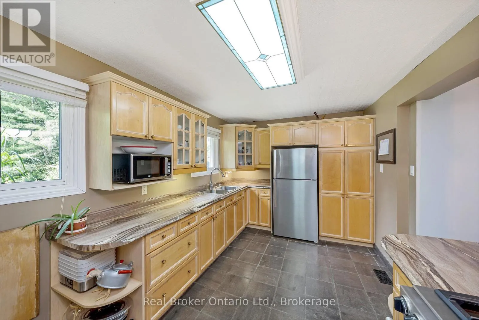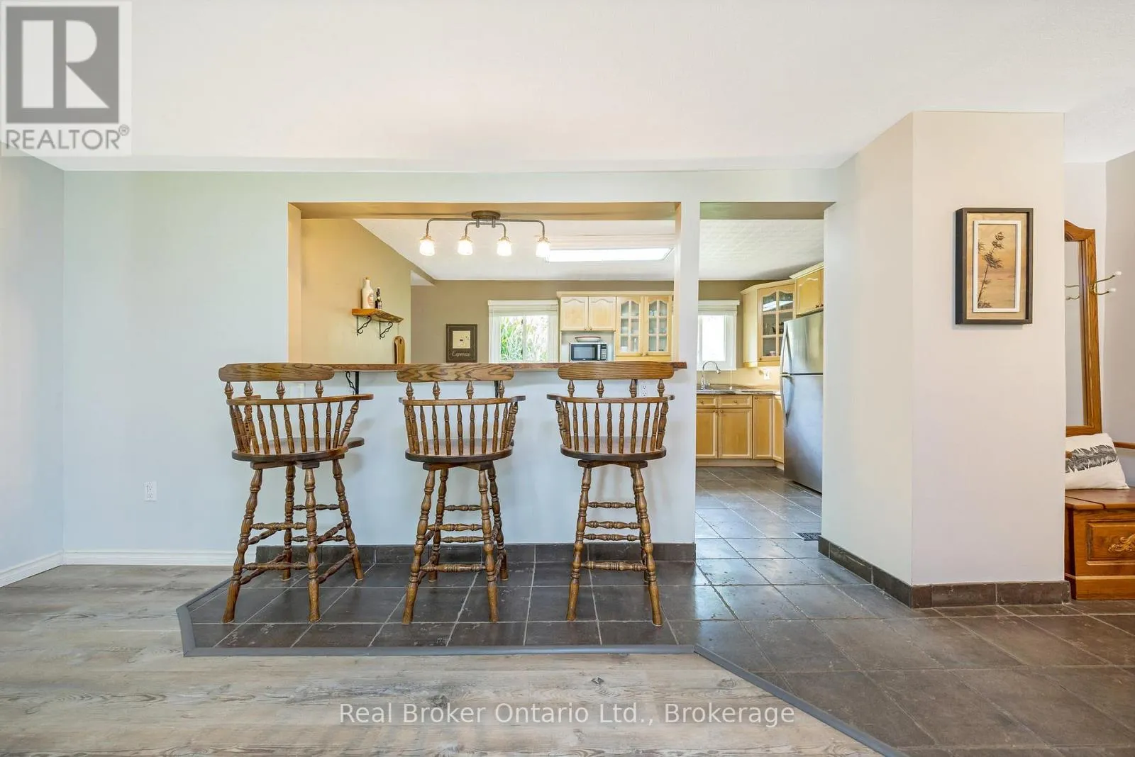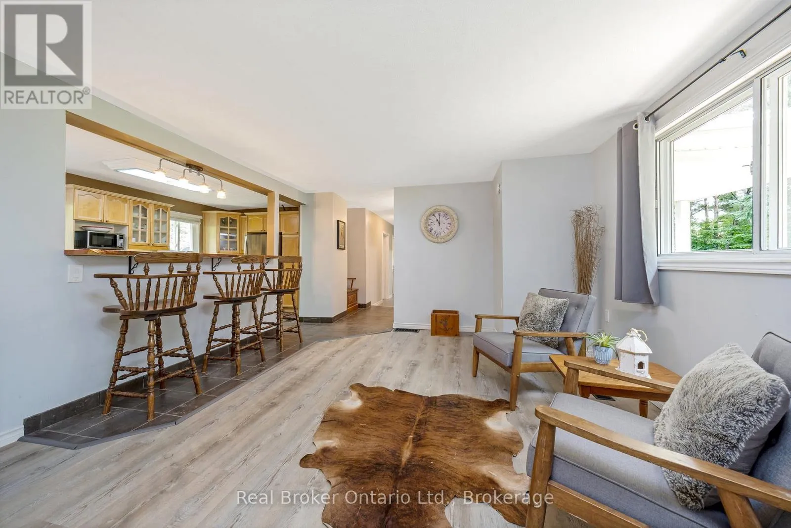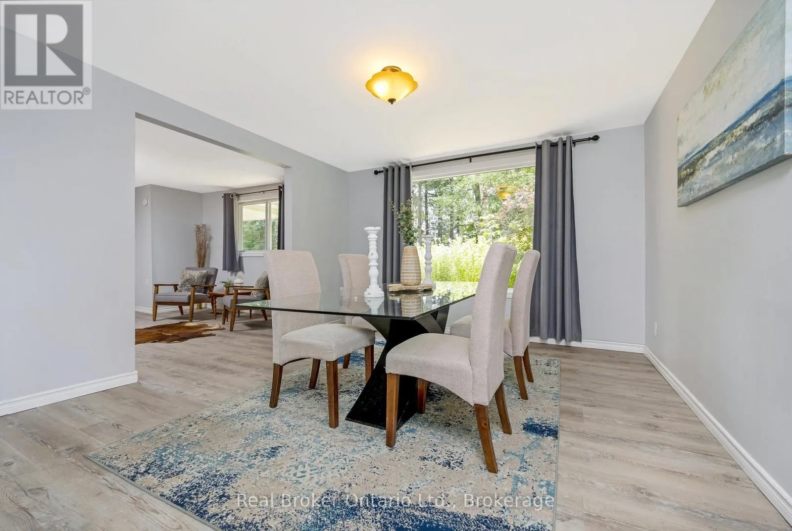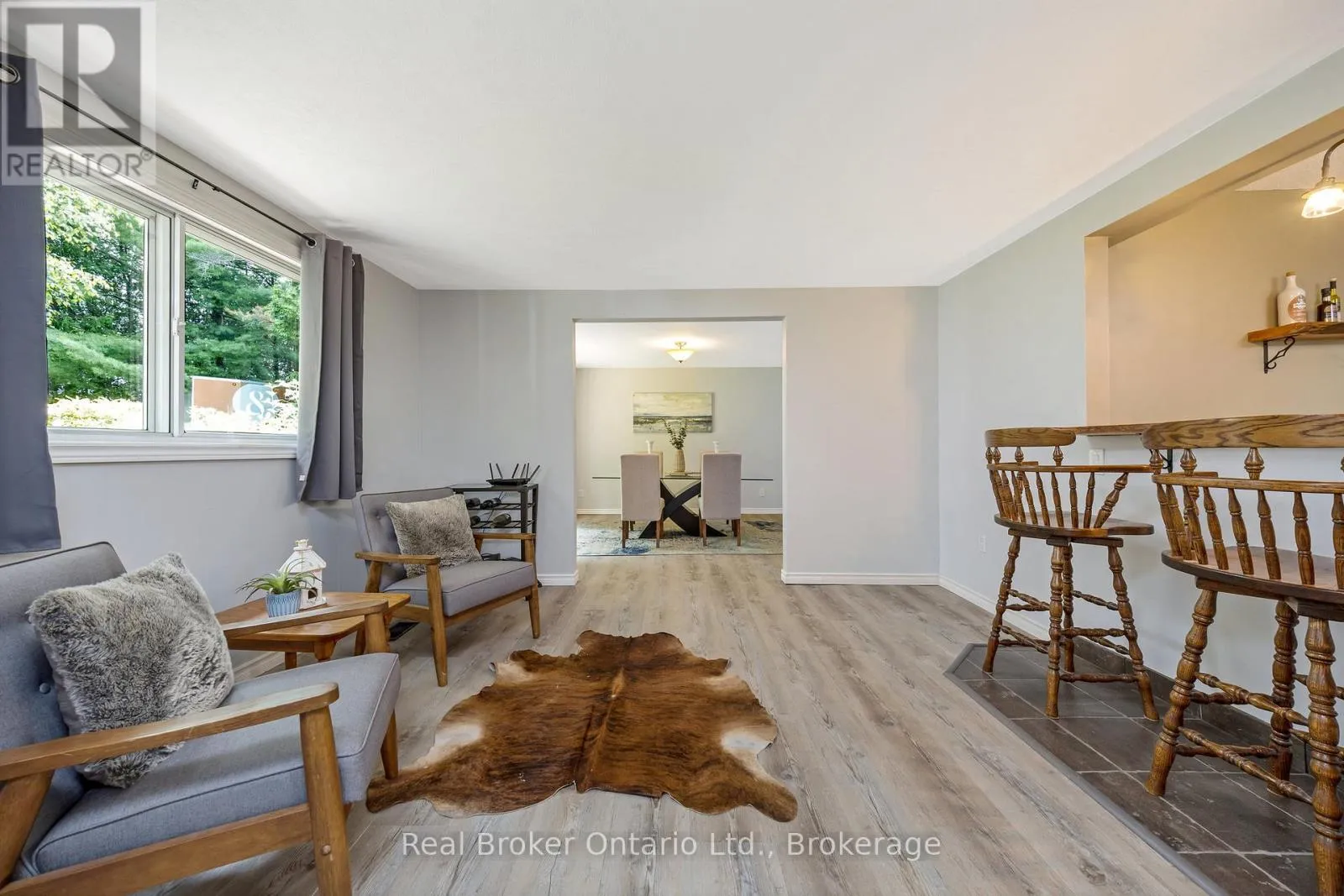 Townline to 11th Line Nestled behind a screen of mature trees, this charming ranch-style bungalow offers a beautifully landscaped front yard with cozy sitting areas. The inviting covered front porch leads into a spacious kitchen, complete with stainless steel appliances and a breakfast bar that opens to the living room. A separate dining room provides the perfect setting for family meals. The expansive family room, featuring a cathedral ceiling, has a walkout to a large wooden deck, surrounded by vibrant perennial gardens and a pergola. The main floor hosts three bedrooms and a full bathroom. Outside, a detached outbuilding with a loft and workshop, fully equipped with electricity, offers plenty of space for hobbies and storage. The serene backyard includes vegetable gardens and a personal orchard with cherry, pear, and apple trees. (id:27476)