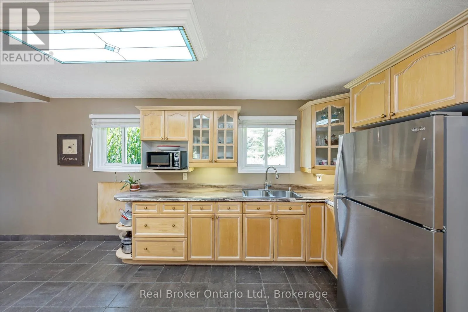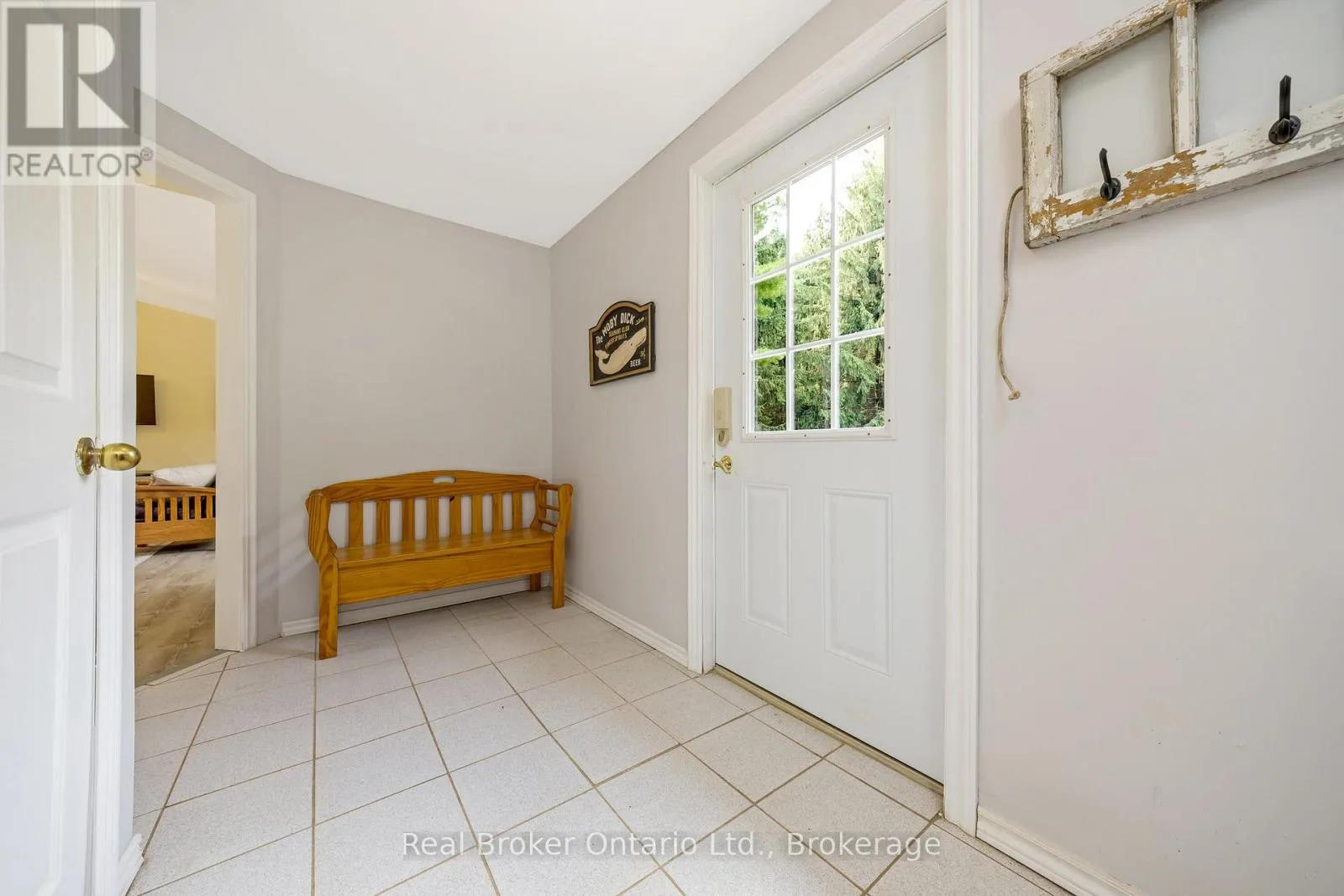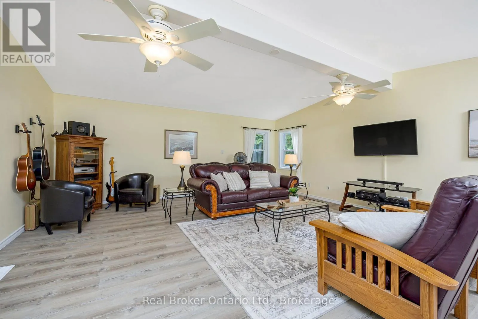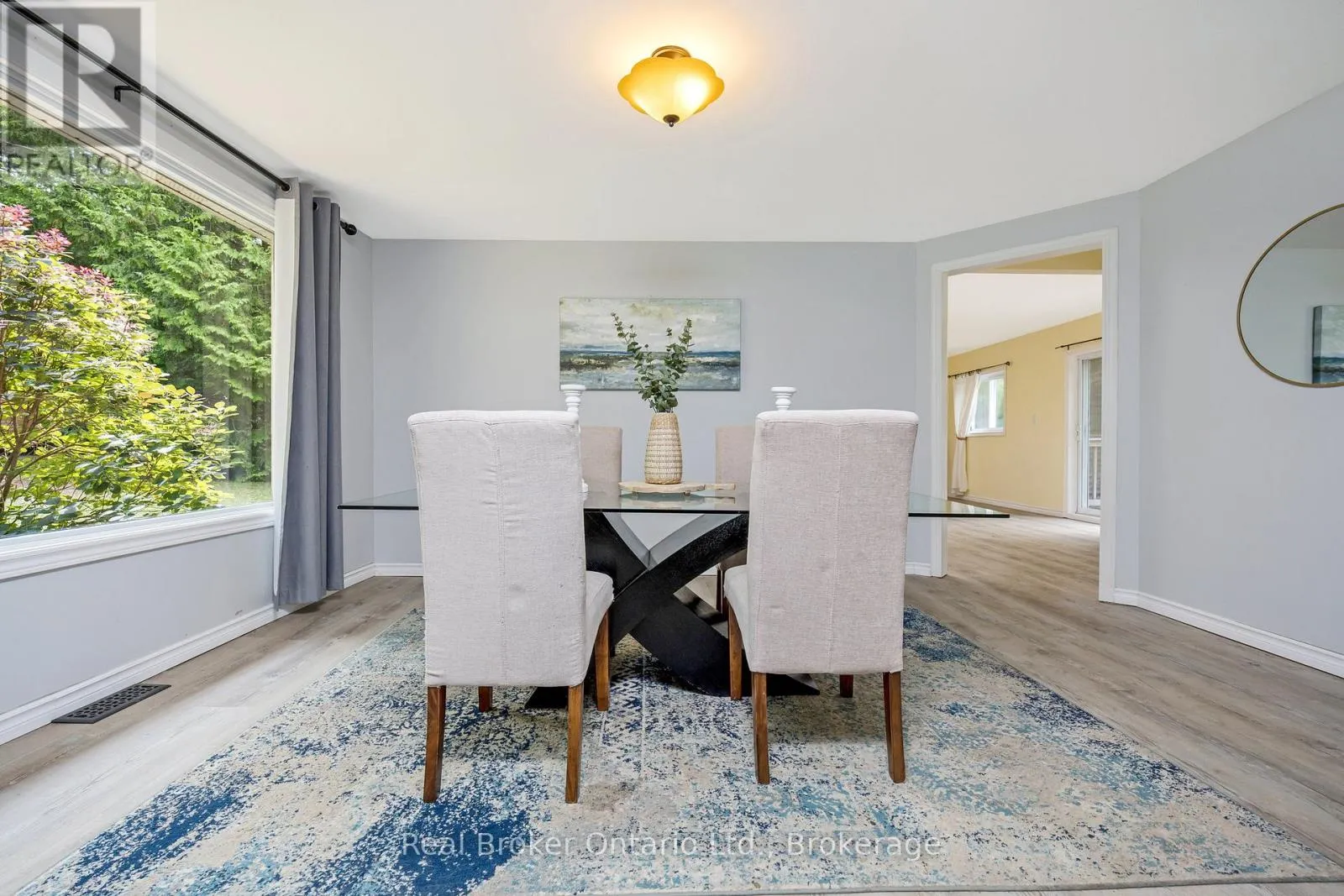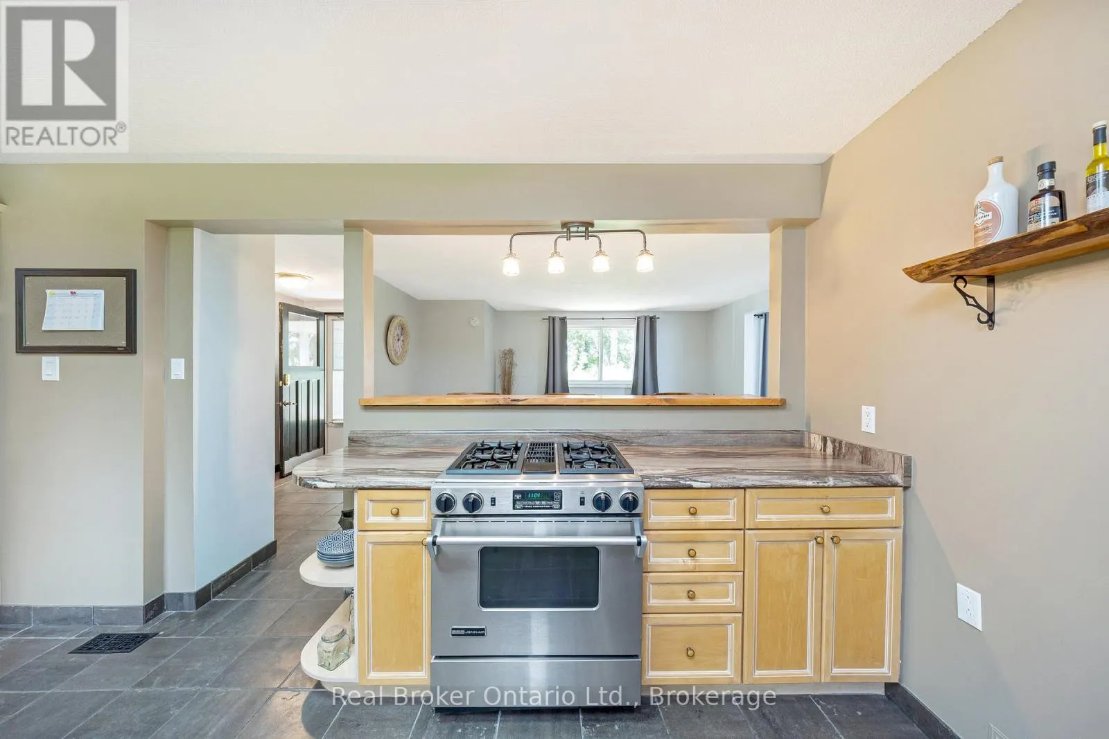Townline to 11th Line Nestled behind a screen of mature trees, this charming ranch-style bungalow offers a beautifully landscaped front yard with cozy sitting areas. The inviting covered front porch leads into a spacious kitchen, complete with stainless steel appliances and a breakfast bar that opens to the living room. A separate dining room provides the perfect setting for family meals. The expansive family room, featuring a cathedral ceiling, has a walkout to a large wooden deck, surrounded by vibrant perennial gardens and a pergola. The main floor hosts three bedrooms and a full bathroom. Outside, a detached outbuilding with a loft and workshop, fully equipped with electricity, offers plenty of space for hobbies and storage. The serene backyard includes vegetable gardens and a personal orchard with cherry, pear, and apple trees. (id:27476)