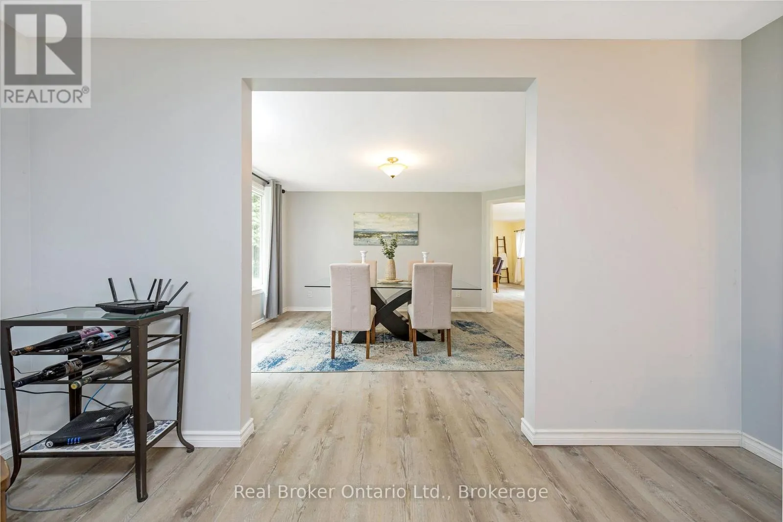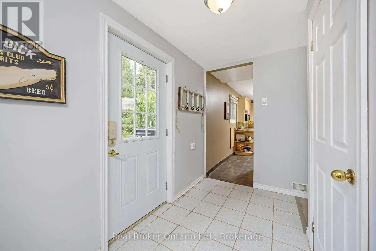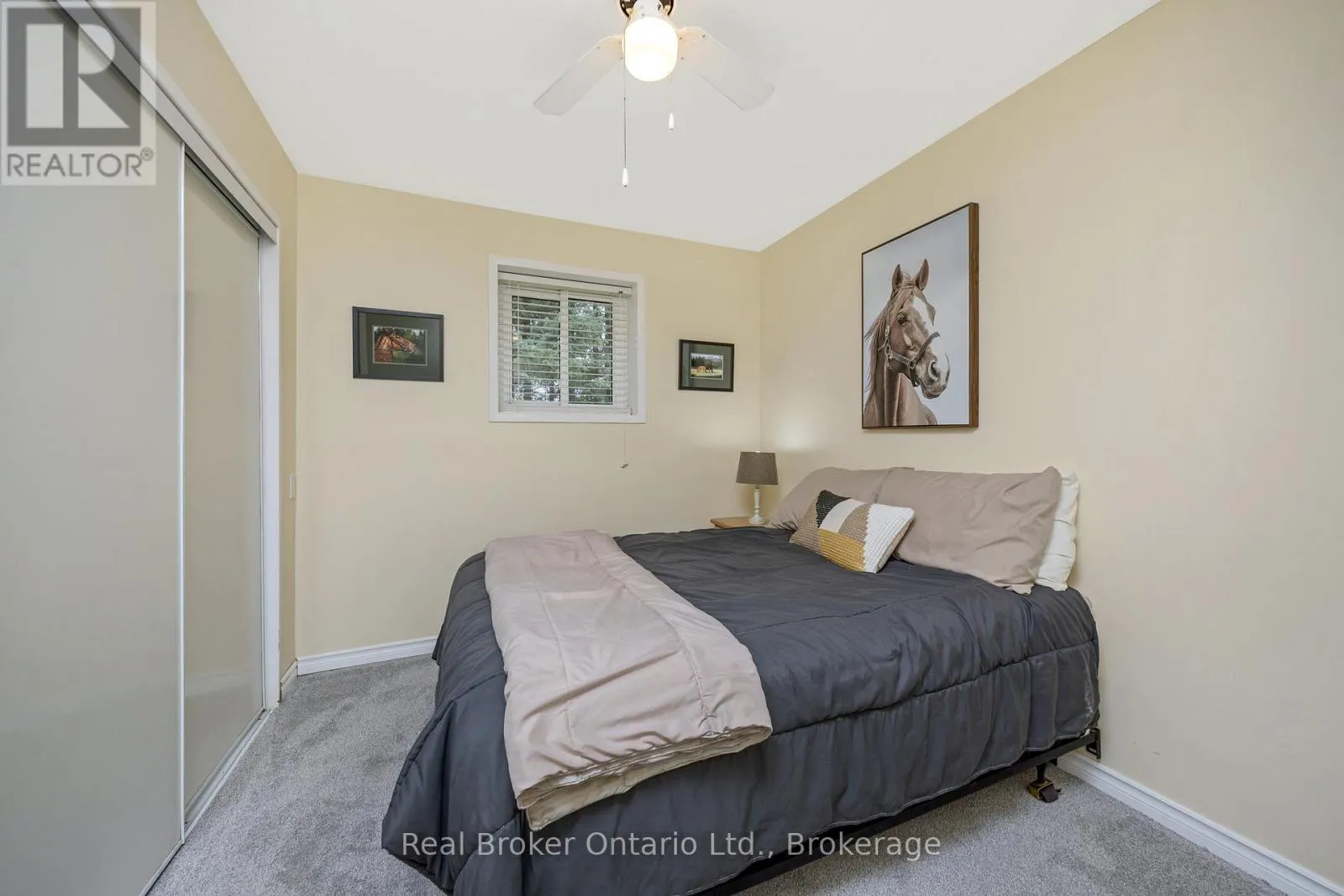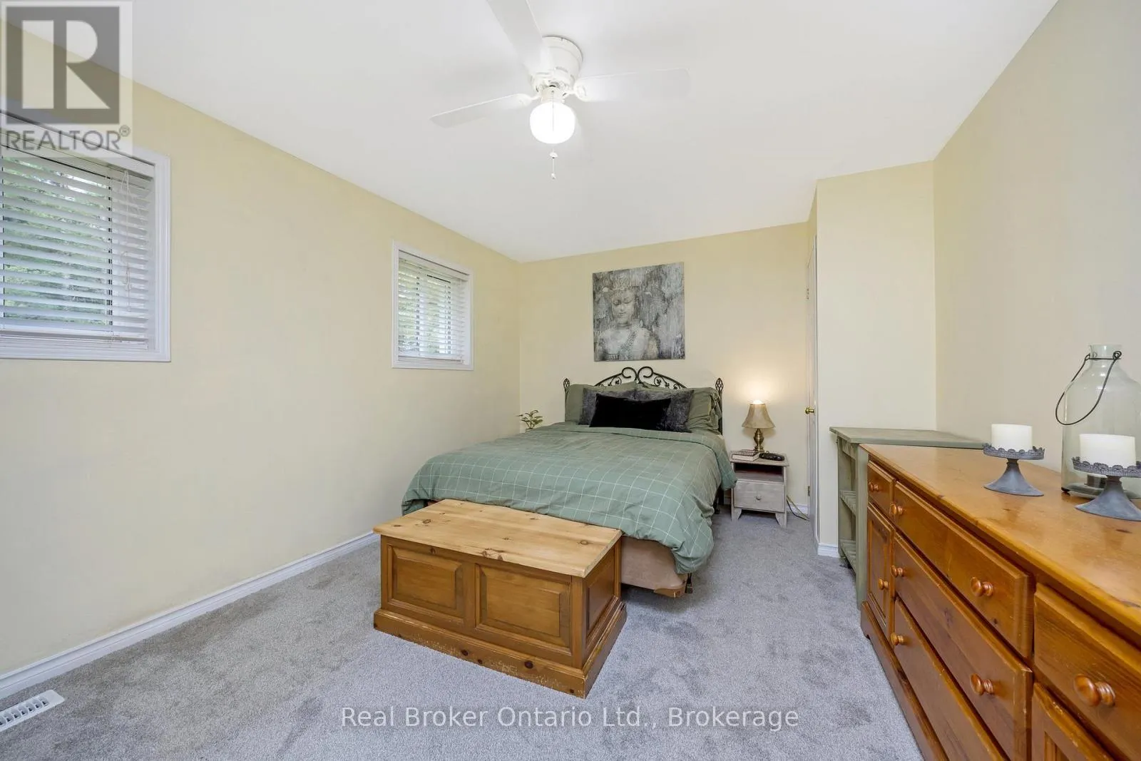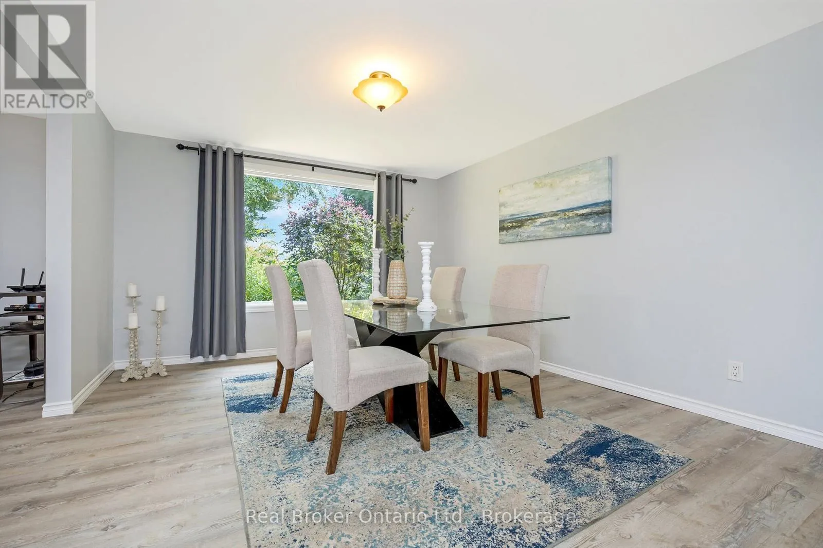 Townline to 11th Line Nestled behind a screen of mature trees, this charming ranch-style bungalow offers a beautifully landscaped front yard with cozy sitting areas. The inviting covered front porch leads into a spacious kitchen, complete with stainless steel appliances and a breakfast bar that opens to the living room. A separate dining room provides the perfect setting for family meals. The expansive family room, featuring a cathedral ceiling, has a walkout to a large wooden deck, surrounded by vibrant perennial gardens and a pergola. The main floor hosts three bedrooms and a full bathroom. Outside, a detached outbuilding with a loft and workshop, fully equipped with electricity, offers plenty of space for hobbies and storage. The serene backyard includes vegetable gardens and a personal orchard with cherry, pear, and apple trees. (id:27476)