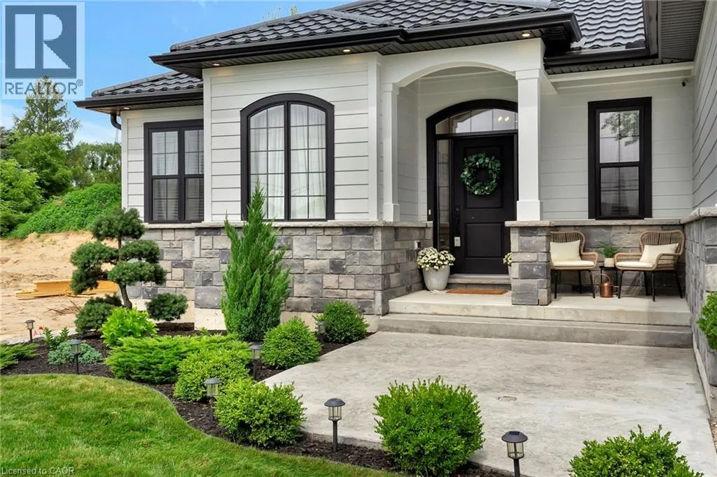 Eden Line to Plank Rd This stunning 2,141 sq. ft. bungalow is set on a picturesque lot and offers exceptional curb appeal with a double-car garage, elegant stone accents, metal roof, and sleek black trim. Beautiful landscaping and a wide concrete walkway welcome you into a thoughtfully designed home featuring soaring 9-foot ceilings and upscale finishes throughout. The gourmet kitchen is a showstopper, complete with rich dark cabinetry extending to the ceiling, striking high-contrast quartz countertops, upgraded fixtures, and tiled floors and backsplash. The oversized island is ideal for casual dining and entertaining, while the adjoining dinette offers a more formal dining space with walk-out access to the raised deckâperfect for indoor/outdoor living and enjoying scenic views. The living room invites you to unwind by the cozy stone corner gas fireplace. Additional main-floor conveniences include a stylish 2-piece powder room and a separate laundry room with custom cabinetry and quartz counters. The primary bedroom serves as a private retreat, featuring a luxurious 4-piece ensuite with a stunning glass shower and a relaxing soaker tub. Two additional bedrooms offer generous space for family, guests, or a home office, and are supported by a full 4-piece bathroom. The expansive double-car garage provides ample room for vehicles and storage, while the single-wide driveway expands to a triple-wide apron, offering abundant parking. The unfinished basement includes a finished staircase, bathroom rough-in, and deep windowsâan excellent opportunity to create additional living space tailored to your needs. Ideally located close to schools, shopping, and everyday amenities, this exceptional home is also just 30 minutes from Amazon, Toyota, and Volkswagenâs Battery Plantâmaking it a perfect blend of modern style, functionality, and convenient commuting. (id:27476)