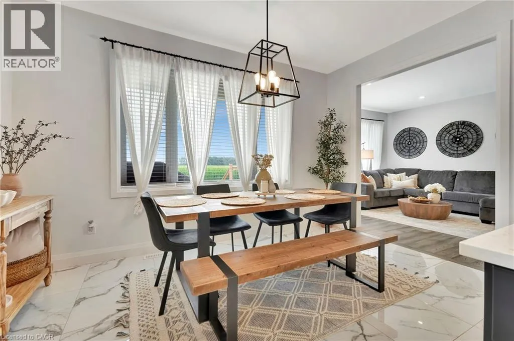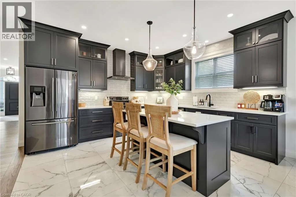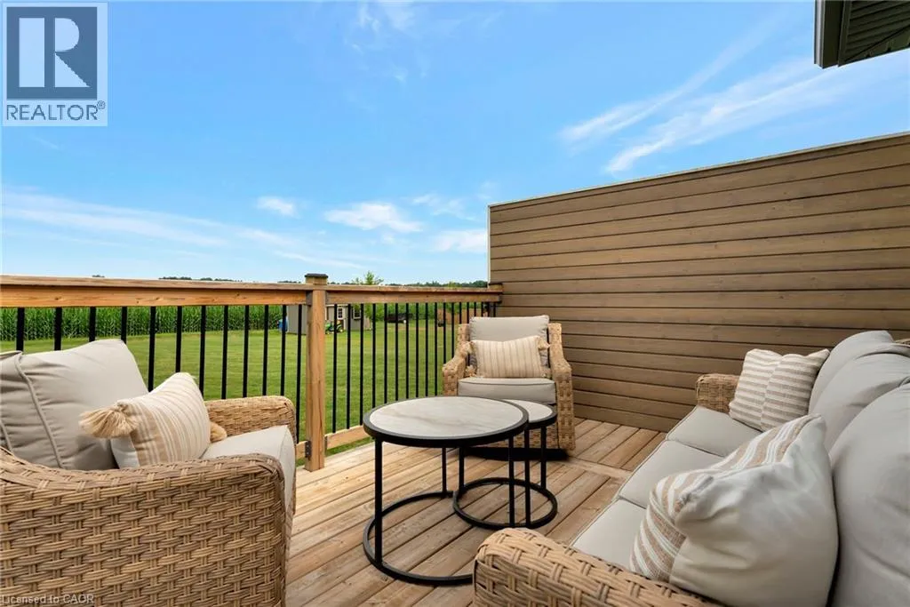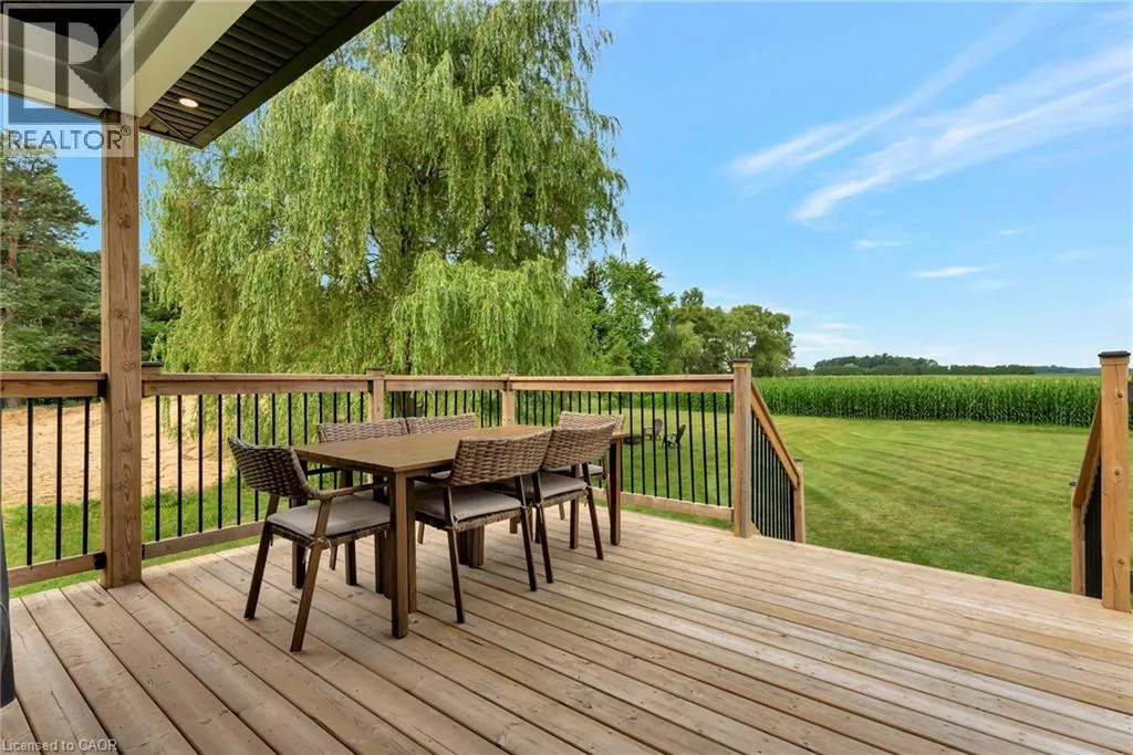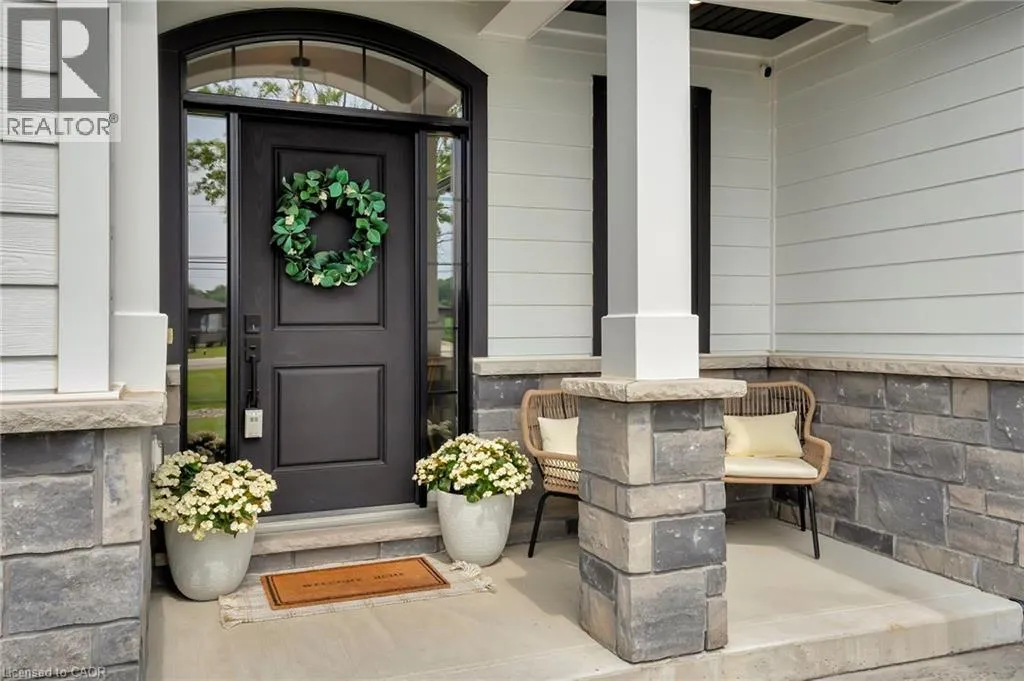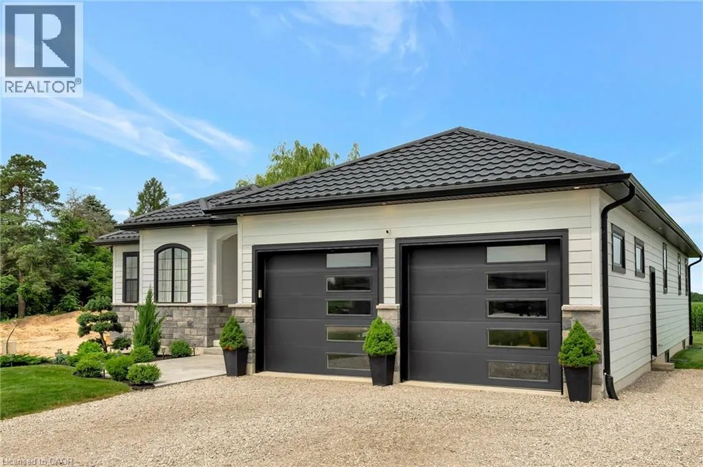 Eden Line to Plank Rd This stunning 2,141 sq. ft. bungalow is set on a picturesque lot and offers exceptional curb appeal with a double-car garage, elegant stone accents, metal roof, and sleek black trim. Beautiful landscaping and a wide concrete walkway welcome you into a thoughtfully designed home featuring soaring 9-foot ceilings and upscale finishes throughout. The gourmet kitchen is a showstopper, complete with rich dark cabinetry extending to the ceiling, striking high-contrast quartz countertops, upgraded fixtures, and tiled floors and backsplash. The oversized island is ideal for casual dining and entertaining, while the adjoining dinette offers a more formal dining space with walk-out access to the raised deck-perfect for indoor/outdoor living and enjoying scenic views. The living room invites you to unwind by the cozy stone corner gas fireplace. Additional main-floor conveniences include a stylish 2-piece powder room and a separate laundry room with custom cabinetry and quartz counters. The primary bedroom serves as a private retreat, featuring a luxurious 4-piece ensuite with a stunning glass shower and a relaxing soaker tub. Two additional bedrooms offer generous space for family, guests, or a home office, and are supported by a full 4-piece bathroom. The expansive double-car garage provides ample room for vehicles and storage, while the single-wide driveway expands to a triple-wide apron, offering abundant parking. The unfinished basement includes a finished staircase, bathroom rough-in, and deep windows-an excellent opportunity to create additional living space tailored to your needs. Ideally located close to schools, shopping, and everyday amenities, this exceptional home is also just 30 minutes from Amazon, Toyota, and Volkswagen's Battery Plant-making it a perfect blend of modern style, functionality, and convenient commuting. (id:27476)