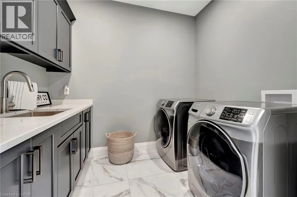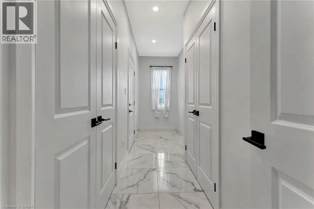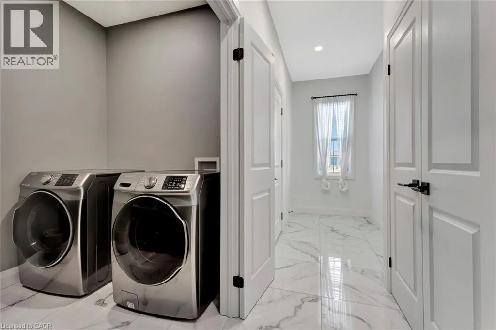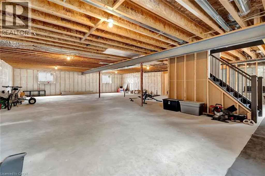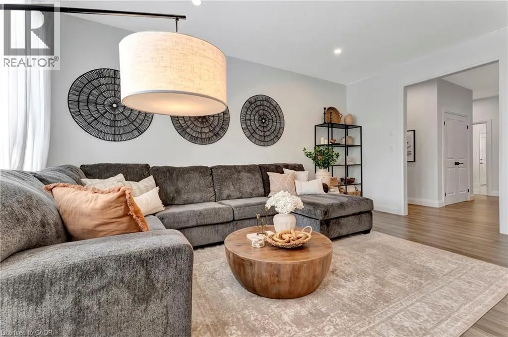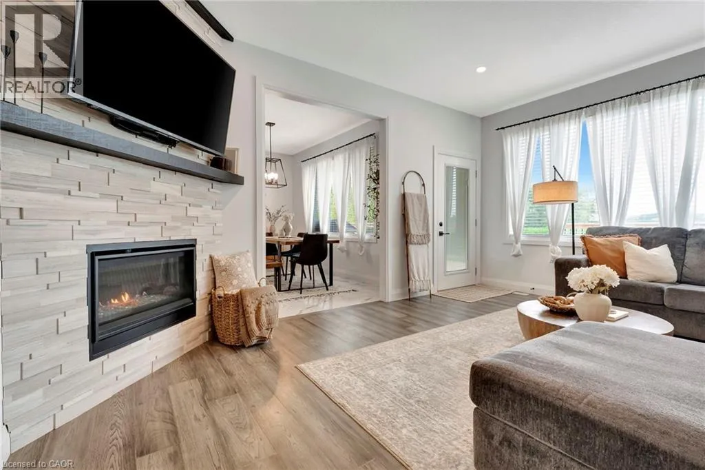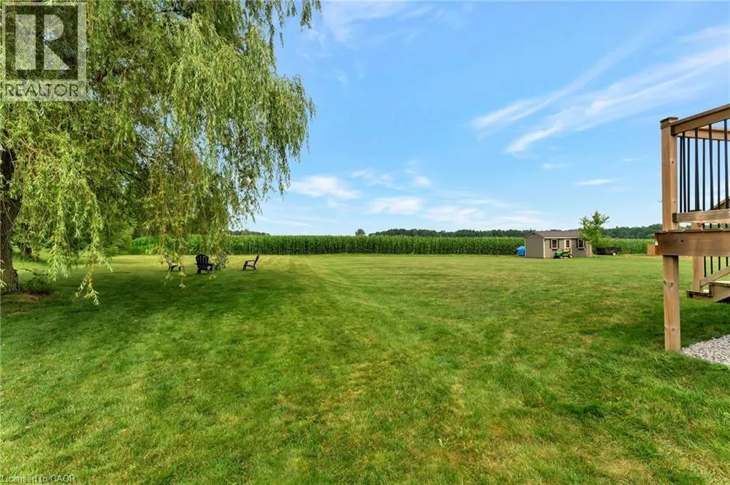 Eden Line to Plank Rd This stunning 2,141 sq. ft. bungalow is set on a picturesque lot and offers exceptional curb appeal with a double-car garage, elegant stone accents, metal roof, and sleek black trim. Beautiful landscaping and a wide concrete walkway welcome you into a thoughtfully designed home featuring soaring 9-foot ceilings and upscale finishes throughout. The gourmet kitchen is a showstopper, complete with rich dark cabinetry extending to the ceiling, striking high-contrast quartz countertops, upgraded fixtures, and tiled floors and backsplash. The oversized island is ideal for casual dining and entertaining, while the adjoining dinette offers a more formal dining space with walk-out access to the raised deck-perfect for indoor/outdoor living and enjoying scenic views. The living room invites you to unwind by the cozy stone corner gas fireplace. Additional main-floor conveniences include a stylish 2-piece powder room and a separate laundry room with custom cabinetry and quartz counters. The primary bedroom serves as a private retreat, featuring a luxurious 4-piece ensuite with a stunning glass shower and a relaxing soaker tub. Two additional bedrooms offer generous space for family, guests, or a home office, and are supported by a full 4-piece bathroom. The expansive double-car garage provides ample room for vehicles and storage, while the single-wide driveway expands to a triple-wide apron, offering abundant parking. The unfinished basement includes a finished staircase, bathroom rough-in, and deep windows-an excellent opportunity to create additional living space tailored to your needs. Ideally located close to schools, shopping, and everyday amenities, this exceptional home is also just 30 minutes from Amazon, Toyota, and Volkswagen's Battery Plant-making it a perfect blend of modern style, functionality, and convenient commuting. (id:27476)