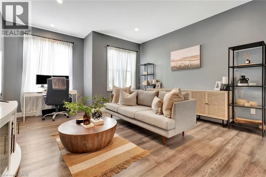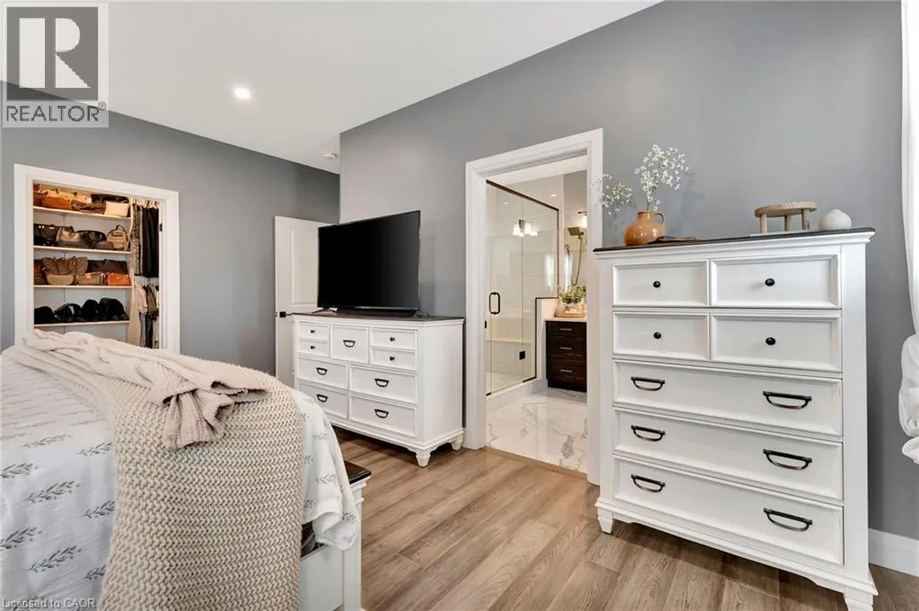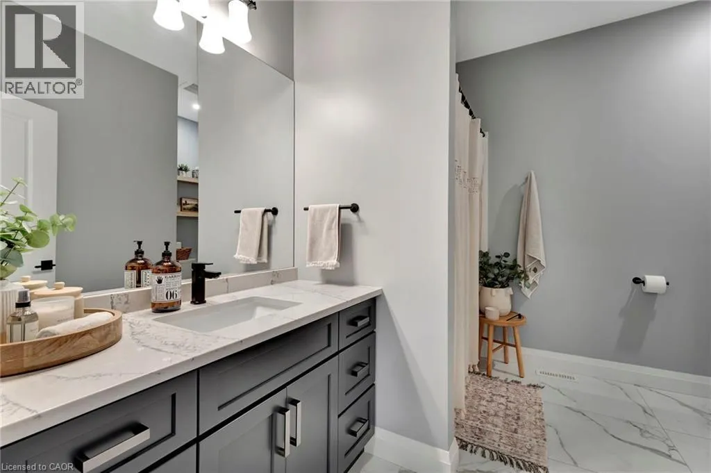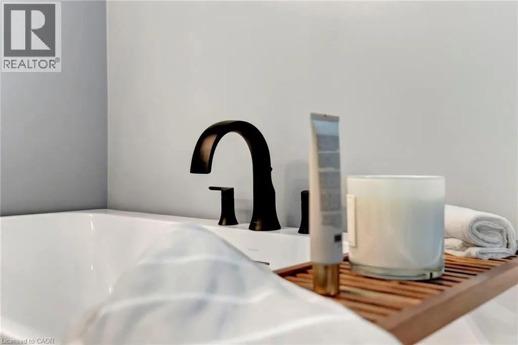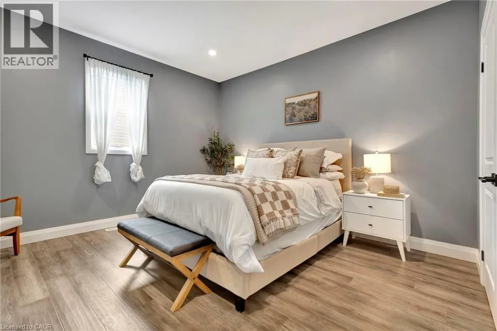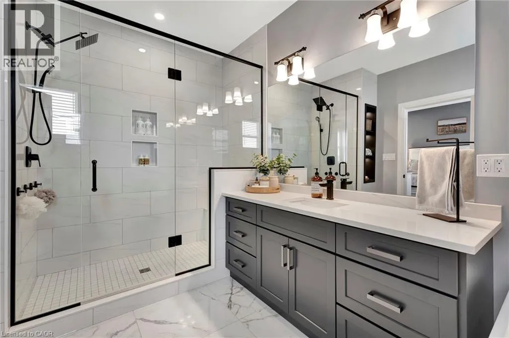 Eden Line to Plank Rd This stunning 2,141 sq. ft. bungalow is set on a picturesque lot and offers exceptional curb appeal with a double-car garage, elegant stone accents, metal roof, and sleek black trim. Beautiful landscaping and a wide concrete walkway welcome you into a thoughtfully designed home featuring soaring 9-foot ceilings and upscale finishes throughout. The gourmet kitchen is a showstopper, complete with rich dark cabinetry extending to the ceiling, striking high-contrast quartz countertops, upgraded fixtures, and tiled floors and backsplash. The oversized island is ideal for casual dining and entertaining, while the adjoining dinette offers a more formal dining space with walk-out access to the raised deck-perfect for indoor/outdoor living and enjoying scenic views. The living room invites you to unwind by the cozy stone corner gas fireplace. Additional main-floor conveniences include a stylish 2-piece powder room and a separate laundry room with custom cabinetry and quartz counters. The primary bedroom serves as a private retreat, featuring a luxurious 4-piece ensuite with a stunning glass shower and a relaxing soaker tub. Two additional bedrooms offer generous space for family, guests, or a home office, and are supported by a full 4-piece bathroom. The expansive double-car garage provides ample room for vehicles and storage, while the single-wide driveway expands to a triple-wide apron, offering abundant parking. The unfinished basement includes a finished staircase, bathroom rough-in, and deep windows-an excellent opportunity to create additional living space tailored to your needs. Ideally located close to schools, shopping, and everyday amenities, this exceptional home is also just 30 minutes from Amazon, Toyota, and Volkswagen's Battery Plant-making it a perfect blend of modern style, functionality, and convenient commuting. (id:27476)