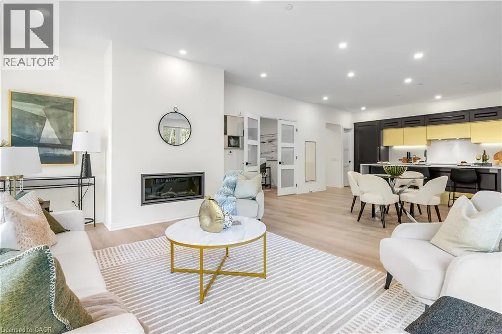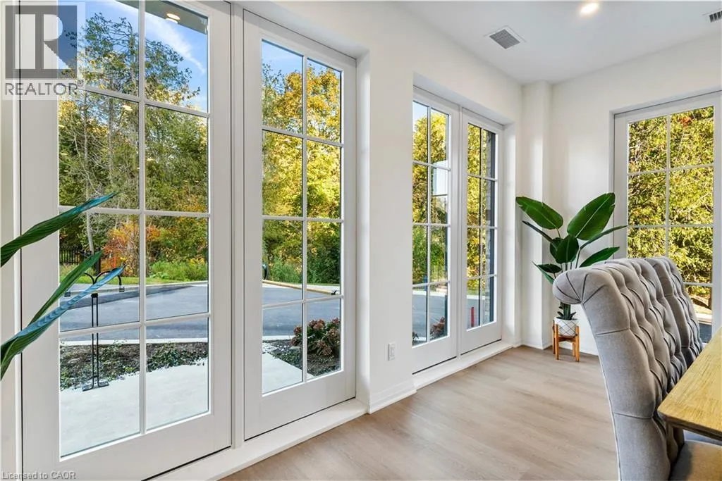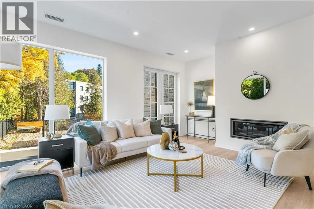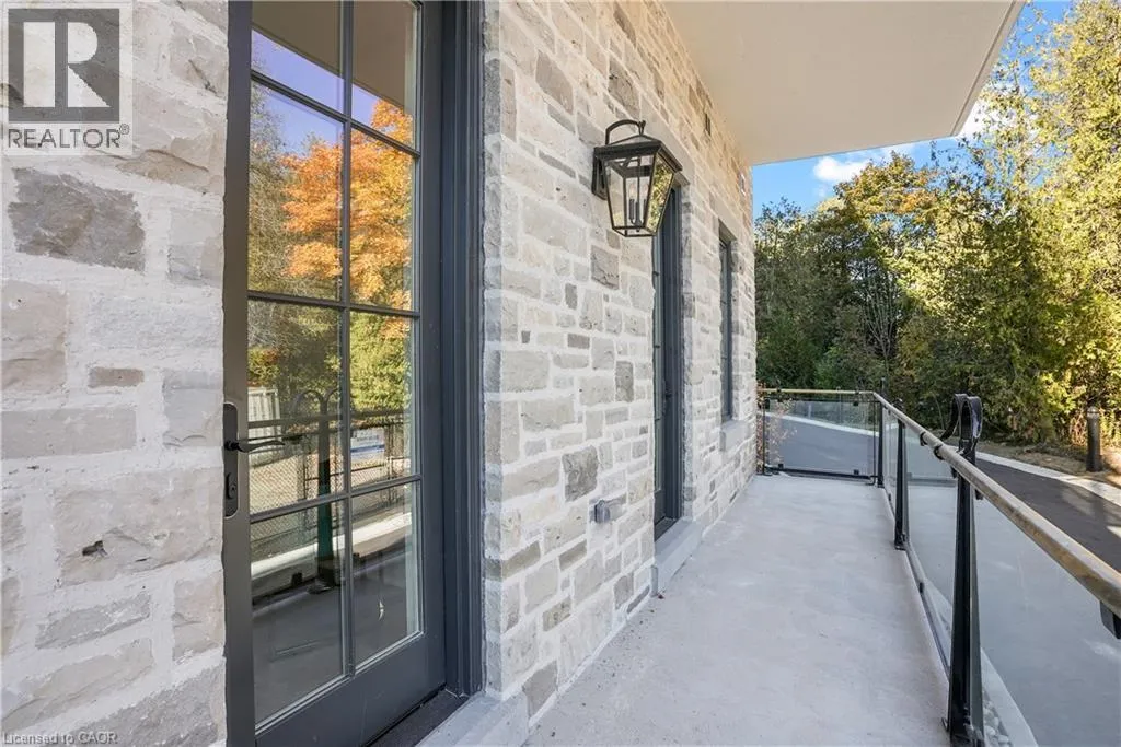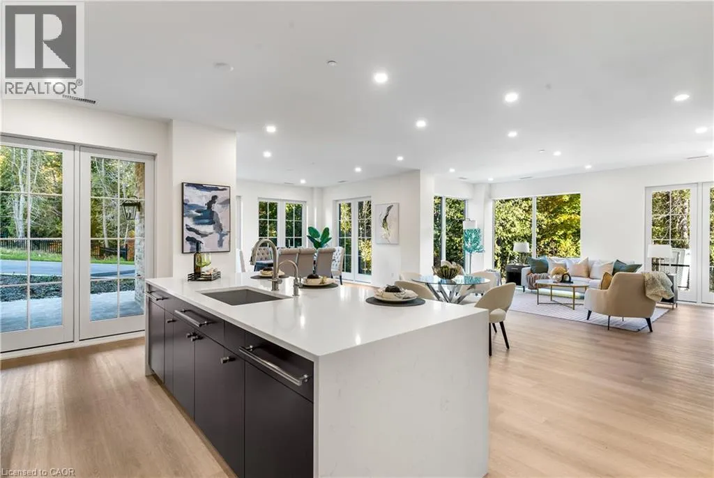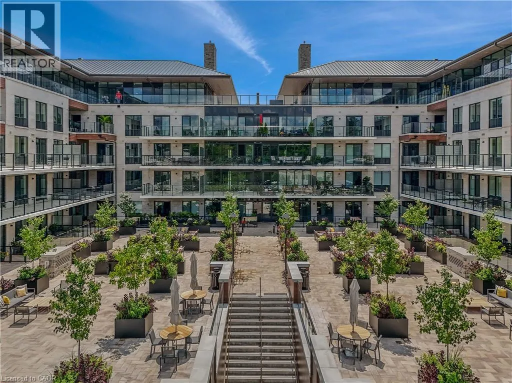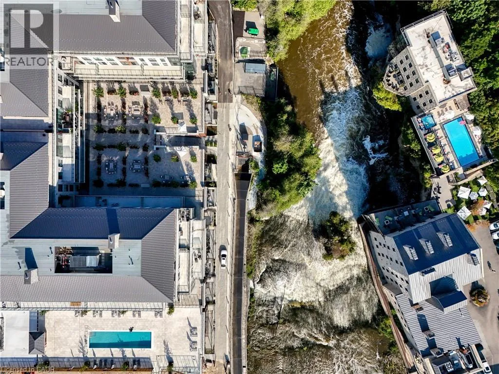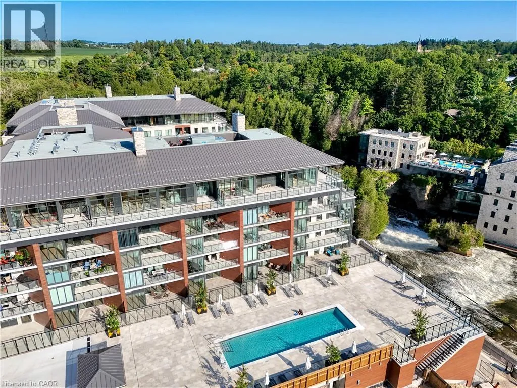 Wellington Rd 7 and Victoria St This one of a kind 2 bedroom plus den, 3 bath suite is an expansive 2,330 sq ft Custom Residence. Perfectly designed with a traditional home layout, its ideal for downsizers transitioning to condo living offering plenty of space and the ability to keep your large furniture. The open concept layout includes 10' ceilings and features a spacious kitchen with a large island with seating for four, and a rare walk-in pantry. A walkout leads to a private patio, perfect for outdoor dining and relaxation. The generous dining room accommodates a large table and is surrounded by windows with views of lush greenery. The open living room, with a cozy gas fireplace, offers space for multiple seating areas. Wall-to-wall windows frame stunning views of the Elora Gorge, the Elora Mills stonework, and Tranquil River views. Retreat to one of two expansive primary suites, each with walk-in closets, ensuite bathrooms, and walkouts to a private balcony overlooking the river. Fall asleep to the soothing sounds of flowing water. A versatile den is ideal for an office, TV room, or guest room. Additional highlights include being the only residence in the building with large laundry room complete with cabinetry and sink, gas fireplace, indoor parking with EV charger, and a storage locker just steps from the front door. Located on the highly desirable riverside trail level, this unit is especially appealing to pet owners and those who value the option of having direct access without reliance on an elevator. Just steps from Elora's top restaurants, shops and cafes, residents also enjoy resort style amenities including a Concierge, Lobby Coffee Bar with daily fresh pastries, Furnished Outdoor terrace, Elegant Lounge and Party Room, Fitness Center, Yoga Studio and Outdoor Pool with Spectacular River Views!! (id:27476)