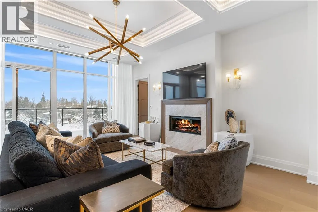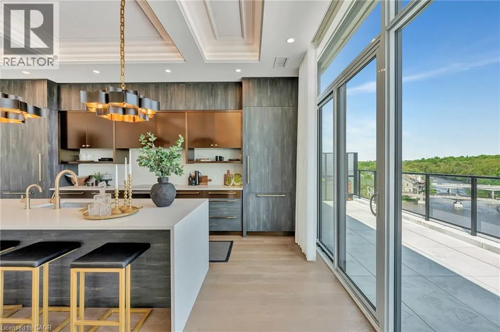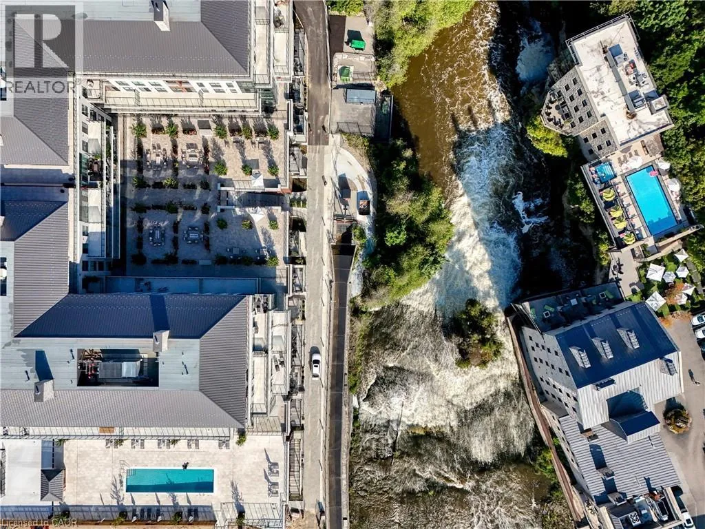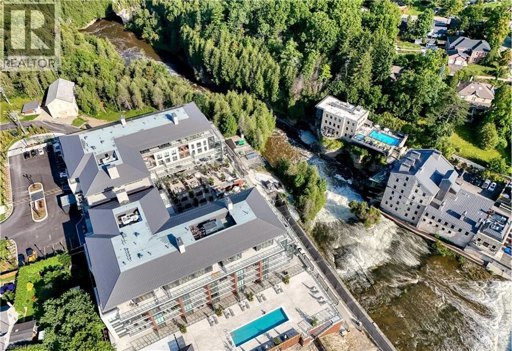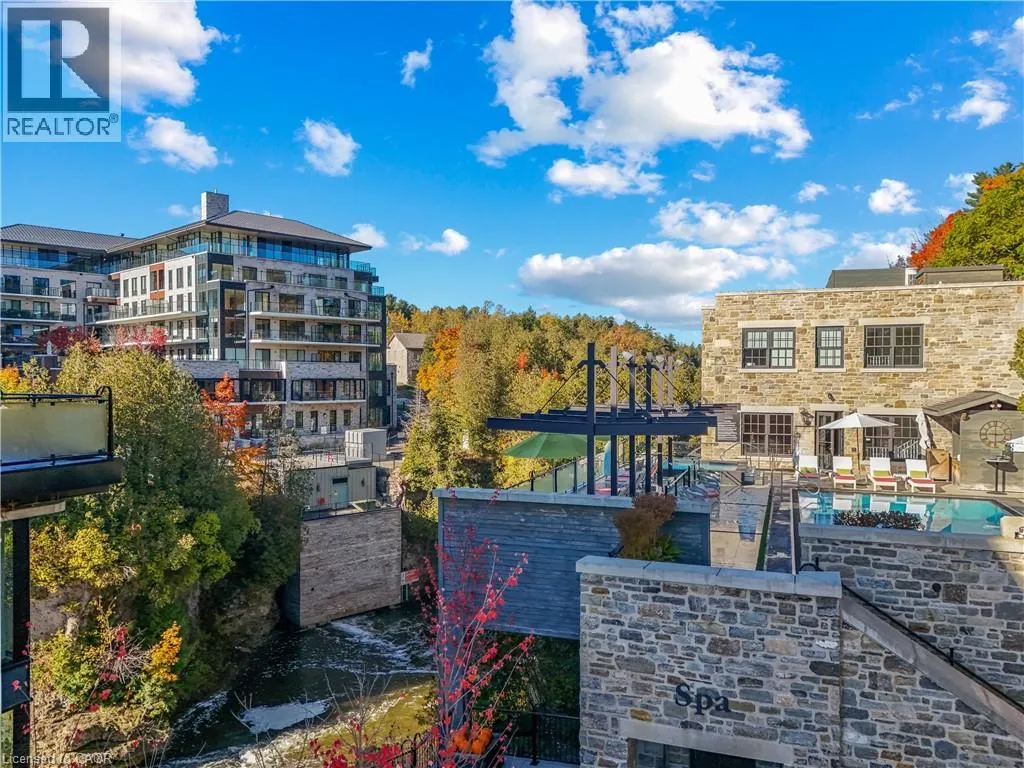 Wellington Rd 7 and Victoria St Experience elevated living at its finest in The Mill Penthouse! Set within the coveted Elora Mill Residences, this penthouse redefines luxury with soaring 10-foot ceilings, designer lighting, and curated finishes throughout. A gas fireplace adds warmth and sophistication to the open-concept living space, while the expansive private terrace, boasting over 650 sq. ft., offers a built-in gas line perfect for a custom outdoor kitchen, grill, or fireplace. Glass railings reveal panoramic, unobstructed views of the Elora River and its iconic bridges, with four separate walkouts creating seamless indoor-outdoor living. At the heart of the home, the chef-inspired kitchen impresses with a grand island with seating, full-height cabinetry, and upgraded Miele appliances. The open living and dining areas provide flexibility to design your perfect entertaining space, while a private den with sliding doors is ideal as a home office, media room, or formal dining area. The primary suite is a tranquil retreat, complete with a custom walk-in closet and a spa-like ensuite featuring a deep soaker tub, oversized glass shower, double vanity, and private water closet. A second bedroom, in its own private wing with a dedicated full bathroom, is perfect for guests or family. Residents enjoy exclusive access to resort-style amenities including a concierge, lobby coffee bar, residents' lounge, formal dining room, outdoor furnished riverfront terrace with firepits, and an outdoor pool with spectacular river views. Just steps from Elora's gourmet restaurants, boutique shops, and charming cafés, you'll enjoy living in this picturesque, walkable community. Complete with fully automated blinds, two parking spaces, and a storage locker, an opportunity to own a penthouse suite at one of Elora's most prestigious and sought-after addresses. (id:27476)