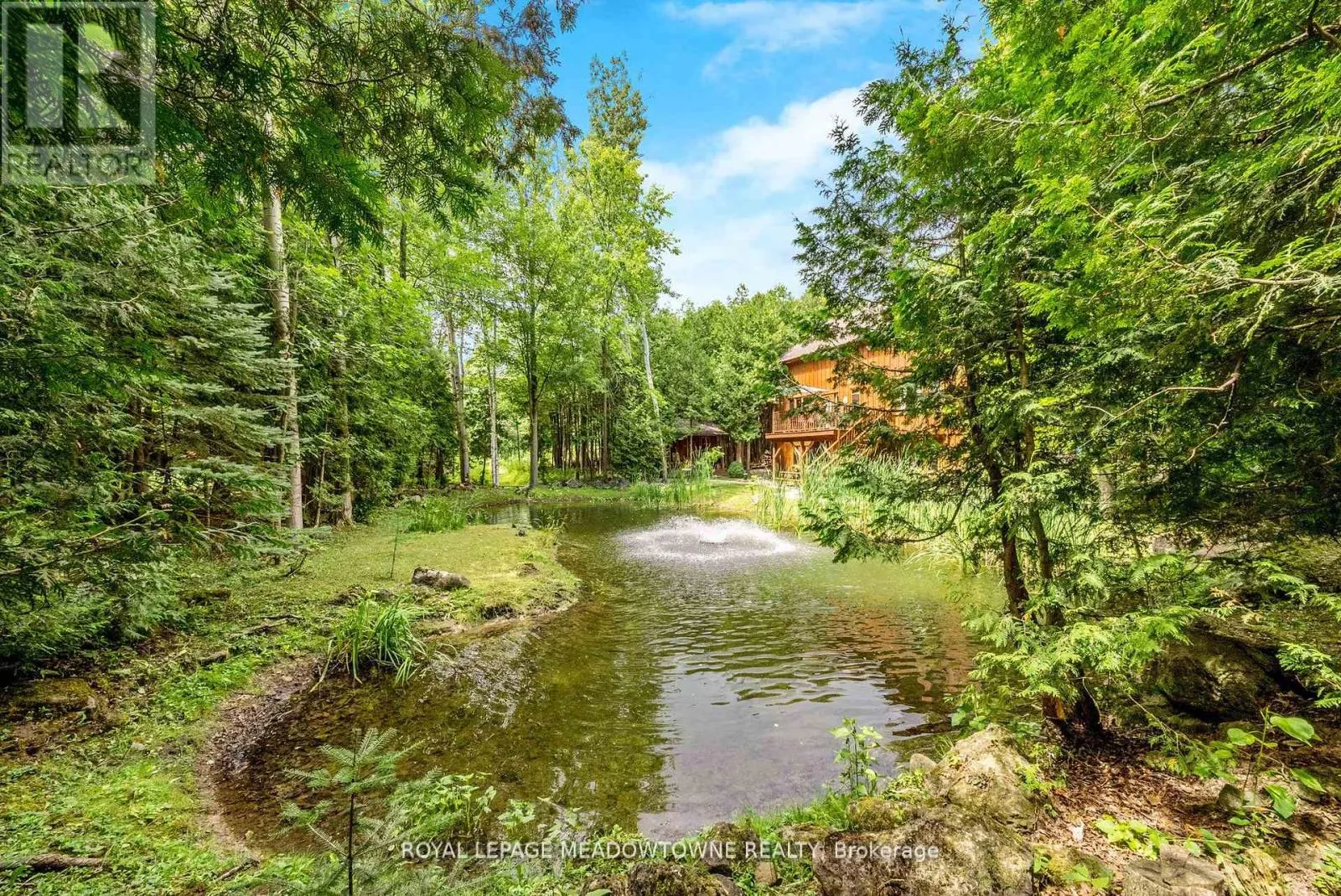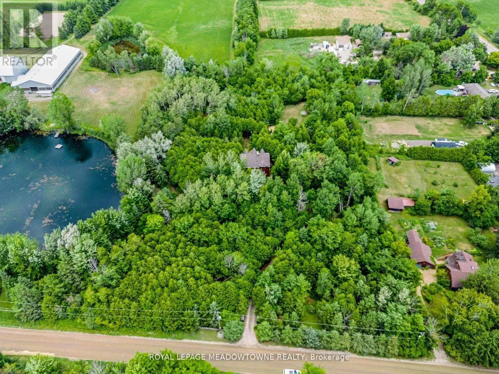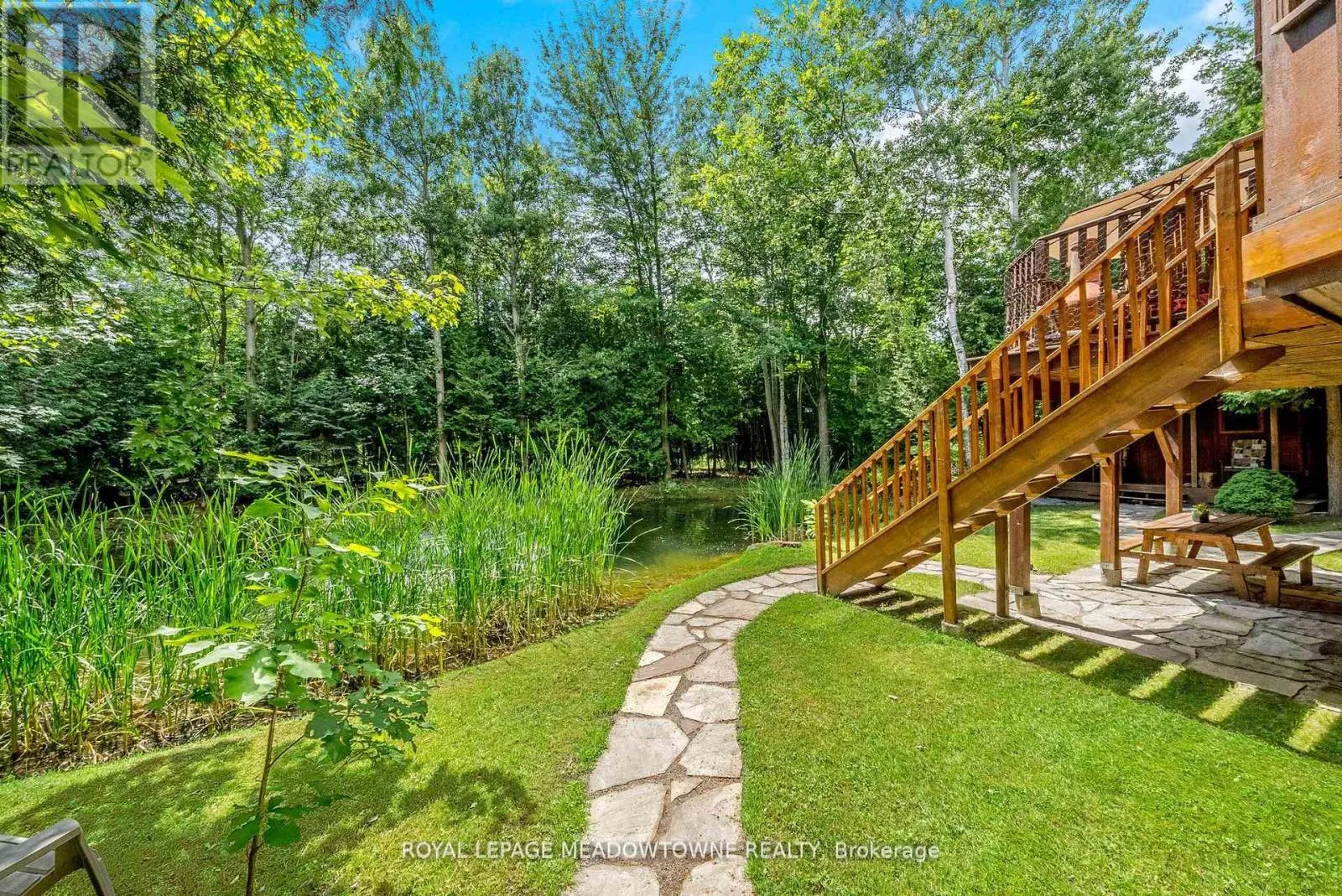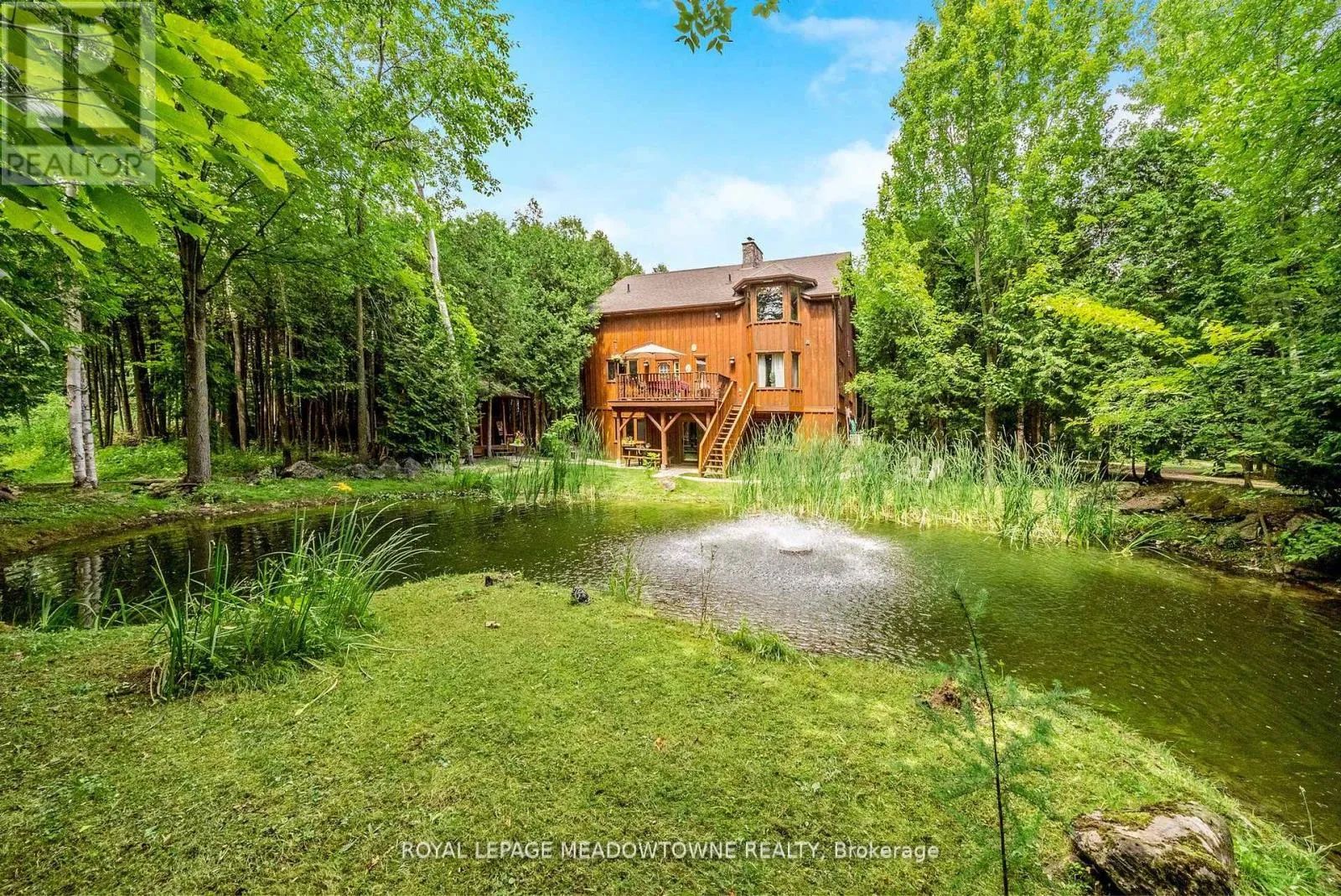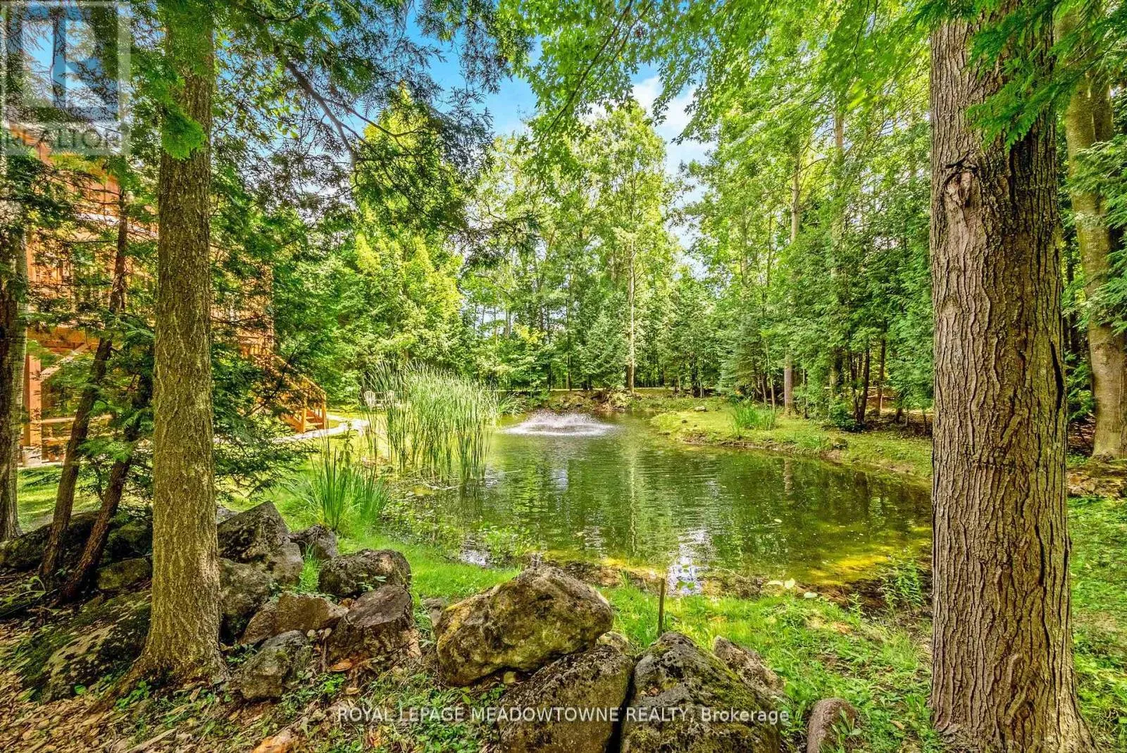Eighth Line / 32 Side Road Nestled on a private 1.7-acre treed lot with a picturesque pond and located on a quiet country road, this unique custom-built home is full of charm and character. Designed with soaring vaulted ceilings and a bright, open-concept layout, every window frames stunning views of the surrounding nature. The main floor offers a seamless flow between the living and dining areas, a spacious kitchen with ample cabinetry, pot lights and a walkout to the deck which overlooks the large pond plus a cozy family room with a fireplace for relaxed evenings. Upstairs, the expansive primary suite features vaulted ceilings, a fireplace and a huge walk-in closet. A second bedroom and a 4-piece bath complete the upper level. A versatile loft space adds extra storage or potential creative space. The newly added in-law suite (2024) on the walkout level includes two bedrooms, a kitchen and a 3pc bathroom. Enjoy peaceful country living less than one hour to Toronto and just minutes from Georgetown, Acton and Erin. This is the perfect blend of tranquility and convenience! Owner and Tenant occupied. (id:27476)