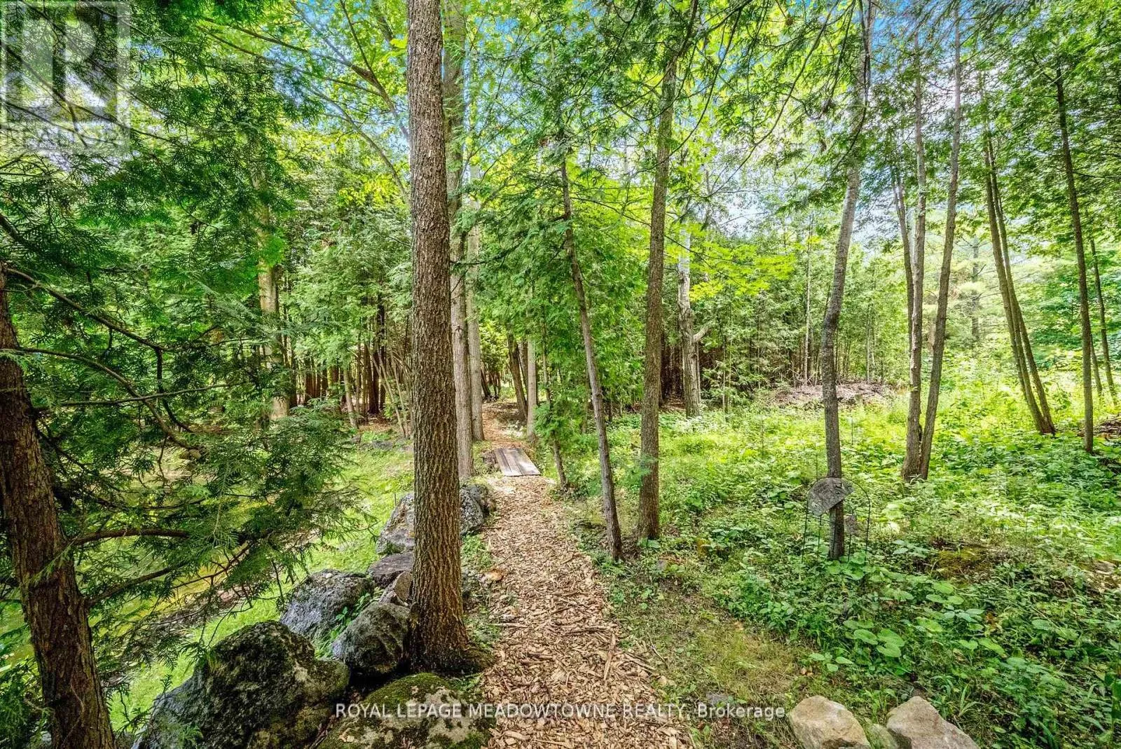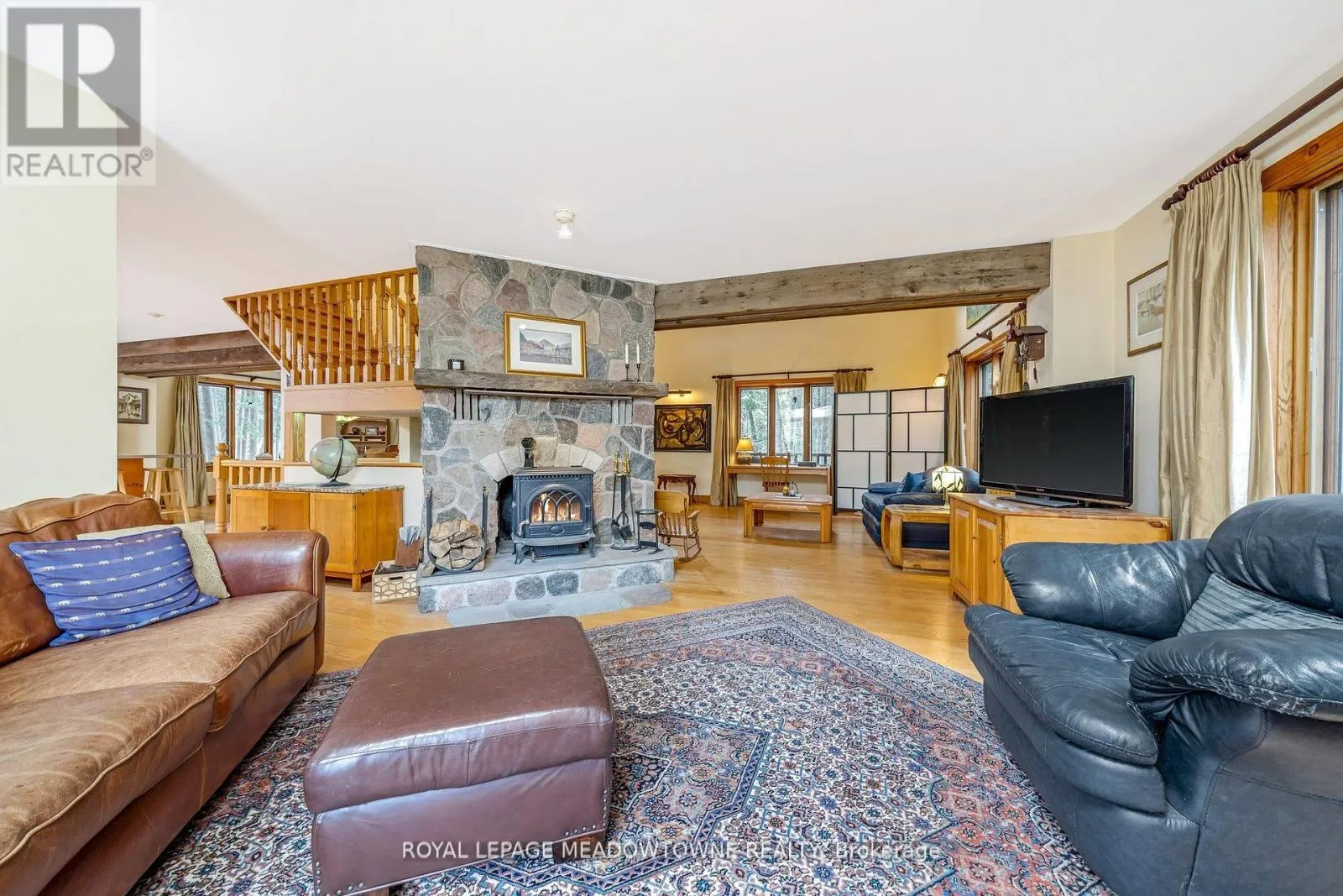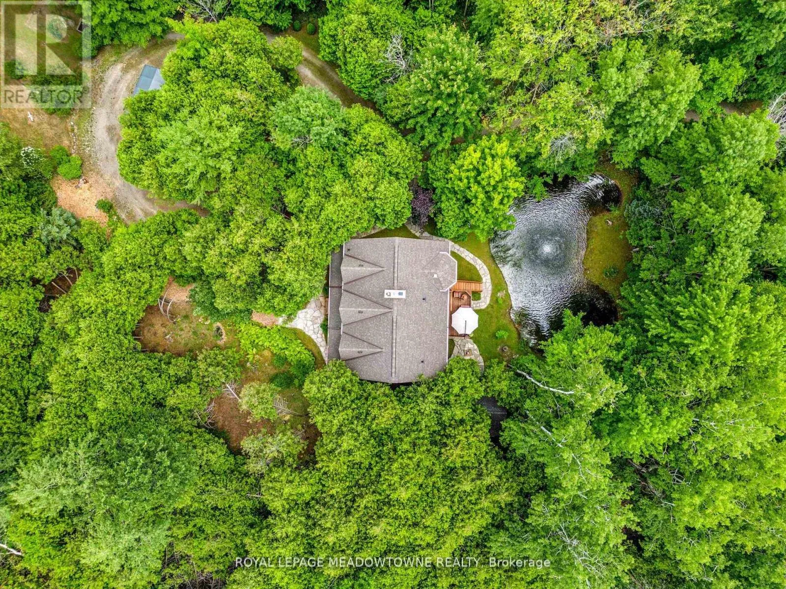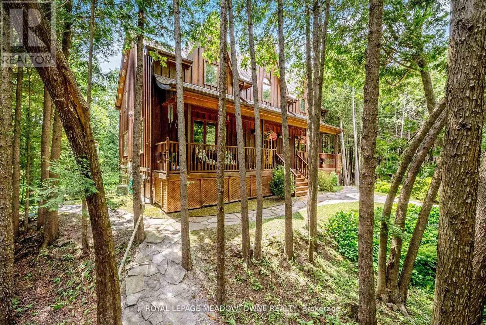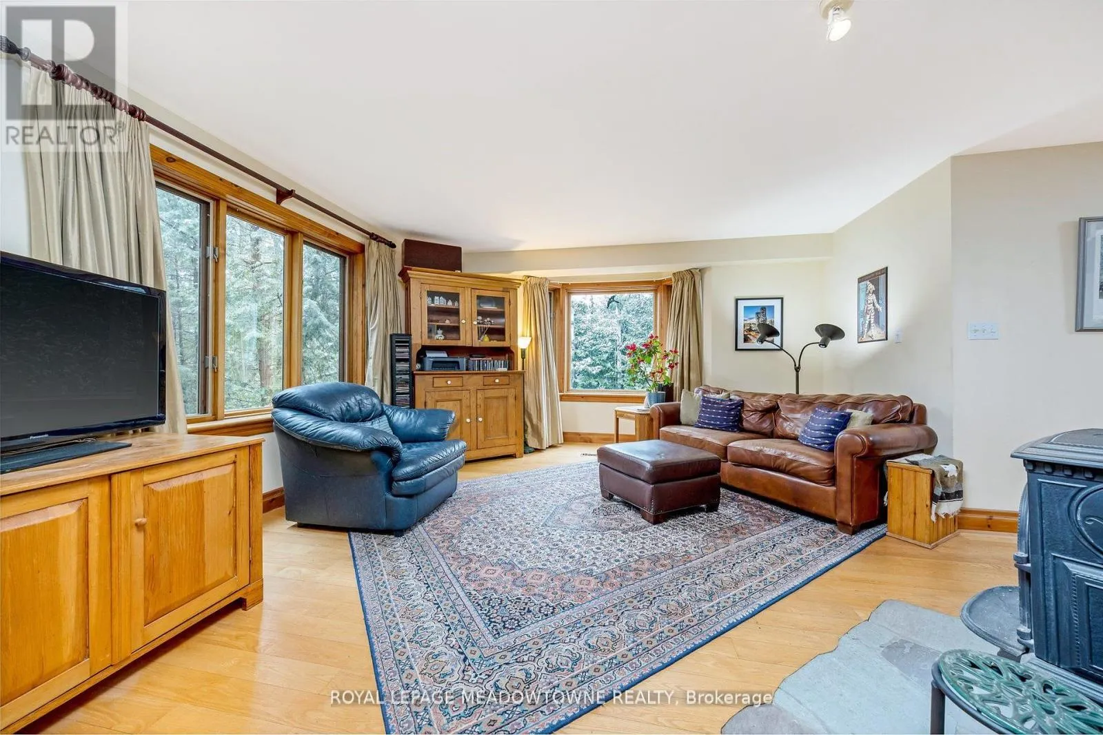 Eighth Line / 32 Side Road Nestled on a private 1.7-acre treed lot with a picturesque pond and located on a quiet country road, this unique custom-built home is full of charm and character. Designed with soaring vaulted ceilings and a bright, open-concept layout, every window frames stunning views of the surrounding nature. The main floor offers a seamless flow between the living and dining areas, a spacious kitchen with ample cabinetry, pot lights and a walkout to the deck which overlooks the large pond plus a cozy family room with a fireplace for relaxed evenings. Upstairs, the expansive primary suite features vaulted ceilings, a fireplace and a huge walk-in closet. A second bedroom and a 4-piece bath complete the upper level. A versatile loft space adds extra storage or potential creative space. The newly added in-law suite (2024) on the walkout level includes two bedrooms, a kitchen and a 3pc bathroom. Enjoy peaceful country living less than one hour to Toronto and just minutes from Georgetown, Acton and Erin. This is the perfect blend of tranquility and convenience! Owner and Tenant occupied. (id:27476)