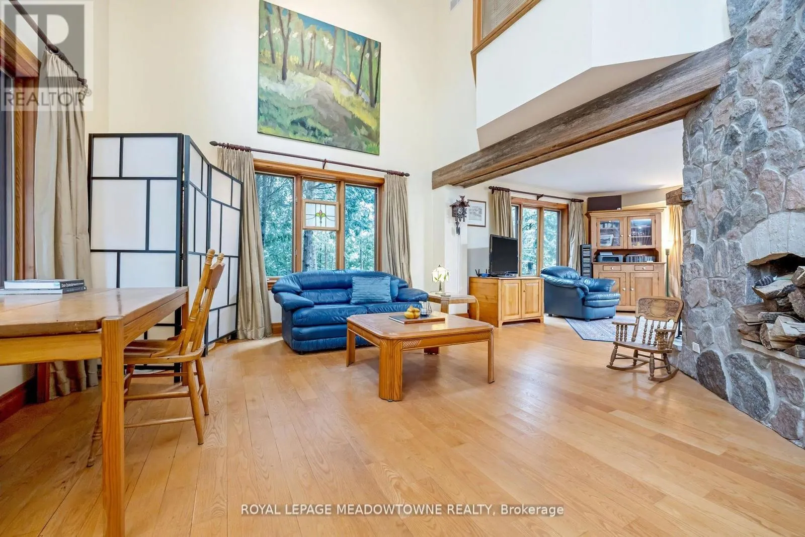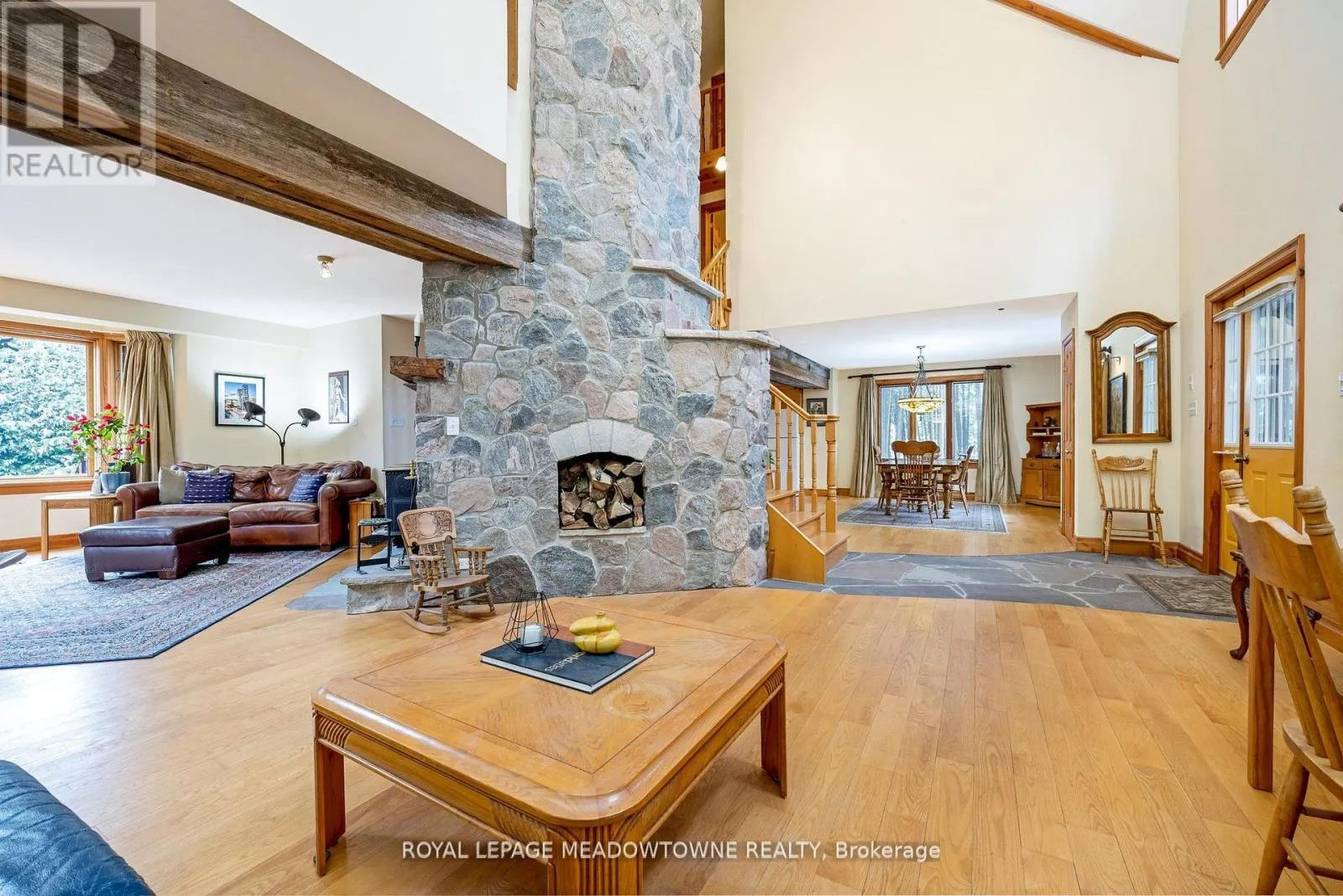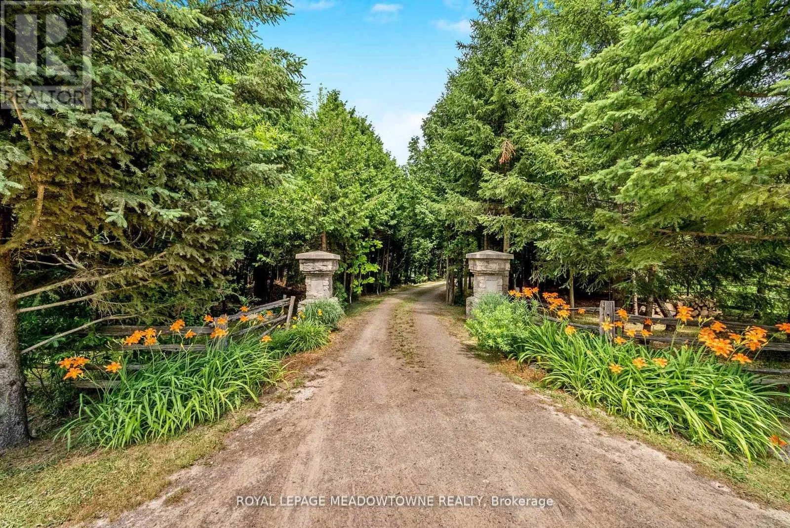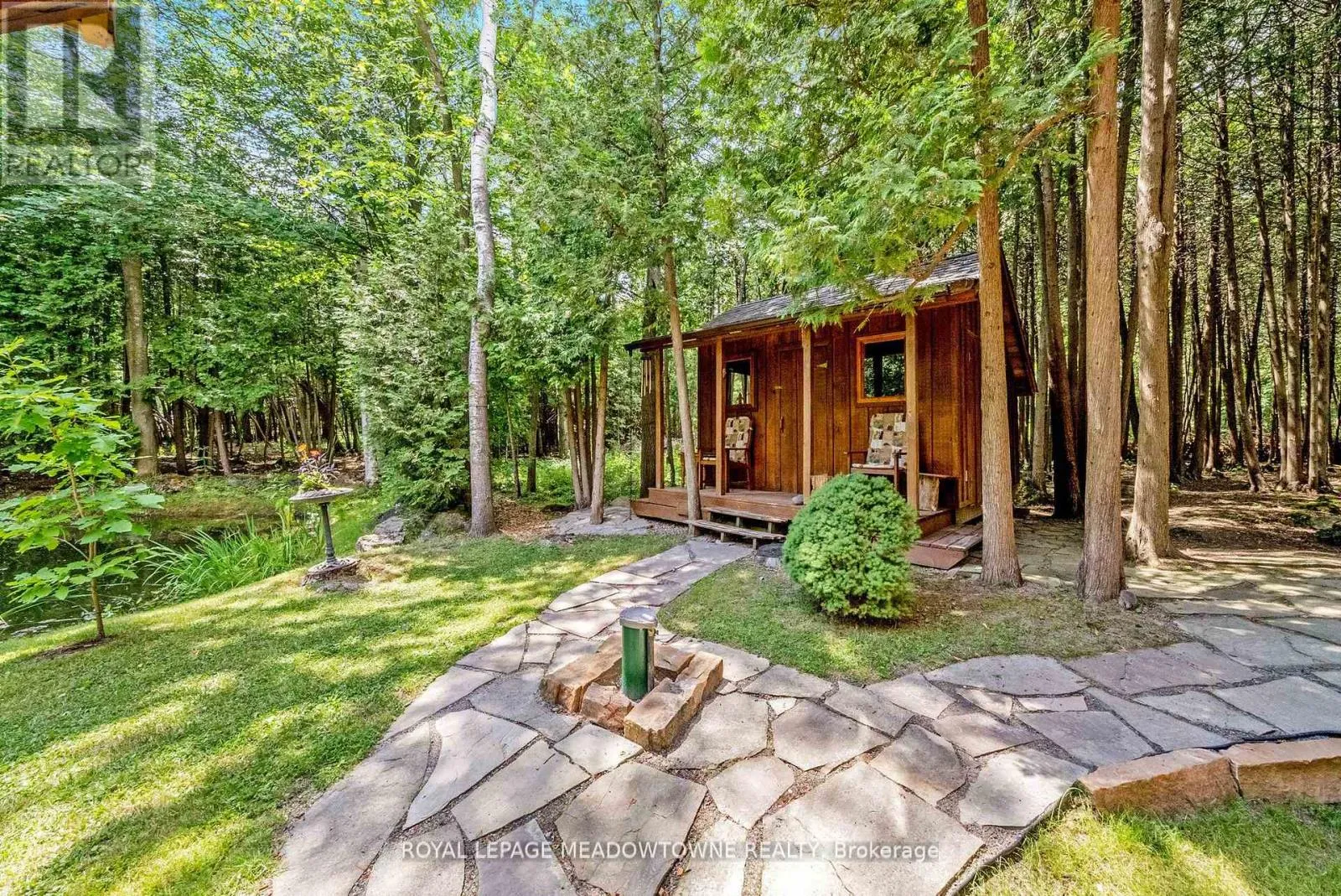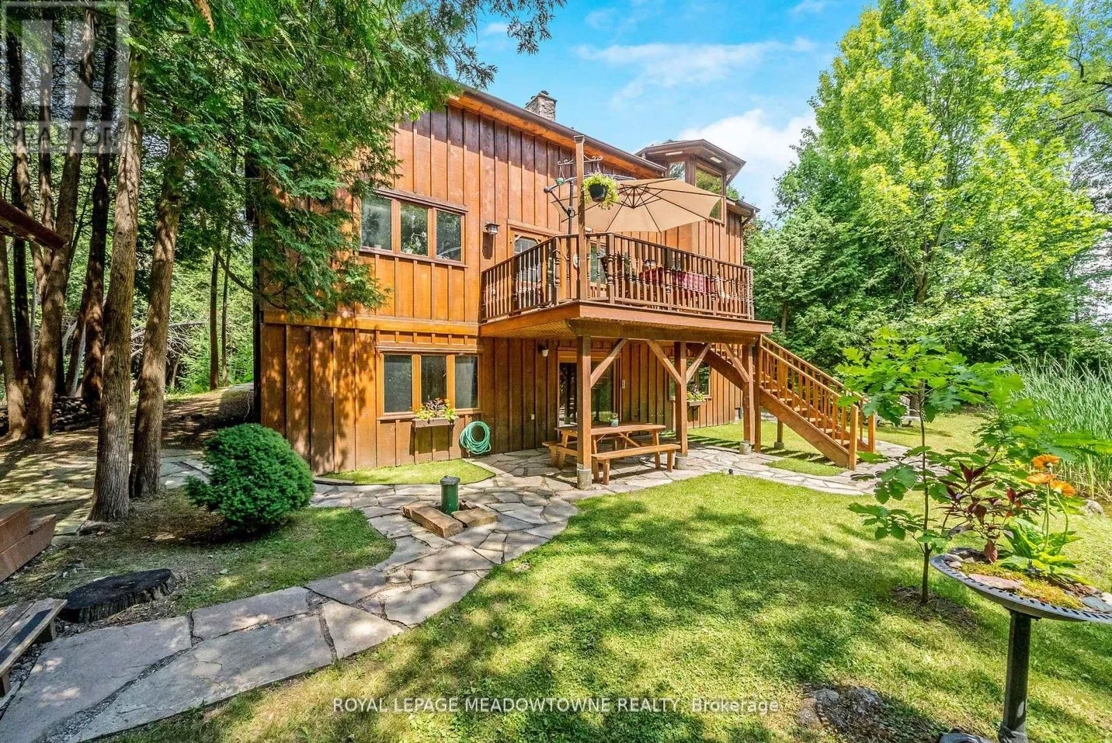 Eighth Line / 32 Side Road Nestled on a private 1.7-acre treed lot with a picturesque pond and located on a quiet country road, this unique custom-built home is full of charm and character. Designed with soaring vaulted ceilings and a bright, open-concept layout, every window frames stunning views of the surrounding nature. The main floor offers a seamless flow between the living and dining areas, a spacious kitchen with ample cabinetry, pot lights and a walkout to the deck which overlooks the large pond plus a cozy family room with a fireplace for relaxed evenings. Upstairs, the expansive primary suite features vaulted ceilings, a fireplace and a huge walk-in closet. A second bedroom and a 4-piece bath complete the upper level. A versatile loft space adds extra storage or potential creative space. The newly added in-law suite (2024) on the walkout level includes two bedrooms, a kitchen and a 3pc bathroom. Enjoy peaceful country living less than one hour to Toronto and just minutes from Georgetown, Acton and Erin. This is the perfect blend of tranquility and convenience! Owner and Tenant occupied. (id:27476)