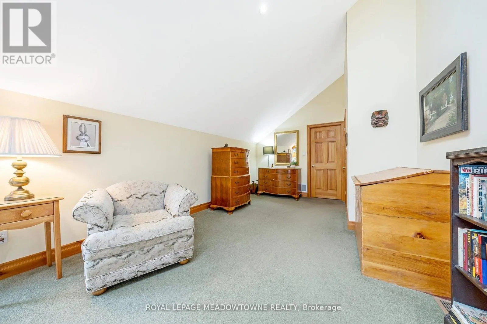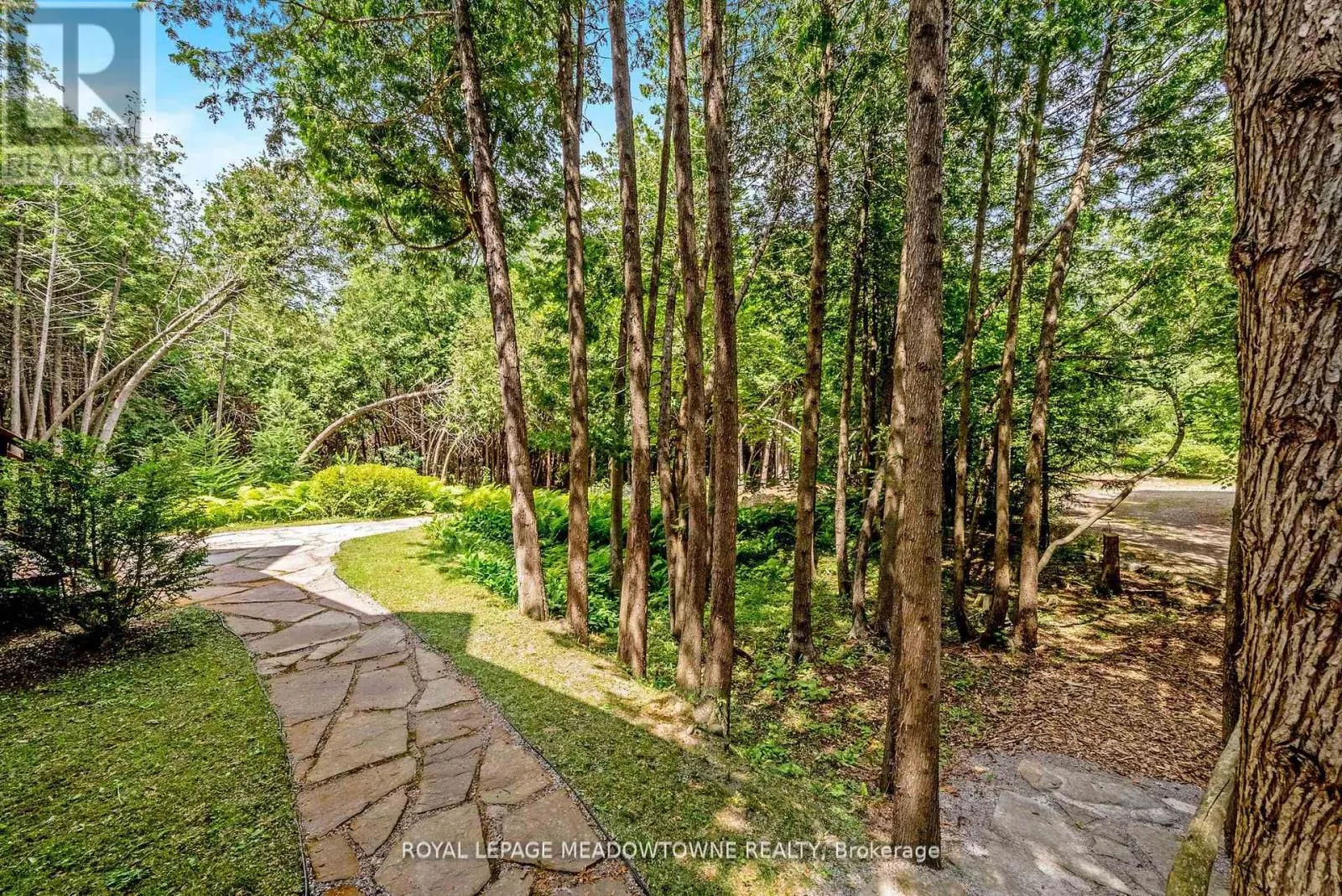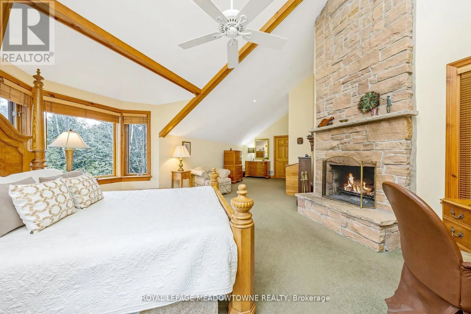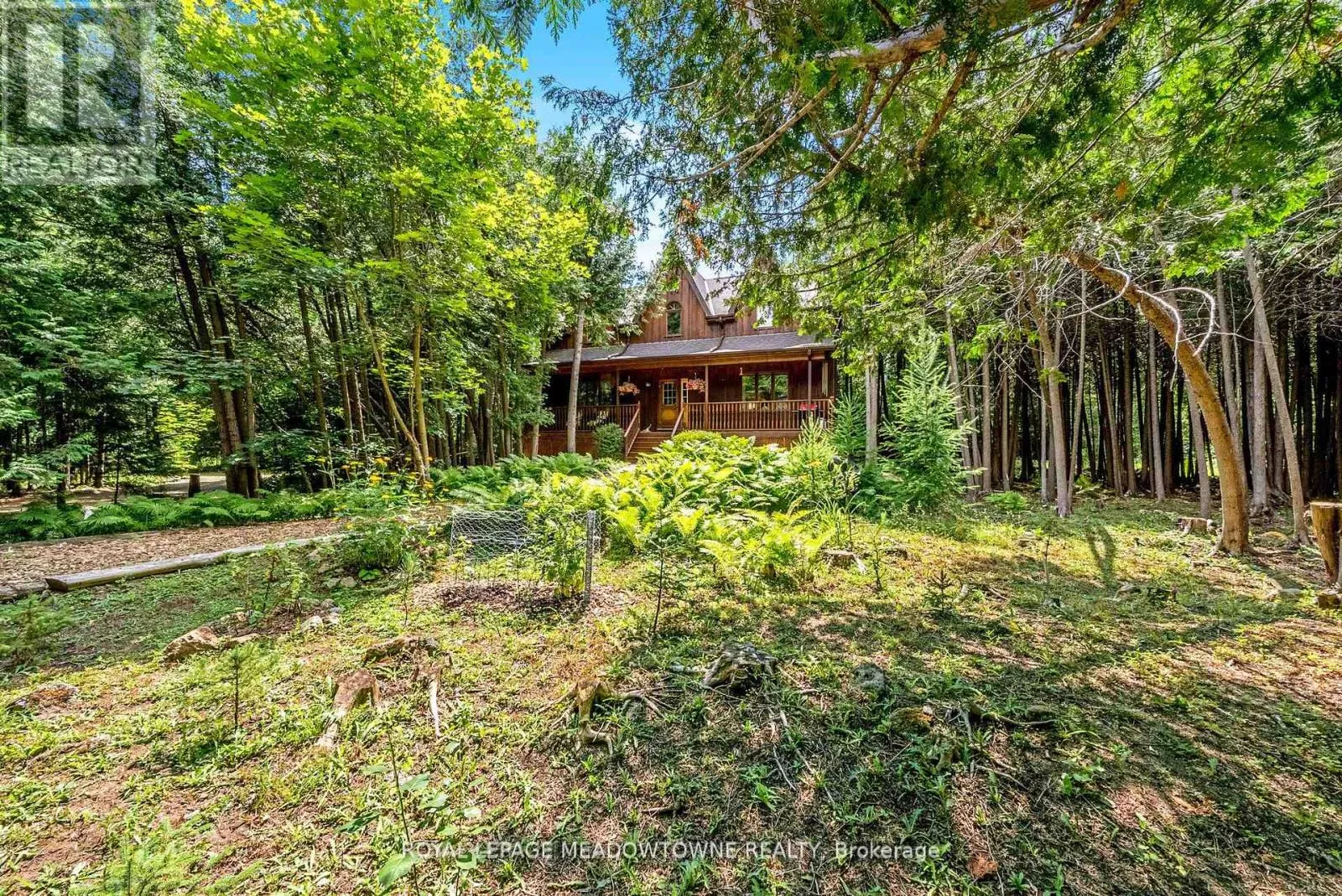 Eighth Line / 32 Side Road Nestled on a private 1.7-acre treed lot with a picturesque pond and located on a quiet country road, this unique custom-built home is full of charm and character. Designed with soaring vaulted ceilings and a bright, open-concept layout, every window frames stunning views of the surrounding nature. The main floor offers a seamless flow between the living and dining areas, a spacious kitchen with ample cabinetry, pot lights and a walkout to the deck which overlooks the large pond plus a cozy family room with a fireplace for relaxed evenings. Upstairs, the expansive primary suite features vaulted ceilings, a fireplace and a huge walk-in closet. A second bedroom and a 4-piece bath complete the upper level. A versatile loft space adds extra storage or potential creative space. The newly added in-law suite (2024) on the walkout level includes two bedrooms, a kitchen and a 3pc bathroom. Enjoy peaceful country living less than one hour to Toronto and just minutes from Georgetown, Acton and Erin. This is the perfect blend of tranquility and convenience! Owner and Tenant occupied. (id:27476)