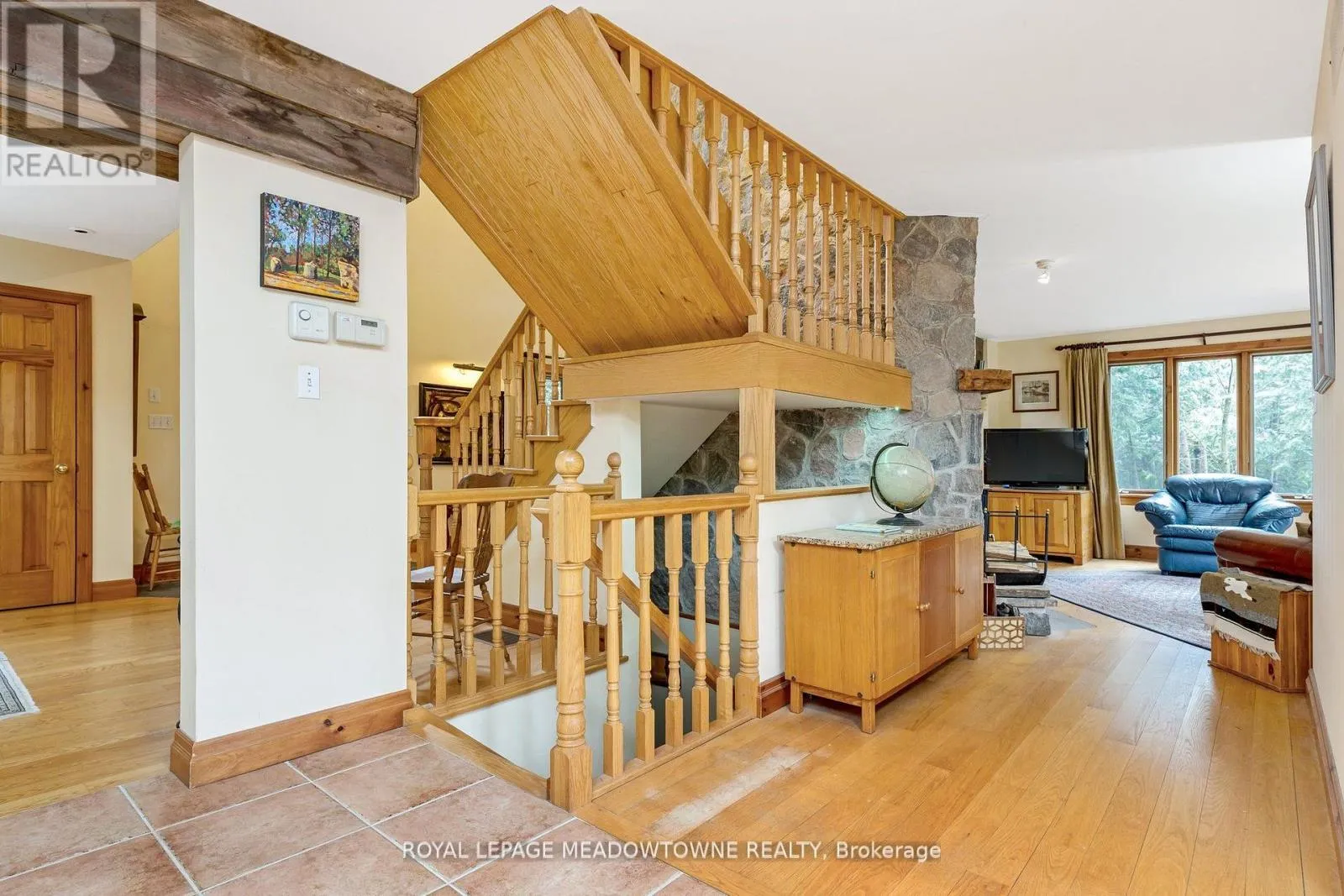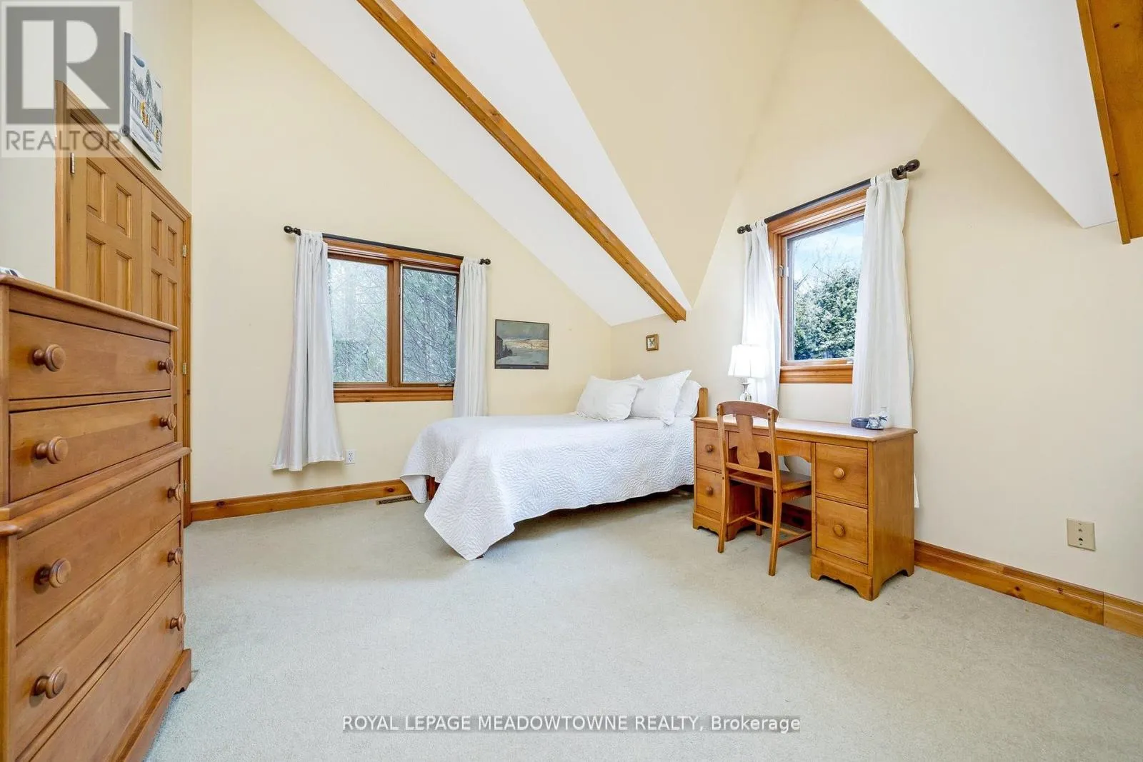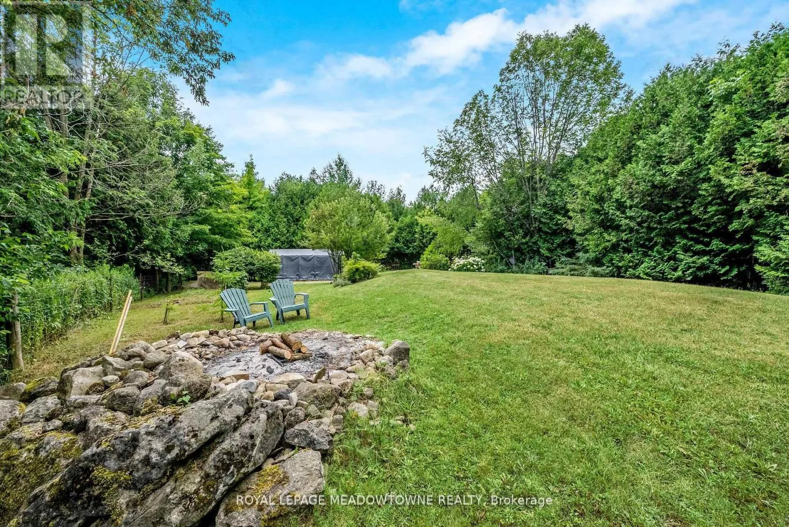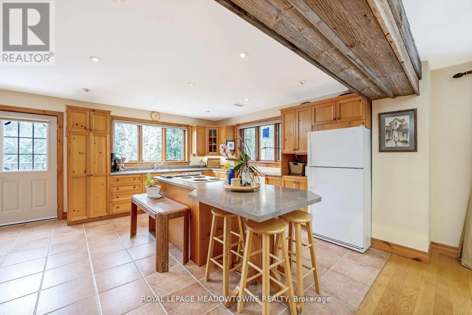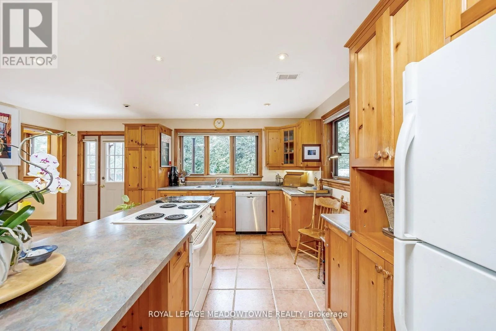 Eighth Line / 32 Side Road Nestled on a private 1.7-acre treed lot with a picturesque pond and located on a quiet country road, this unique custom-built home is full of charm and character. Designed with soaring vaulted ceilings and a bright, open-concept layout, every window frames stunning views of the surrounding nature. The main floor offers a seamless flow between the living and dining areas, a spacious kitchen with ample cabinetry, pot lights and a walkout to the deck which overlooks the large pond plus a cozy family room with a fireplace for relaxed evenings. Upstairs, the expansive primary suite features vaulted ceilings, a fireplace and a huge walk-in closet. A second bedroom and a 4-piece bath complete the upper level. A versatile loft space adds extra storage or potential creative space. The newly added in-law suite (2024) on the walkout level includes two bedrooms, a kitchen and a 3pc bathroom. Enjoy peaceful country living less than one hour to Toronto and just minutes from Georgetown, Acton and Erin. This is the perfect blend of tranquility and convenience! Owner and Tenant occupied. (id:27476)