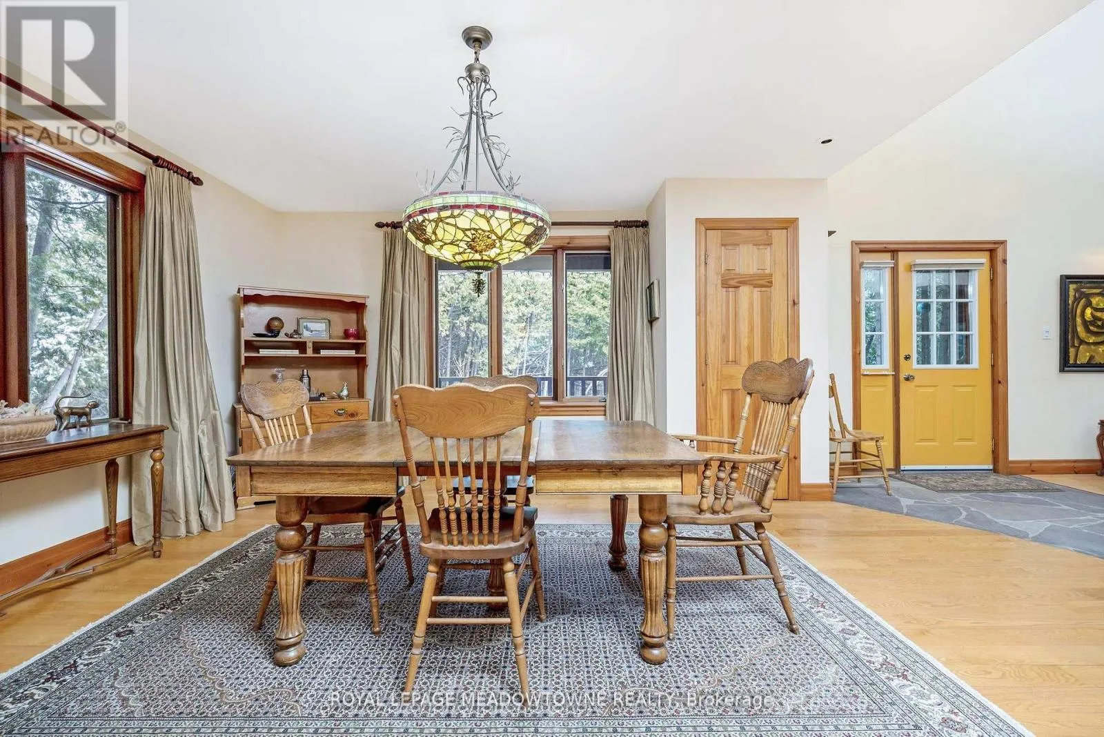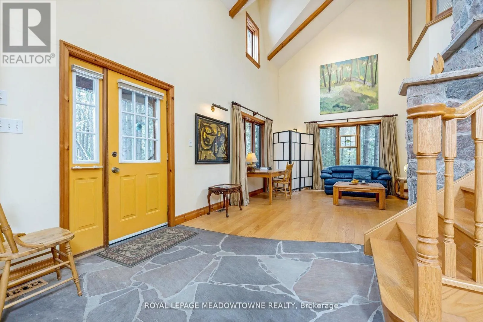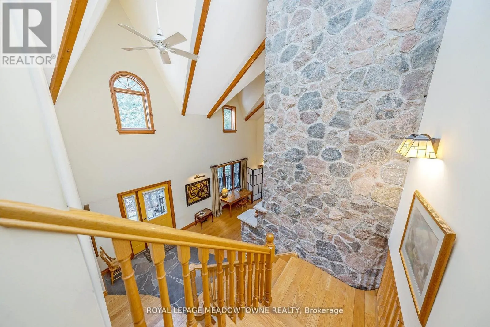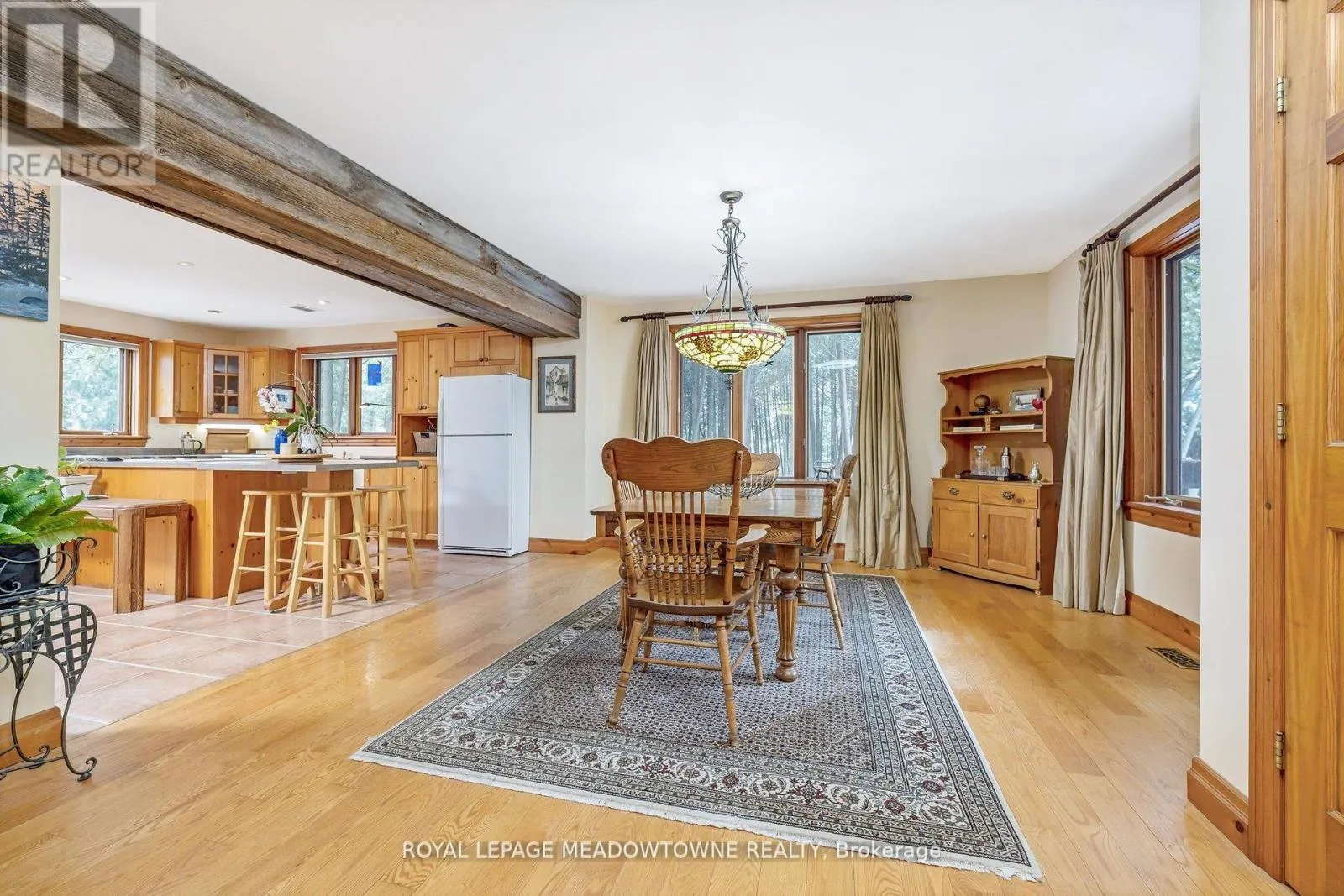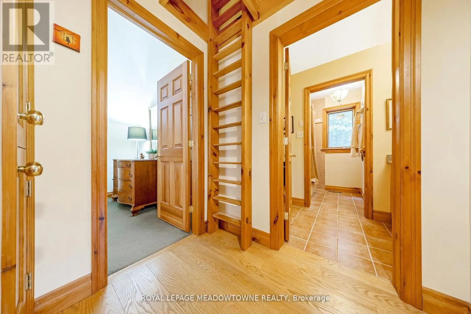 Eighth Line / 32 Side Road Nestled on a private 1.7-acre treed lot with a picturesque pond and located on a quiet country road, this unique custom-built home is full of charm and character. Designed with soaring vaulted ceilings and a bright, open-concept layout, every window frames stunning views of the surrounding nature. The main floor offers a seamless flow between the living and dining areas, a spacious kitchen with ample cabinetry, pot lights and a walkout to the deck which overlooks the large pond plus a cozy family room with a fireplace for relaxed evenings. Upstairs, the expansive primary suite features vaulted ceilings, a fireplace and a huge walk-in closet. A second bedroom and a 4-piece bath complete the upper level. A versatile loft space adds extra storage or potential creative space. The newly added in-law suite (2024) on the walkout level includes two bedrooms, a kitchen and a 3pc bathroom. Enjoy peaceful country living less than one hour to Toronto and just minutes from Georgetown, Acton and Erin. This is the perfect blend of tranquility and convenience! Owner and Tenant occupied. (id:27476)