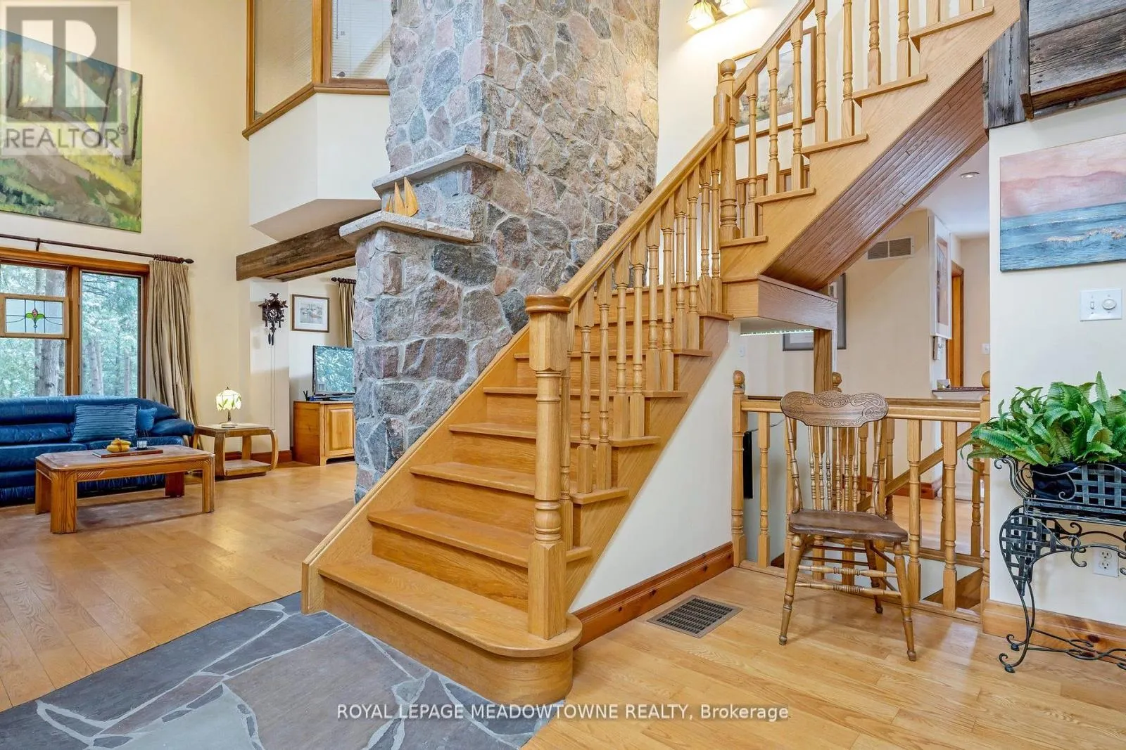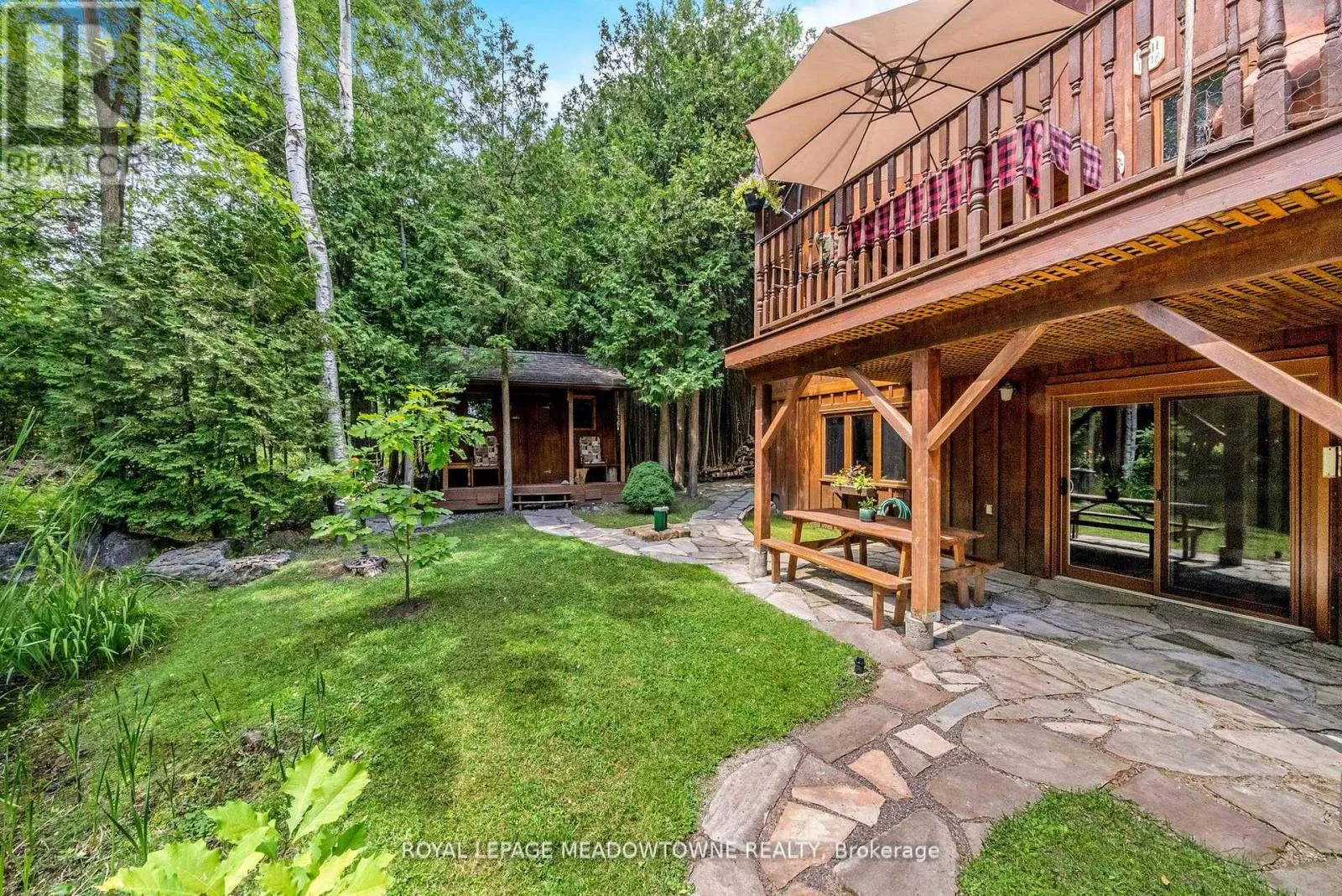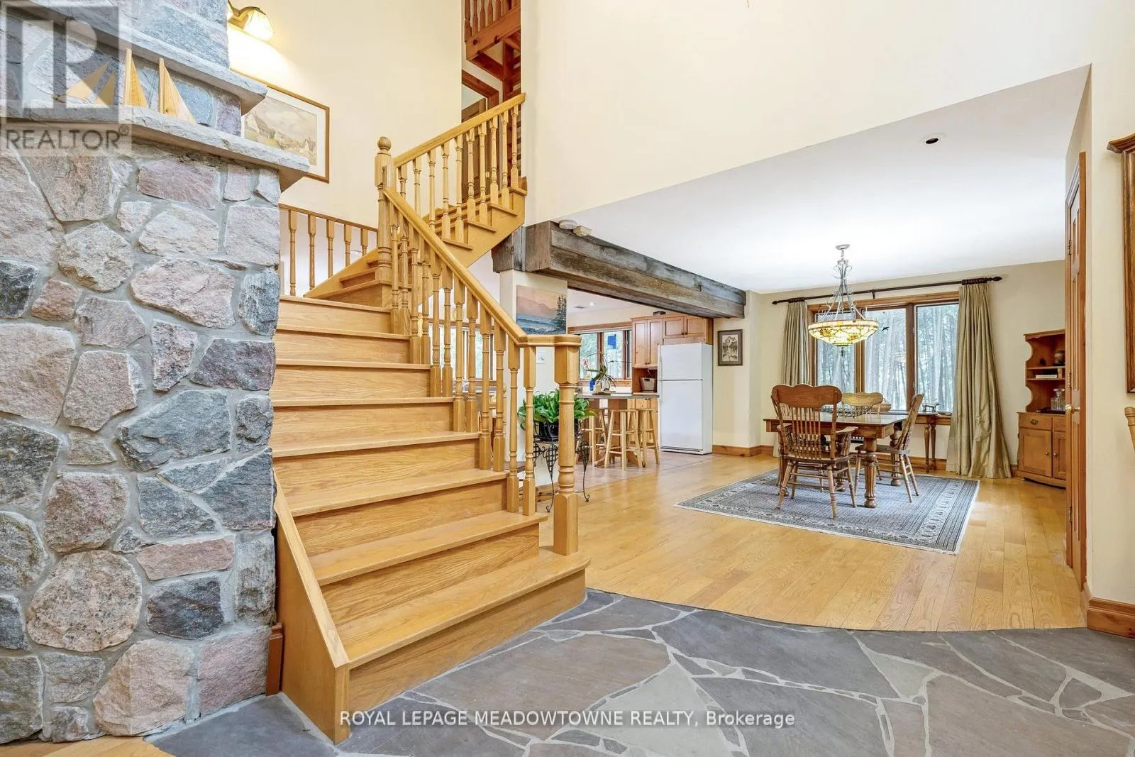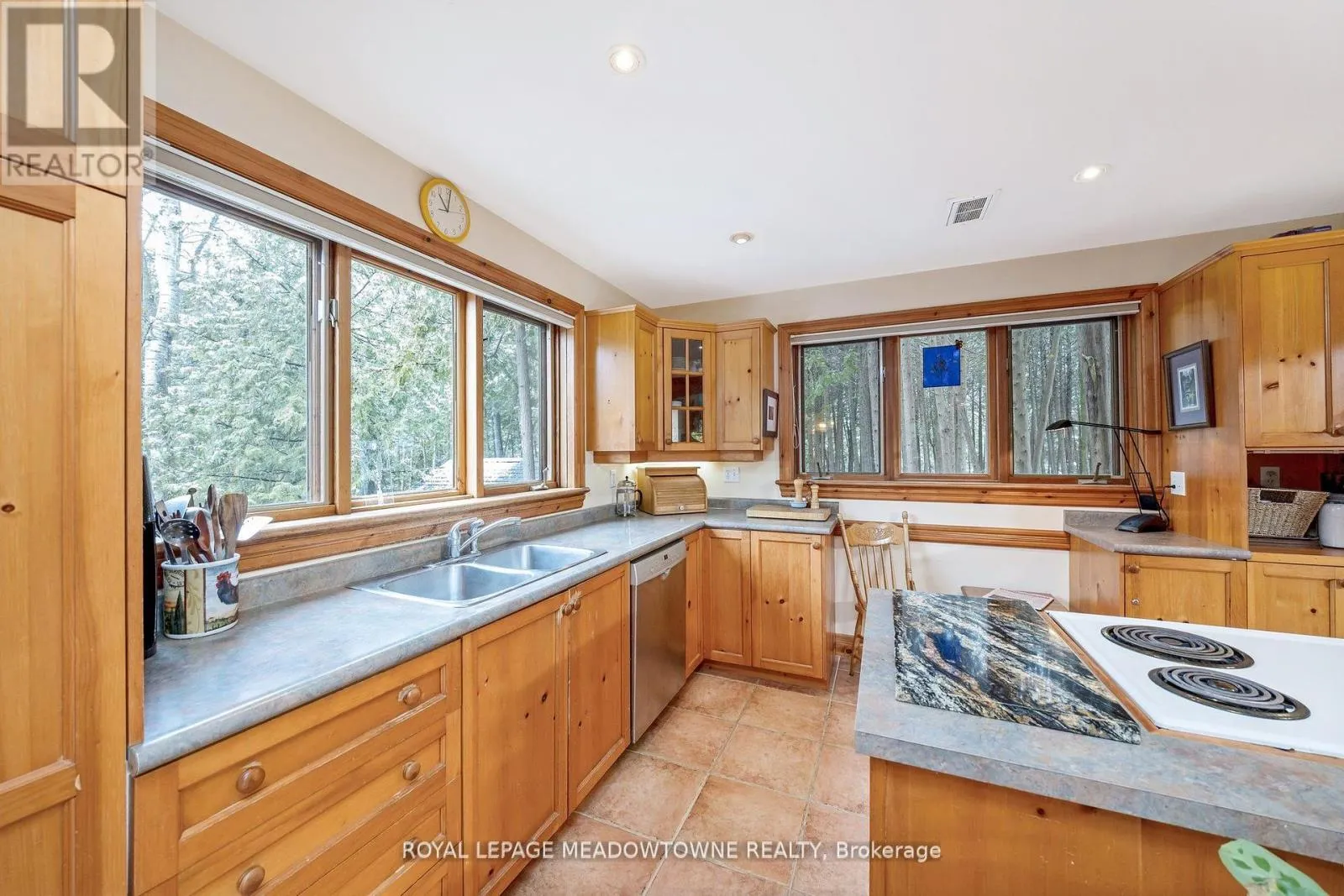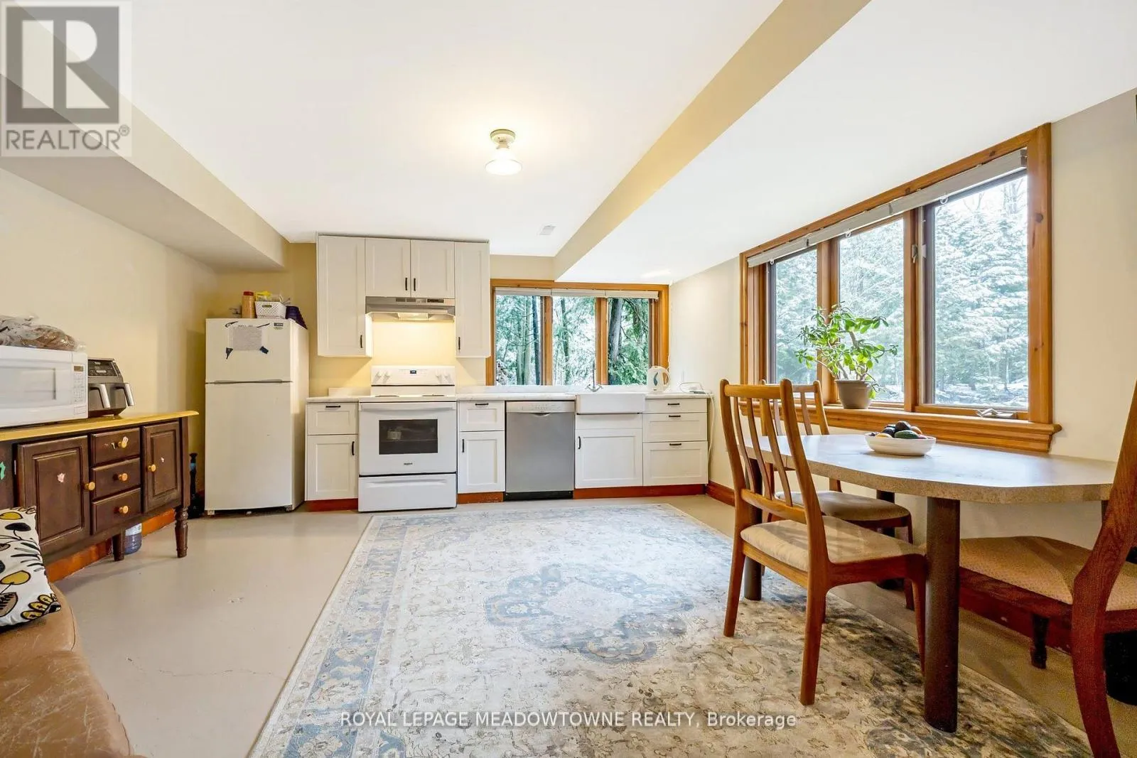 Eighth Line / 32 Side Road Nestled on a private 1.7-acre treed lot with a picturesque pond and located on a quiet country road, this unique custom-built home is full of charm and character. Designed with soaring vaulted ceilings and a bright, open-concept layout, every window frames stunning views of the surrounding nature. The main floor offers a seamless flow between the living and dining areas, a spacious kitchen with ample cabinetry, pot lights and a walkout to the deck which overlooks the large pond plus a cozy family room with a fireplace for relaxed evenings. Upstairs, the expansive primary suite features vaulted ceilings, a fireplace and a huge walk-in closet. A second bedroom and a 4-piece bath complete the upper level. A versatile loft space adds extra storage or potential creative space. The newly added in-law suite (2024) on the walkout level includes two bedrooms, a kitchen and a 3pc bathroom. Enjoy peaceful country living less than one hour to Toronto and just minutes from Georgetown, Acton and Erin. This is the perfect blend of tranquility and convenience! Owner and Tenant occupied. (id:27476)