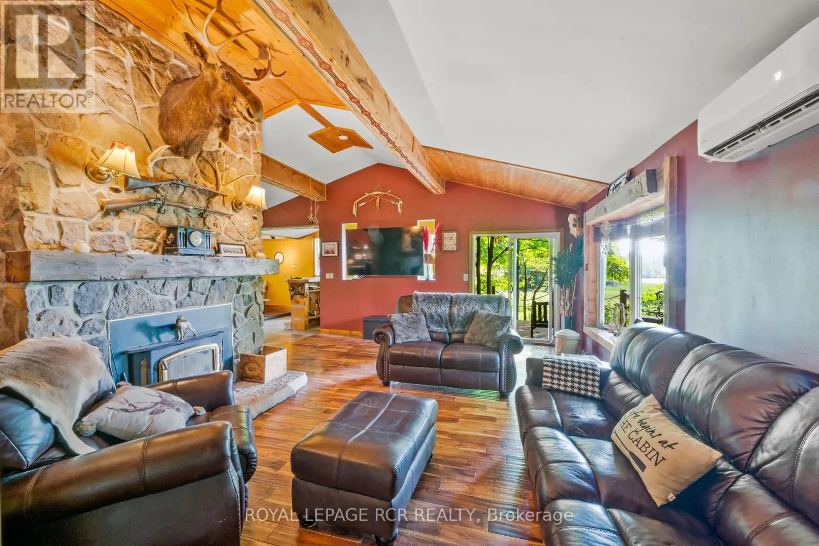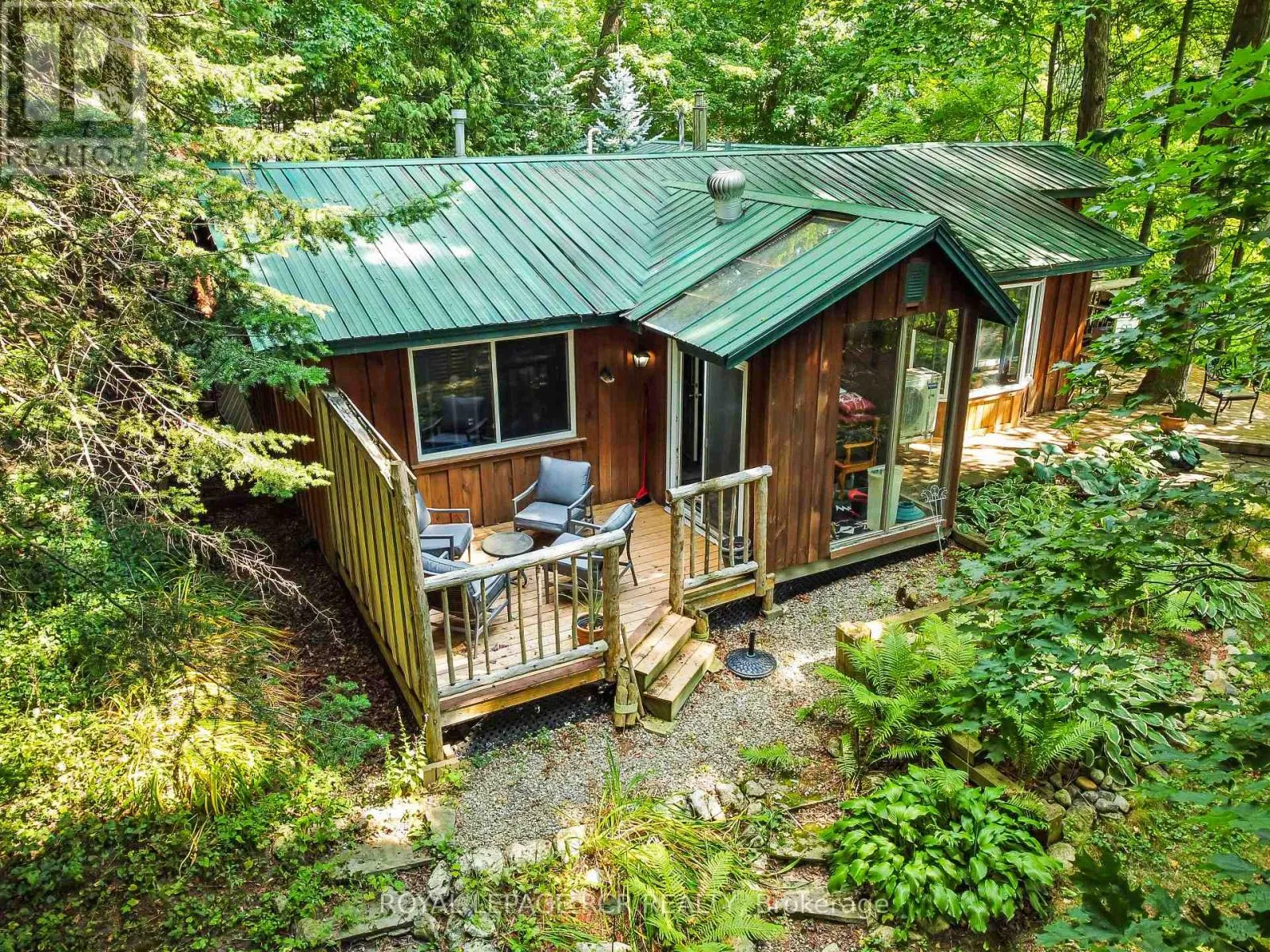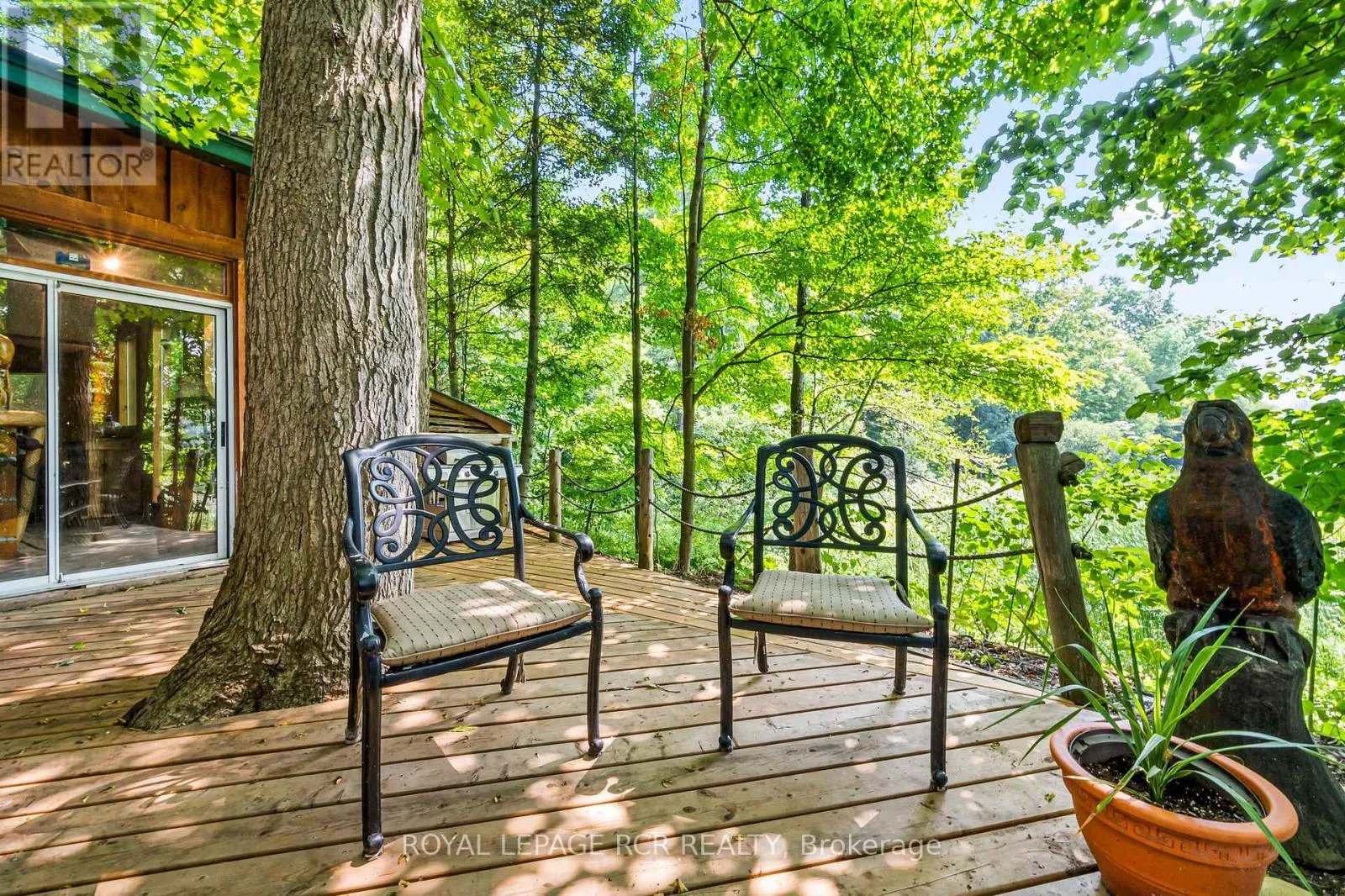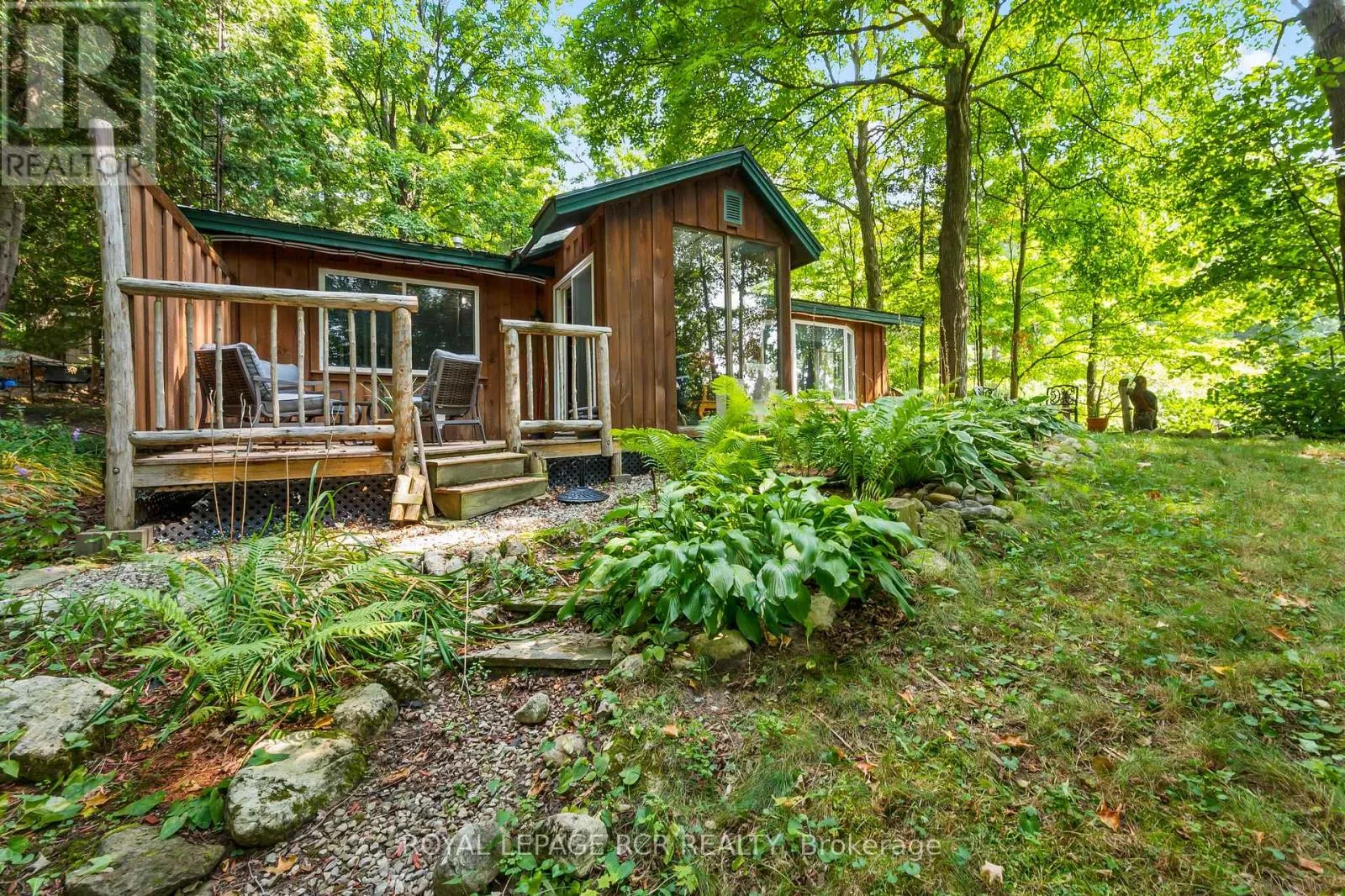 Cross Streets: 22/Hilltop/Frank. ** Directions: South on Hilltop Rd from 22, continue to the end of Frank Lane. Tucked away in the coveted Roman Lake community, this rustic yet refined bungalow offers the ultimate private escape. Whether you're searching for a peaceful weekend hideaway or a place to call home year-round, it's a setting that soothes the soul. Wake to serene lake vistas framed by mature trees, where deer, birds, and other wildlife create a living backdrop. Inside, you're welcomed with soaring vaulted ceilings, an updated kitchen, and an inviting blend of hardwood and slate underfoot. A built-in bar area takes full advantage of sweeping views, making every coffee or cocktail feel special. In the spa-inspired bathroom, heated floors add a touch of indulgence, while a corner jacuzzi-style tub and sleek glass walk-in shower promise relaxation at the end of the day or a refreshing start in the morning. Keep cozy with two fireplaces or rely on the efficiency of a forced air furnace when the seasons shift. Multiple windows let in generous natural light, accenting the warm wood finishes throughout. Step outside and the magic continues. Expansive decks, a private patio, and a charming detached log cabin with hydro provide endless opportunities for hosting, lounging, or simply enjoying the calm. One of the practical perks of the home is the hookup for a backup generator. Situated just minutes from the village of Hillsburgh, which offers small-town charm with welcoming shops, local eateries, and a friendly, walkable main street. For commuters, the location is just a short drive to Erin, Orangeville, and Guelph, with easy access to Georgetown, Milton, and Brampton, making it a comfortable commute to the GTA. (id:27476)