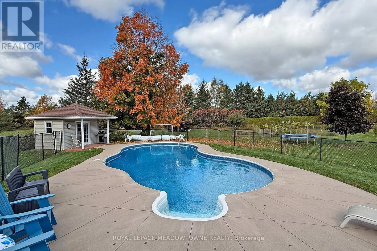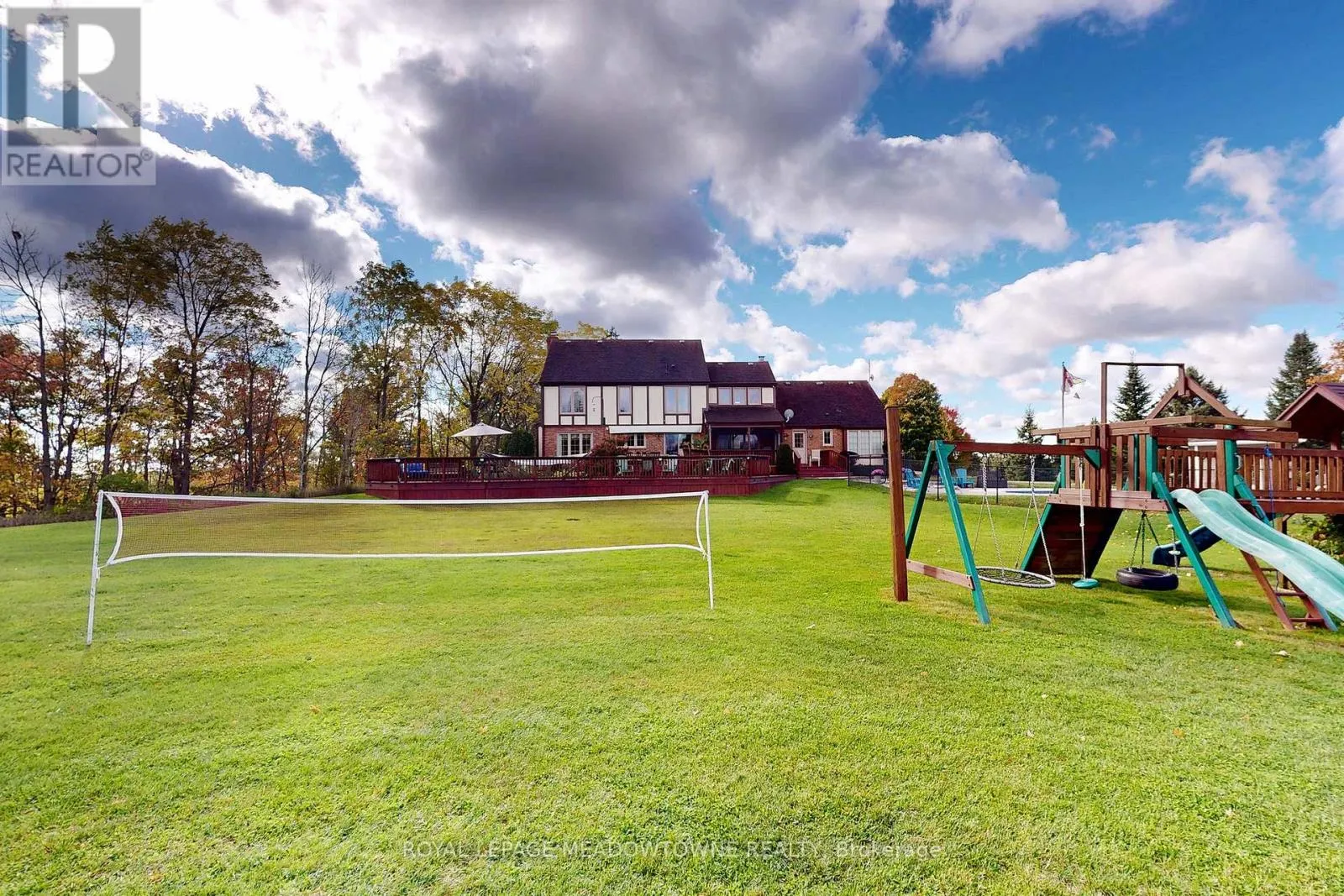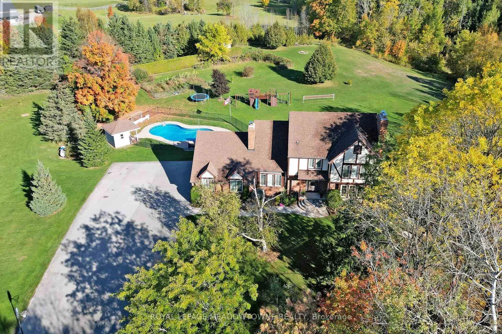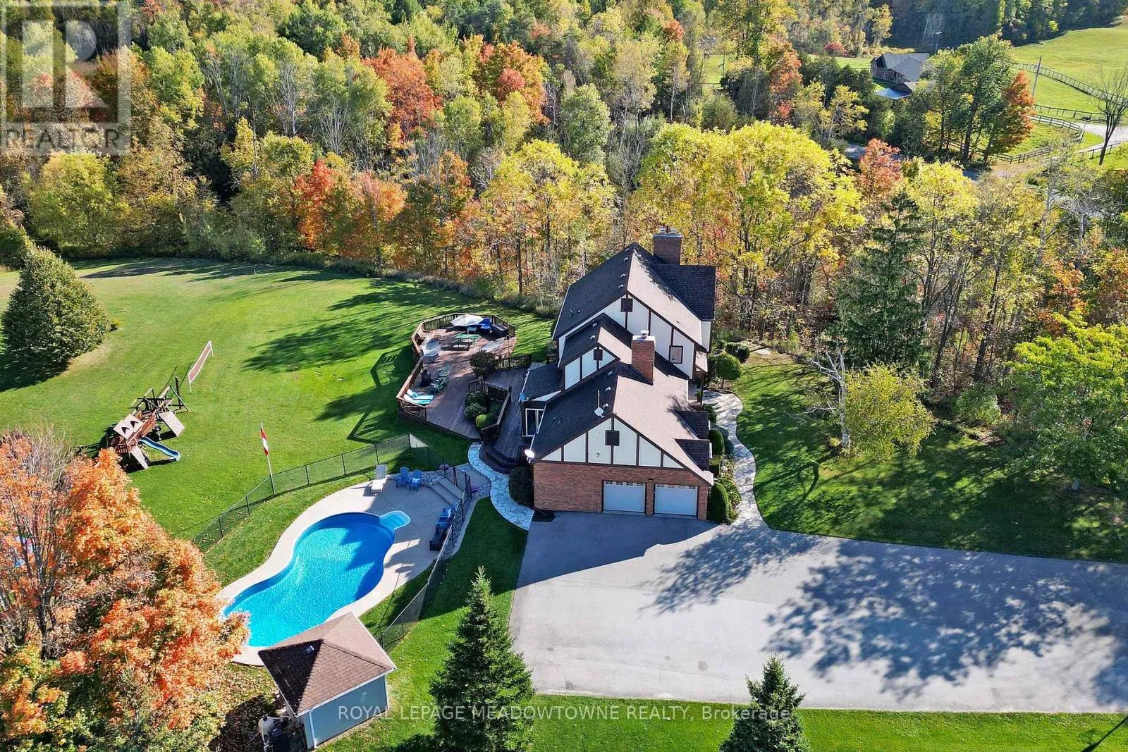 Cross Streets: 32nd Sdrd & First Line. ** Directions: South Well Rd 50 North 32nd Sdrd Corner of Erin/Halton Townline & First Line [Dublin]. Set on 10 scenic acres, this bright home offers more than 4,000 sq. ft. of living space with the freedom for your family to grow, play, and enjoy nature every day. The large eat-in kitchen includes a walkout to a spacious multi-tier deck perfect for family meals, entertaining or watching the sunrise. The family room features a cozy wood-burning fireplace and a walkout to a sunroom complete with a hot tub for year-round relaxation. An open-concept living and dining room provides plenty of space for gatherings and special occasions. Upstairs, the generous bedrooms give everyone their own space to sleep, study and play. The principal suite includes a private 4-piece ensuite with a luxurious glass walk-in shower. The finished basement adds even more living space ideal for a playroom, gym, games area, or movie nights plus plenty of storage space. Outdoors, enjoy endless activities in your own backyard. The covered patio offers a front-row seat to a stunning yard, complete with a creating a playground for all ages. Spend summers by the heated inground pool, explore the property trails all year round and there is room to build a hockey rink in the winter. Harvest apples, pears, grapes and raspberries with your own produce from the 25 x 50 fenced vegetable garden. Cost-efficient geothermal heating and cooling keeps you comfortable year round. High-speed fibre internet provides reliable service for streaming services, working or learning from home. The long paved driveway leads 10 plus car parking and an oversized 2-car garage with inside access. Recent updates include oversized thermal windows, R-50 attic insulation, new fascia and eavestrough, a pool heater and pump. CLTIP tax credits reduce property taxes.This peaceful rural retreat sits on the corner of two paved roads and has a Halton Hills address giving you the benefits of Municipal services and conveniently close to Georgetown and Acton. Minutes to the Acton GO train, schools, shops, churches, and golf courses. (id:27476)