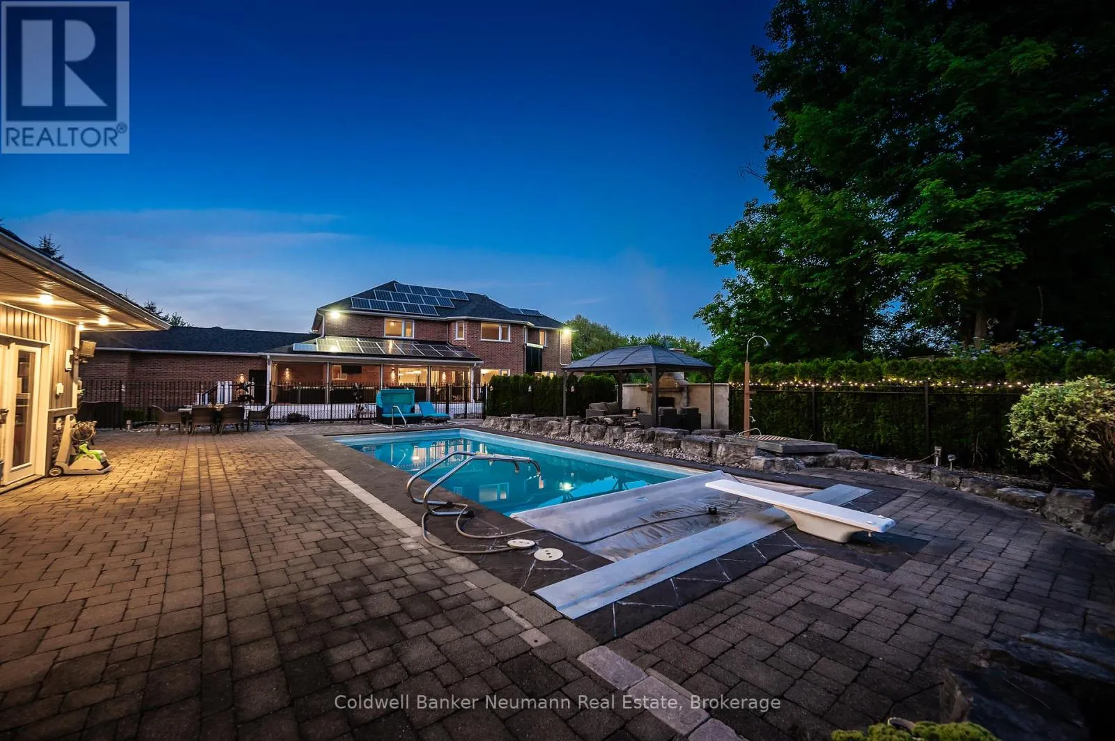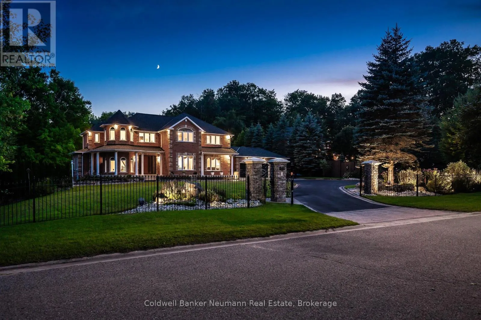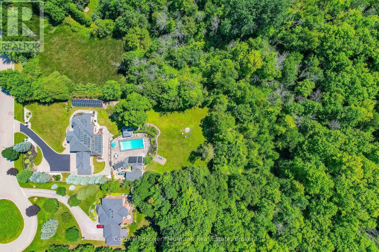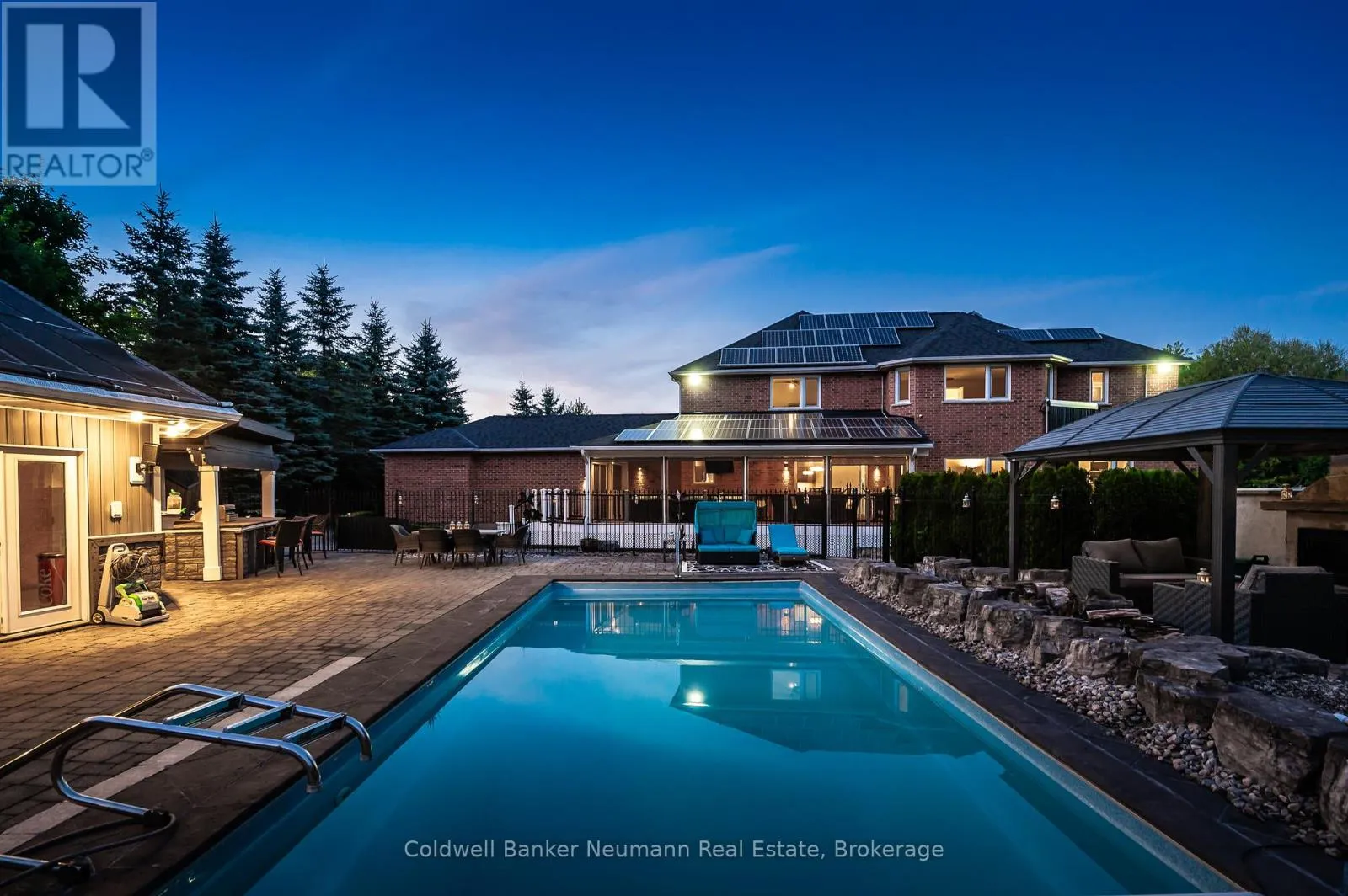 Cross Streets: Well Rd 124, 8th Line. ** Directions: Wellington Rd 124 to Delarmbro Dr. Experience the perfect blend of luxury, comfort, and sustainability in this custom-built solid brick net-zero home, set on a beautifully landscaped 3-acre lot. A long private driveway welcomes you to the triple car garage and inviting wraparound covered porch.Inside, you'll find a bright, open-concept layout with soaring ceilings, 4 spacious bedrooms, and 4 bathrooms, designed for both family living and entertaining. Elegant updates include new upper-level flooring, baseboards, and wainscoting, lending timeless sophistication throughout. Two gas fireplaces create warmth and charm, while the fully finished basement offers exceptional space for a home theater, games room, rec room, and gym.Step outside to your private backyard oasis featuring a fiberglass in-ground pool with electric cover, surrounded by resort-style amenities. Enjoy a massive screened-in Trex deck, a natural gas BBQ area, outdoor bar, movie projector setup, and cabana with compost toilet and changing room-perfect for hosting memorable summer gatherings. A wood-burning fireplace doubles as a pool heater, extending your outdoor season and creating an unbeatable evening ambiance.Nature lovers will appreciate the meticulously landscaped grounds fed by a natural spring, with three water hydrants and irrigated garden beds-ideal for maintaining lush greenery or even crafting a winter skating rink.Peace of mind comes with extensive recent upgrades: triple-glazed windows (2022), new doors (2023), commercial-grade hot water heater (2023), and a high-efficiency furnace and heat pump (2024), delivering remarkable comfort with minimal operating costs.Nestled on a quiet, private court yet close to all amenities, this home truly offers the best of both worlds-a resort-like retreat with every modern convenience. A property that must be seen to be fully appreciated! (id:27476)