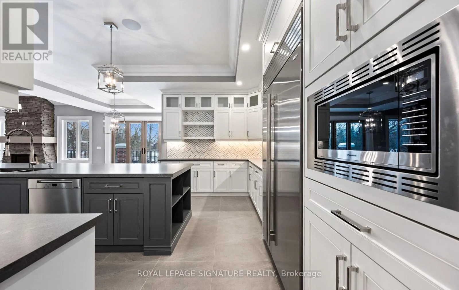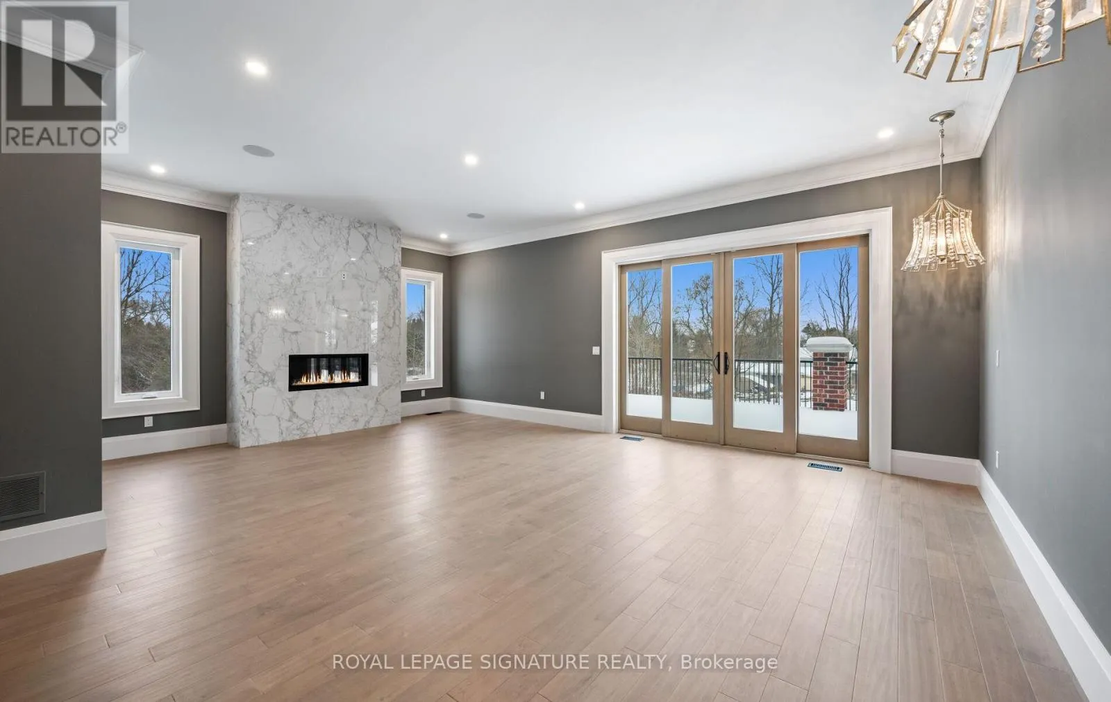 TRAFALGAR & 32 SIDEROAD Welcome to a truly exceptional estate offering over 8,234 sq ft of finished living space on an approximately 1-acre lot, where grand scale meets thoughtful design and premium craftsmanship throughout.The home features 10' ceilings on the main floor and 9' ceilings on both the second level and walk-out basement, creating an airy, light-filled atmosphere. With 7 bedrooms and 9 bathrooms, this residence is perfectly suited for large families, multigenerational living, or those who love to entertain.At the heart of the home is a spectacular great room open to above, anchored by a dramatic floor-to-ceiling stone fireplace. The chef's kitchen is a showstopper, equipped with high-end built-in stainless steel appliances, an oversized island, custom backsplash, and direct walkout to the expansive 55' x 16' deck-ideal for indoor-outdoor living. A butler's pantry with prep kitchen adds both elegance and functionality.The main-floor primary retreat is a private sanctuary featuring a gas fireplace with stone slab surround, walkout to the deck, a spa-like 5-piece ensuite, and a massive walk-in closet complete with a large center island. The main level is rounded out by hardwood flooring, plaster mouldings, and a highly functional laundry room with two sets of washers and dryers.Upstairs, you'll find four generously sized bedrooms, each with its own 3-piece ensuite and walk-in closet, offering comfort and privacy for every family member.The fully finished walk-out basement continues the luxury with two additional bedrooms, each with private ensuites, a large recreation room, fitness room, wet bar, and high-end vinyl flooring. A separate 3-piece bathroom with backyard access makes this level ideal for entertaining or poolside plans. Additional highlights incl. Geothermal heating, Mvac central vac with hide a hose, paved driveway w concrete curbs. This one-of-a-kind property delivers luxury, efficiency, and scale in a refind package. An extraordinary home. (id:27476)