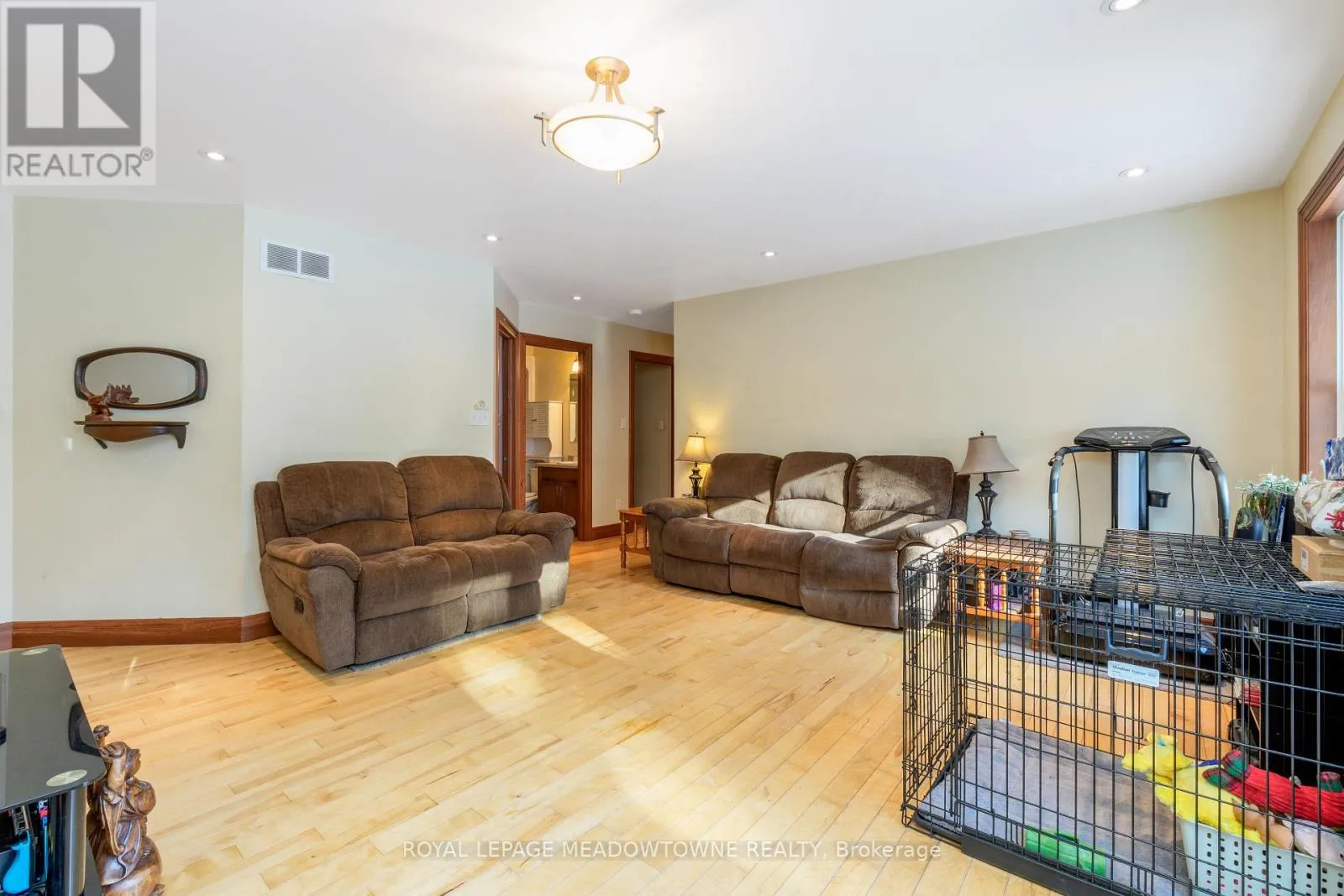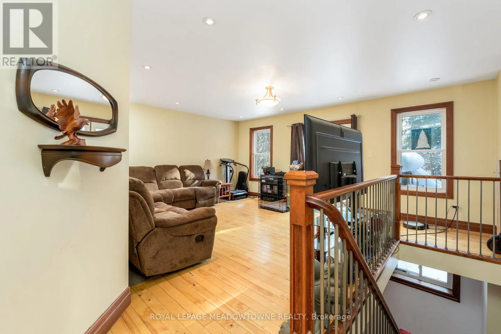 Cross Streets: Trafalgar Road & Sideroad 9. ** Directions: Trafalgar Rd or Sixth Line to Sideroad 9. Nestled on a private and serene 1+ acre lot surrounded by mature trees, this beautifully maintained 3+1 bedroom, 2 bathroom detached raised bungalow offers the perfect blend of modern comfort and peaceful country living. Built in 2013 and topped with a durable metal roof, this home is set in a quiet rural setting while remaining conveniently close to town amenities. The welcoming foyer opens into a bright, open-concept living room featuring hardwood flooring, pot lights, and a walk-out to the deck. The dining area is seamlessly overlooked by the kitchen, creating an easy flow for gatherings. Hardwood flooring continues throughout, and the kitchen offers ample cabinetry and counter space to meet all your culinary needs. The main level hosts a spacious primary suite complete with a double closet and a private 3-piece ensuite. Two additional bedrooms on this level are generously sized and feature large closets. The finished lower level expands your living space with a massive open-concept recreation room, laminate flooring, two above-grade windows, and a walk-out to the backyard. A convenient fourth bedroom with an above-grade window, ample storage, a mechanical room, and a laundry room with a rough-in for an additional bathroom complete this level. Step outside to a lush, private backyard-perfect for relaxing, entertaining, or enjoying nature. Ideally located just a short drive to all major amenities, including GO stations in both Acton and Georgetown. Additional highlights include a newly added propane forced-air furnace (2024). A fantastic opportunity to enjoy tranquil country living without sacrificing convenience. (id:27476)