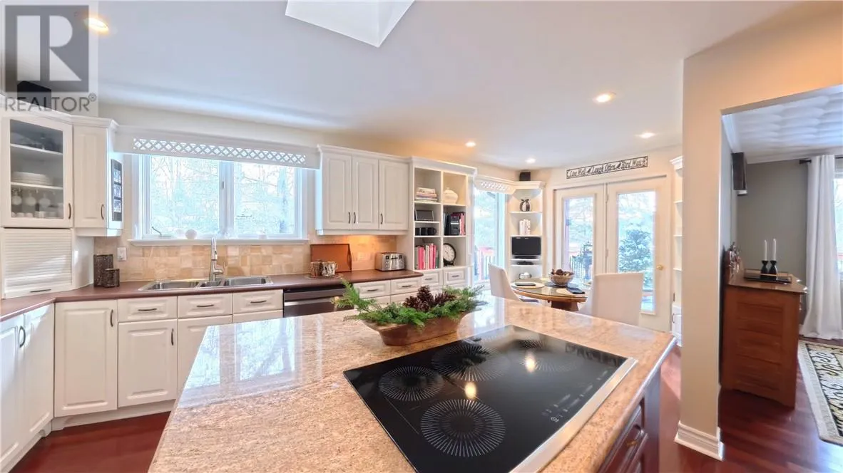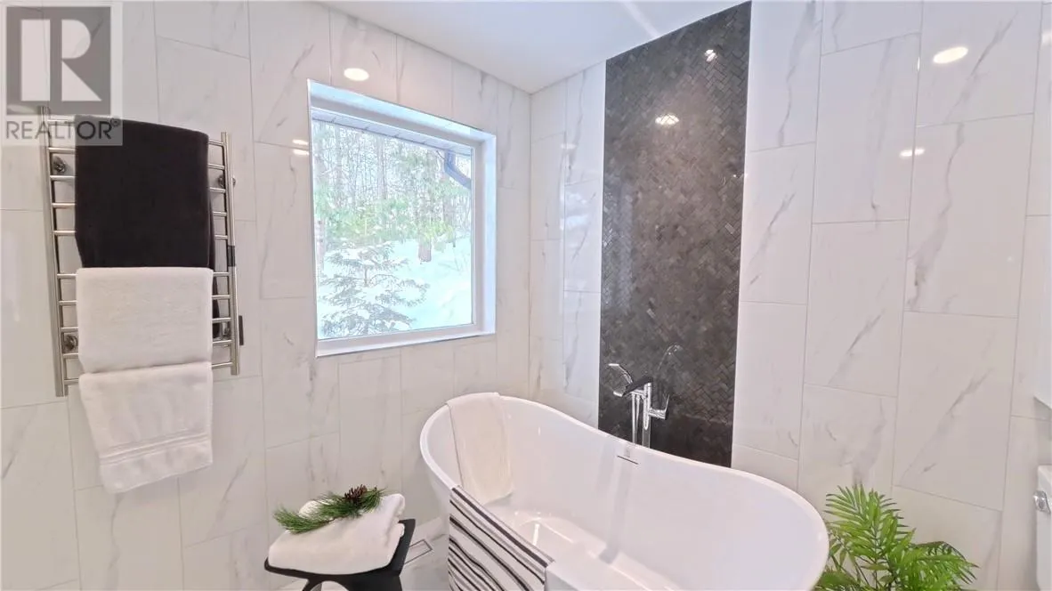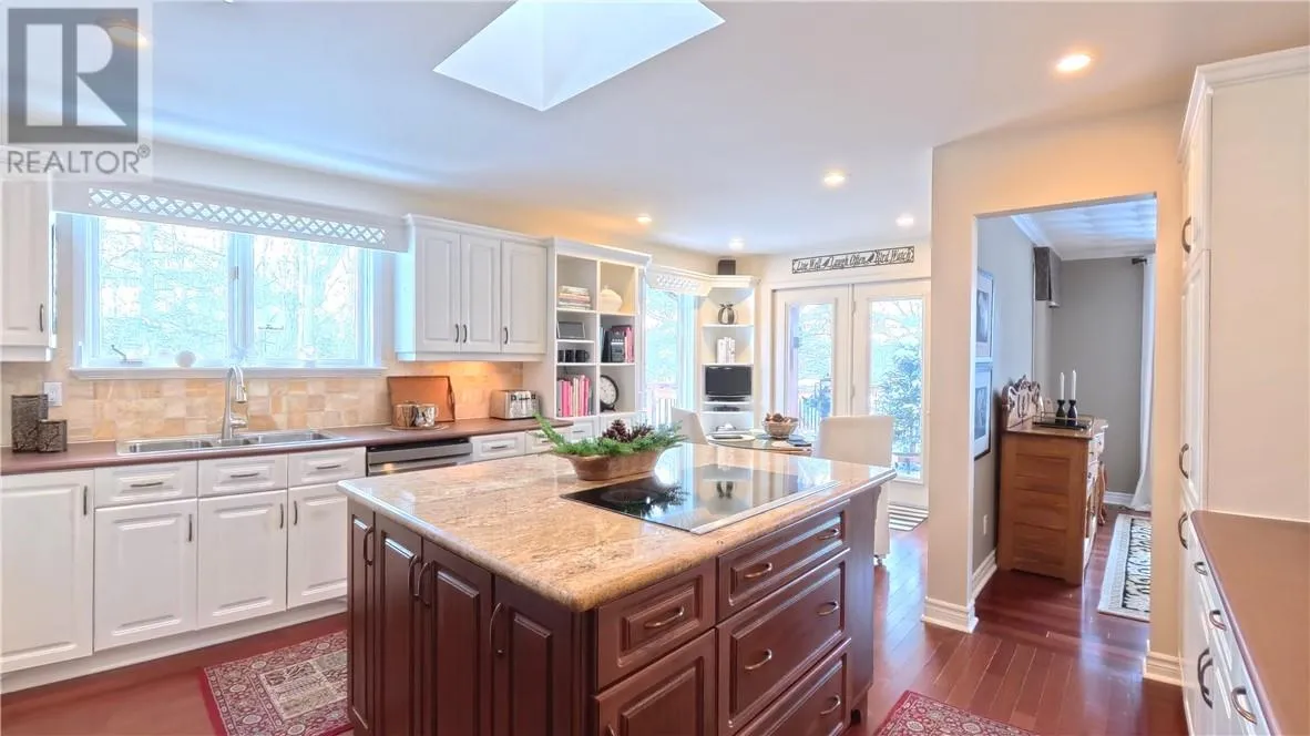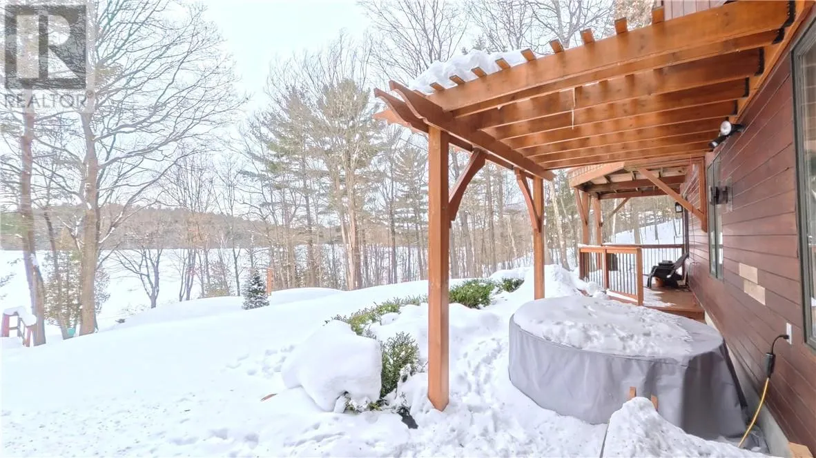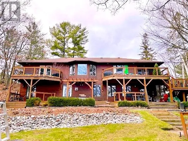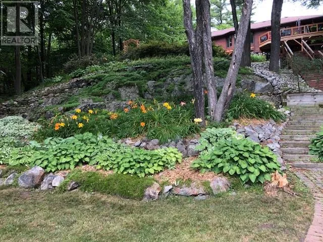 Welcome to 357 Clear Lake Drive, Espanola. Set on the shores of Clear Lake, this custom-built waterfront bungalow offers 3 bedrooms and 2.5 bathrooms in a private, extremely well landscaped setting with mature tree cover and terraced garden areas. The appeal starts with a curved driveway bordered by a stone retaining walls leading to an interlocking stone courtyard and stone steps to large front entry. The main level includes a bright eat-in kitchen with huge quartz island and quality appliances (refrigerator, stove, wall oven, induction cooktop, microwave, built-in dishwasher), a dining area and a large living room with lake views and built in propane fireplace. The primary bedroom overlooks the water and features built-in closets, private deck access and a renovated en suite with soaker tub, walk-in shower and in-floor heating. Main floor laundry with full-size LG stainless steel washer and dryer and a powder room add to overall convenience. The fully finished lower level offers a family room with lake-facing windows and propane fired stone fireplace, two additional bedrooms, 4-piece bath, office/den, wet bar with bar fridge, workshop, storage, and walk-out access to a full-width deck. Outdoor features include multiple decks, interlocking pathways, terraced lawns, and stairs leading to the water. A floating dock provides direct lake access for swimming and boating. Constructed with 2x6 framing and 2x12 floor joists, the home also includes attached double garage. Meticulously maintained waterfront home offering functional space, south facing lake front, and year-round enjoyment. A truly special offering at a great price! (id:27476)