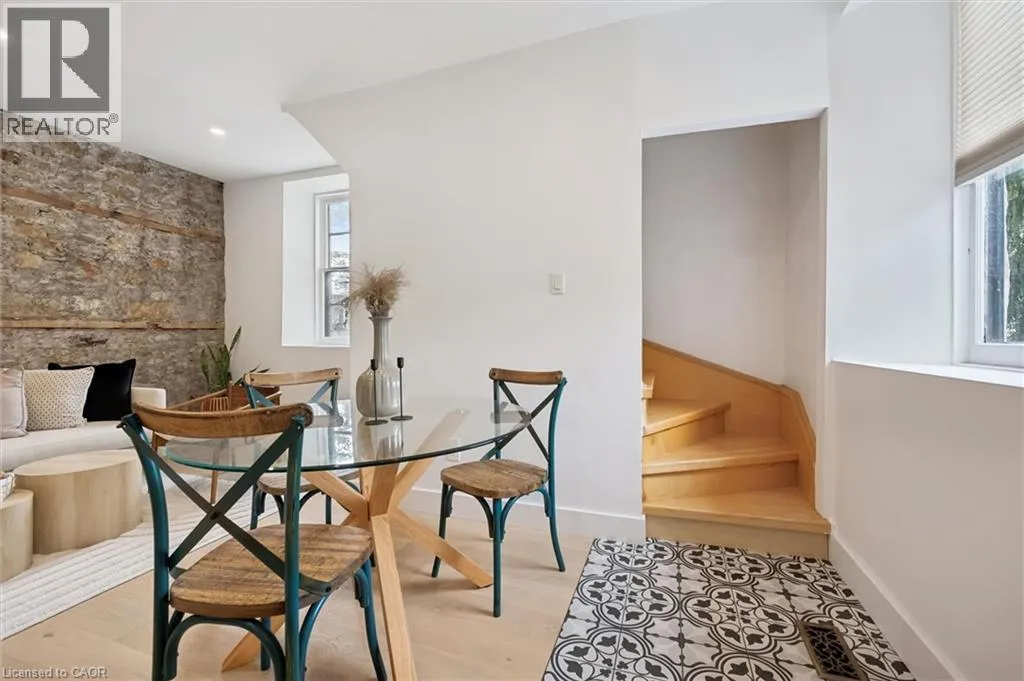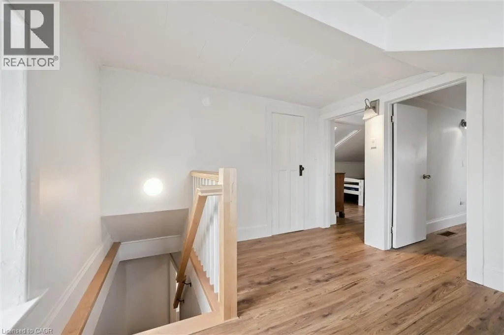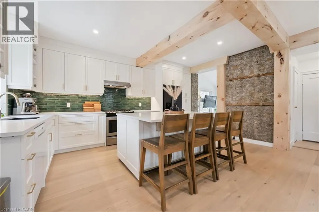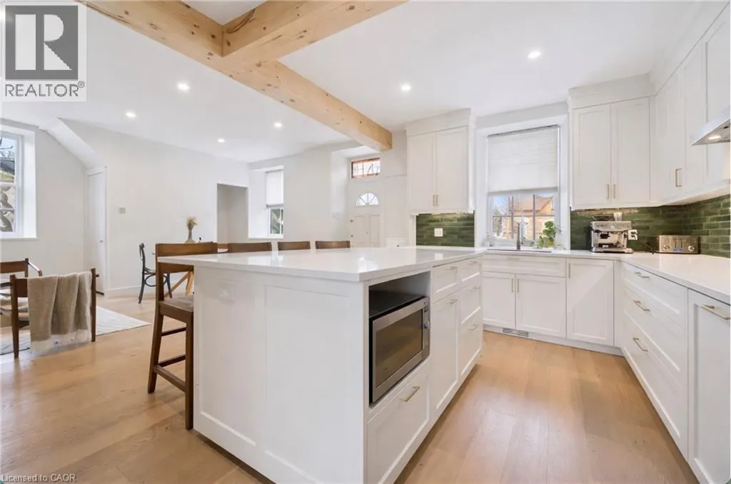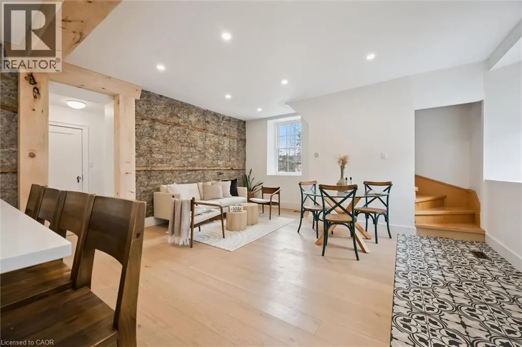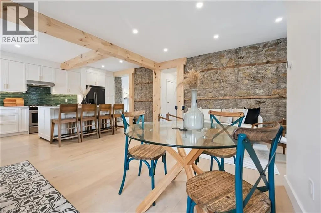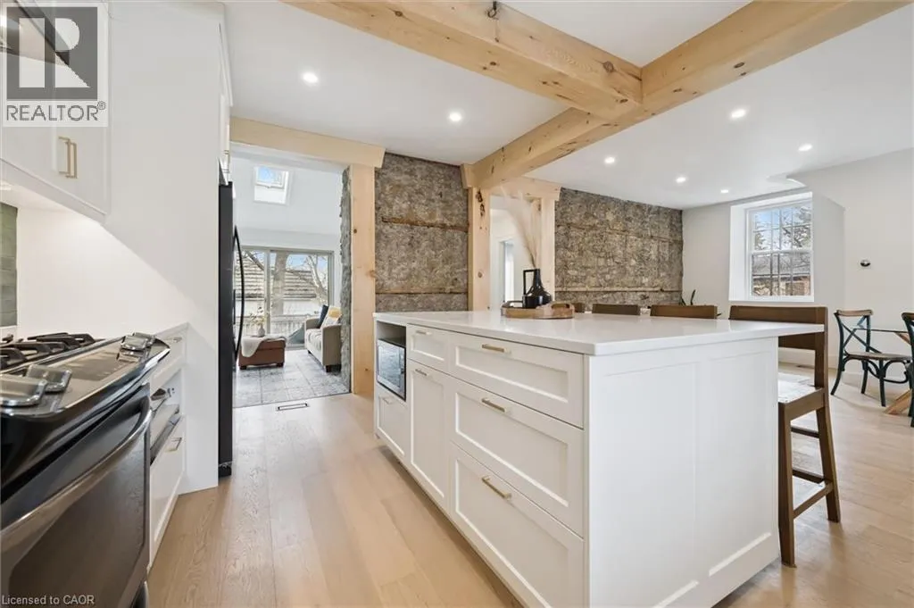 St. Andrew St. E. to Gowrie, North to St. George St. E., Right and property on Right Stunning stone 4 bedroom home with character and charm. This charming 4 bedroom home has been lovingly renovated with a massive, open concept main floor living space. Beamed ceilings, exposed stone walls, new bright white chef's kitchen with quartz countertops and massive island. From the moment you step inside you'll recognize the attention to detail and the love that went into this home. Gleaming neutral hardwood, gorgeous gem toned backsplash, stainless appliances, and so much space! The high ceilings and large windows make this floor inviting and airy. The den, with abundant windows sits just off the kitchen, and a convenient main floor bedroom and newly renovated 3 piece bath with tiled shower and heated floors round out this level. Each end of the home has its own staircase, one to the oversized primary bedroom (with walk in closet) and one to the children's wing. One bedroom upstairs is connected to the primary, perfect for a nursery or office. The second floor bathroom features a clawfoot tub. The backyard is an oasis, with perennial gardens, newer deck and is fully fenced with mature trees, and a private pond. Along the side of the home a concrete pad was poured to double as extra parking and a mini basketball court. The single car garage has been insulated and drywalled and is connected to the home by an interior door. This home is truly the perfect blend of historic elegance with warmth and character, and modern conveniences. (id:27476)