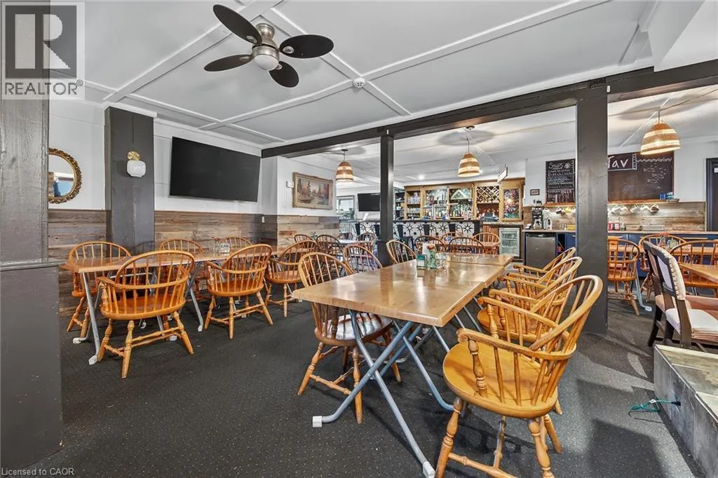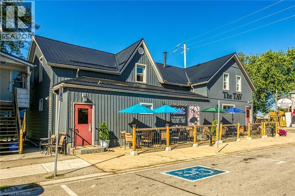 Highway 3 to East on Highway 20 (Indian Line) to South on Fisherville Road (turns into Erie Ave N) property on the corner of Main Ave West (Concession 5 Road) and Erie Ave Aspiring Restaurant Entrepreneurs, Investors or Business Adventurers - Welcome to âThe Tavâ located in charming Haldimand County Hamlet of Fisherville - relaxing 45 min commute south from Hamilton in-route to Lake Erie. This local historic landmark established in 1890, initially built as a hotel for travelling salesmen, has since becoming a dining hub for loyal, year round clientele base - ranging from out of owners, Erie cottagers, Cayuga race car enthusiasts to regular gathering venue for patronizing locals. Situated in heart of Fisherville offering incredible visual exposure enhanced by attractive, recently sided exterior, quaint upper level balconies & licensed outdoor patio (seating for 32 patrons). A true âTurn Keyâ operation introduces 2308sf of main level floor space licensed for 108 patrons sporting tastefully renovated interior promoting a quaint, rustic ambience highlighted with barn board wainscot, 2 sided gas fireplace, authentic âCheersâ style sit-up bar, pool table area & large section designed for intimate dining or sufficient room to accommodate sports teams or private events -continues w/commercial kitchen, separate male/female washrooms & both front & side door entrances. 2 self contained 2 bedroom apartments, beautifully renovated from the âstuds-outâ(2019) grace this grand buildingâs upper level inc full range of appliances, individual gas fireplaces & private balcony walk-outs - providing additional revenue stream - or comfortable living for sole proprietor family. Service style basement houses walk-in cooler, storage/utility rooms & convenient outside keg delivery door. Major 2019 renovations inc exterior siding, metal roof, upgraded electrical, septic/cistern, gas furnace/AC, majority of windows & exterior doors. Financials available for serious inquiries only. Rewarding opportunity awaits in downtown Fisherville - much more than just a business - itâs an enriching small town Ontario lifestyle! Everyone knows âThe Tavâ is âThe Placeâ to be! (id:27476)