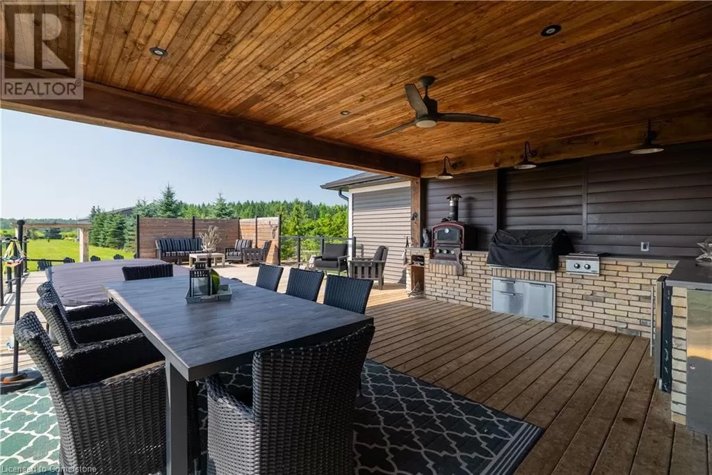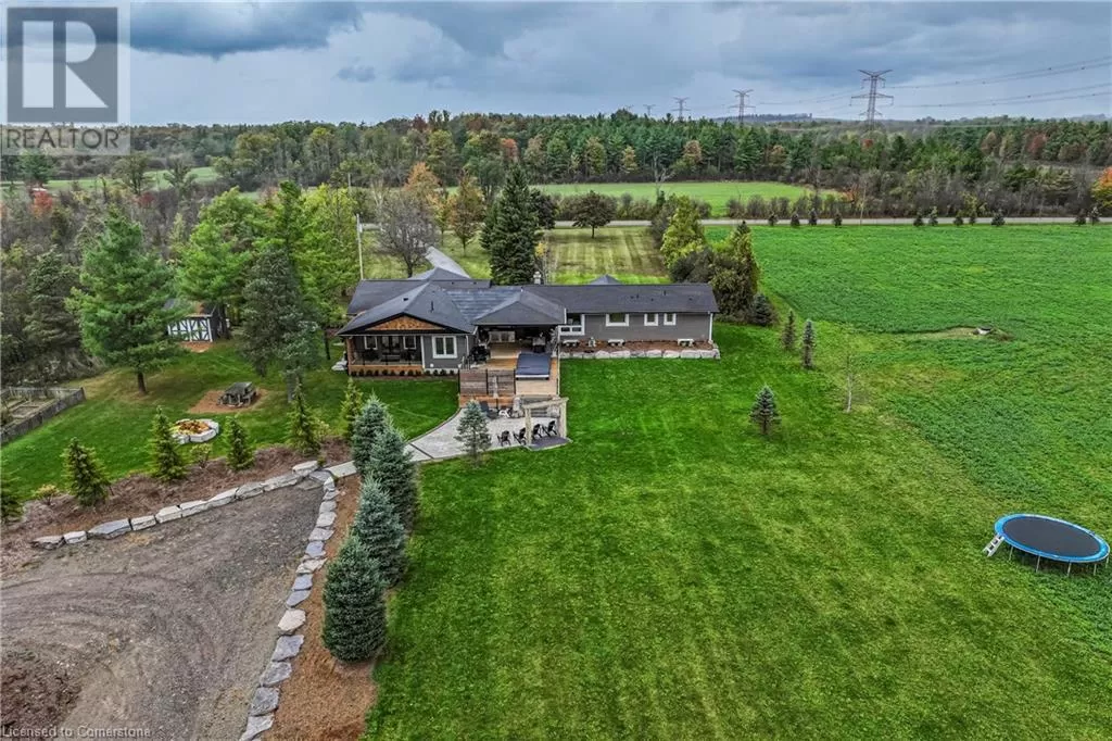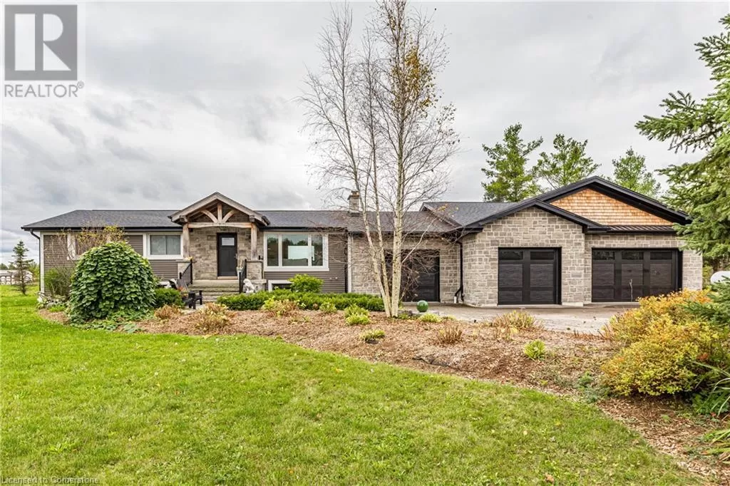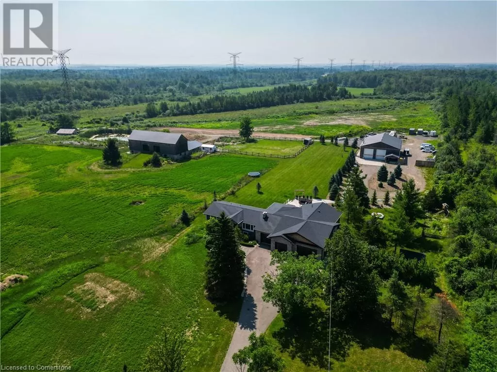 Hwy 6 to 6th Concession Road West This truly remarkable 55-acre farm in Flamborough is the perfect blend of space, practicality, and comfort. The 2,625 sq ft bungalow offers a spacious and inviting living area, ideal for those seeking a peaceful country lifestyle. The open concept chefs kitchen comes with high end SS appliances, a gas range, oversized entertainers island and gorgeous white quartz countertops which roam throughout. Both the primary and secondary bedrooms have spa like ensuites with high end finishes and massive walk in closets! The primary bedroom has its own private porch, louvolite power blinds and the ensuite has heated floors and a steam shower! Separate yourself inside your secluded office to accomplish focused work, equipped with its own kitchenette. The newly finished triple garage with epoxy flooring is ready to store your toys in style. The expansive 3,800 sq ft workshop is perfect for hobbyists, entrepreneurs, or anyone needing substantial space for projects and equipment. The 6,000 sq ft barn provides excellent versatility, whether for livestock, storage, or potential events. To top it off, the back deck features a swim spa, and outdoor kitchen, creating a serene retreat for relaxation and enjoying the stunning rural views. Experience tranquility with your southern exposure as the sun rises on the horizon, piercing through your perfect views of the meticulously cared for landscape. Making this property a true gem for both work and leisure. An absolute must experience rare offering (id:27476)