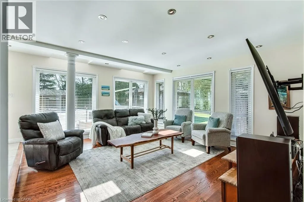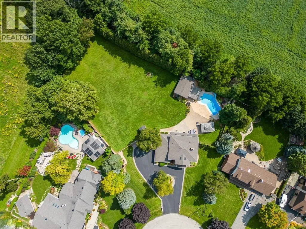 Hwy 6 or Centre Rd to 6th Conc Rd East. East of Centre Rd to John Martin Cres Situated on a quiet, beautifully manicured 0.99-acre lot in one of the most exclusive enclaves in the area, this impressive two-storey brick estate immediately captures attention with its elegant curb appeal, circular driveway, and landscaped centrepiece. This home has it all, offering four bedrooms, four bathrooms and over 4000 square feet of living space. No rear neighbours, an inground pool, hot tub, workshop & gazebo with a natural gas fireplace outside. The backyard is flat, unobstructed and surrounded by trees. Plenty of useable space for entertaining, family games/events and a huge ice rink. Breathtaking foyer illuminated by cascades of natural light and a stunning centre staircase. Exquisite Brazilian hardwood flooring flows seamlessly through the formal dining and entertainment spaces, where a natural gas fireplace adds a warm, ambiance ideal for both grand entertaining and intimate gatherings. The custom kitchen is a masterpiece of craftsmanship, featuring cherry maple oak soft-close cabinetry, under-cabinet lighting, heated floors, granite countertops, skylights, and a toe-kick central vacuum for effortless living. The step-down living room features large windows overlooking the private back yard, pot lights through-out and gleaming hardwood floors. The expansive primary suite impresses with two walk-in closets, custom built-in wall-to wall cabinetry, and an elegant ensuite featuring dual vanities and a walk-in shower. The fully finished basement features a spacious recreation room, a bathroom, a private office, an oversized storage room, and a separate walk-up staircase leading directly to the garage. Nestled in a prime location just five minutes from Waterdown, this location offers unrivaled access to excellent schools, parks, trails, golf courses, and fitness centers, a rare setting where every lifestyle amenity is within easy reach, yet the surroundings remain serene and exclusive. (id:27476)
