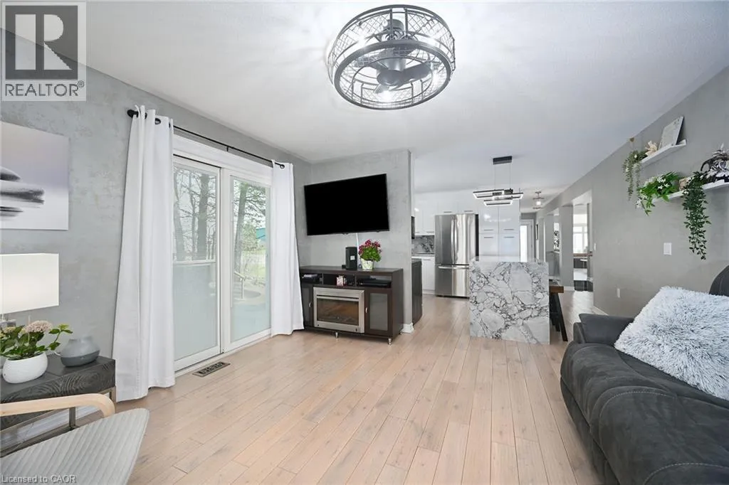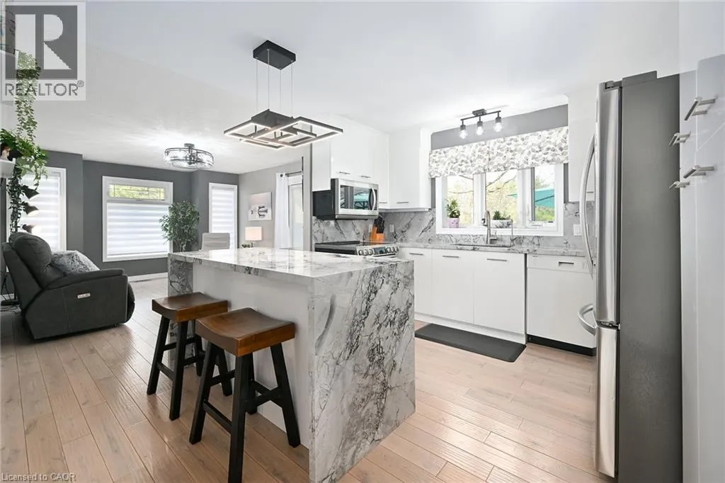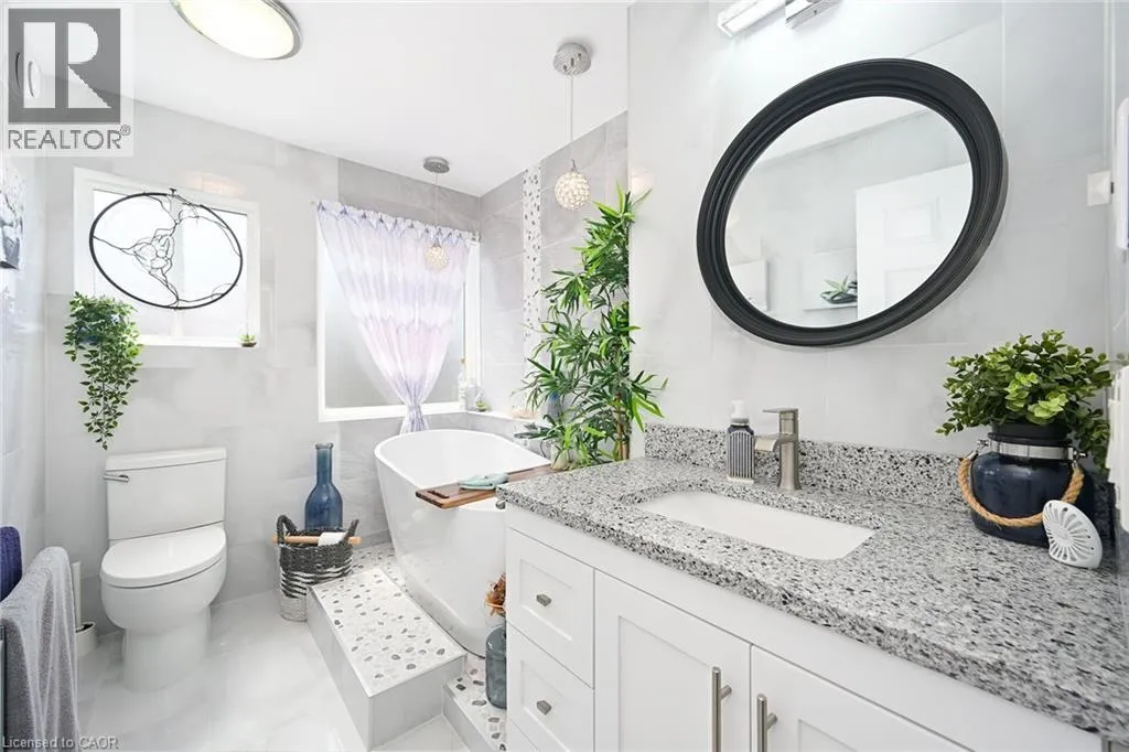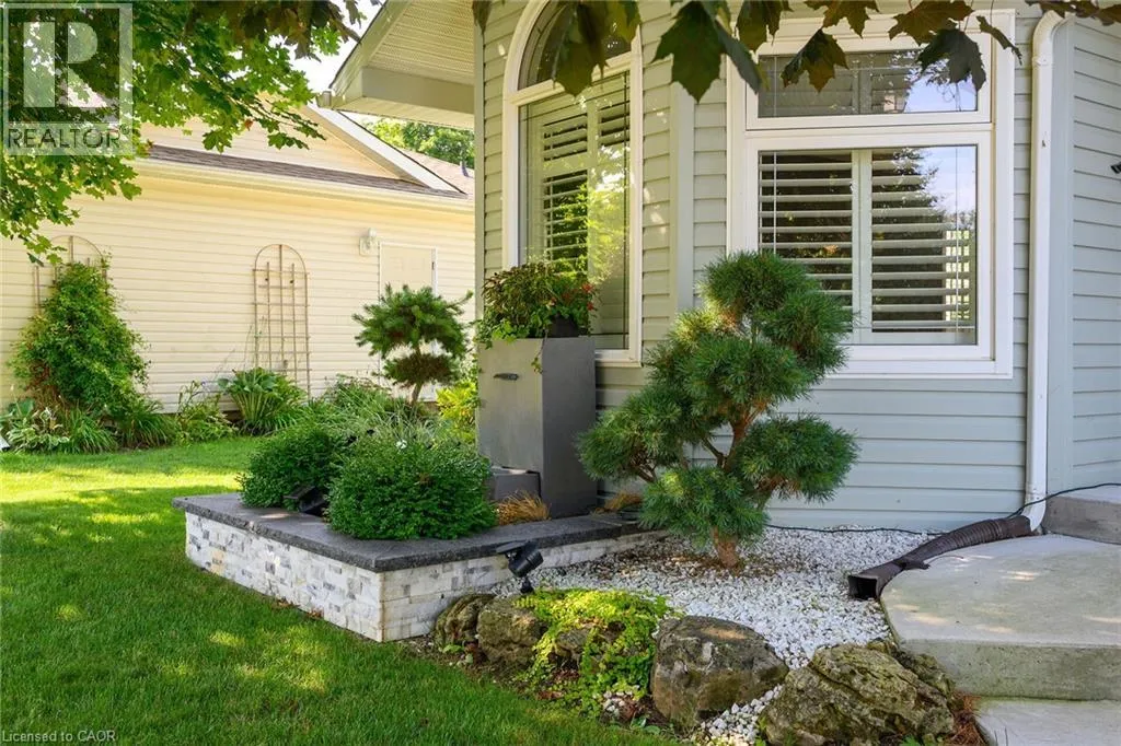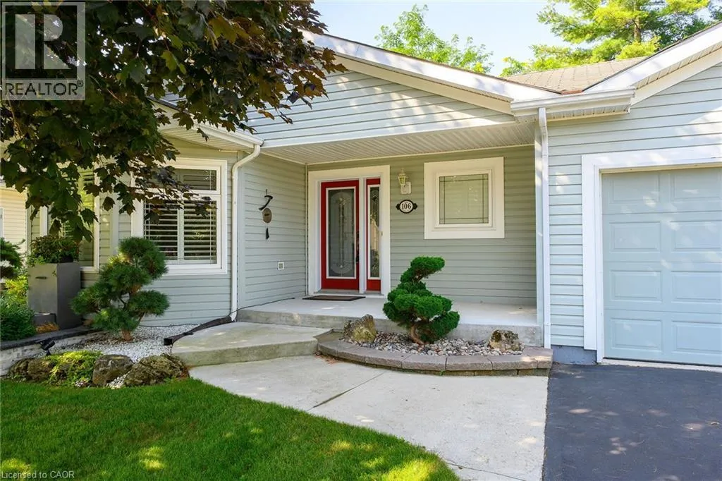 Glenariff & Concession 8 W Welcome to 106 Bushmill, beautifully updated from top to bottom, located on the most coveted street in the desirable Antrim Glen Adult Community. Impeccably maintained home, offering ample main level living space and a professionally finished basement. This bright and open bungalow has gorgeous hand-scraped oak floors. The living and dining rooms flow seamlessly together, perfect for family gatherings. The updated kitchen is stunning with quartz counters, including a quartz waterfall island with seating, custom cabinetry, quality appliances and a view of your award winning gardens. The cozy family room overlooks the backyard and has a walk out to your very private composite deck with screened in gazebo and stone patio. The landscaping and gardens are breathtaking, the proud recipient of several awards! The curb appeal is 10+ with your charming front porch and cascading water-feature. An in-ground sprinkler system provides carefree maintenance. Back inside, the main level offers two spacious bedrooms, including a primary retreat with walk-in closet, and two full bathrooms including a dreamy soaker tub. The updated glass railing leads you to the finished basement, featuring new carpet, two large bedrooms, a recreation room, two piece bathroom (with space for a shower) and a utility room with lots of storage. The home has been freshly painted in neutral designer decor. Custom window coverings adorn the windows. Attached garage with access through the main floor laundry room as well as to the backyard. Antrim Glen is conveniently located between Waterdown, Cambridge and Guelph. Offering a vibrant lifestyle community with heated salt water pool, sauna, BBQ area, a lounge and kitchen for large gatherings, billiards, shuffleboard, library, craft room, horseshoes, private vegetable garden plots, and wooded walking trails. Move in ready, all you need to do is unpack, relax and enjoy! (id:27476)