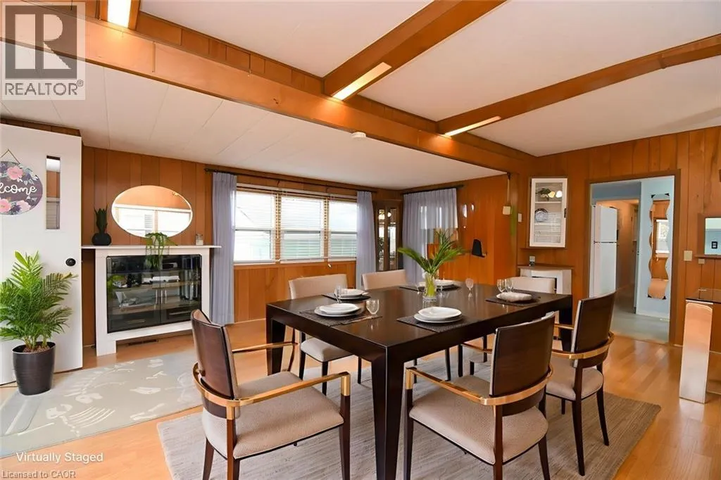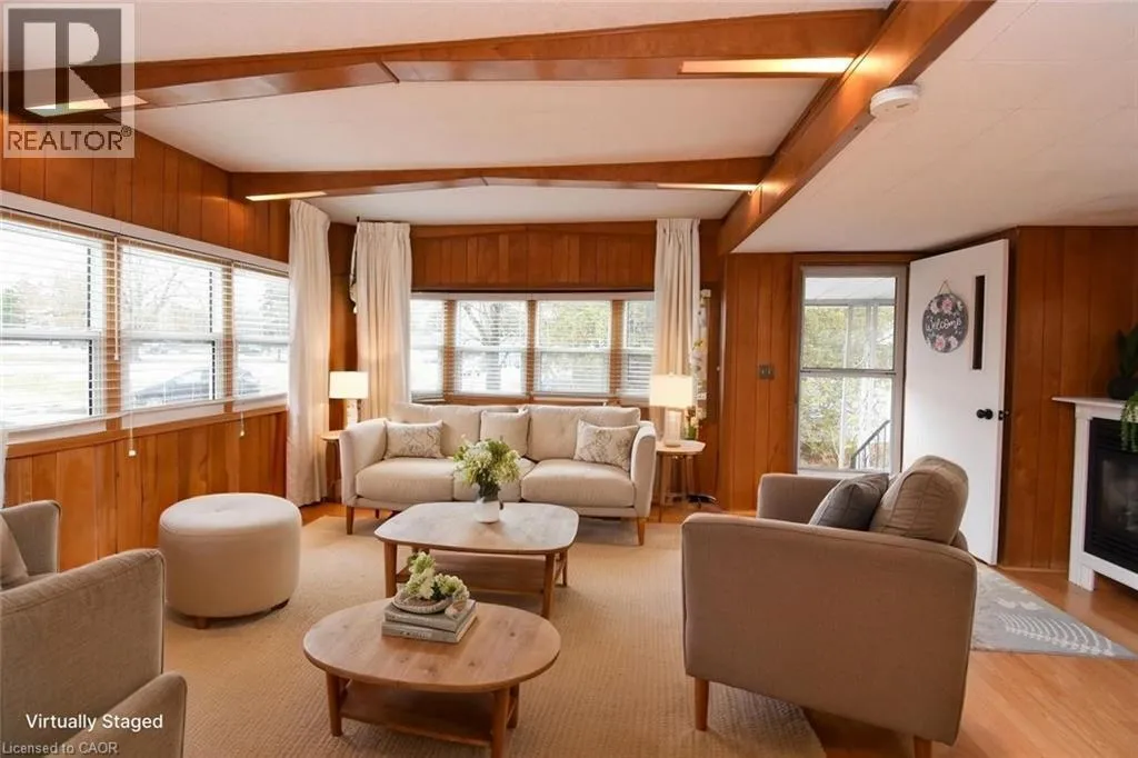 Spacious Beverly Hills Estates home on a great oversize lot. Close to Freelton Village and Hwy 6 N plus a short driving distance to the shopping districts of Guelph, Cambridge and Waterdown. Very desired community with year round living and social activities for all ages. Ready move in condition to this amazing one of a kind country home with fully open concept living and dining space and an abundance of windows. The seasonal sunroom is an ideal retreat with many operational windows and screens. Please note the spacious garage is presently used as a huge workshop yet ideal for garage space and workshop. There is inside access to storage room and home plus front of garage two car parking. Very reasonable land lease fees include property tax. Mandatory condition in all offers for Park management approval of land lease. Viewing appointments at anytime by contacting Listing Brokerage or Listing Salesperson (id:27476)