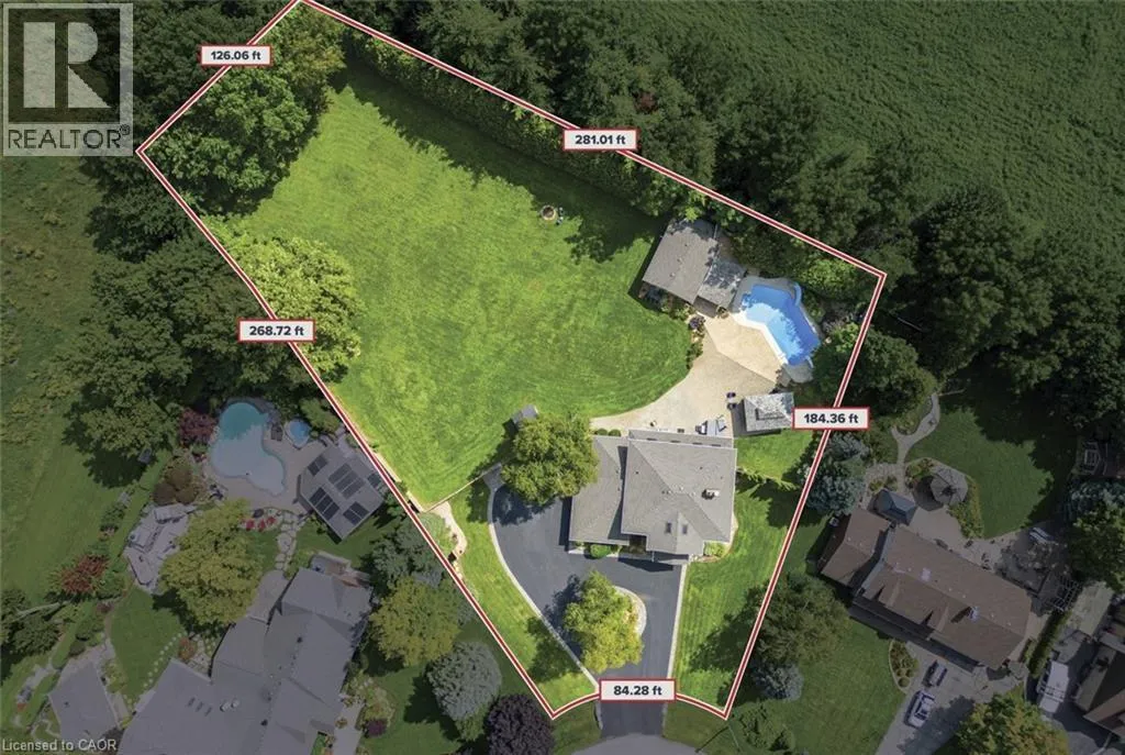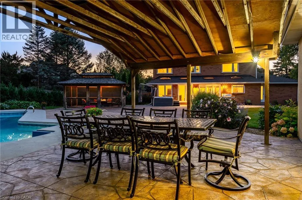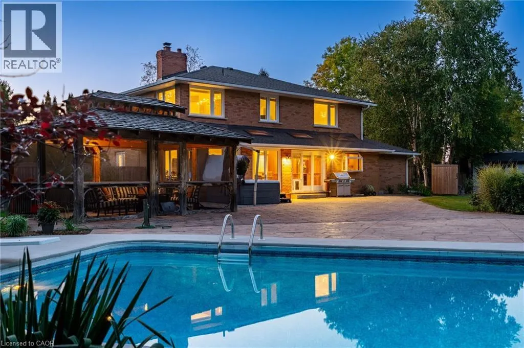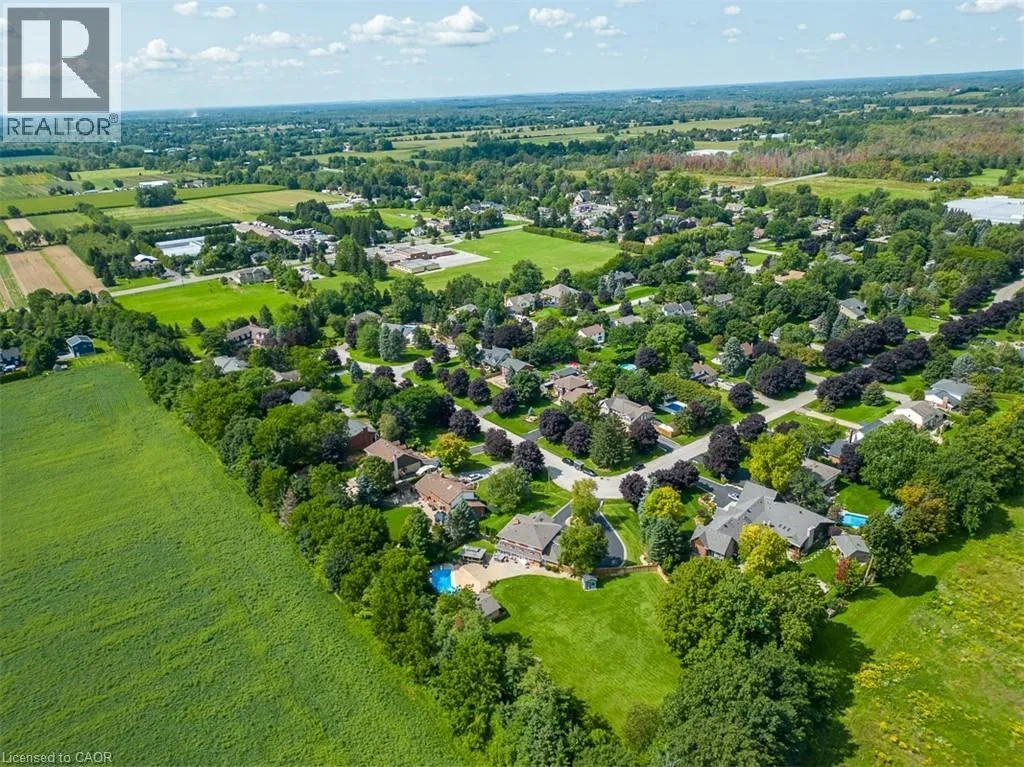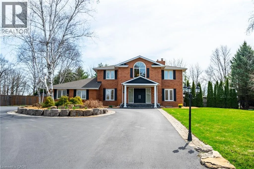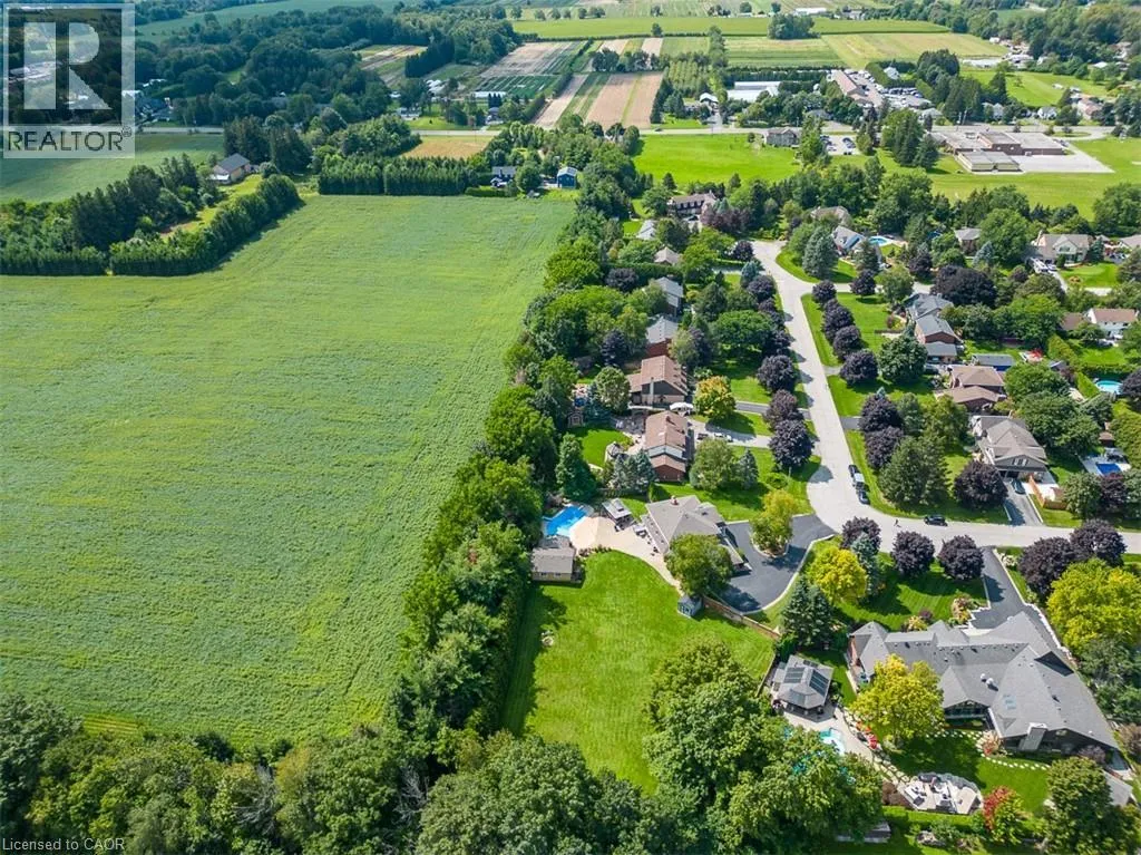Hwy 6 or Centre Rd to 6th Conc Rd East. East of Centre Rd to John Martin Cres Situated on a quiet, beautifully manicured 0.99-acre lot in one of the most exclusive enclaves in the area, this impressive two-storey brick estate immediately captures attention with its elegant curb appeal, circular driveway, and landscaped centrepiece. This home has it all, offering four bedrooms, four bathrooms and over 4000 square feet of living space. No rear neighbours, an inground pool, hot tub, workshop & gazebo with a natural gas fireplace outside. The backyard is flat, unobstructed and surrounded by trees. Plenty of useable space for entertaining, family games/events and a huge ice rink. Breathtaking foyer illuminated by cascades of natural light and a stunning centre staircase. Exquisite Brazilian hardwood flooring flows seamlessly through the formal dining and entertainment spaces, where a natural gas fireplace adds a warm, ambiance ideal for both grand entertaining and intimate gatherings. The custom kitchen is a masterpiece of craftsmanship, featuring cherry maple oak soft-close cabinetry, under-cabinet lighting, heated floors, granite countertops, skylights, and a toe-kick central vacuum for effortless living. The step-down living room features large windows overlooking the private back yard, pot lights through-out and gleaming hardwood floors. The expansive primary suite impresses with two walk-in closets, custom built-in wall-to wall cabinetry, and an elegant ensuite featuring dual vanities and a walk-in shower. The fully finished basement features a spacious recreation room, a bathroom, a private office, an oversized storage room, and a separate walk-up staircase leading directly to the garage. Nestled in a prime location just five minutes from Waterdown, this location offers unrivaled access to excellent schools, parks, trails, golf courses, and fitness centers, a rare setting where every lifestyle amenity is within easy reach, yet the surroundings remain serene and exclusive. (id:27476)