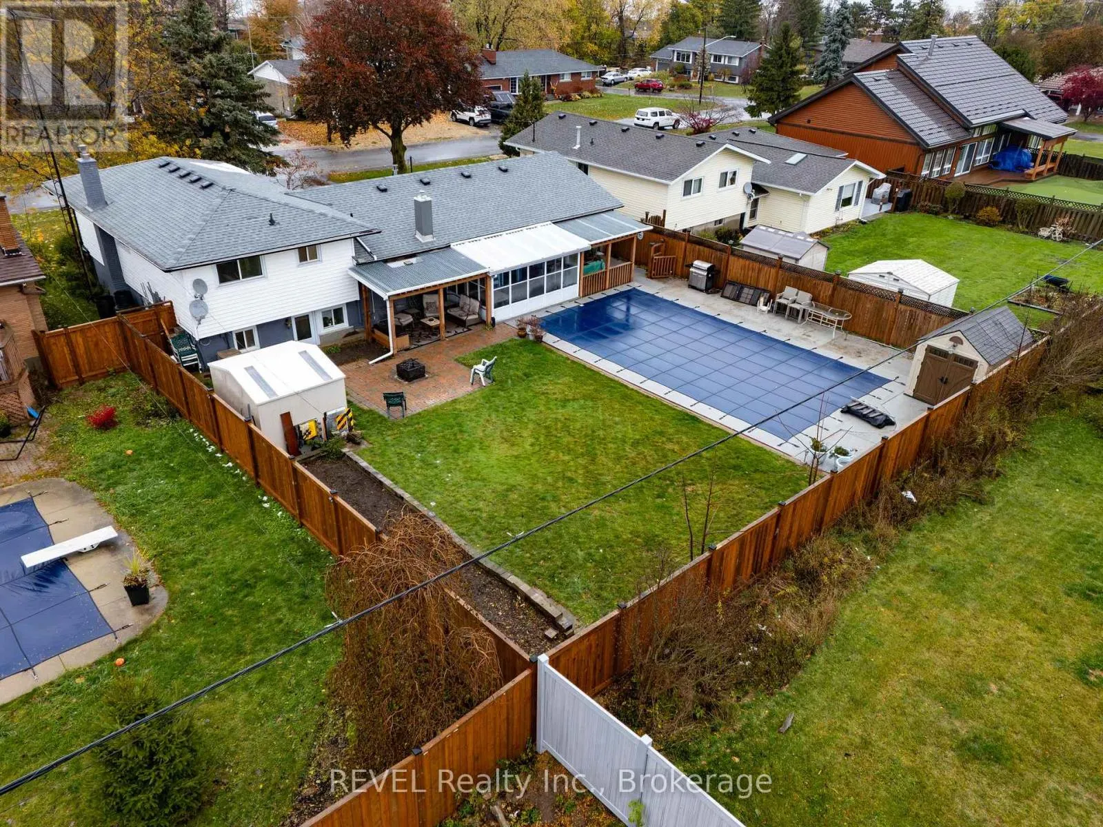 Cross Streets: Central & Bowen. ** Directions: Central to West on Bowen to Burns to Lindbergh. The family home you have been waiting for has just hit the market! The value in this home is incredible! Starting with the oversized lot and the in ground swimming pool you will have amazing summers in this awesome backyard. Multiple powered sheds for all of your storage needs and both front and back access to the attached garage ensure quick and simple maintenance. Inside the main living area has been completely updated with a wonderful kitchen that overlooks the living and dining areas. Beautiful hardwood floors blend with the natural wood beams and stunning non slip tile that begins at the front entry and is carried all the way through the kitchen. The wonderful floor to ceiling gas fireplace and mantle will keep you warm on the cold winter nights. Sliding doors lead from the dining room to covered mud room entry to the garage and backyard. A small flight of stairs lead up to the bedrooms and main bath area where you will find very well sized rooms and closets. The warm hardwood continues all the way up the stairs and throughout this level. Another small set of stairs leads to the lower level with a second rear entrance and foyer, 4 piece bathroom, and the large family containing the wood fireplace that is currently in use, fully operational, and literally heats the whole house. Another small set of stairs down to the lower basement has the utility/laundry room and the workshop. Plenty of space for storage here or conversion to workout/exercise room if preferred. Finally, the home is monitored and protected with an incredible home security system. The location is incredible and with everything this home has to offer all you have to do is turn the key and enjoy! (id:27476)