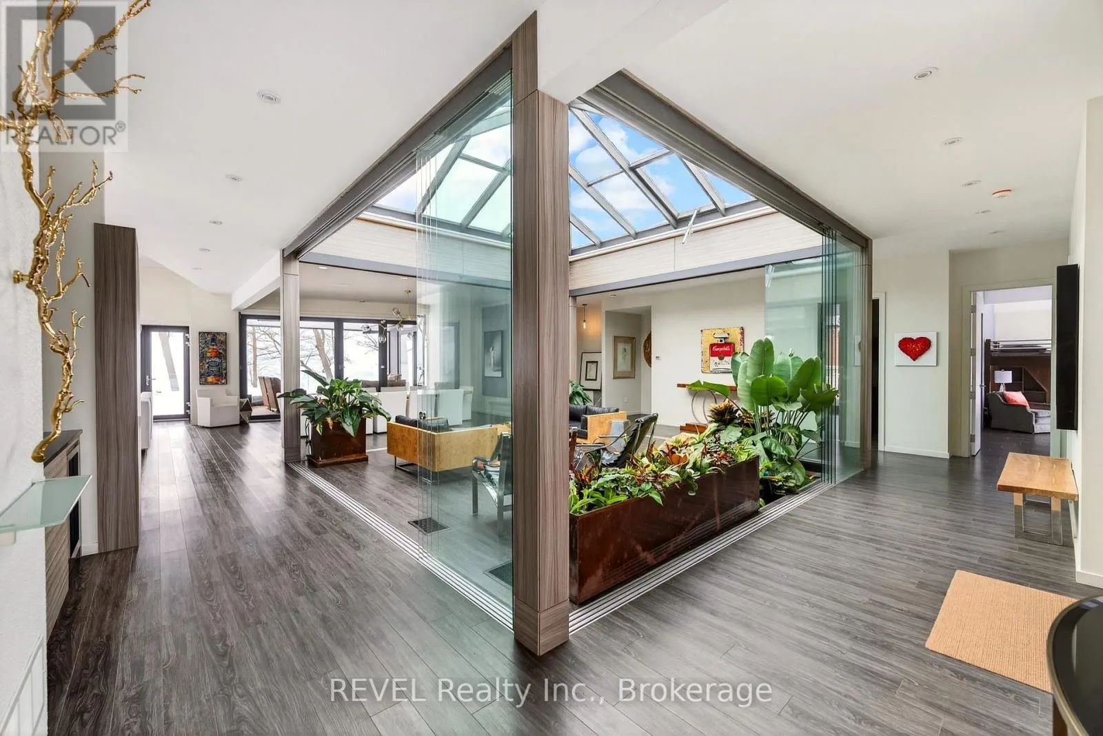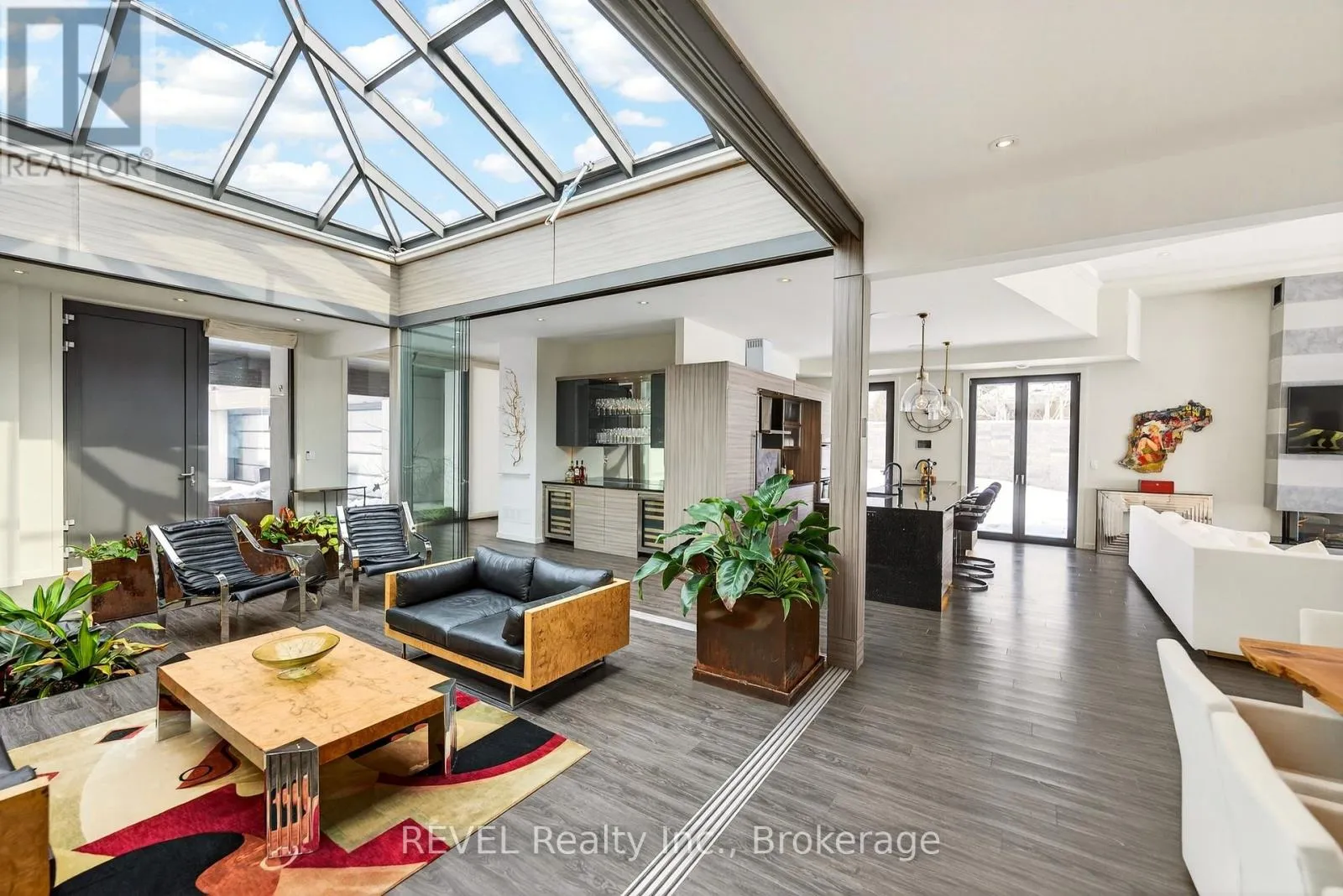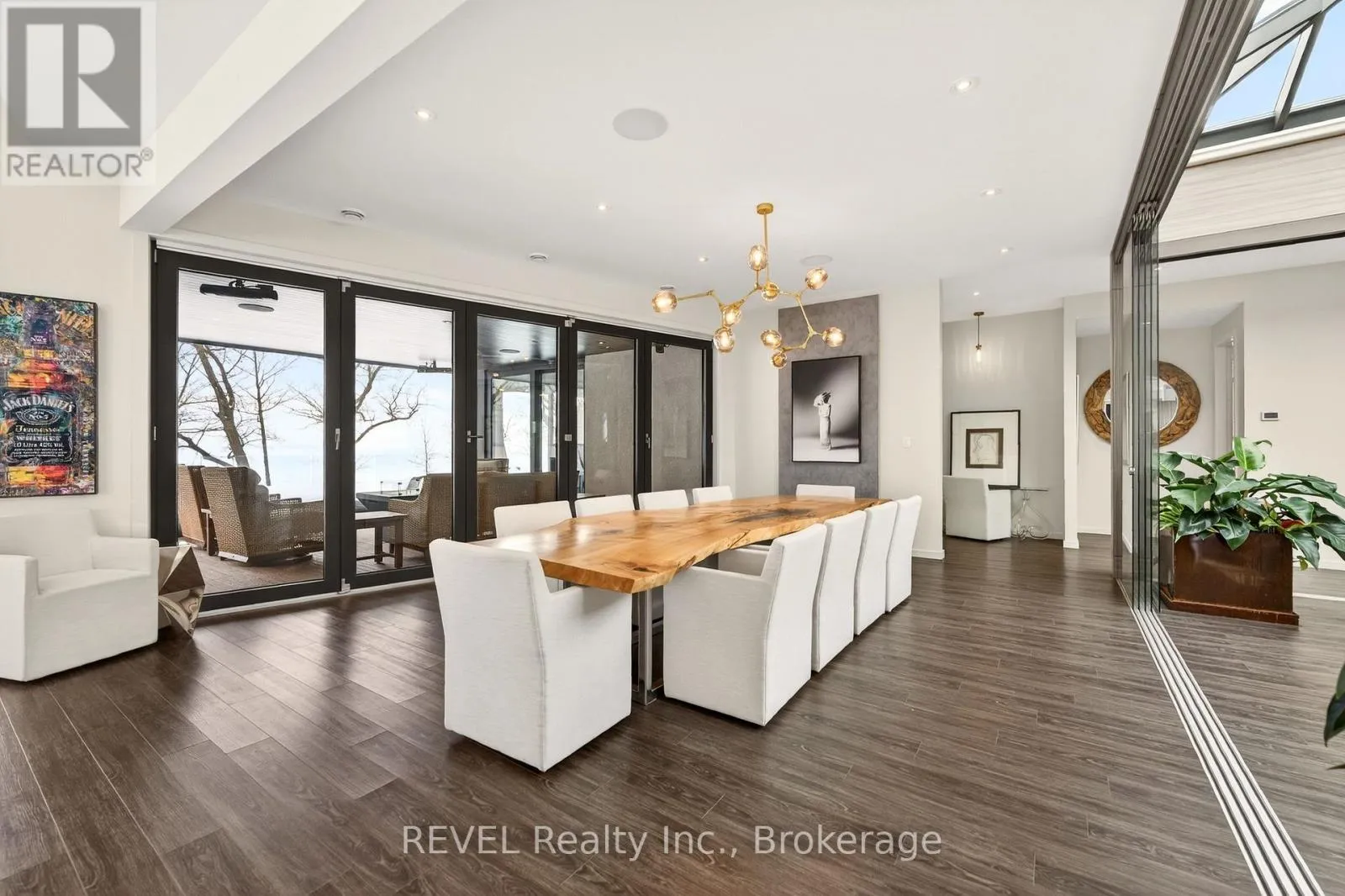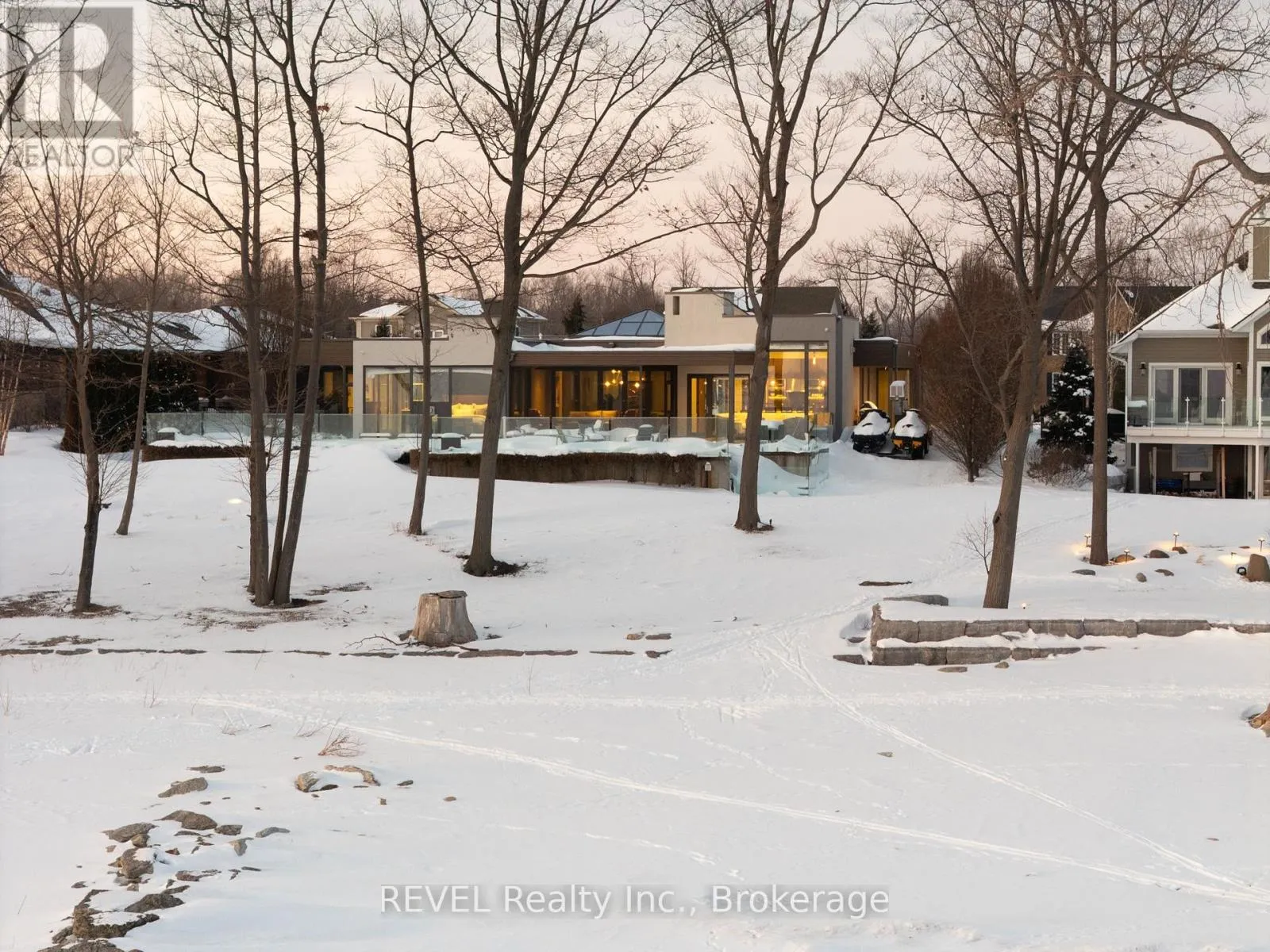 Cross Streets: Burleigh Road & Lakecrest Court. ** Directions: Burleigh Road S to Lakecrest Court. Unforgettable modern beachfront estate in the charming lakeside town of Ridgeway, offering 113ft of private Lake Erie shoreline and breathtaking panoramic water views. Designed as the ultimate family retreat or year-round luxury residence, this exceptional oversized bungalow blends refined architecture with effortless coastal living. The home features four expansive bedrooms, each with its own beautifully appointed ensuite and generous closet space. The primary suite is a true sanctuary, complete with a gas fireplace, multiple walk-out terraces, a spacious walk-in closet, and stunning lake views enjoyed from your bed, freestanding soaking tub, and glass shower. Thoughtfully designed for both everyday living and entertaining, the open-concept main living areas are complemented by a large butler's pantry, built-in bar, and seamless indoor-outdoor transitions, including a glass-enclosed atrium. Screened-in patios with gas heaters extend seasonal enjoyment. Custom details and designer finishes are showcased throughout, including Restoration Hardware lighting and premium imported German windows & doors. A main floor laundry room, mudroom entry, attached four-car garage, and separate detached two-car garage provide exceptional convenience and storage for vehicles, boats, and recreational equipment. Set on a substantial estate lot, the home is positioned well back from the road for privacy while maintaining ideal proximity to the lake. The grounds offer expansive green space alongside a private beach framed by an armour stone shoreline and professional landscaping. Outdoor living is unparalleled, featuring oversized aggregate patios with multiple lounging and dining zones, fireside gathering areas, a large saltwater inground pool with a hidden electric cover, and sleek glass railings that preserve unobstructed lake views. Waterfront ideal for kayaking, paddleboarding, and boating - and a nearby launch just steps away - this is luxury waterfront living at its finest. (id:27476)