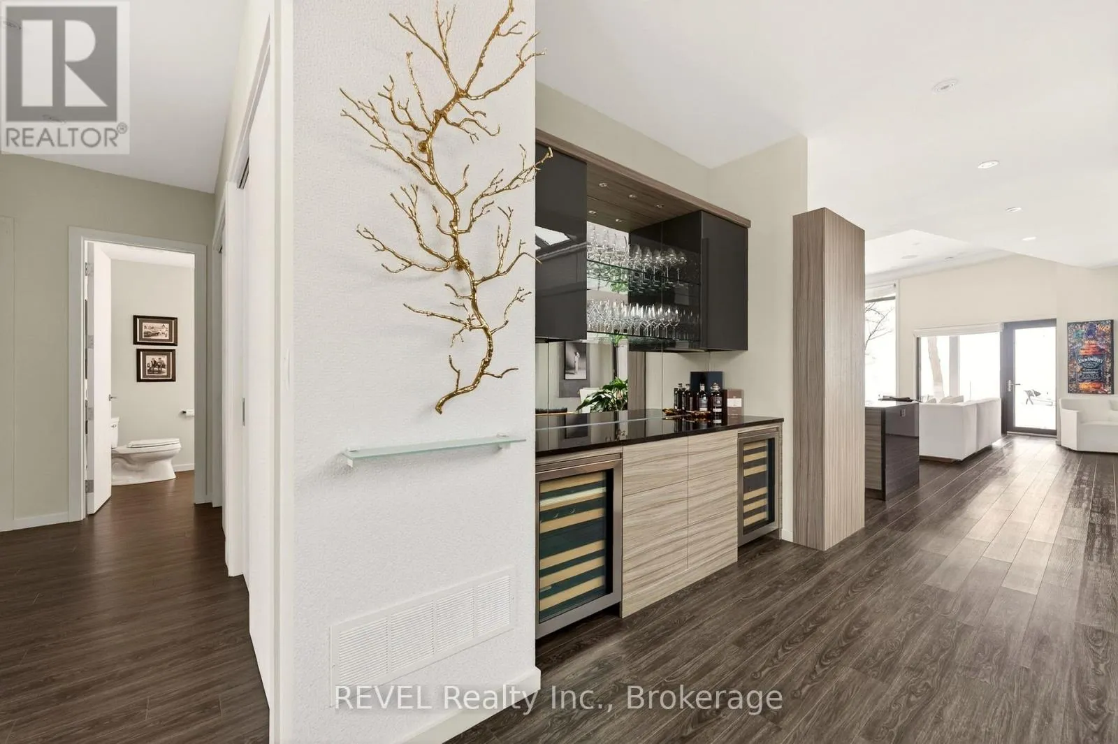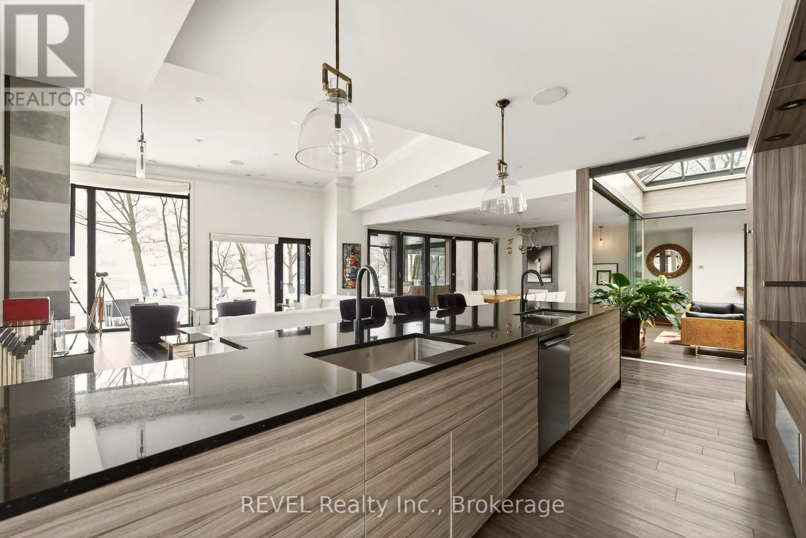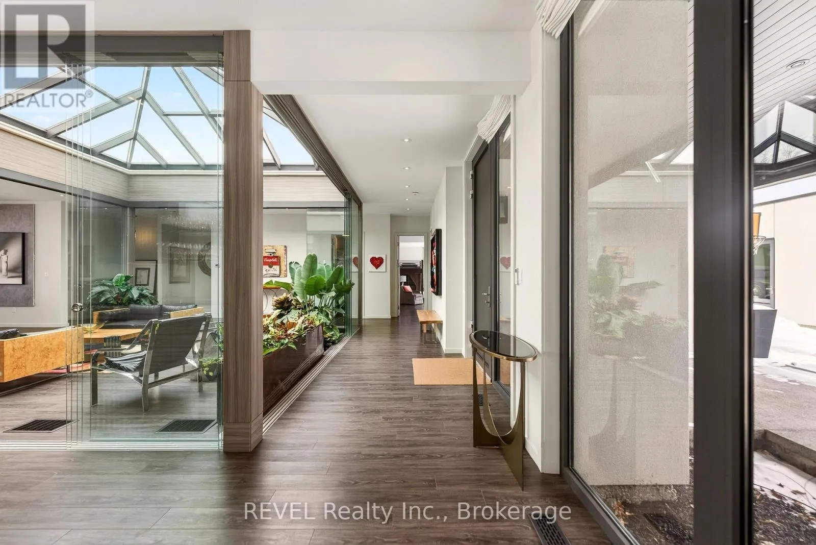Cross Streets: Burleigh Road & Lakecrest Court. ** Directions: Burleigh Road S to Lakecrest Court. Unforgettable modern beachfront estate in the charming lakeside town of Ridgeway, offering 113ft of private Lake Erie shoreline and breathtaking panoramic water views. Designed as the ultimate family retreat or year-round luxury residence, this exceptional oversized bungalow blends refined architecture with effortless coastal living. The home features four expansive bedrooms, each with its own beautifully appointed ensuite and generous closet space. The primary suite is a true sanctuary, complete with a gas fireplace, multiple walk-out terraces, a spacious walk-in closet, and stunning lake views enjoyed from your bed, freestanding soaking tub, and glass shower. Thoughtfully designed for both everyday living and entertaining, the open-concept main living areas are complemented by a large butler's pantry, built-in bar, and seamless indoor-outdoor transitions, including a glass-enclosed atrium. Screened-in patios with gas heaters extend seasonal enjoyment. Custom details and designer finishes are showcased throughout, including Restoration Hardware lighting and premium imported German windows & doors. A main floor laundry room, mudroom entry, attached four-car garage, and separate detached two-car garage provide exceptional convenience and storage for vehicles, boats, and recreational equipment. Set on a substantial estate lot, the home is positioned well back from the road for privacy while maintaining ideal proximity to the lake. The grounds offer expansive green space alongside a private beach framed by an armour stone shoreline and professional landscaping. Outdoor living is unparalleled, featuring oversized aggregate patios with multiple lounging and dining zones, fireside gathering areas, a large saltwater inground pool with a hidden electric cover, and sleek glass railings that preserve unobstructed lake views. Waterfront ideal for kayaking, paddleboarding, and boating - and a nearby launch just steps away - this is luxury waterfront living at its finest. (id:27476)