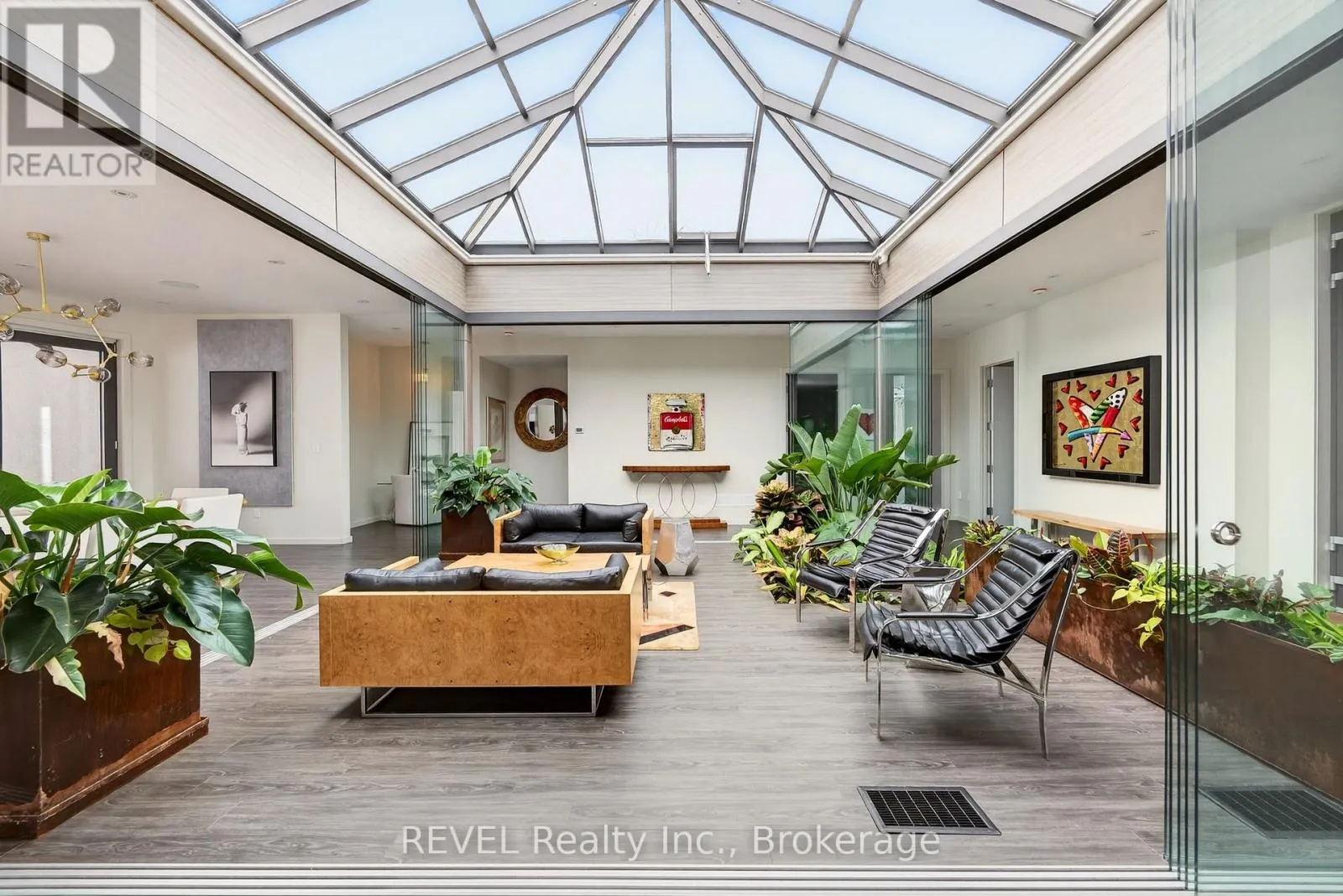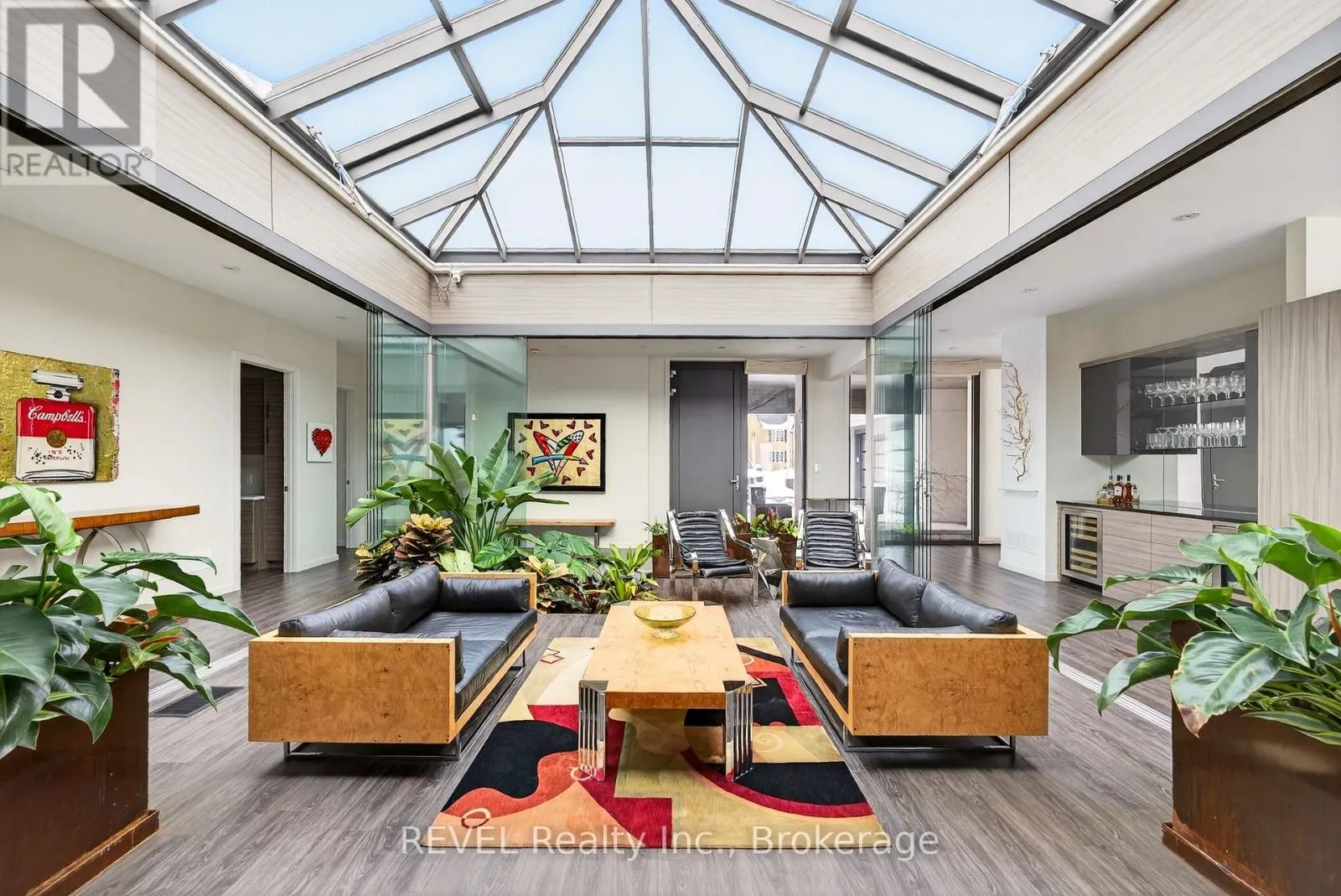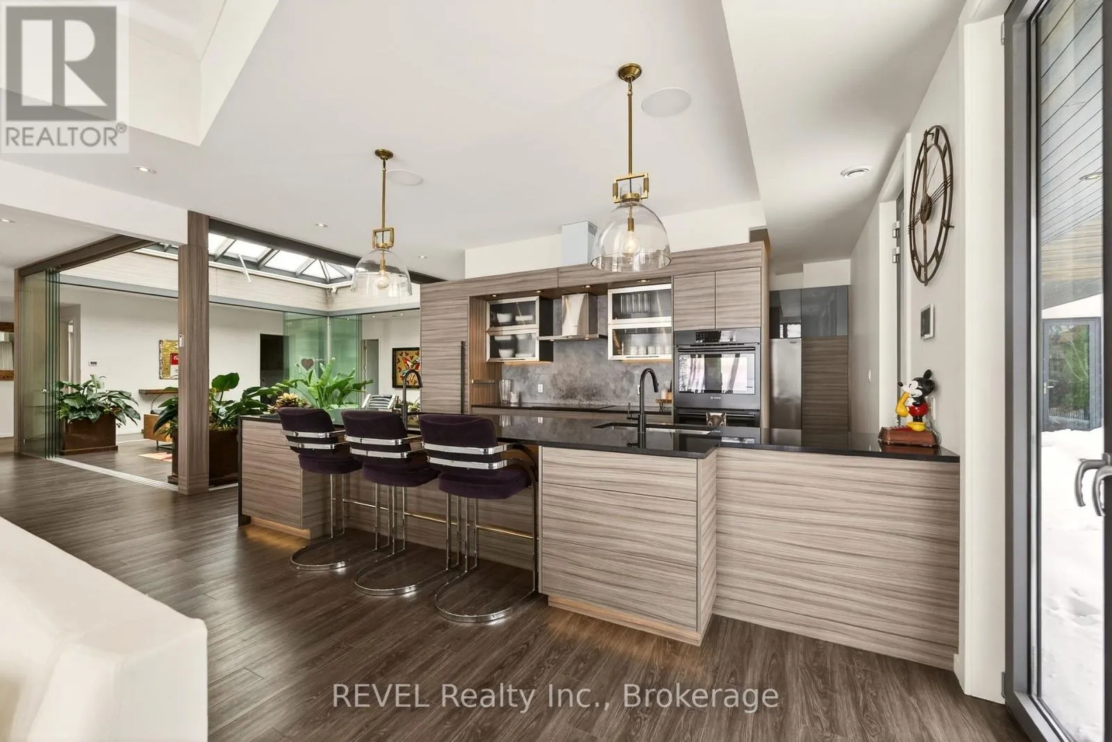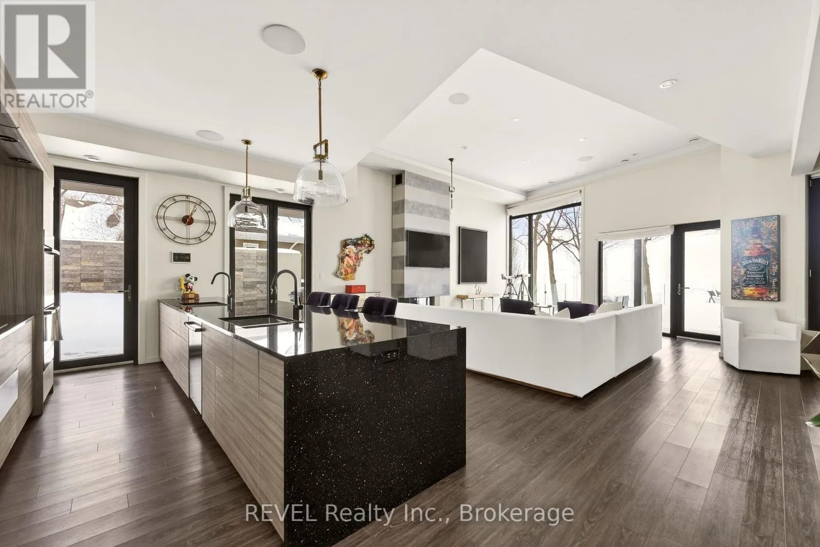 Cross Streets: Burleigh Road & Lakecrest Court. ** Directions: Burleigh Road S to Lakecrest Court. Unforgettable modern beachfront estate in the charming lakeside town of Ridgeway, offering 113ft of private Lake Erie shoreline and breathtaking panoramic water views. Designed as the ultimate family retreat or year-round luxury residence, this exceptional oversized bungalow blends refined architecture with effortless coastal living. The home features four expansive bedrooms, each with its own beautifully appointed ensuite and generous closet space. The primary suite is a true sanctuary, complete with a gas fireplace, multiple walk-out terraces, a spacious walk-in closet, and stunning lake views enjoyed from your bed, freestanding soaking tub, and glass shower. Thoughtfully designed for both everyday living and entertaining, the open-concept main living areas are complemented by a large butler's pantry, built-in bar, and seamless indoor-outdoor transitions, including a glass-enclosed atrium. Screened-in patios with gas heaters extend seasonal enjoyment. Custom details and designer finishes are showcased throughout, including Restoration Hardware lighting and premium imported German windows & doors. A main floor laundry room, mudroom entry, attached four-car garage, and separate detached two-car garage provide exceptional convenience and storage for vehicles, boats, and recreational equipment. Set on a substantial estate lot, the home is positioned well back from the road for privacy while maintaining ideal proximity to the lake. The grounds offer expansive green space alongside a private beach framed by an armour stone shoreline and professional landscaping. Outdoor living is unparalleled, featuring oversized aggregate patios with multiple lounging and dining zones, fireside gathering areas, a large saltwater inground pool with a hidden electric cover, and sleek glass railings that preserve unobstructed lake views. Waterfront ideal for kayaking, paddleboarding, and boating - and a nearby launch just steps away - this is luxury waterfront living at its finest. (id:27476)