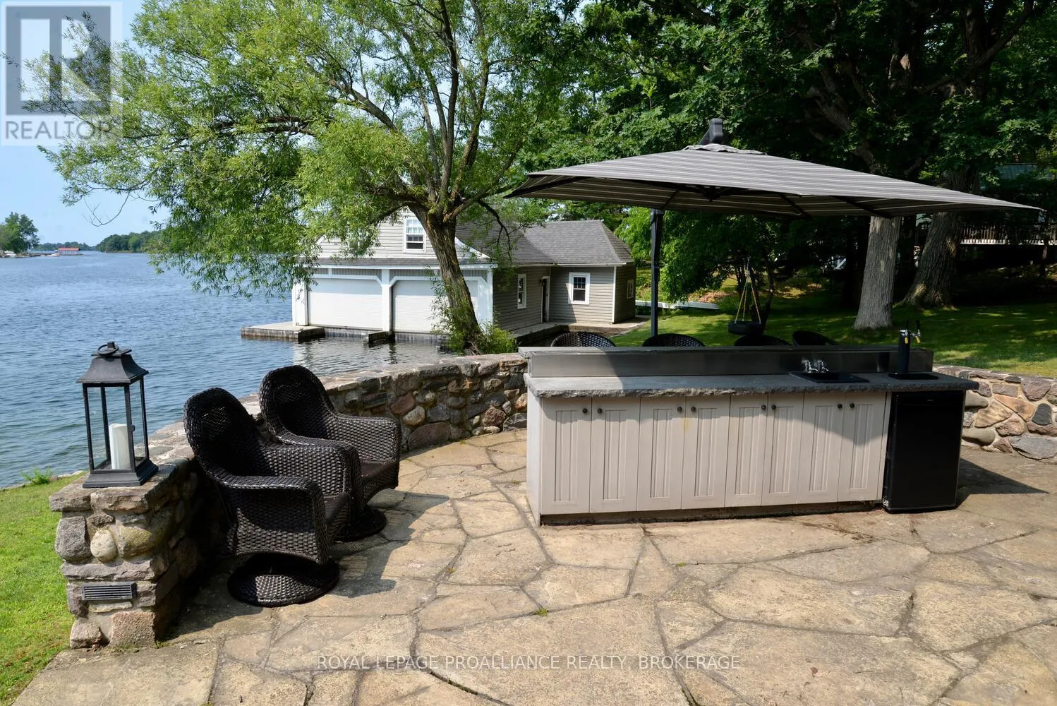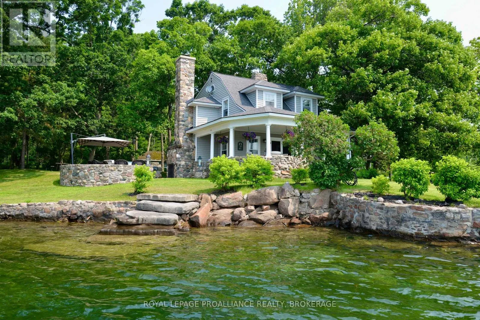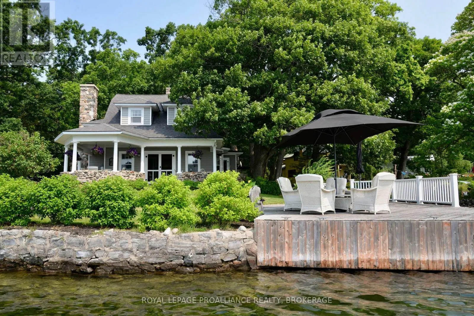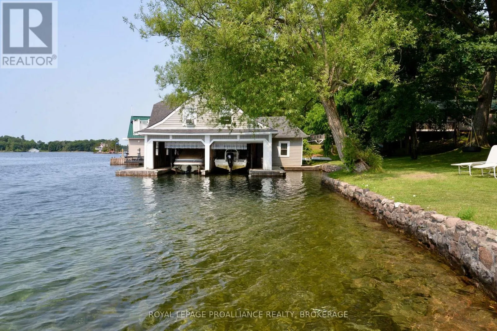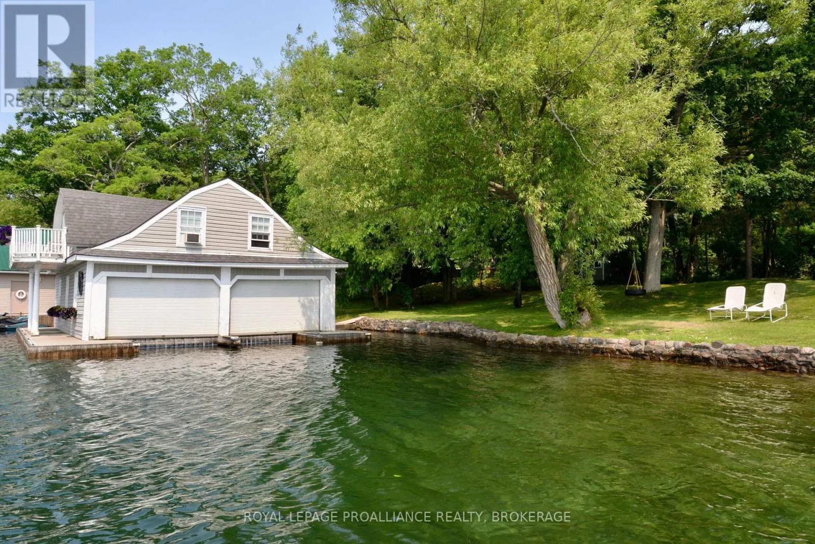 Cross Streets: Main & Water Streets. ** Directions: South from Gananoque Marina to 121 Tremont Island. Experience the perfect blend of historic charm and relaxed waterfront living at this beautifully maintained 1903 summer home on picturesque Tremont Park Island, just minutes from Gananoque Marina. Set on over 200 feet of pristine shoreline, this classic summer home offers multiple spaces to unwind and entertain. Begin your day lounging on the waterside deck, then move to the beautiful covered porch with views of children playing on your private beach. Whether you're soaking up the sun or enjoying the shade, this property offers a peaceful escape in every direction. Inside, the home exudes character starting with a grand stone fireplace anchoring the living room paired with exposed beams and immaculate pine floors that flow through the formal dining room and den. The recently renovated kitchen is a gathering place featuring granite counters, new appliances, spacious island with built-in stove, double drawer refrigerators, coffee bar, mini pantry, plus easy access to east facing deck. The main floor includes convenient laundry and 2 piece bath while upstairs you'll find 4 spacious bedrooms and 3 piece bath. Step outside to your expansive stone patio and outdoor kitchen equipped with built-in BBQ and wet bar w/chiller tray for keeping drinks cool in summer months. A towering custom-built stone fireplace extends the patio season and creates a perfect setting for unforgettable evenings. Guests feel right at home with additional accommodations w/3 piece bath above the double-slip boathouse, recently reinforced with steel and concrete decks. A charming bunkie and storage shed provide additional versatility. This generational- style retreat is a rare find in one of Canada's most sought-after destinations. Featuring extensive docking and timeless character, this is a unique opportunity to own a true piece of paradise in the heart of the Thousand Islands.There are no restrictions preventing non-Canadians from buying this property. (id:27476)