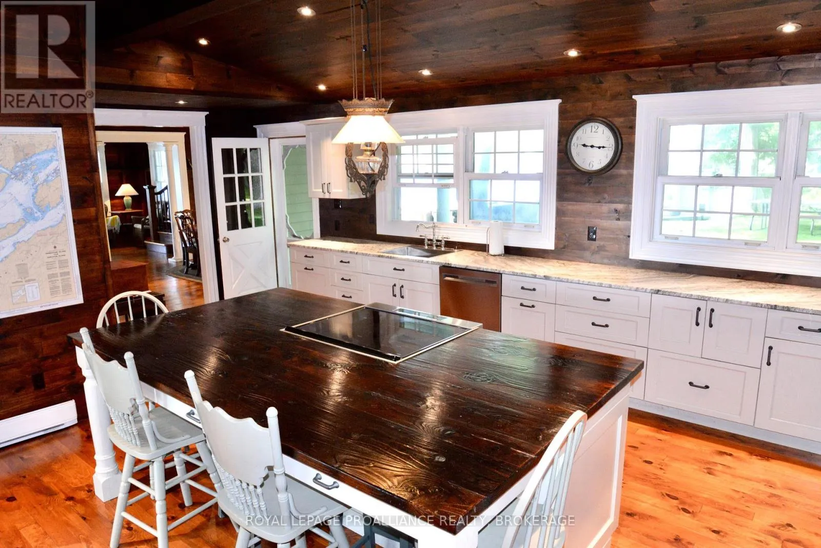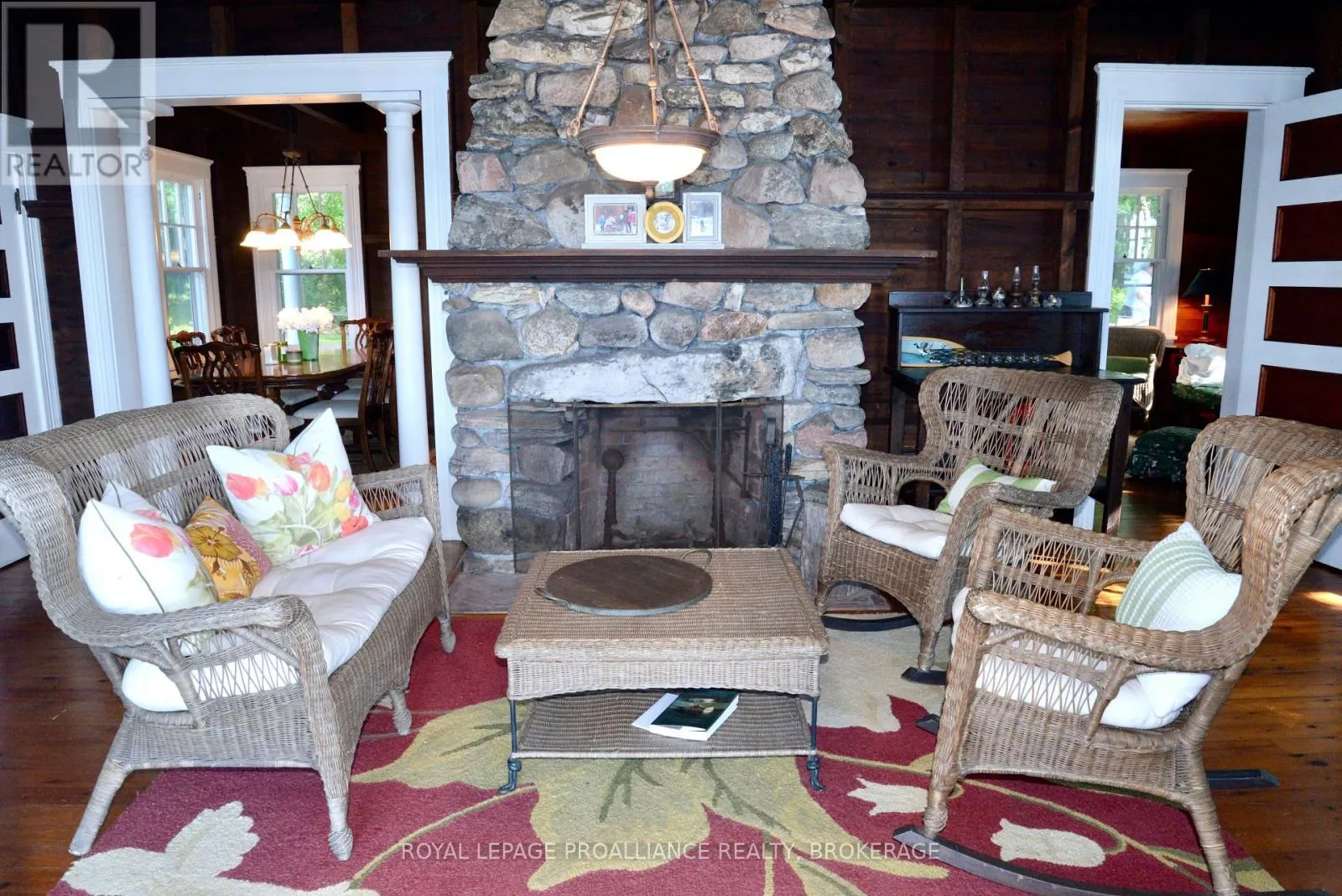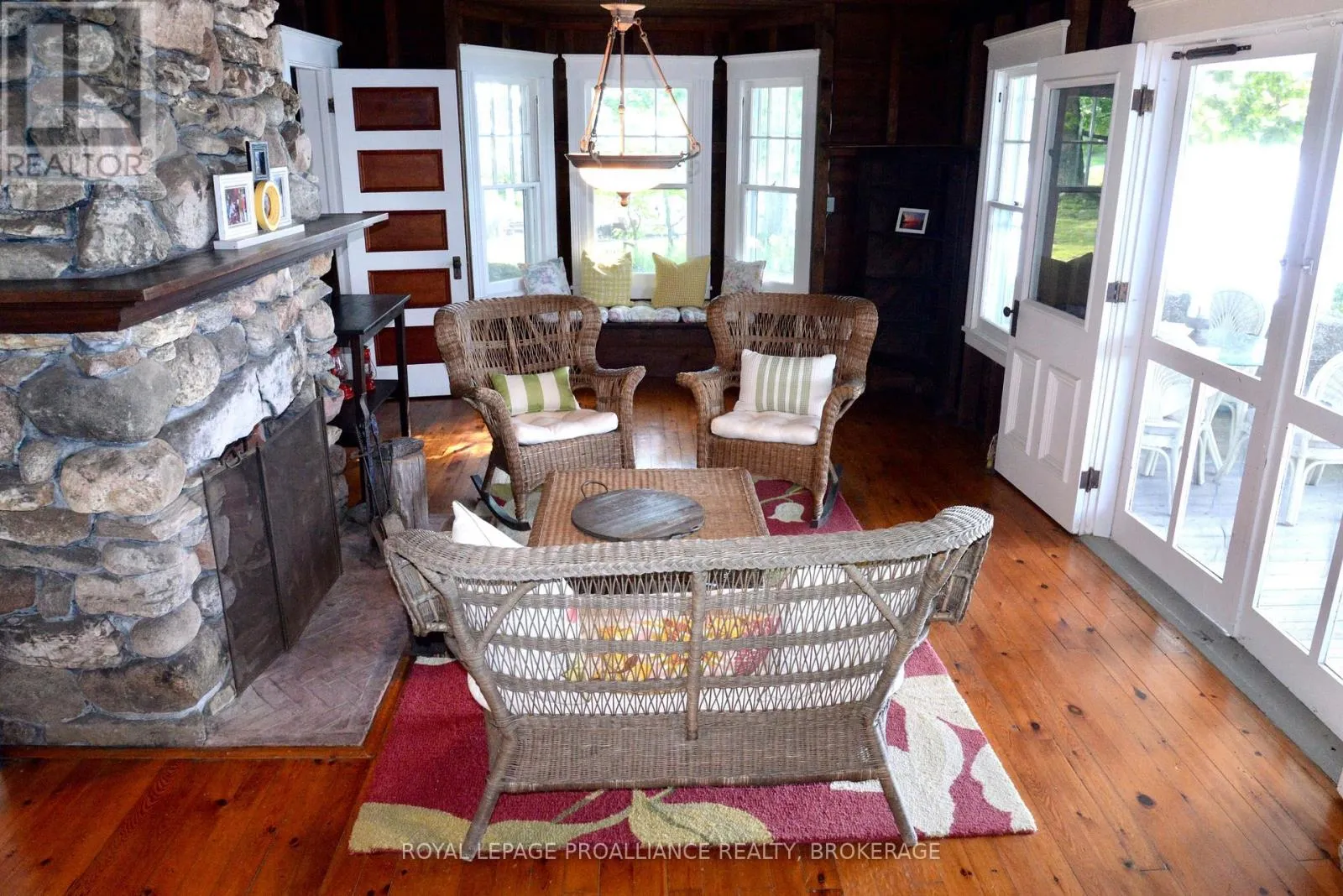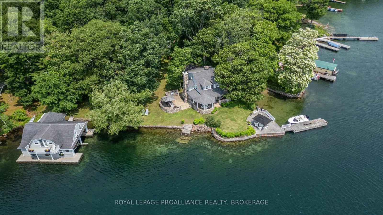 Cross Streets: Main & Water Streets. ** Directions: South from Gananoque Marina to 121 Tremont Island. Experience the perfect blend of historic charm and relaxed waterfront living at this beautifully maintained 1903 summer home on picturesque Tremont Park Island, just minutes from Gananoque Marina. Set on over 200 feet of pristine shoreline, this classic summer home offers multiple spaces to unwind and entertain. Begin your day lounging on the waterside deck, then move to the beautiful covered porch with views of children playing on your private beach. Whether you're soaking up the sun or enjoying the shade, this property offers a peaceful escape in every direction. Inside, the home exudes character starting with a grand stone fireplace anchoring the living room paired with exposed beams and immaculate pine floors that flow through the formal dining room and den. The recently renovated kitchen is a gathering place featuring granite counters, new appliances, spacious island with built-in stove, double drawer refrigerators, coffee bar, mini pantry, plus easy access to east facing deck. The main floor includes convenient laundry and 2 piece bath while upstairs you'll find 4 spacious bedrooms and 3 piece bath. Step outside to your expansive stone patio and outdoor kitchen equipped with built-in BBQ and wet bar w/chiller tray for keeping drinks cool in summer months. A towering custom-built stone fireplace extends the patio season and creates a perfect setting for unforgettable evenings. Guests feel right at home with additional accommodations w/3 piece bath above the double-slip boathouse, recently reinforced with steel and concrete decks. A charming bunkie and storage shed provide additional versatility. This generational- style retreat is a rare find in one of Canada's most sought-after destinations. Featuring extensive docking and timeless character, this is a unique opportunity to own a true piece of paradise in the heart of the Thousand Islands.There are no restrictions preventing non-Canadians from buying this property. (id:27476)