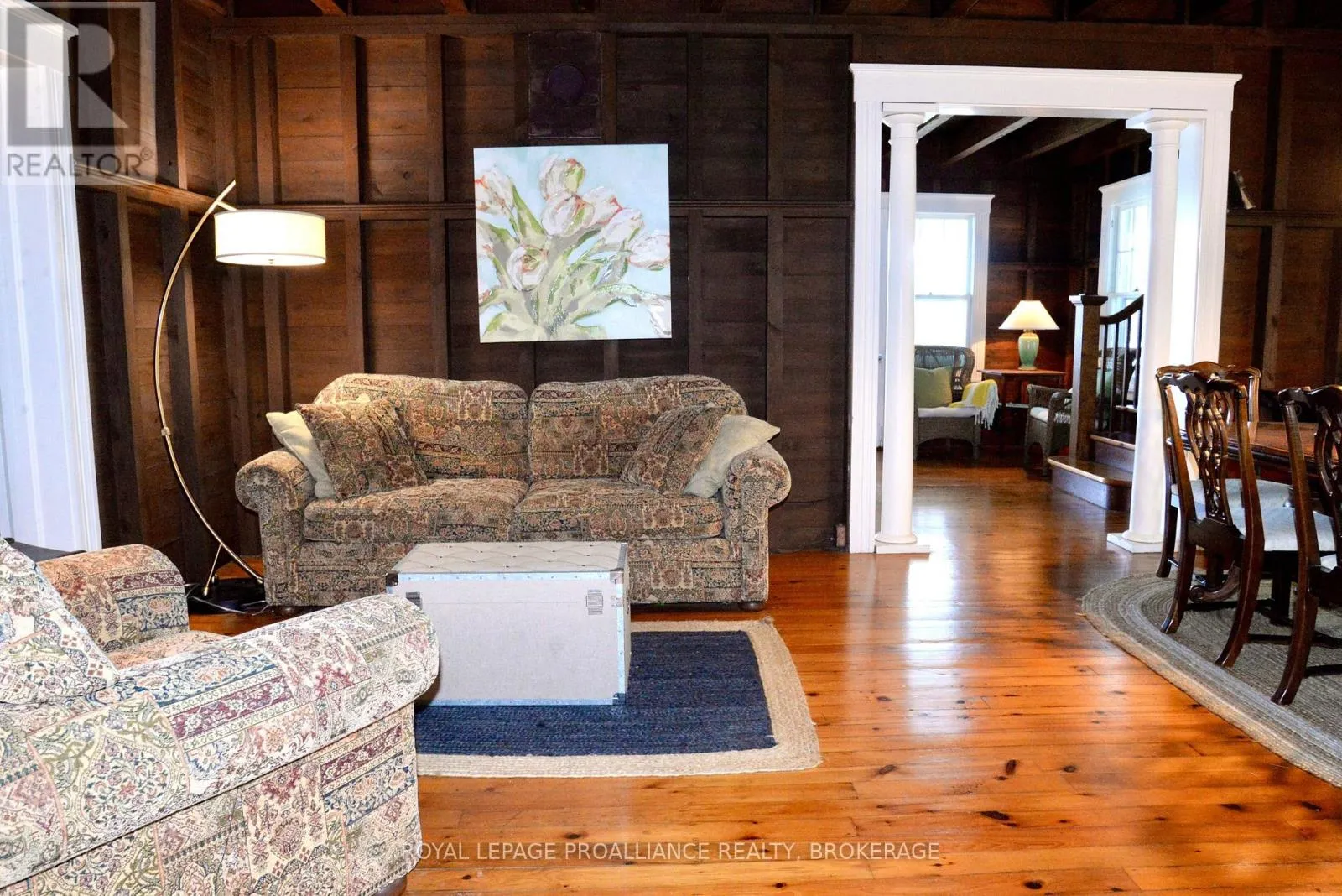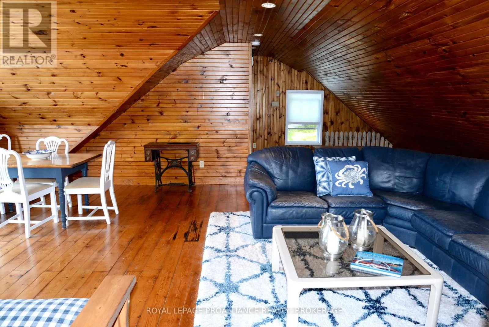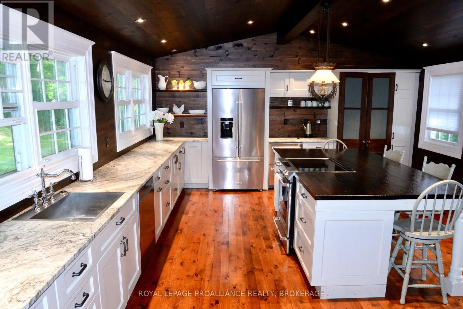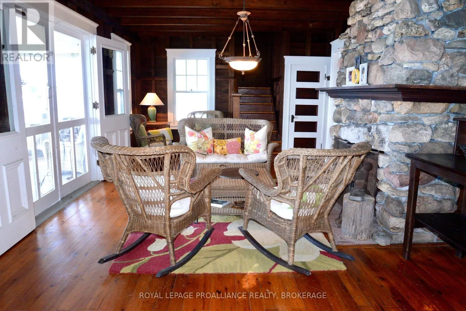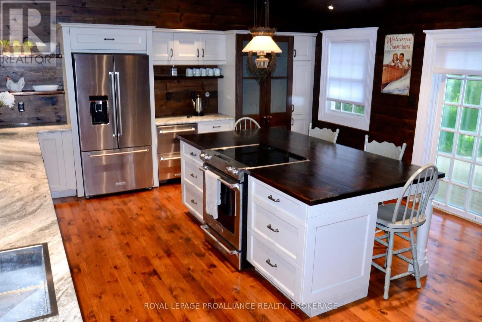 Cross Streets: Main & Water Streets. ** Directions: South from Gananoque Marina to 121 Tremont Island. Experience the perfect blend of historic charm and relaxed waterfront living at this beautifully maintained 1903 summer home on picturesque Tremont Park Island, just minutes from Gananoque Marina. Set on over 200 feet of pristine shoreline, this classic summer home offers multiple spaces to unwind and entertain. Begin your day lounging on the waterside deck, then move to the beautiful covered porch with views of children playing on your private beach. Whether you're soaking up the sun or enjoying the shade, this property offers a peaceful escape in every direction. Inside, the home exudes character starting with a grand stone fireplace anchoring the living room paired with exposed beams and immaculate pine floors that flow through the formal dining room and den. The recently renovated kitchen is a gathering place featuring granite counters, new appliances, spacious island with built-in stove, double drawer refrigerators, coffee bar, mini pantry, plus easy access to east facing deck. The main floor includes convenient laundry and 2 piece bath while upstairs you'll find 4 spacious bedrooms and 3 piece bath. Step outside to your expansive stone patio and outdoor kitchen equipped with built-in BBQ and wet bar w/chiller tray for keeping drinks cool in summer months. A towering custom-built stone fireplace extends the patio season and creates a perfect setting for unforgettable evenings. Guests feel right at home with additional accommodations w/3 piece bath above the double-slip boathouse, recently reinforced with steel and concrete decks. A charming bunkie and storage shed provide additional versatility. This generational- style retreat is a rare find in one of Canada's most sought-after destinations. Featuring extensive docking and timeless character, this is a unique opportunity to own a true piece of paradise in the heart of the Thousand Islands.There are no restrictions preventing non-Canadians from buying this property. (id:27476)
