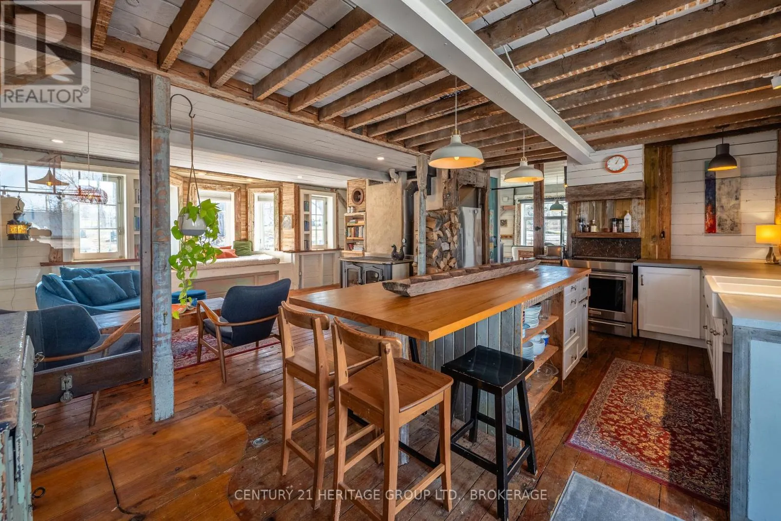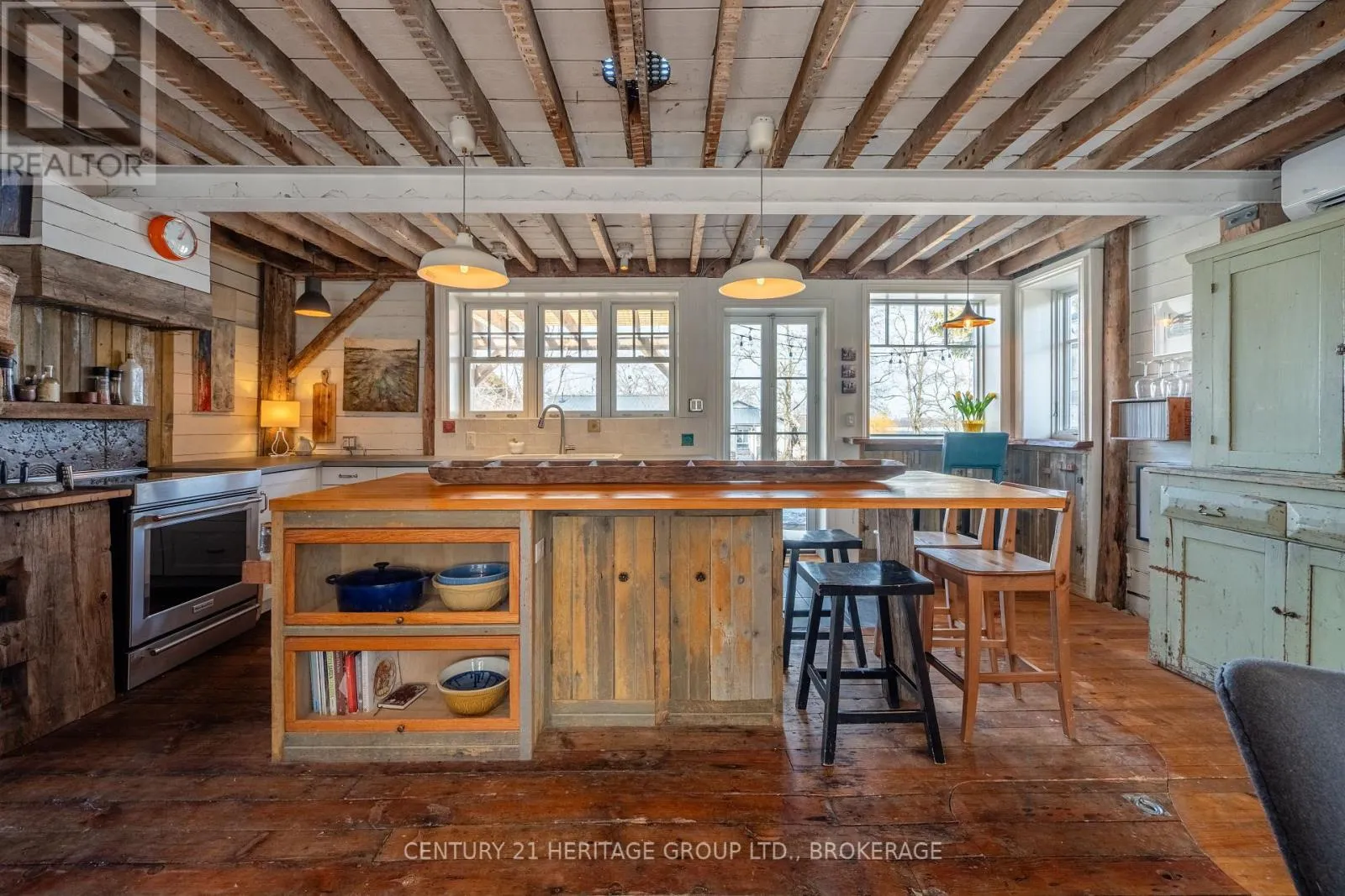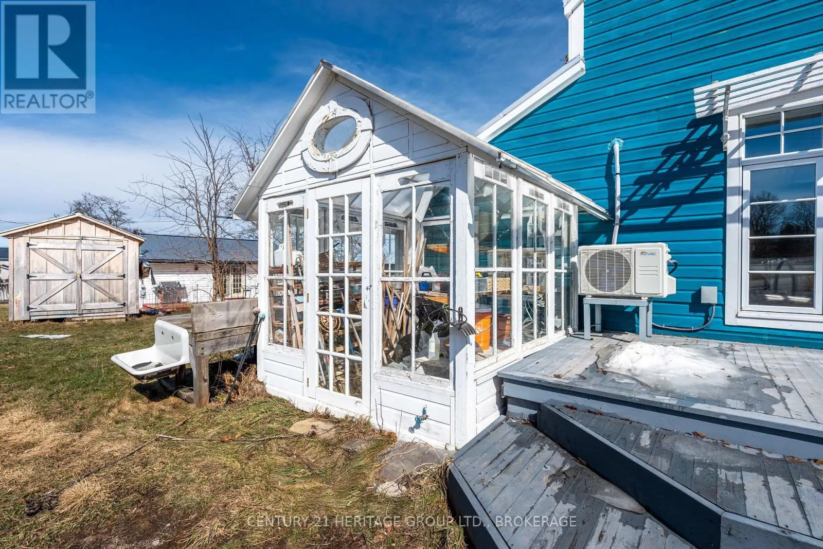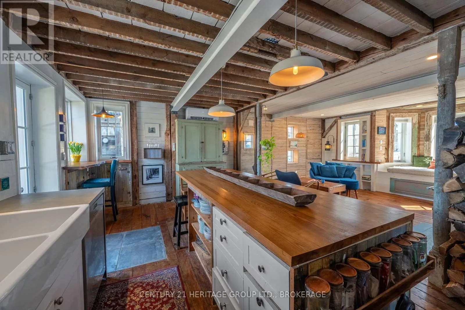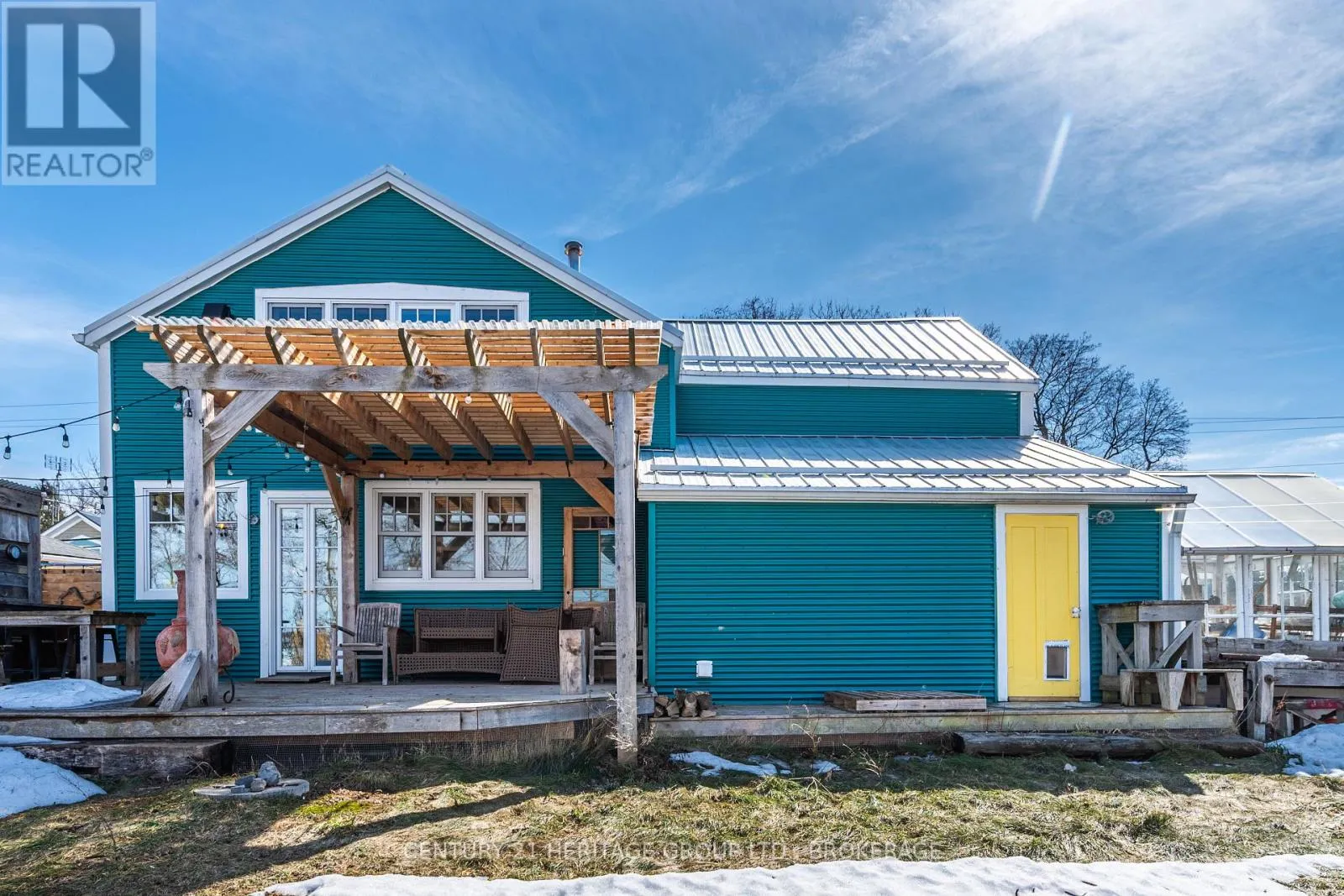 Cross Streets: Wolfe Island 95. ** Directions: Turn right off ferry onto Main St. The Unhurried House is a deeply sustainable 1745 sq. ft. Wolfe Island farmhouse, now at the back end of a meticulous six-year transformation. Used by Retrofit Canada as a case study, original and new materials have been blended in a remarkable and meticulous net-zero-ready, passive standard rebuild. The result lands like a salt-fresh oceanfront cottage married to a post and beam interior, and demonstrates a rare blend of remarkable patinas, wabi-sabi character and exquisite custom detail. A grand entrance leads to a bright, open-concept living space and a chef's kitchen with a 10-foot island and concrete countertops. Upstairs are two bedrooms (each with sinks), a clawfoot tub in the primary bedroom, a heated-floor bathroom, and a spacious loft that can serve as a third bedroom, studio, or creative space. Built under the direction of an energy engineer, this high performance house has a steely focus on both efficiency and aesthetics, the house features R35 continuous exterior insulation, airtight construction, German-engineered HRV ventilation, a rainwater harvesting system, two 12K low-temperature heat pumps, a 560-lb Italian cast iron cookstove, double-glazed LePage wood windows, brand new septic system, a new 12-foot shore well with endless water, and a 200 AMP panel. Phew! (And that's not even mentioning the hand carved wooden sinks with tiny Portuguese brass taps, or the 150-year-old windows installed in creative places). The property offers expansive Lake Ontario views, wraparound porches, a covered pergola with twinkle lights, a greenhouse and raised beds, flagstone walkways and rock walls, and all of it at the heart of a happening, community-minded island village just two blocks from the free 16 minute ferry to downtown Kingston. (id:27476)