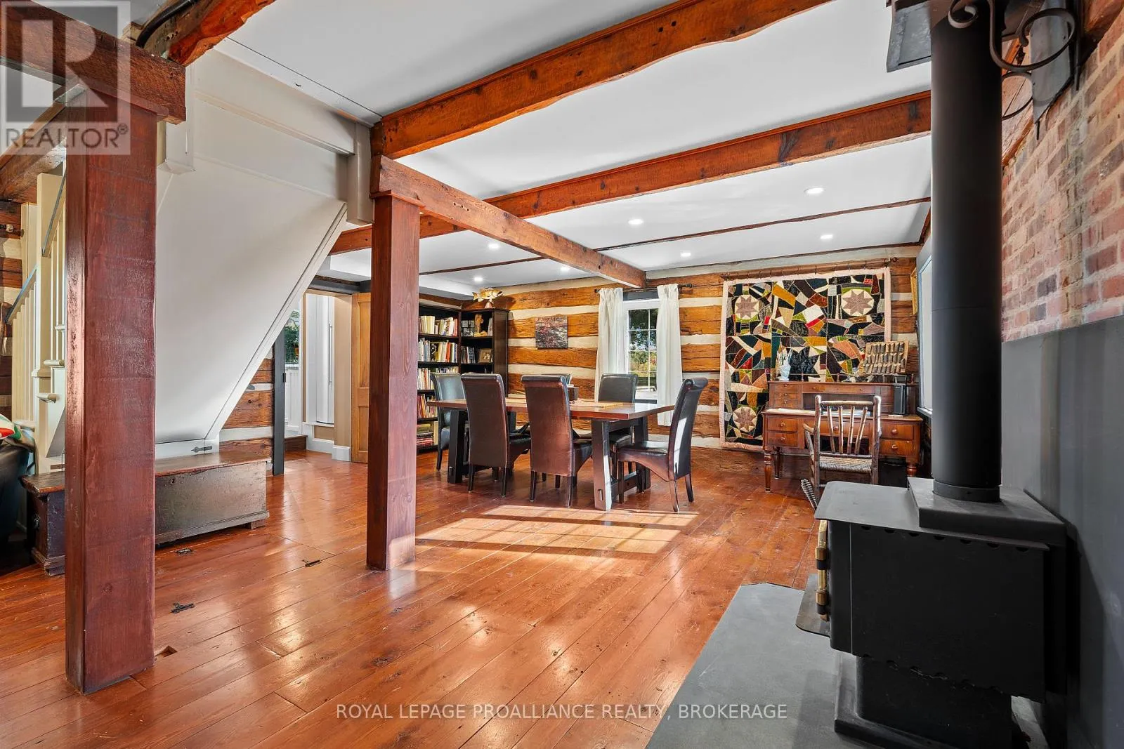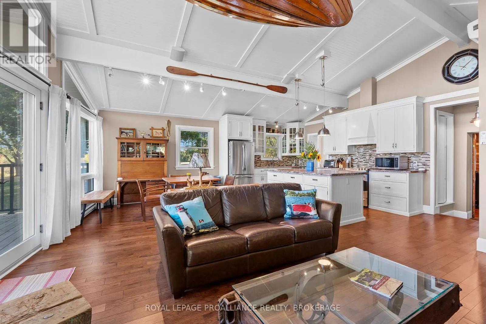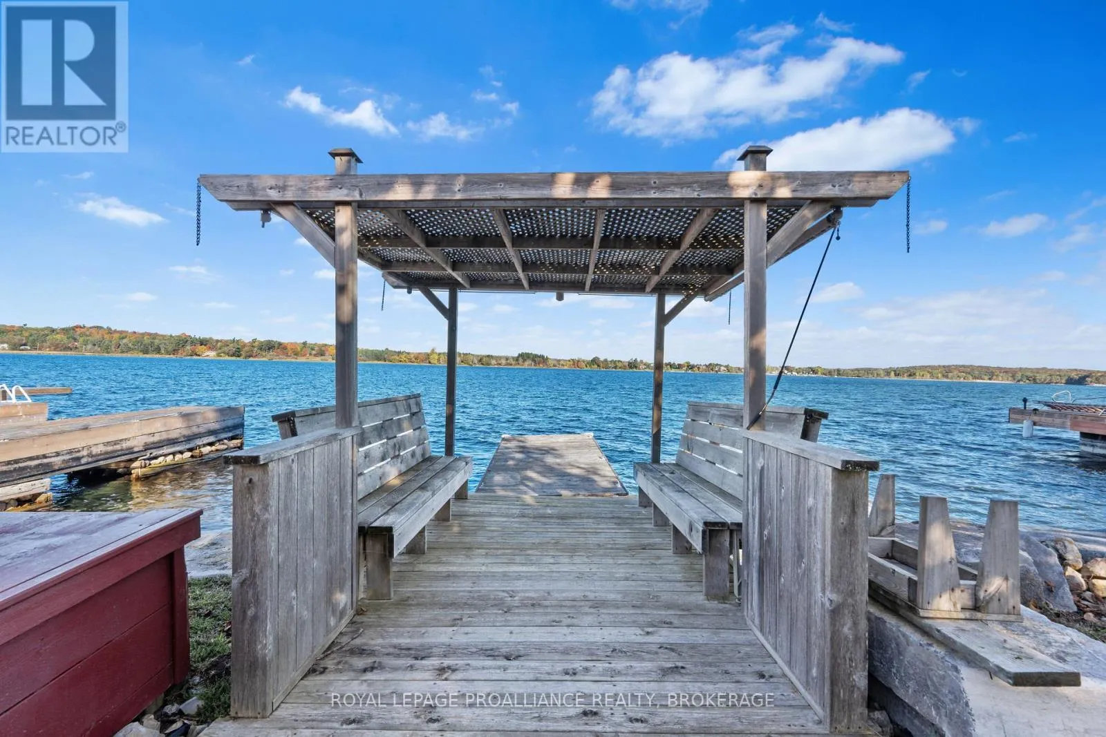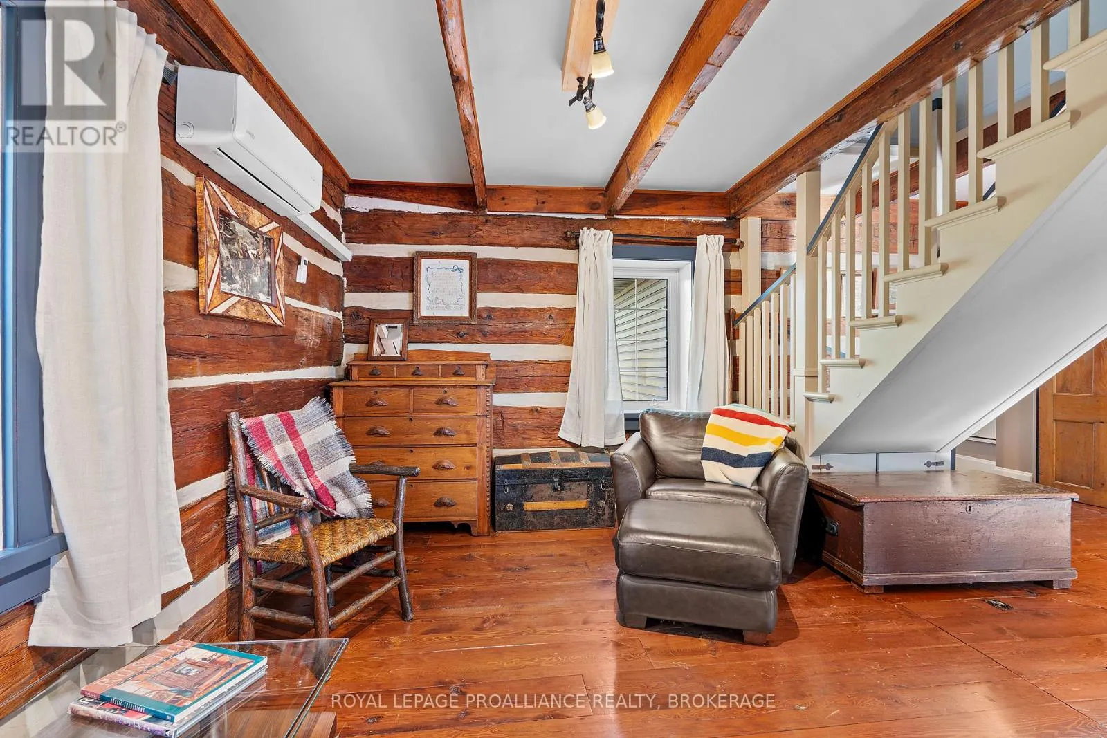 Cross Streets: Howe Island Drive. ** Directions: County Ferry to Howe Island, Straight off Ferry to North Shore Road, Turn Left. Rare offering! St. Lawrence River waterfront with a period home, barn and workshop set on six private acres, all under 900K. One of Howe Island's oldest residences is now offered for sale. This original 19th century hand-hewn square timber log cabin is nestled on 6.48 acres including 48 feet of waterfront on the Bateau Channel of the St. Lawrence River. The expansive grounds include a small pine forest, several early apple trees, limestone outcroppings, lawn areas and fire pit. The original log cabin was dated by the previous owners to be built between1830-1840. In 1972, the foundation was underpinned and a Viceroy addition with full basement was built to take advantage of the view of the river and the grounds. The log cabin hosts a study and dining room on the main floor, and two bedrooms and a new 3-pc bathroom on the upper level. The addition is a fabulous open concept Great Room with vaulted ceiling, custom kitchen and a second 3pc bathroom. The finished basement hosts two more rooms, perhaps a rec room and study, as well as storage room and laundry area. The outbuildings include an expansive barn, driveshed, insulated workshop and bunkie, all with hydro. The waterfront features a floating dock suitable for two boats, and a limestone retaining wall. This piece of paradise has something for everyone, a place to host memorable family events and fabulous river days, yet also a tranquil place of retreat from a busy world, now seeking a new family to continue its history. Out-buildings: Barn (hydro), 10' x 10' bunkie, workshop (hydro, insulated), driveshed(hydro).Waterfront: floating dock, dock pergola, limestone retaining wall. Suitable for docking 24' boat. (id:27476)