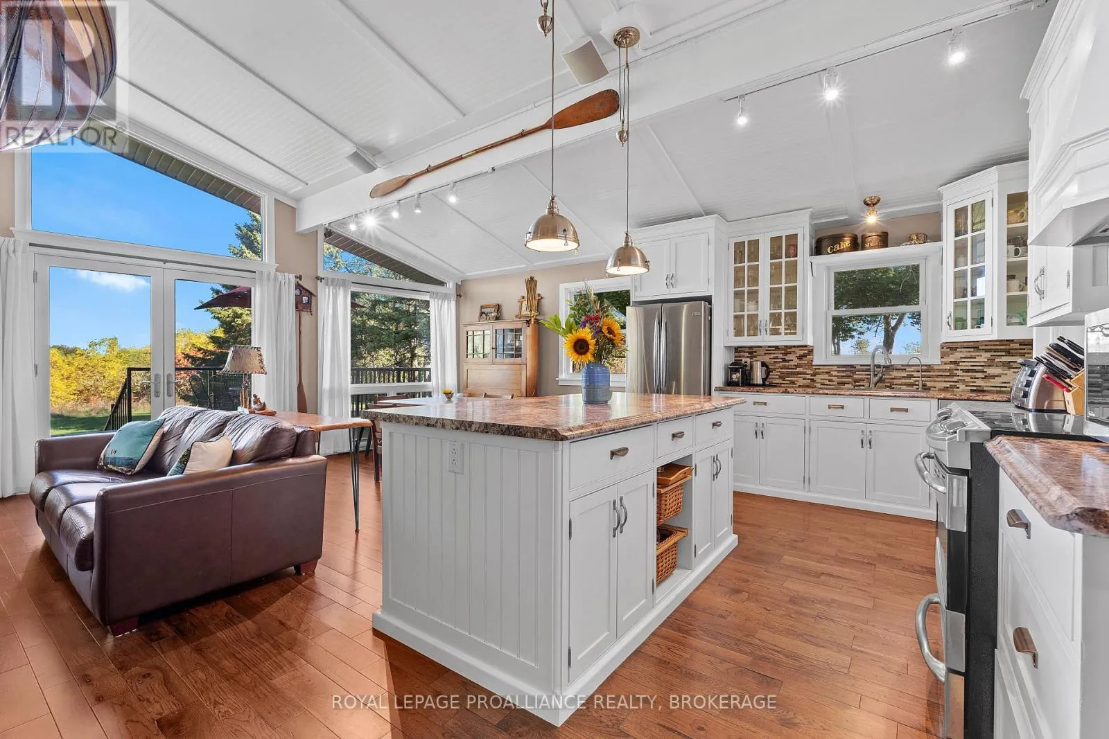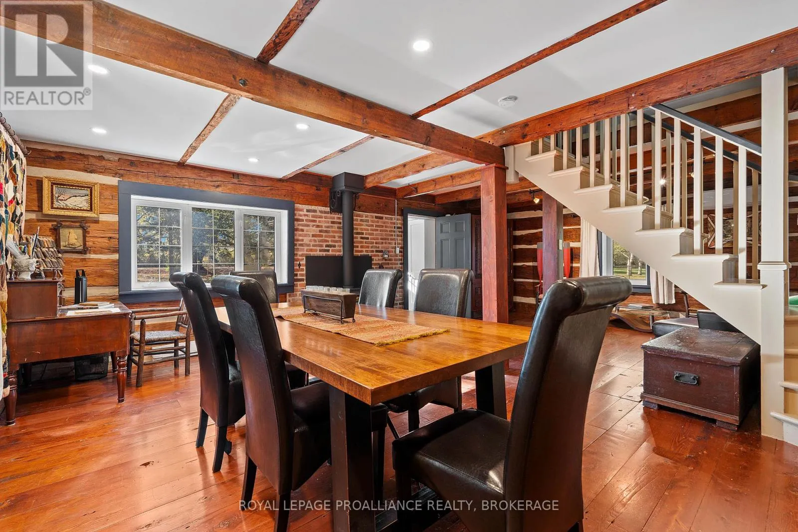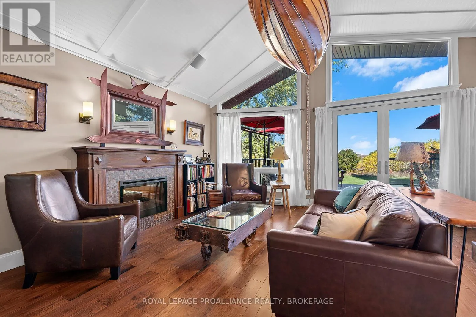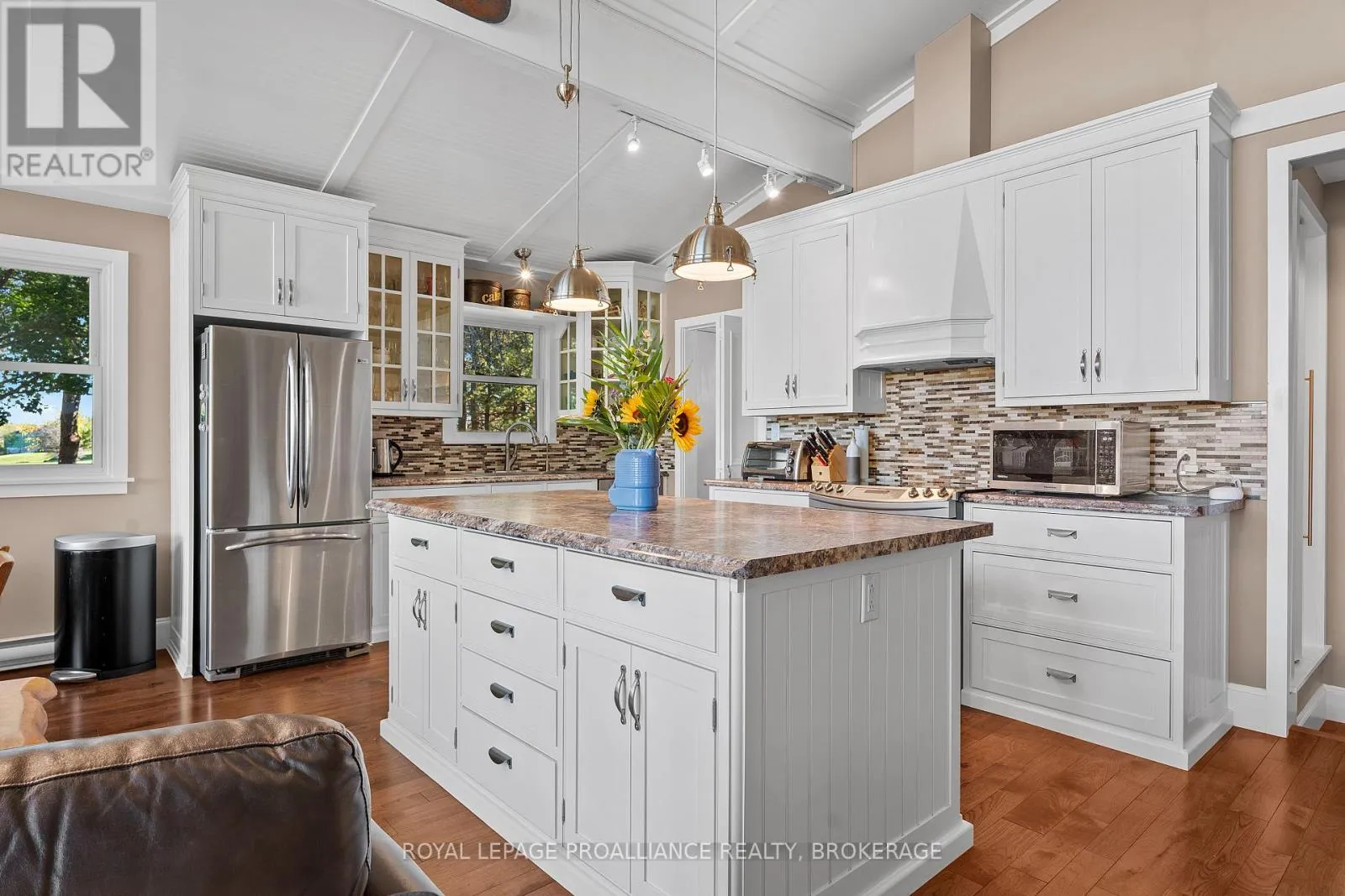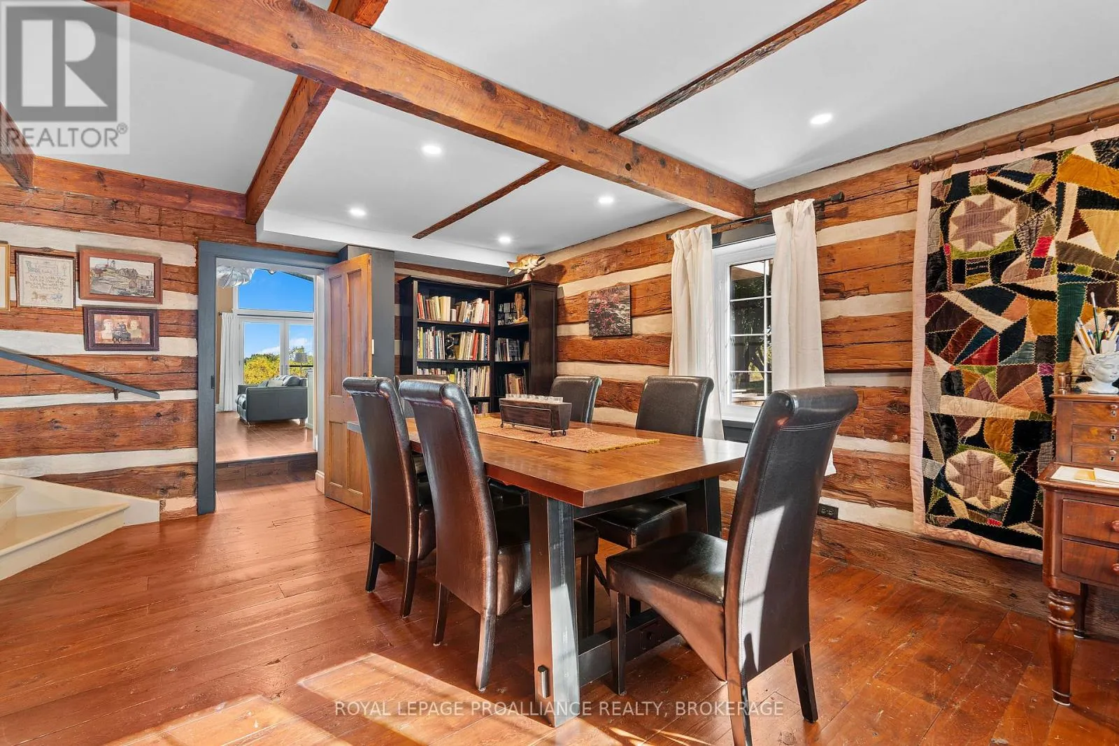 Cross Streets: Howe Island Drive. ** Directions: County Ferry to Howe Island, Straight off Ferry to North Shore Road, Turn Left. Rare offering! St. Lawrence River waterfront with a period home, barn and workshop set on six private acres, all under 900K. One of Howe Island's oldest residences is now offered for sale. This original 19th century hand-hewn square timber log cabin is nestled on 6.48 acres including 48 feet of waterfront on the Bateau Channel of the St. Lawrence River. The expansive grounds include a small pine forest, several early apple trees, limestone outcroppings, lawn areas and fire pit. The original log cabin was dated by the previous owners to be built between1830-1840. In 1972, the foundation was underpinned and a Viceroy addition with full basement was built to take advantage of the view of the river and the grounds. The log cabin hosts a study and dining room on the main floor, and two bedrooms and a new 3-pc bathroom on the upper level. The addition is a fabulous open concept Great Room with vaulted ceiling, custom kitchen and a second 3pc bathroom. The finished basement hosts two more rooms, perhaps a rec room and study, as well as storage room and laundry area. The outbuildings include an expansive barn, driveshed, insulated workshop and bunkie, all with hydro. The waterfront features a floating dock suitable for two boats, and a limestone retaining wall. This piece of paradise has something for everyone, a place to host memorable family events and fabulous river days, yet also a tranquil place of retreat from a busy world, now seeking a new family to continue its history. Out-buildings: Barn (hydro), 10' x 10' bunkie, workshop (hydro, insulated), driveshed(hydro).Waterfront: floating dock, dock pergola, limestone retaining wall. Suitable for docking 24' boat. (id:27476)