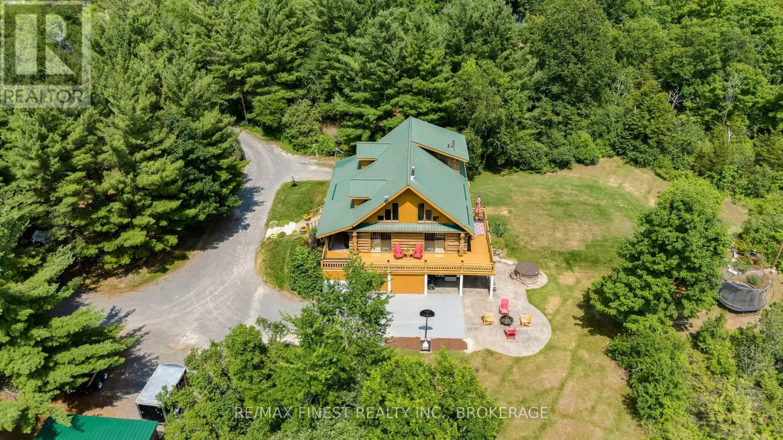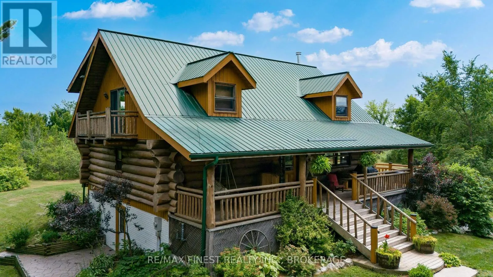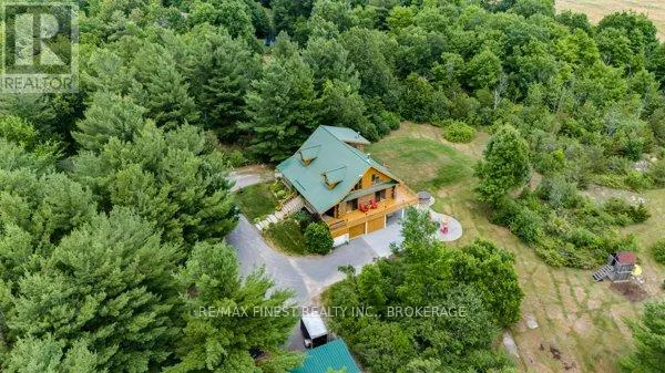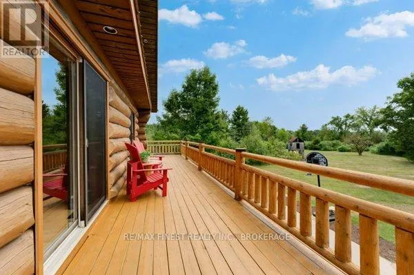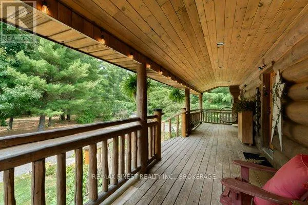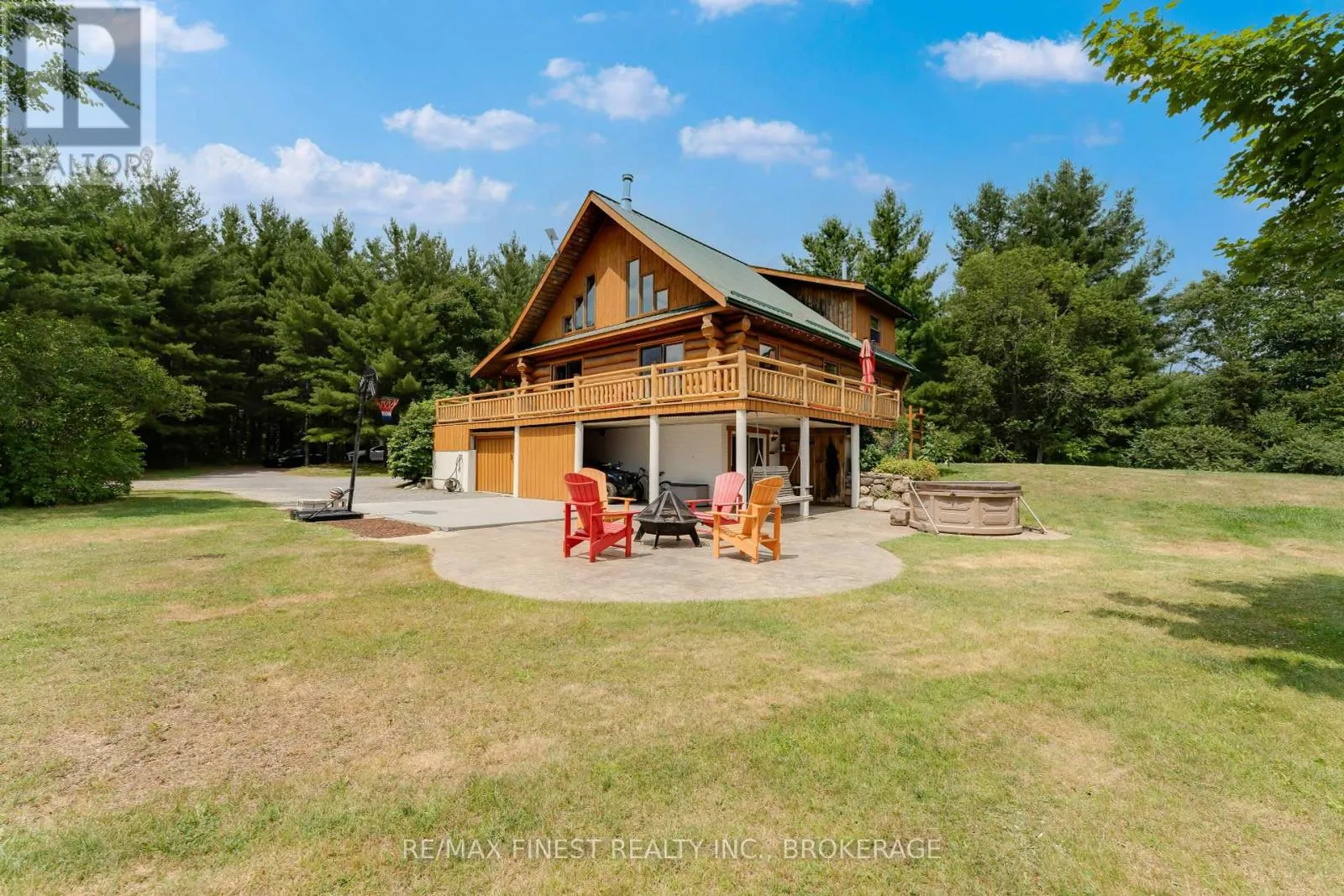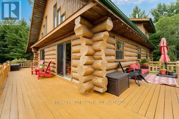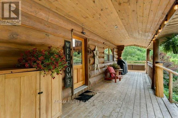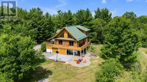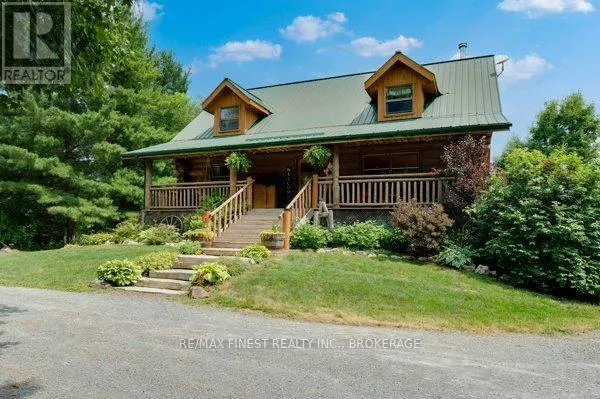 Cross Streets: Wallace and Camden-Portland Boundary Road. ** Directions: North on Highway 38. Left on Yarker Rd, Right on Camden-Portland Boundary Rd, Right on Wallace Rd. Nestled amongst mature trees on a quiet country road just 20 minutes to town, this stunning BC Fir Log home situated on a tranquil and private 4 acres is sure to impress. The home cannot bee seen from the road and features a turn around driveway lined by lilacs ideal for a trailer, boat, etc. with access to drive shed ideal for storing your toys. As you pull up to the front entrance you are immediately greeted by a large welcoming front porch spanning the entire front of the home ideal for morning coffees or unwinding after a long day at work. Once done enjoying the beautiful setting, as you head into the home you will appreciate the amazing wood work and log details spanning two storeys providing a warm open feeling easily integrating your Kitchen, dining, and living areas punctuated by a centrally located fireplace. Natural light floods the home in abundance, gracing the living area, country kitchen with island and spacious dining ideal for entertaining and family gatherings. The main floor also features two good sized bedrooms as well as a lovely 4 piece bathroom. As you ascend the skillfully crafted wood stairs, you arrive at the landing overlooking the main floor and enter into the large primary bedroom with balcony and 4 piece ensuite. The functionality and appeal of this already impressive home is further compounded by a bright walkout basement withnew carpet and easy access both from the side of the home through your attractive mudroom as well as the backyard leading out to the stamped concrete patio and hot tub overlooking the peaceful grounds . The basement features plenty of storage, a home office, a rec room as well as a family room with the possibility of creating another bedroom or in-law set up. While already impressed, let me leave you with a few additional conveniences; there is a poured pad ready for a garage if desired, the new front entry steps are sure to impress, many windows are newer, chicken ready set-up, and the fireplace is WETT cert! (id:27476)