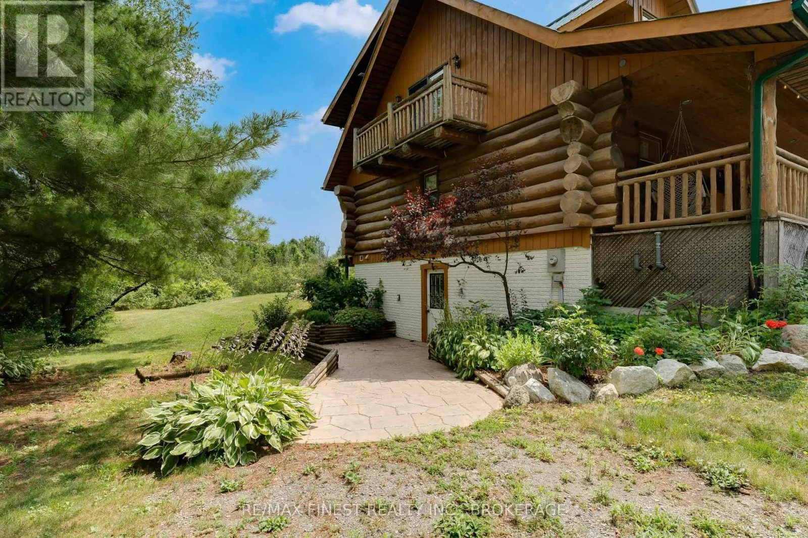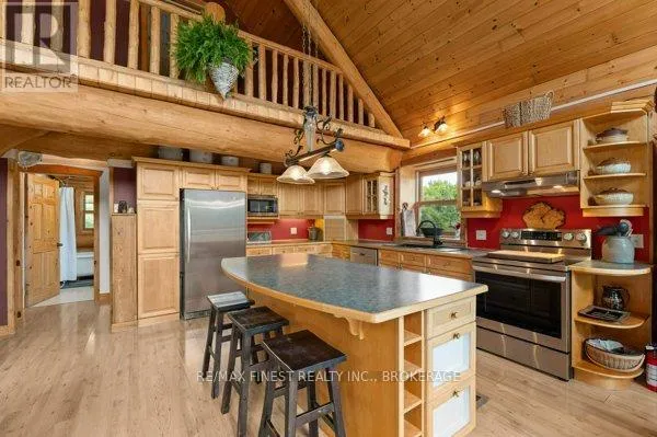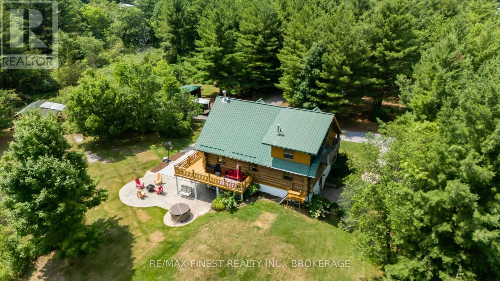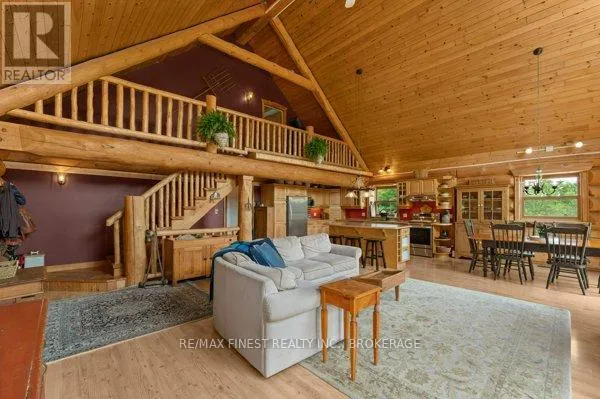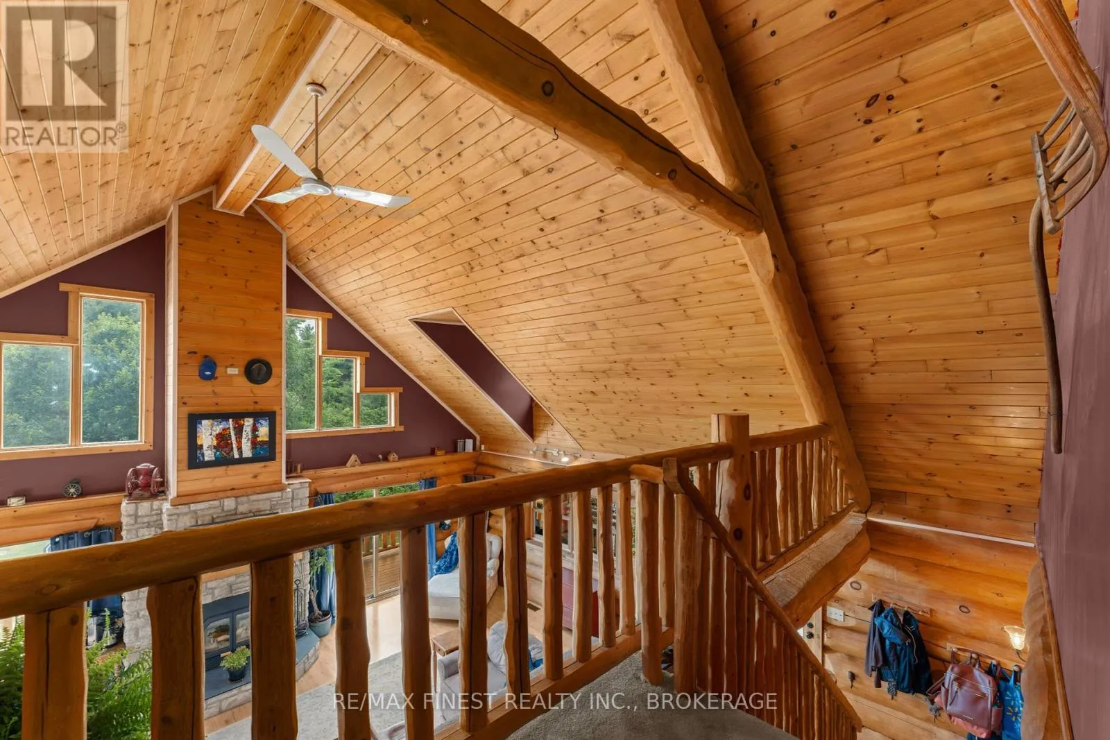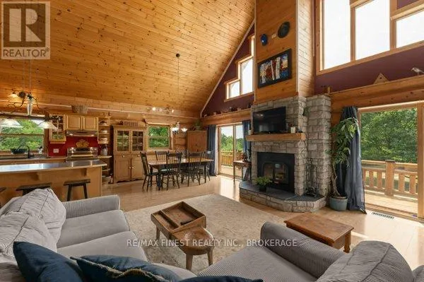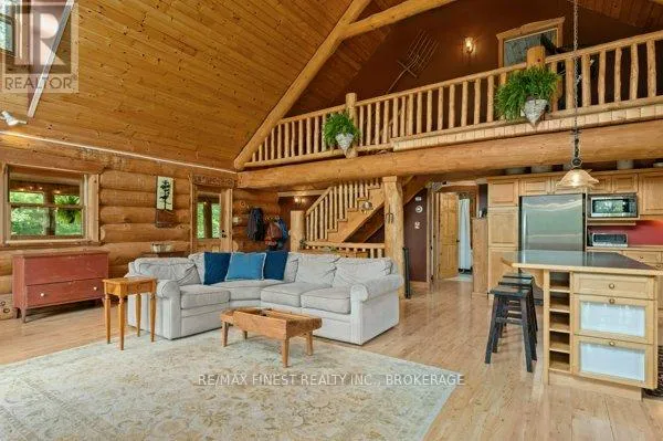 Cross Streets: Wallace and Camden-Portland Boundary Road. ** Directions: North on Highway 38. Left on Yarker Rd, Right on Camden-Portland Boundary Rd, Right on Wallace Rd. Nestled amongst mature trees on a quiet country road just 20 minutes to town, this stunning BC Fir Log home situated on a tranquil and private 4 acres is sure to impress. The home cannot bee seen from the road and features a turn around driveway lined by lilacs ideal for a trailer, boat, etc. with access to drive shed ideal for storing your toys. As you pull up to the front entrance you are immediately greeted by a large welcoming front porch spanning the entire front of the home ideal for morning coffees or unwinding after a long day at work. Once done enjoying the beautiful setting, as you head into the home you will appreciate the amazing wood work and log details spanning two storeys providing a warm open feeling easily integrating your Kitchen, dining, and living areas punctuated by a centrally located fireplace. Natural light floods the home in abundance, gracing the living area, country kitchen with island and spacious dining ideal for entertaining and family gatherings. The main floor also features two good sized bedrooms as well as a lovely 4 piece bathroom. As you ascend the skillfully crafted wood stairs, you arrive at the landing overlooking the main floor and enter into the large primary bedroom with balcony and 4 piece ensuite. The functionality and appeal of this already impressive home is further compounded by a bright walkout basement withnew carpet and easy access both from the side of the home through your attractive mudroom as well as the backyard leading out to the stamped concrete patio and hot tub overlooking the peaceful grounds . The basement features plenty of storage, a home office, a rec room as well as a family room with the possibility of creating another bedroom or in-law set up. While already impressed, let me leave you with a few additional conveniences; there is a poured pad ready for a garage if desired, the new front entry steps are sure to impress, many windows are newer, chicken ready set-up, and the fireplace is WETT cert! (id:27476)