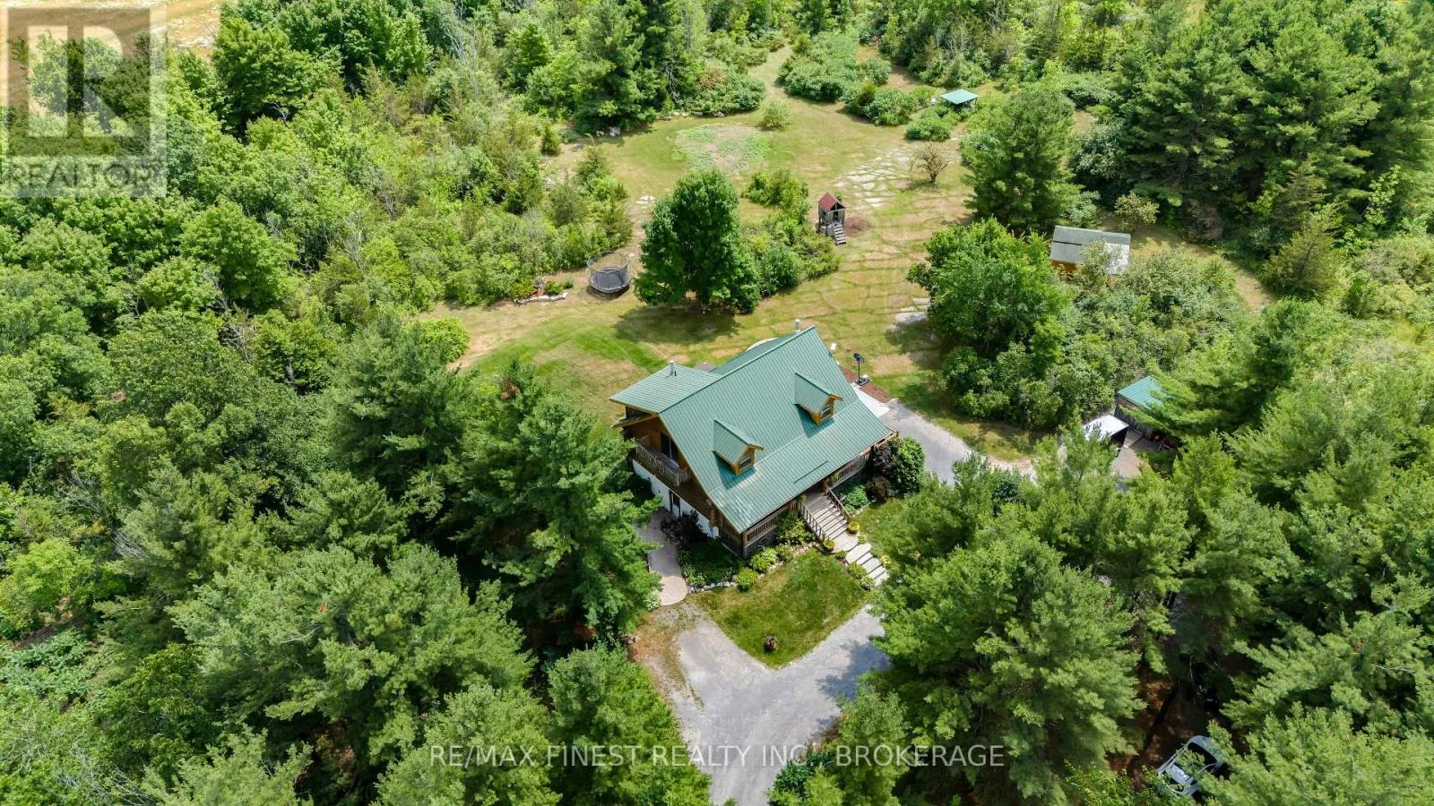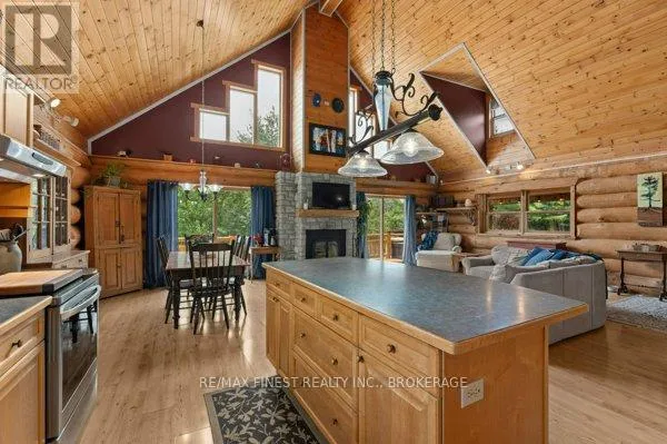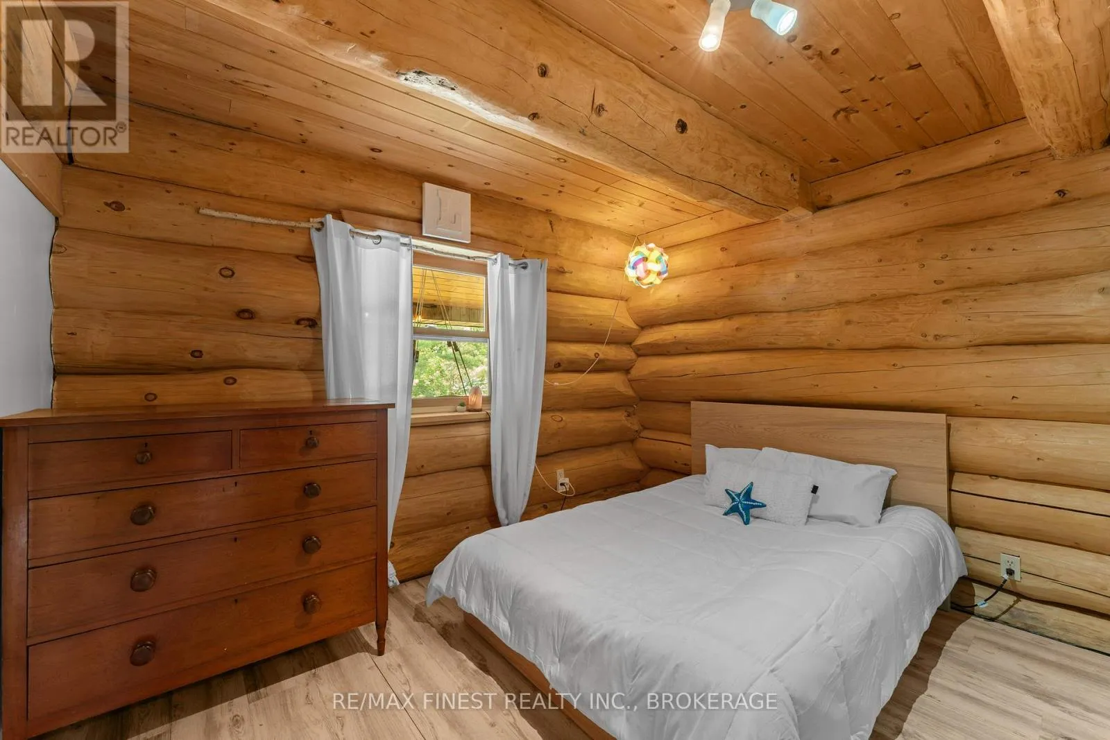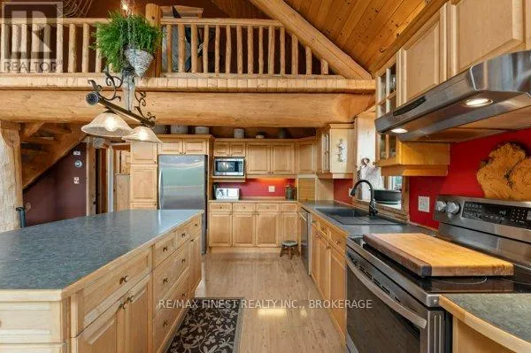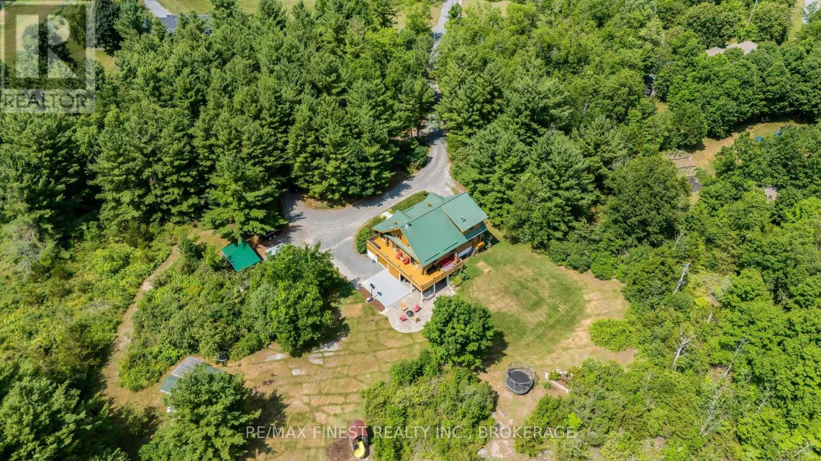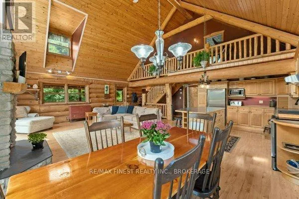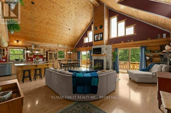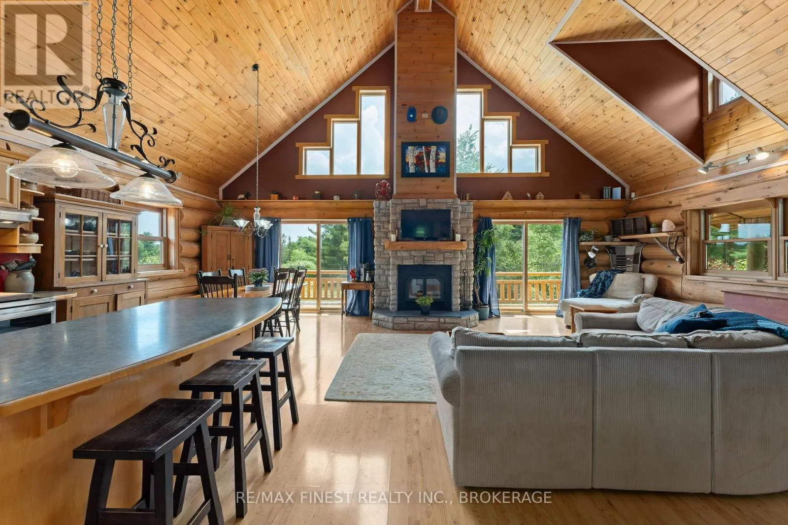 Cross Streets: Wallace and Camden-Portland Boundary Road. ** Directions: North on Highway 38. Left on Yarker Rd, Right on Camden-Portland Boundary Rd, Right on Wallace Rd. Nestled amongst mature trees on a quiet country road just 20 minutes to town, this stunning BC Fir Log home situated on a tranquil and private 4 acres is sure to impress. The home cannot bee seen from the road and features a turn around driveway lined by lilacs ideal for a trailer, boat, etc. with access to drive shed ideal for storing your toys. As you pull up to the front entrance you are immediately greeted by a large welcoming front porch spanning the entire front of the home ideal for morning coffees or unwinding after a long day at work. Once done enjoying the beautiful setting, as you head into the home you will appreciate the amazing wood work and log details spanning two storeys providing a warm open feeling easily integrating your Kitchen, dining, and living areas punctuated by a centrally located fireplace. Natural light floods the home in abundance, gracing the living area, country kitchen with island and spacious dining ideal for entertaining and family gatherings. The main floor also features two good sized bedrooms as well as a lovely 4 piece bathroom. As you ascend the skillfully crafted wood stairs, you arrive at the landing overlooking the main floor and enter into the large primary bedroom with balcony and 4 piece ensuite. The functionality and appeal of this already impressive home is further compounded by a bright walkout basement withnew carpet and easy access both from the side of the home through your attractive mudroom as well as the backyard leading out to the stamped concrete patio and hot tub overlooking the peaceful grounds . The basement features plenty of storage, a home office, a rec room as well as a family room with the possibility of creating another bedroom or in-law set up. While already impressed, let me leave you with a few additional conveniences; there is a poured pad ready for a garage if desired, the new front entry steps are sure to impress, many windows are newer, chicken ready set-up, and the fireplace is WETT cert! (id:27476)