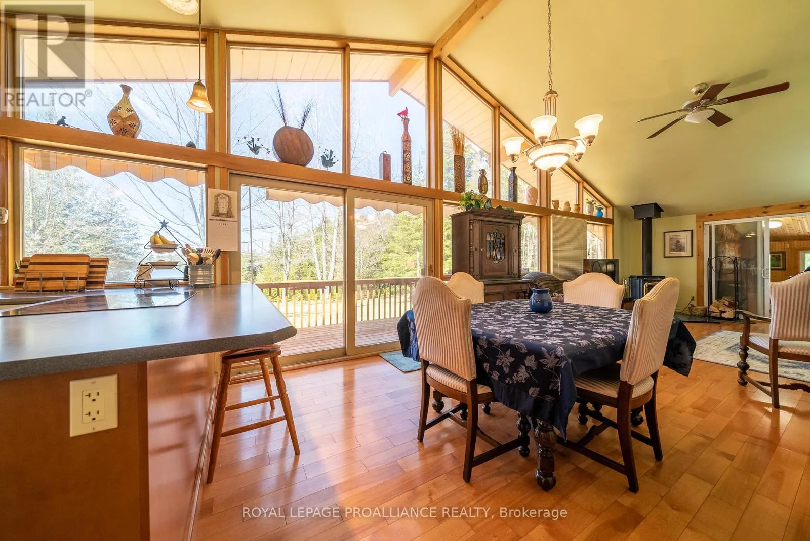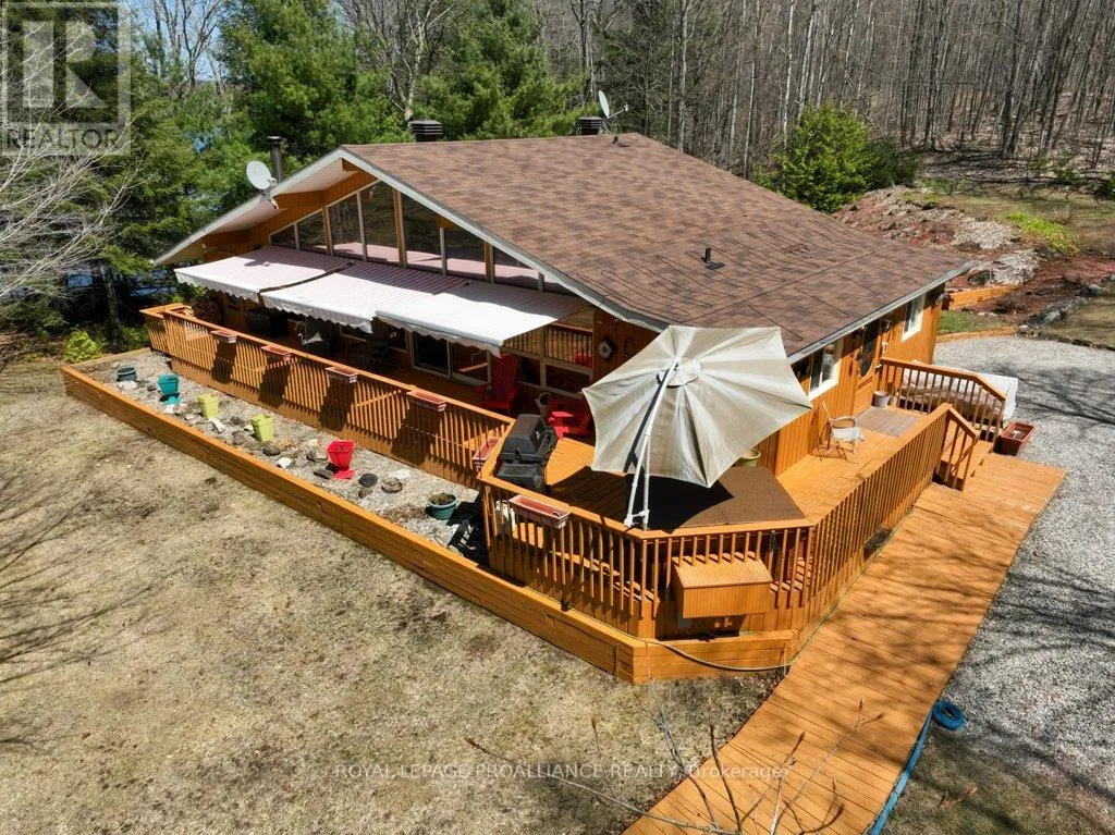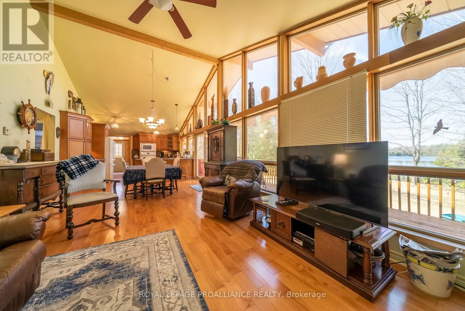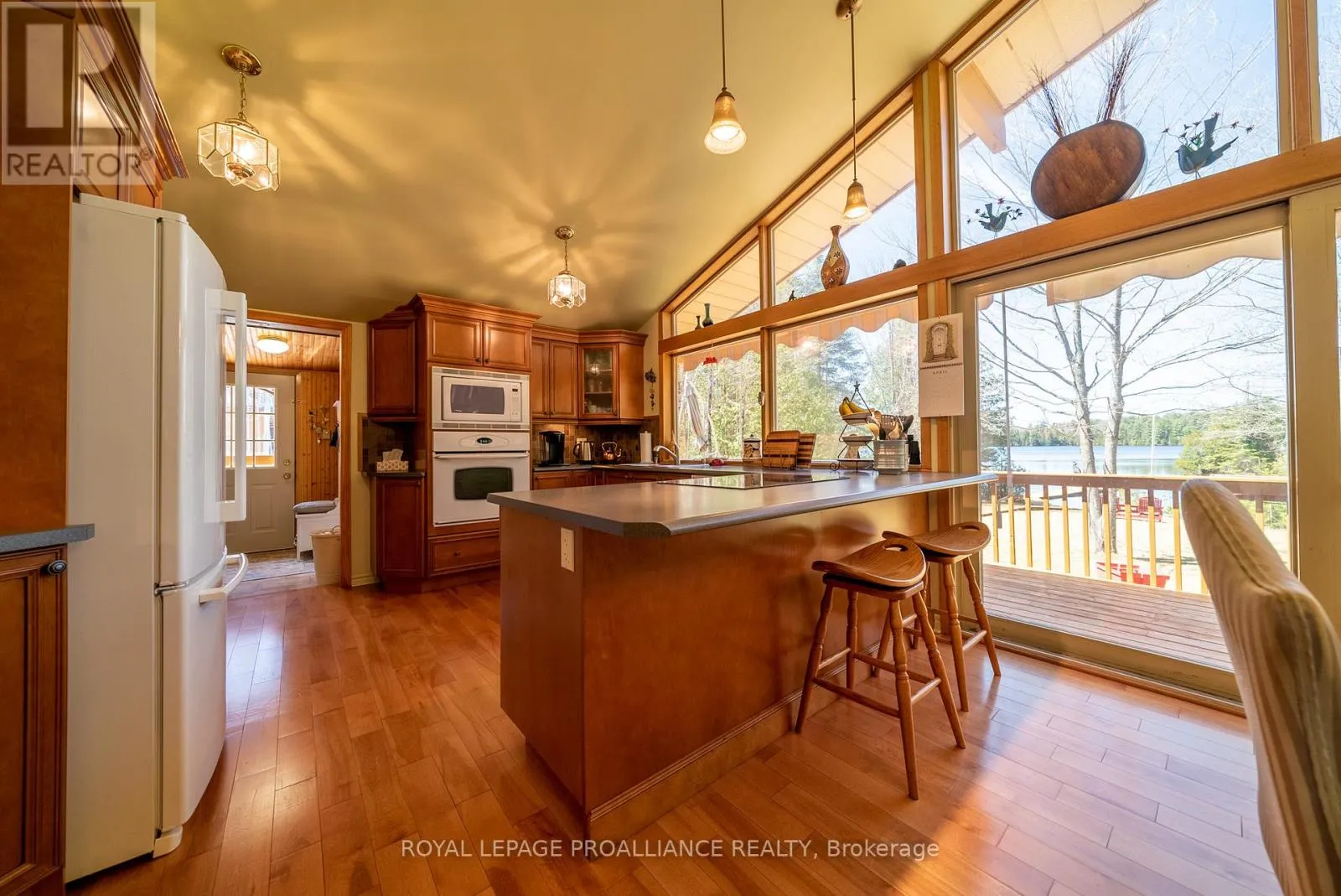 Cross Streets: Ardoch Rd / Smith Rd. ** Directions: Ardoch rd to Smith Rd, Follow Smith Rd to property address. For those seeking a level waterfront with room to play at the shoreline and walk in waterfront - this home will not disappoint. This property is situated amidst towering pines and beautiful hardwood trees in a pristine setting. Experience the privacy that over 330 ft of level shoreline provides with over 2 acres of land that you will call your own. Wrapping around its own small point, the shoreline provides excellent swimming in a sheltered private bay area that opens up to beautiful Kashwakamak . This highly sought after lake is unique, with its numerous bays and inlets offering a variety of areas to explore. With an overall length of approximately 17 km it is an integral part of the Mississippi paddling route. Crown Land occupies much of the shoreline, resulting in less density allowing you to experience all types of boating, fishing and swimming with congestion and at your own pace.. On shore this well maintained home features vaulted ceilings, making it open and airy and the open concept kitchen and family room provide clear views of the waterfront and surrounding topography. Buyers will appreciate the comfortable bedrooms, additional sleeping areas and main floor laundry, making it pleasurable for families and friends. A broad deck with retractable awnings offers a comfortable vantage point to enjoy the summer breeze. The region is also home to the dark sky preserve which promotes a dazzling array of stars, ready to enjoy while relaxing in the hot tub or gathered around the firepit. Convenient outbuildings include a large storage shed which also acts as a garage, a workshop for all of your tools and accessories and additional covered storage. Welcome to the Land O Lakes and all that it has to offer. Only 3 hours from the GTA and less than 2 hours away from Ottawa and Kingston (id:27476)