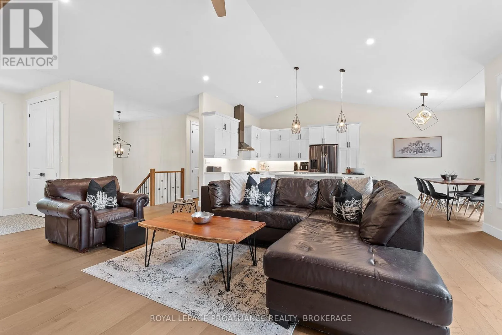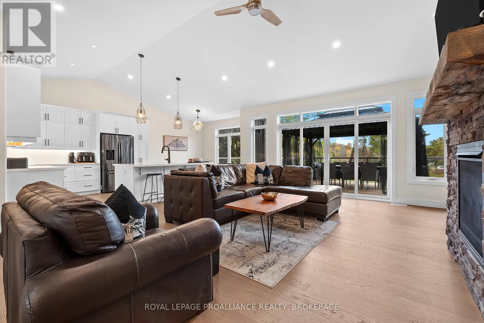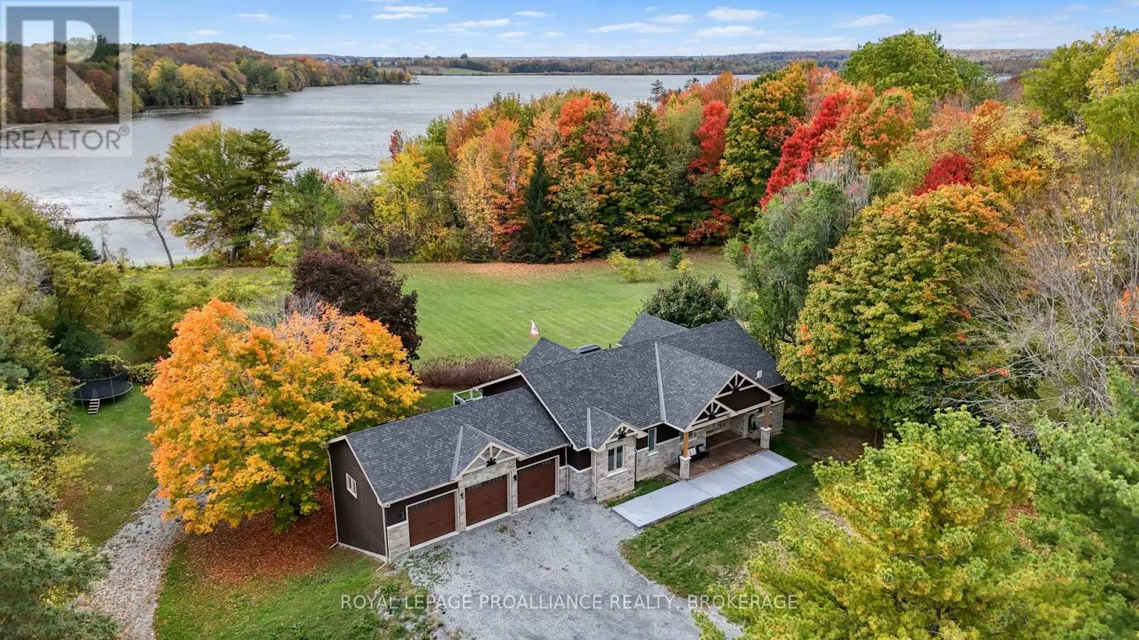 Cross Streets: Highway 15/Sunbury Rd. ** Directions: Highway 15 to Sunbury Road. Discover lakeside living at its best with this stunning custom-built bungalow, offering over 2,000 sq. ft. of main floor living space and nearly 60' of shoreline on Dog Lake. Crafted with both quality and comfort in mind, this home features an ICF foundation, soaring 10' ceilings, a vast partially finished walk-out lower level, and engineered hardwood & tile flooring throughout. The open concept impresses, with the bright kitchen featuring quartz countertops, premium cabinetry and large separate dining area open to the spacious living room - highlighted by a gas fireplace and 12-foot patio doors leading to a 650 sq. ft. deck with glass and aluminum railings providing breathtaking panoramic views of the area. The primary suite is tucked away at one end of the home offering privacy, and finished with cove ceilings and a spa inspired 5-piece ensuite with glass-enclosed shower and soaker tub. Two other bedrooms and a full bath are also here on the main level. The walk-out lower level provides extra flex space and finds in-floor heating roughed-in, and the attached SIX-car garage with epoxy flooring is incredible. This one is a beauty - with wonderful curb appeal from the stamped concrete front porch all the way around the yard space right to the waterfront with a new floating dock. Packed with upgrades and with high end finishes throughout, this one should not be missed. Survey, floor plans and supporting documents are available upon request. (id:27476)