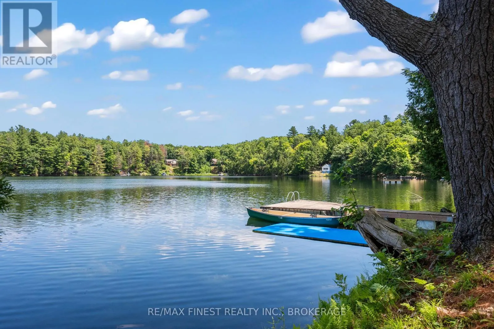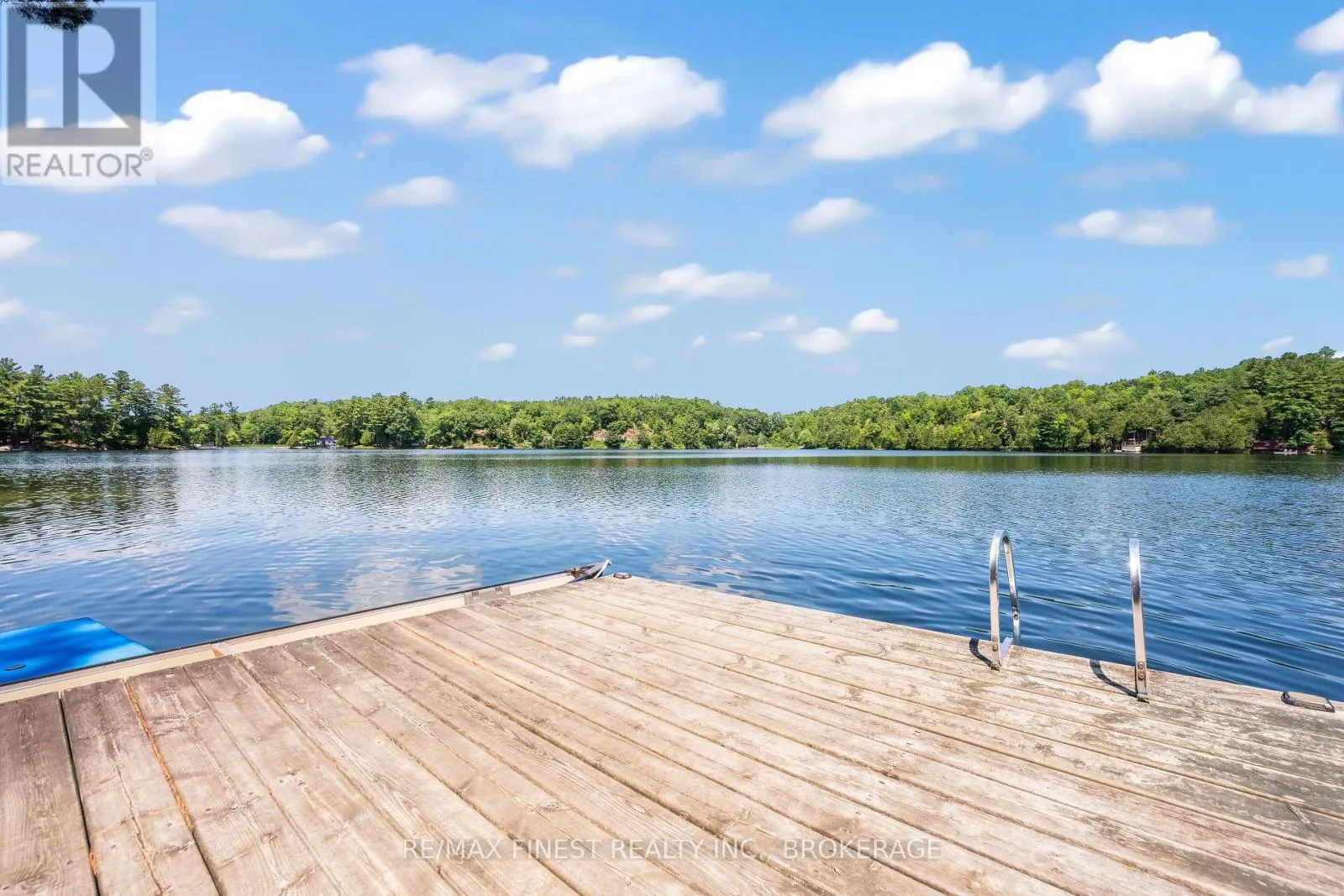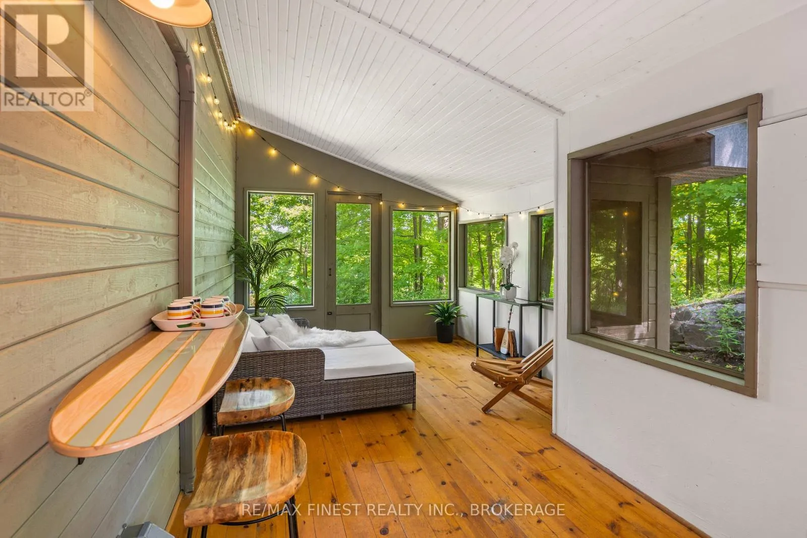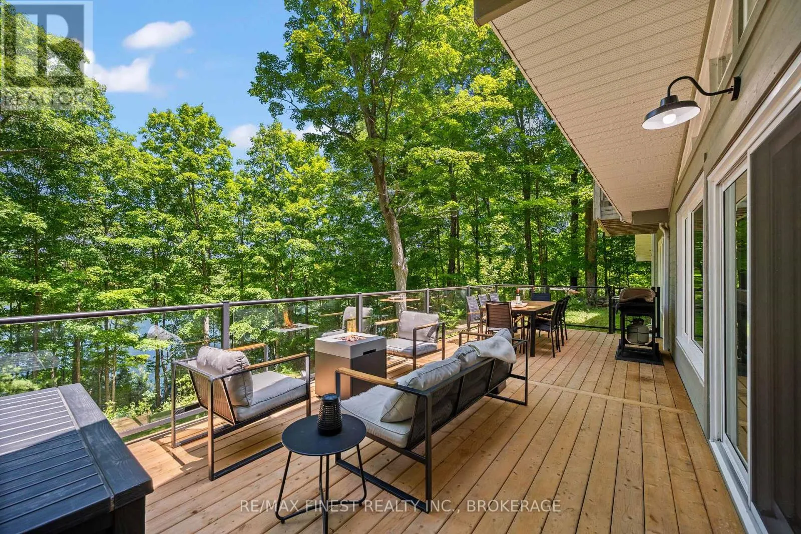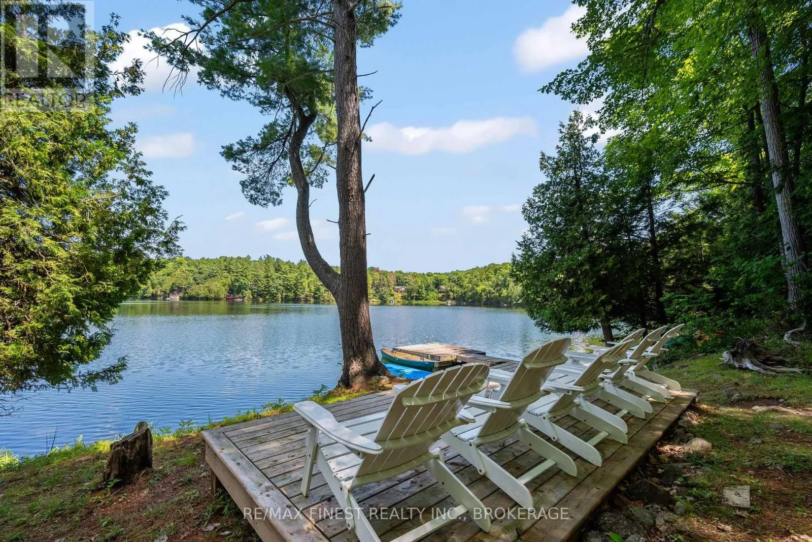 Cross Streets: Deyos Rd. ** Directions: Hwy 38,to Desert Lake Rd, to Deyos Rd.to OakwoodLane. This 1890 sq ft custom-built, year-round 5-bedroom, 2-bath home on the pristine shores of Thirteen Islands Lake. Tucked into over 1.4 acres of private, wooded land, this peaceful retreat offers clean waterfront, gorgeous views, excellent drive up access and a nearby boat launch. Inside, you'll find a bright, open-concept layout featuring cathedral ceilings, a cozy wood stove, and wall-to-wall windows overlooking the trees and water. The kitchen and dining area open onto a brand new 30-ft deck (2024), perfect for entertaining. The main floor includes three bedrooms, a 4-piece bath, and an updated screened-in sunroom (2021). Upstairs, the private primary suite features a 3-piece ensuite, walk-in closet, and its own balcony with stunning lake views. A second upstairs bedroom doubles as an office or guest space. Major updates include: ductless heat pump/AC (2025), new waterfront deck (2021), water pressure tank(2025), septic bed emptied (2024), and brand new fridge, washer/dryer, and propane fire pit. This turn-key home is being sold fully furnished with all water toys (kayak, canoe ,paddleboard, 12-ft aluminum boat with motor) and property maintenance tools included. Proven short-term rental income of $50k + from July to September, with potential for year-round bookings and requests already into 2026. A rare chance to own one of cottage country's best-maintained and most charming lakefront homes for your family or a turn-key high earning passive income investment property. (id:27476)
