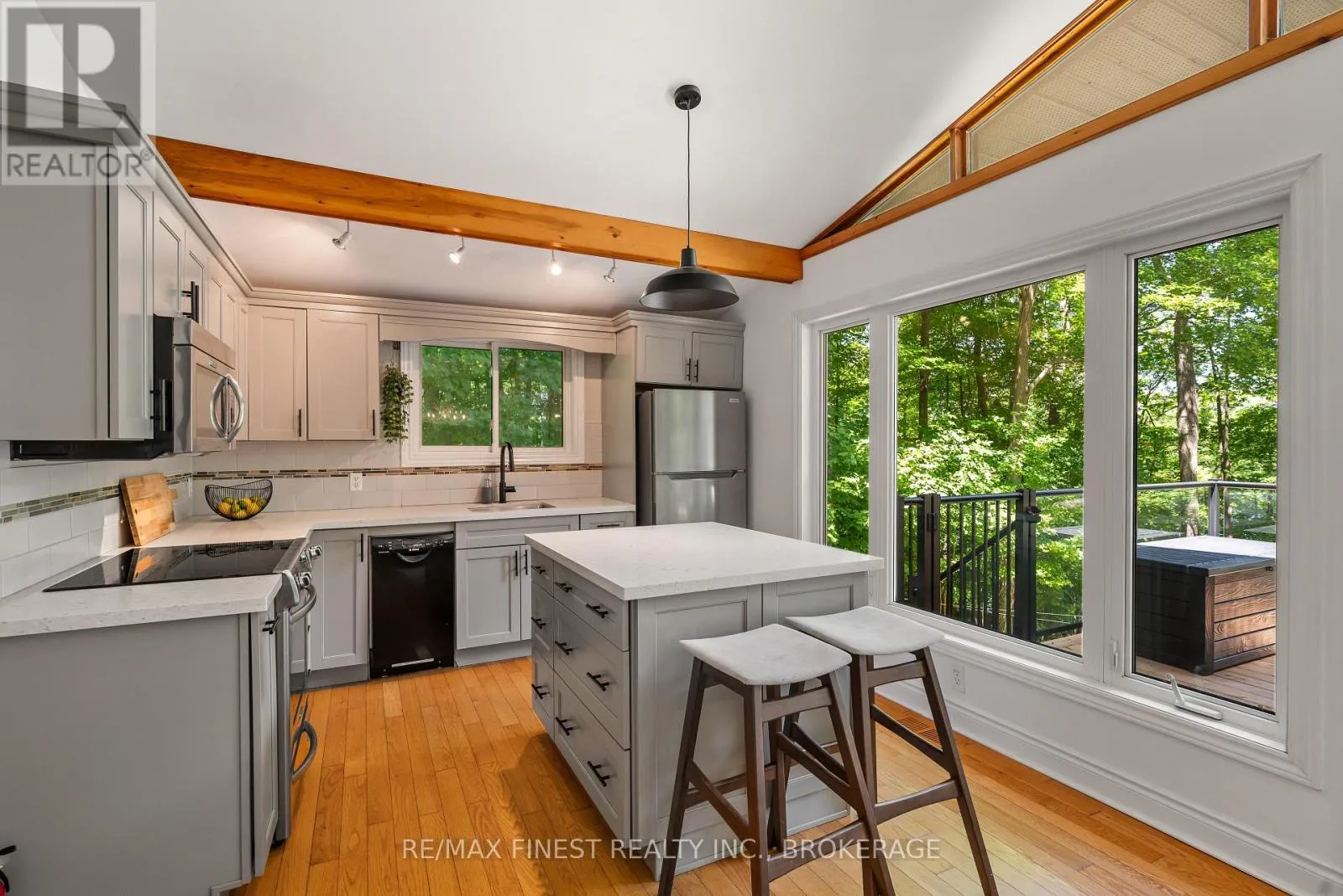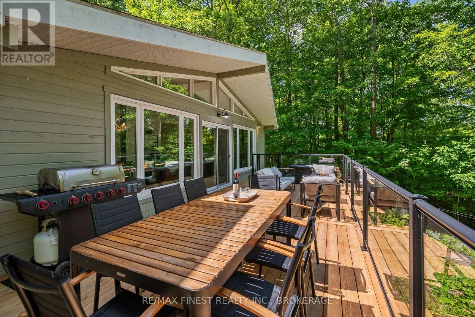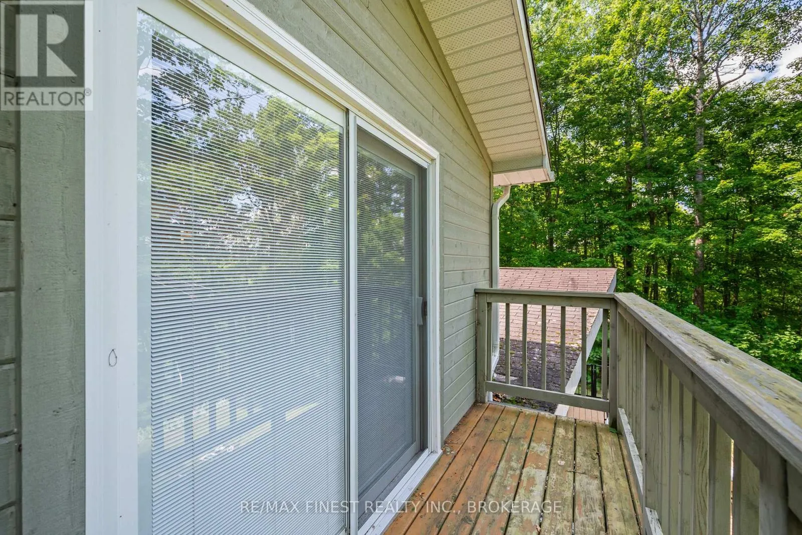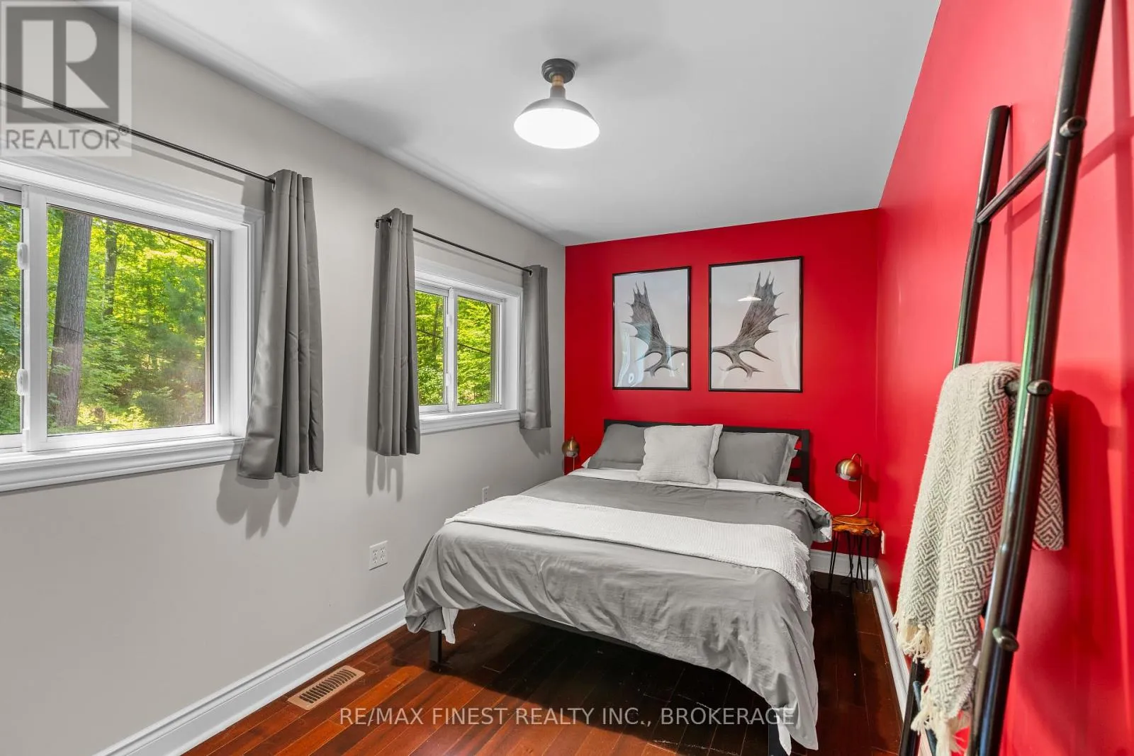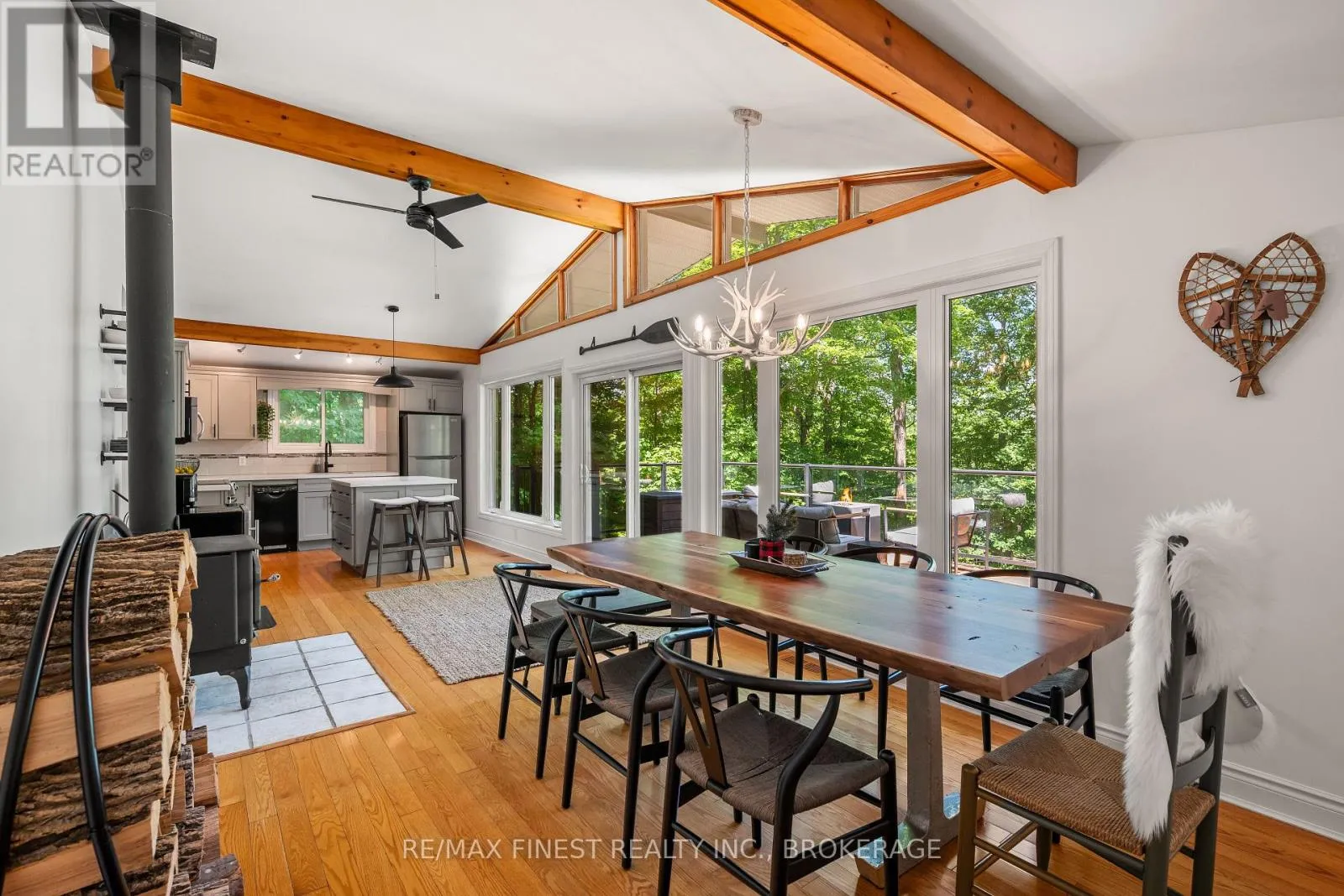 Cross Streets: Deyos Rd. ** Directions: Hwy 38,to Desert Lake Rd, to Deyos Rd.to OakwoodLane. This 1890 sq ft custom-built, year-round 5-bedroom, 2-bath home on the pristine shores of Thirteen Islands Lake. Tucked into over 1.4 acres of private, wooded land, this peaceful retreat offers clean waterfront, gorgeous views, excellent drive up access and a nearby boat launch. Inside, you'll find a bright, open-concept layout featuring cathedral ceilings, a cozy wood stove, and wall-to-wall windows overlooking the trees and water. The kitchen and dining area open onto a brand new 30-ft deck (2024), perfect for entertaining. The main floor includes three bedrooms, a 4-piece bath, and an updated screened-in sunroom (2021). Upstairs, the private primary suite features a 3-piece ensuite, walk-in closet, and its own balcony with stunning lake views. A second upstairs bedroom doubles as an office or guest space. Major updates include: ductless heat pump/AC (2025), new waterfront deck (2021), water pressure tank(2025), septic bed emptied (2024), and brand new fridge, washer/dryer, and propane fire pit. This turn-key home is being sold fully furnished with all water toys (kayak, canoe ,paddleboard, 12-ft aluminum boat with motor) and property maintenance tools included. Proven short-term rental income of $50k + from July to September, with potential for year-round bookings and requests already into 2026. A rare chance to own one of cottage country's best-maintained and most charming lakefront homes for your family or a turn-key high earning passive income investment property. (id:27476)
