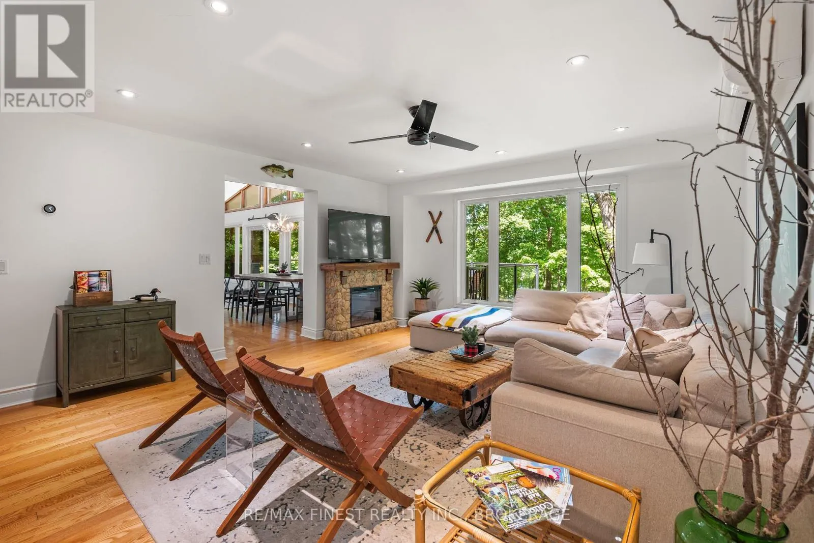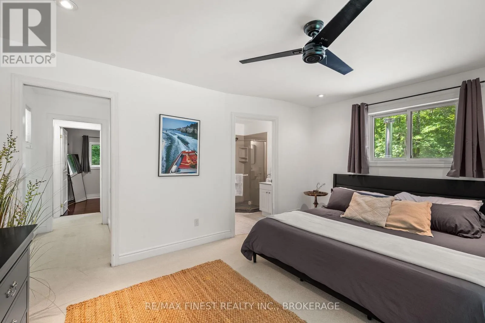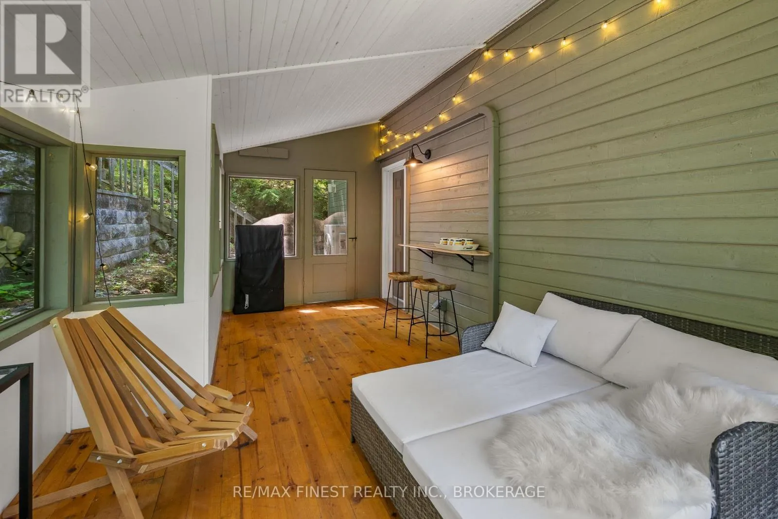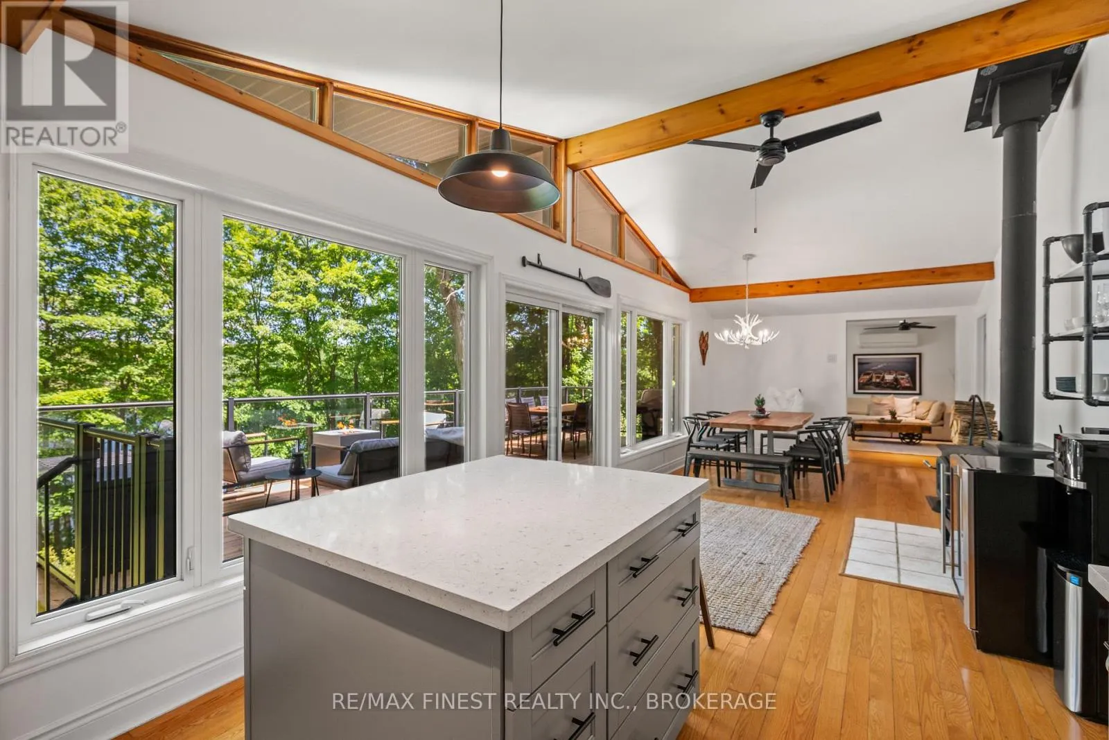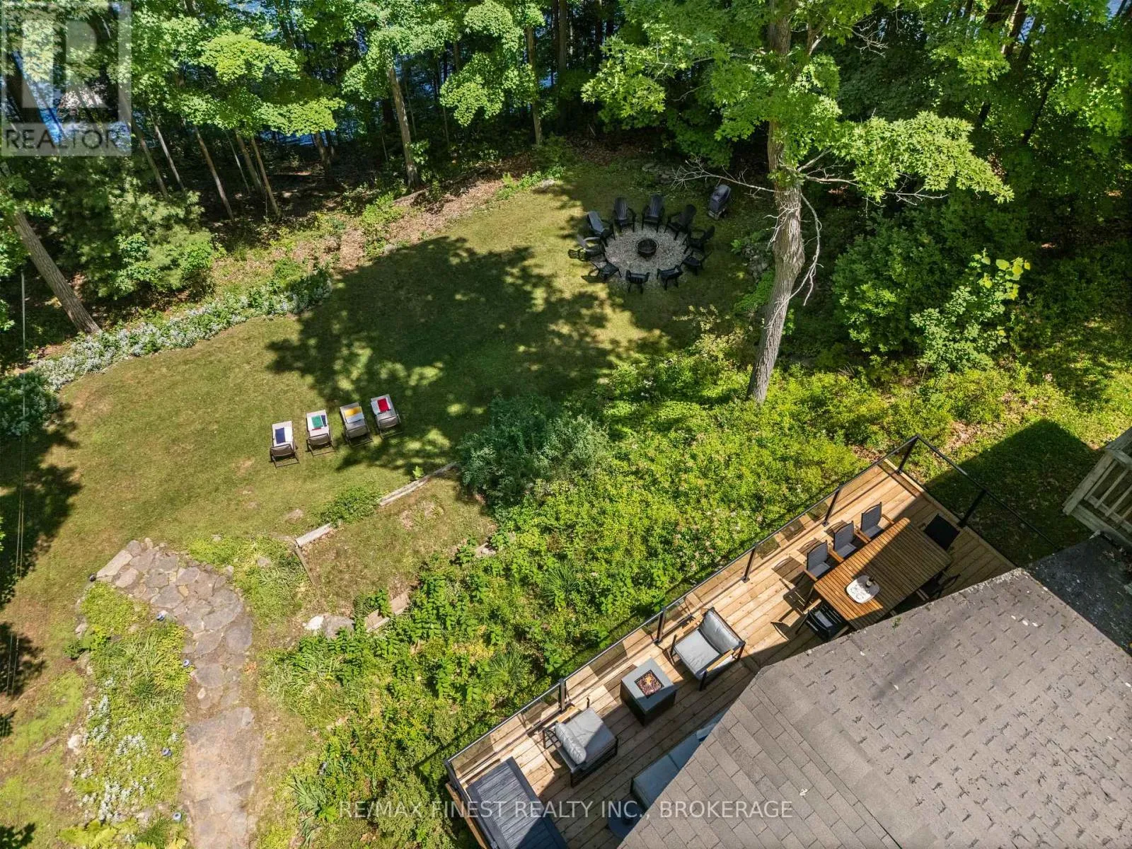Cross Streets: Deyos Rd. ** Directions: Hwy 38,to Desert Lake Rd, to Deyos Rd.to OakwoodLane. This 1890 sq ft custom-built, year-round 5-bedroom, 2-bath home on the pristine shores of Thirteen Islands Lake. Tucked into over 1.4 acres of private, wooded land, this peaceful retreat offers clean waterfront, gorgeous views, excellent drive up access and a nearby boat launch. Inside, you'll find a bright, open-concept layout featuring cathedral ceilings, a cozy wood stove, and wall-to-wall windows overlooking the trees and water. The kitchen and dining area open onto a brand new 30-ft deck (2024), perfect for entertaining. The main floor includes three bedrooms, a 4-piece bath, and an updated screened-in sunroom (2021). Upstairs, the private primary suite features a 3-piece ensuite, walk-in closet, and its own balcony with stunning lake views. A second upstairs bedroom doubles as an office or guest space. Major updates include: ductless heat pump/AC (2025), new waterfront deck (2021), water pressure tank(2025), septic bed emptied (2024), and brand new fridge, washer/dryer, and propane fire pit. This turn-key home is being sold fully furnished with all water toys (kayak, canoe ,paddleboard, 12-ft aluminum boat with motor) and property maintenance tools included. Proven short-term rental income of $50k + from July to September, with potential for year-round bookings and requests already into 2026. A rare chance to own one of cottage country's best-maintained and most charming lakefront homes for your family or a turn-key high earning passive income investment property. (id:27476)